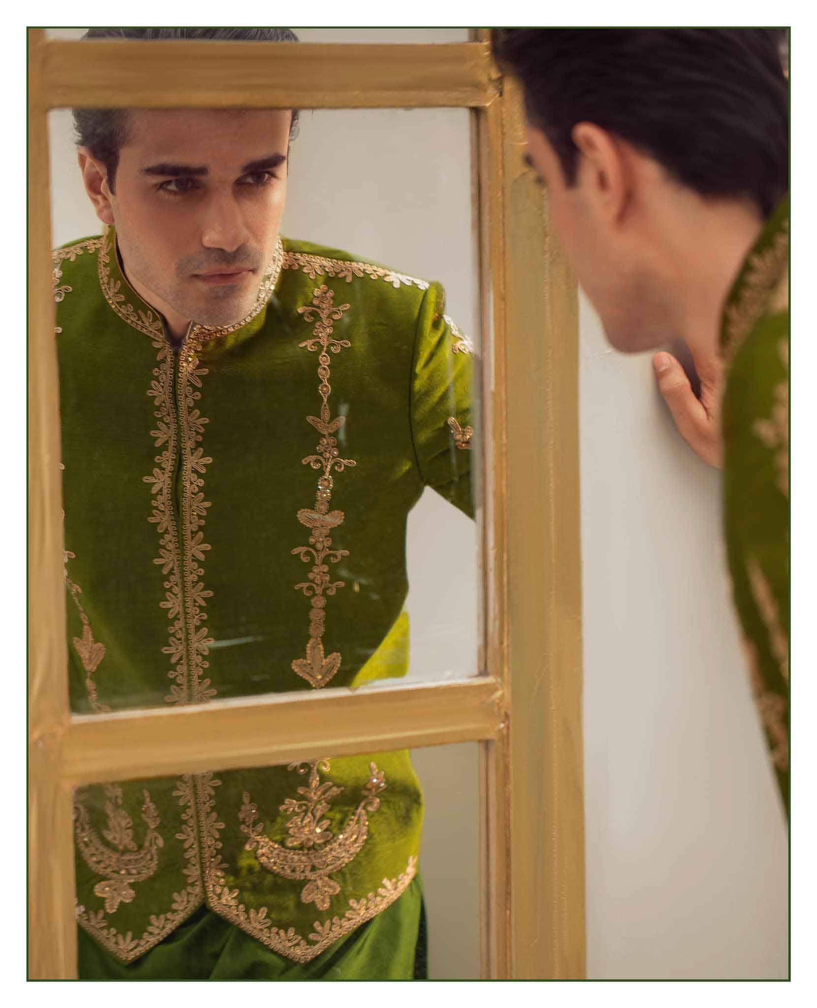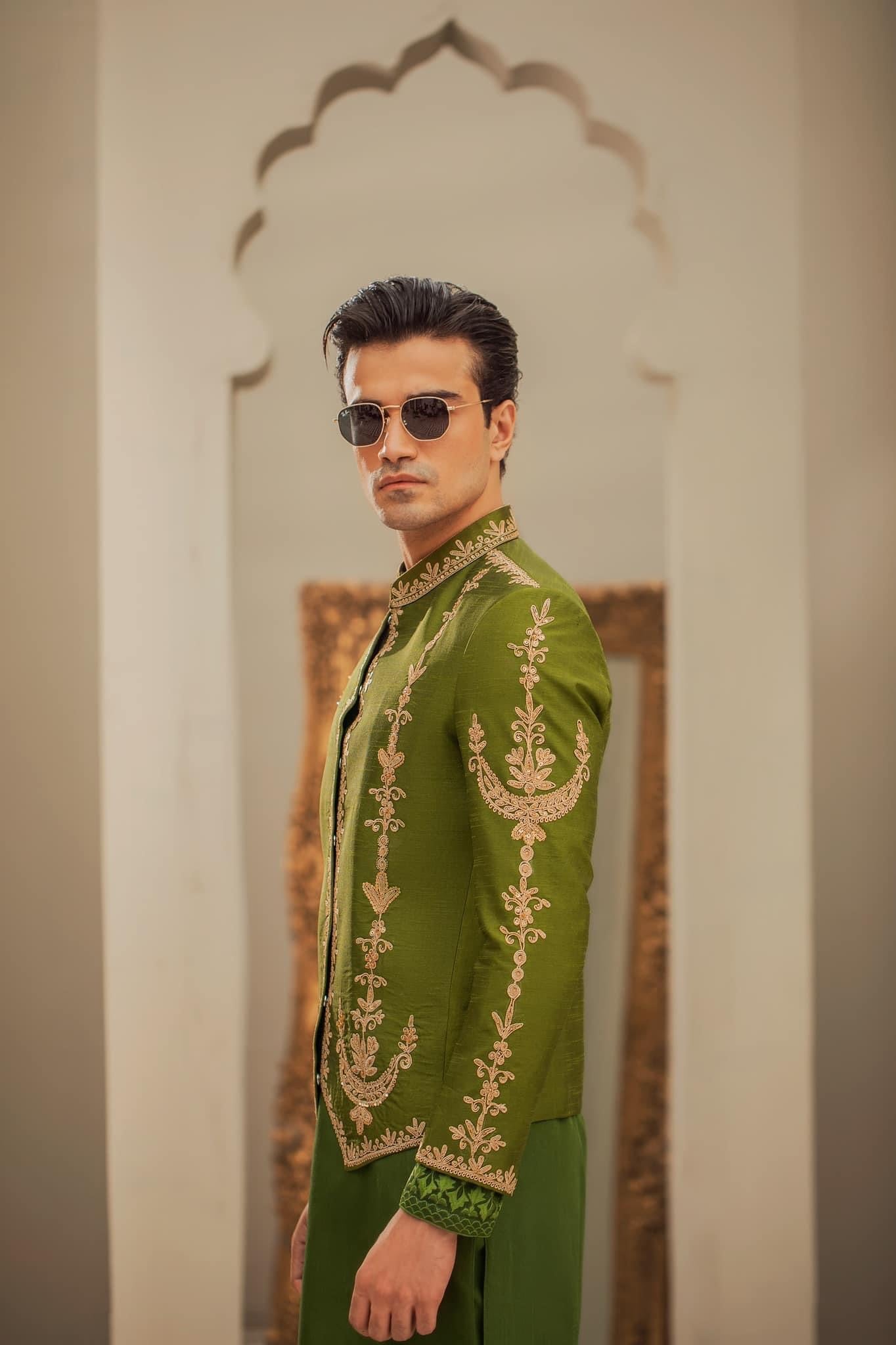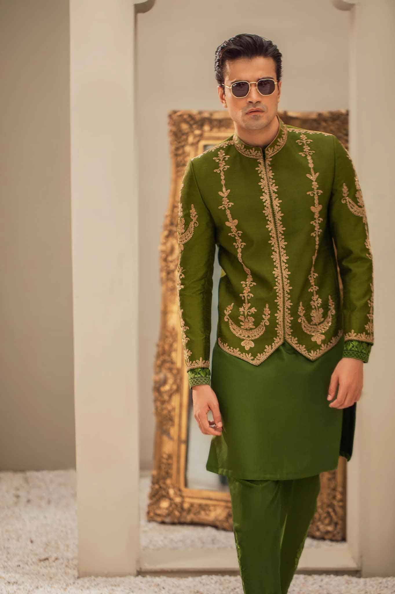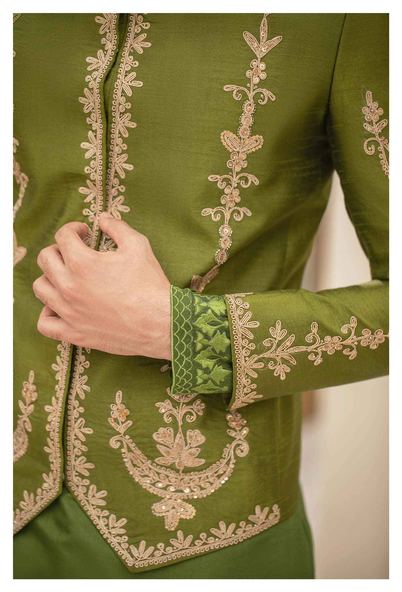 The most serene Olive green shade of raw silk is stitched in modern trendy style with same colour kurta and pajama is perfect for any festive occasion.