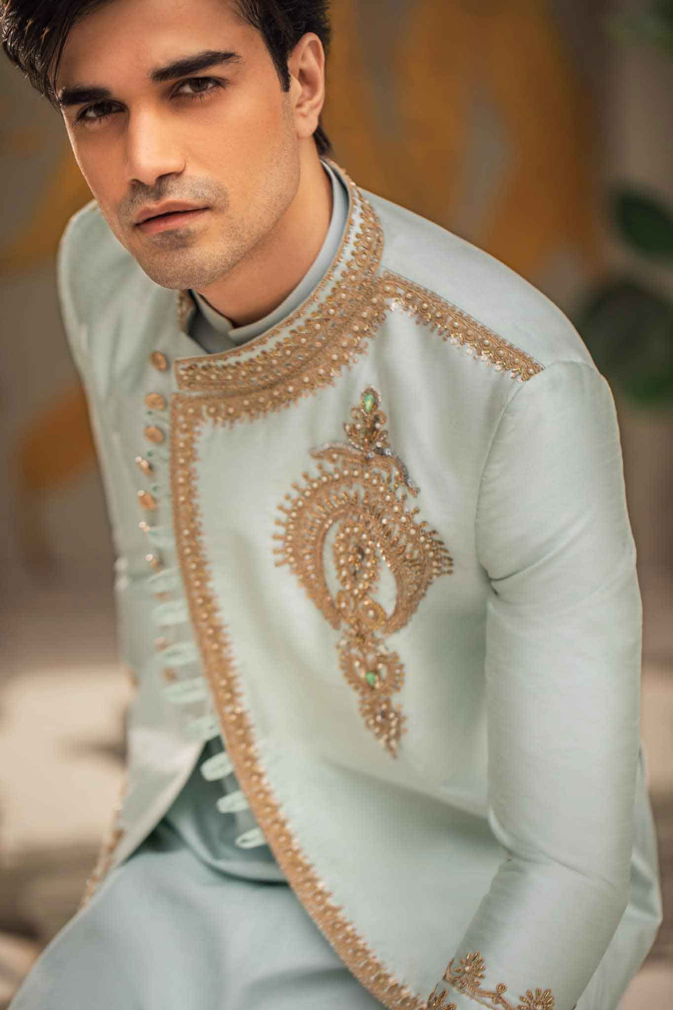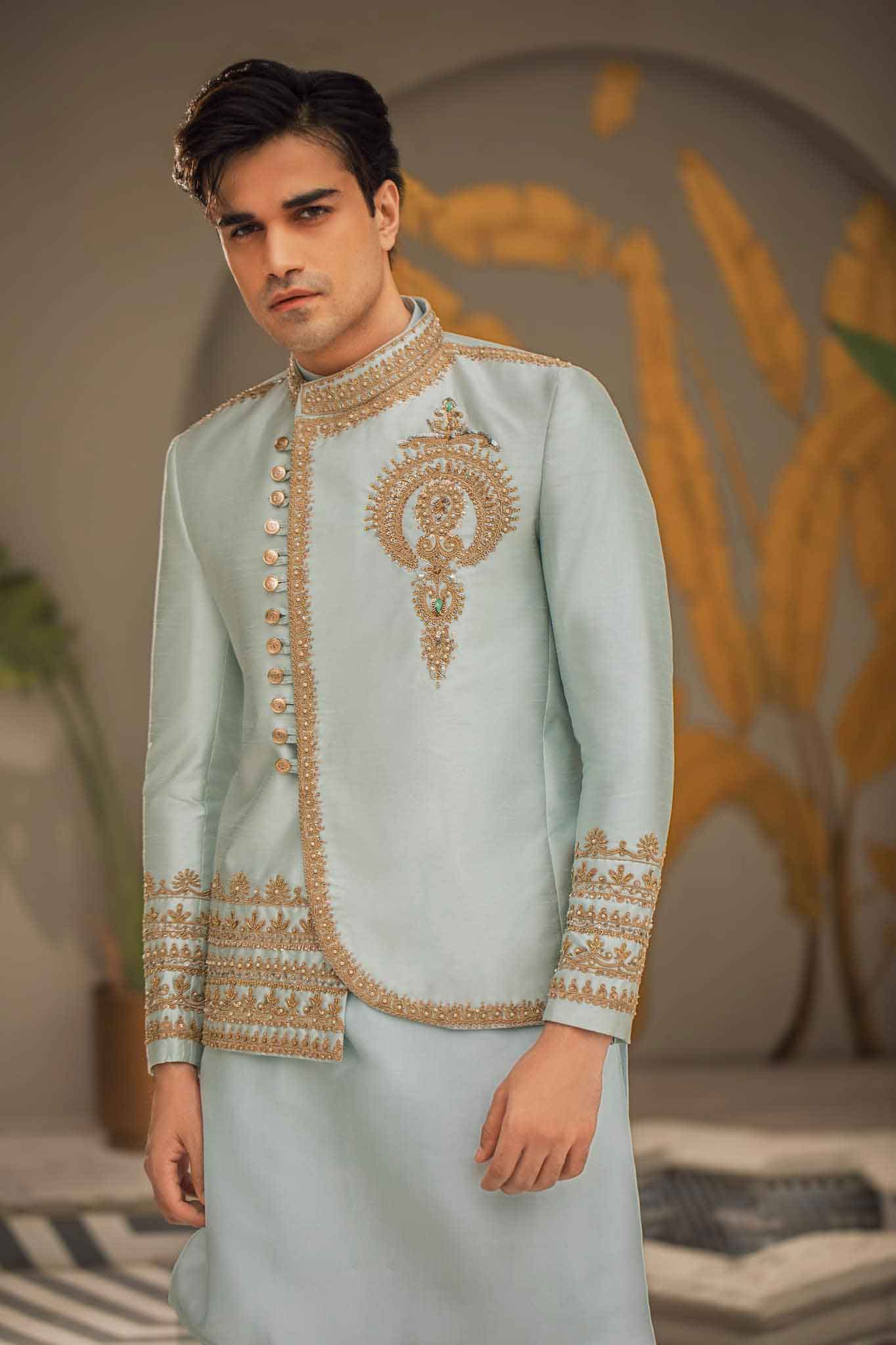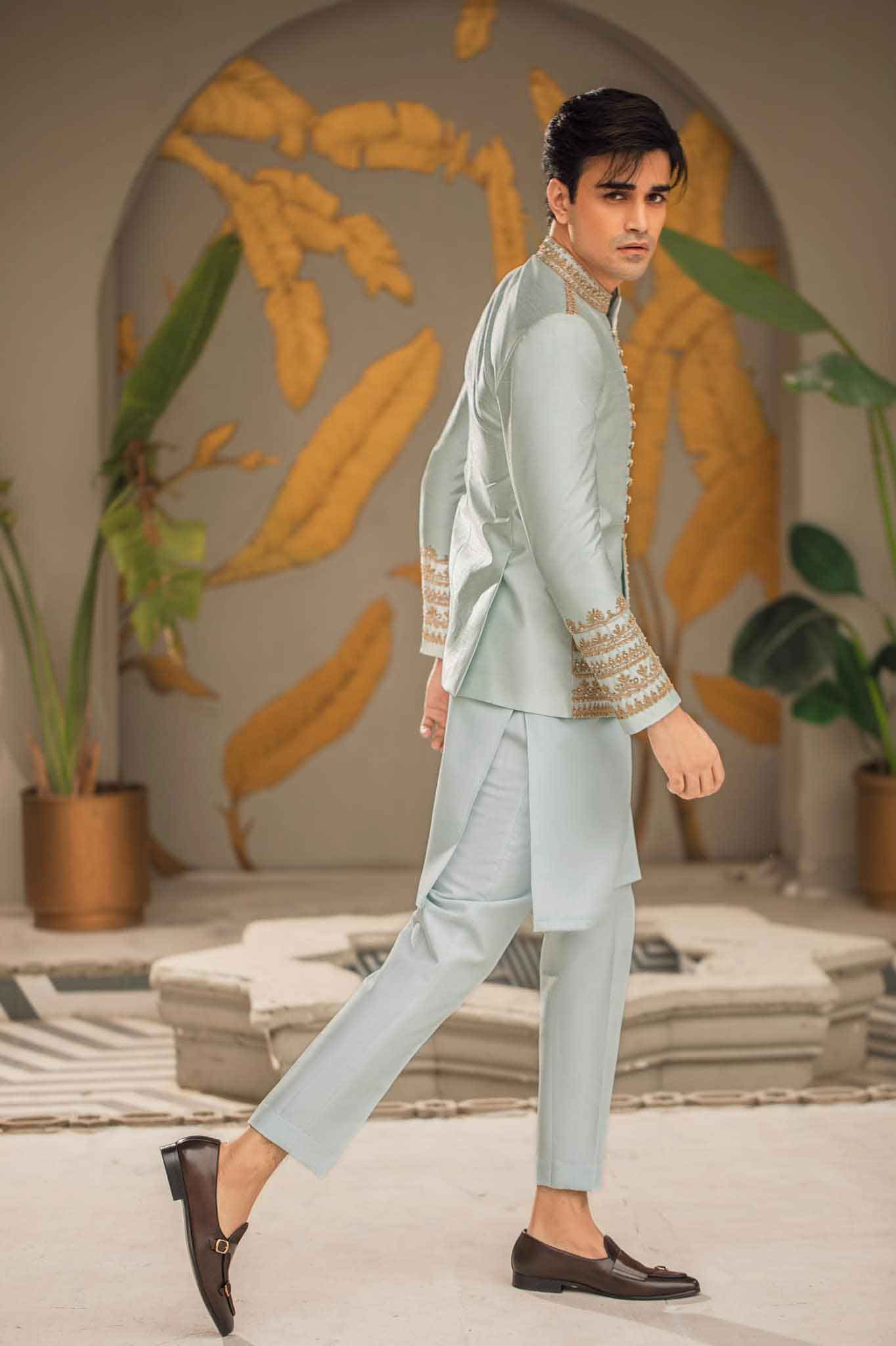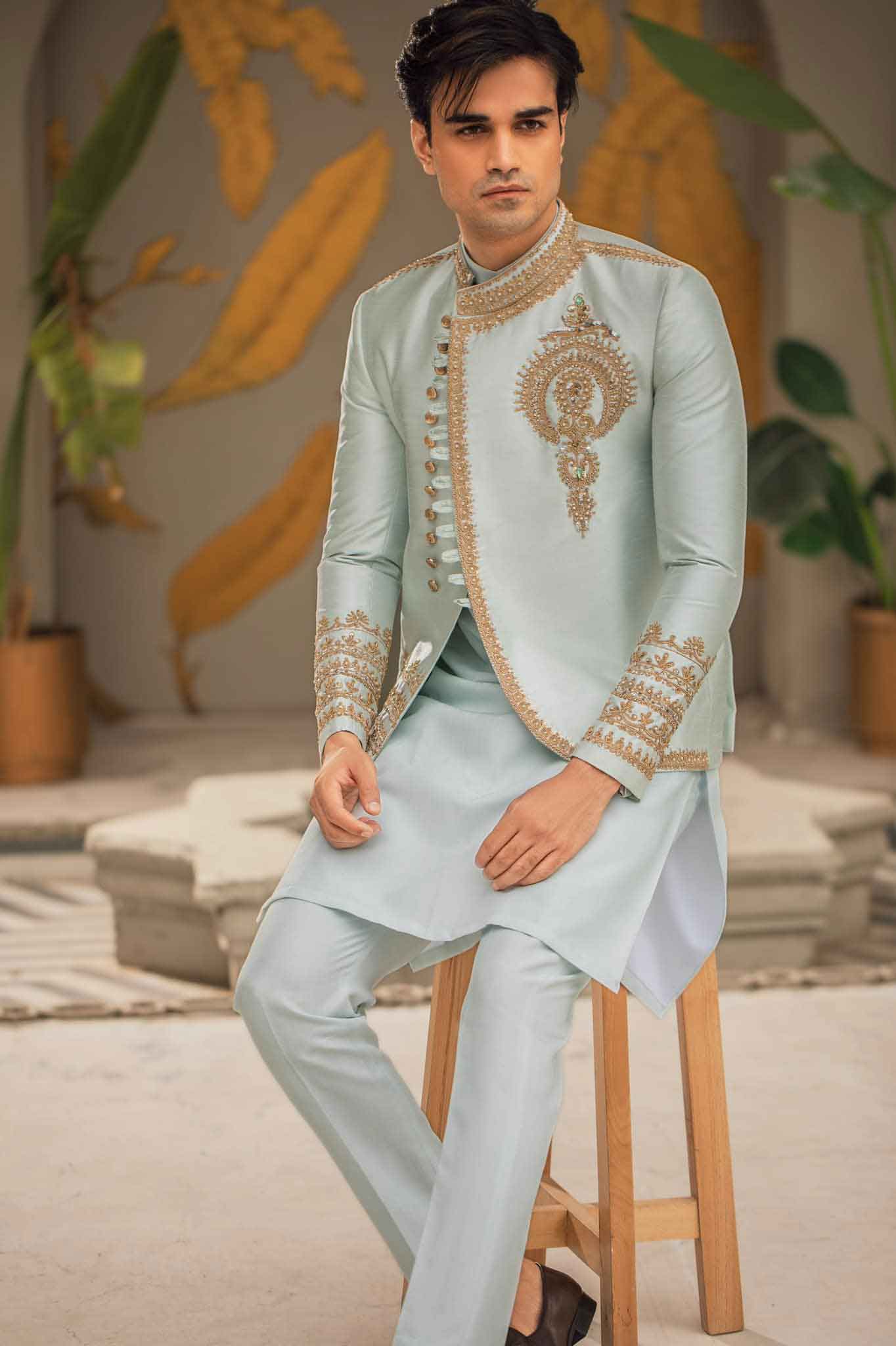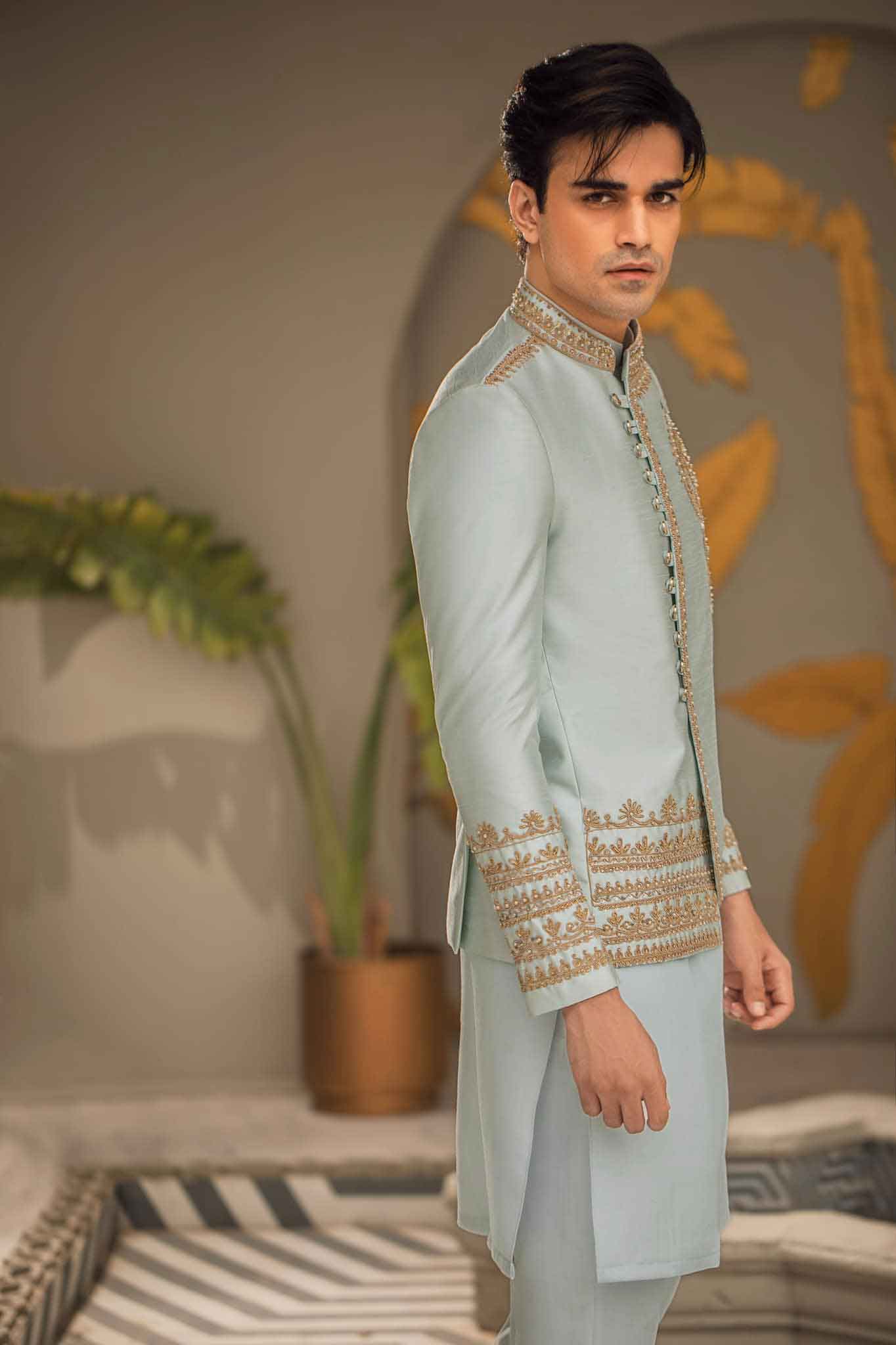 A glorious mint ensemble stitched into gracefully slew of well-cutt rawsilk prince coat,sophisticated detail and traditional crafted from fine fabric ,embellished with stunning intricate embroidery,Elegant and magestic menswear must have for any groom to be.