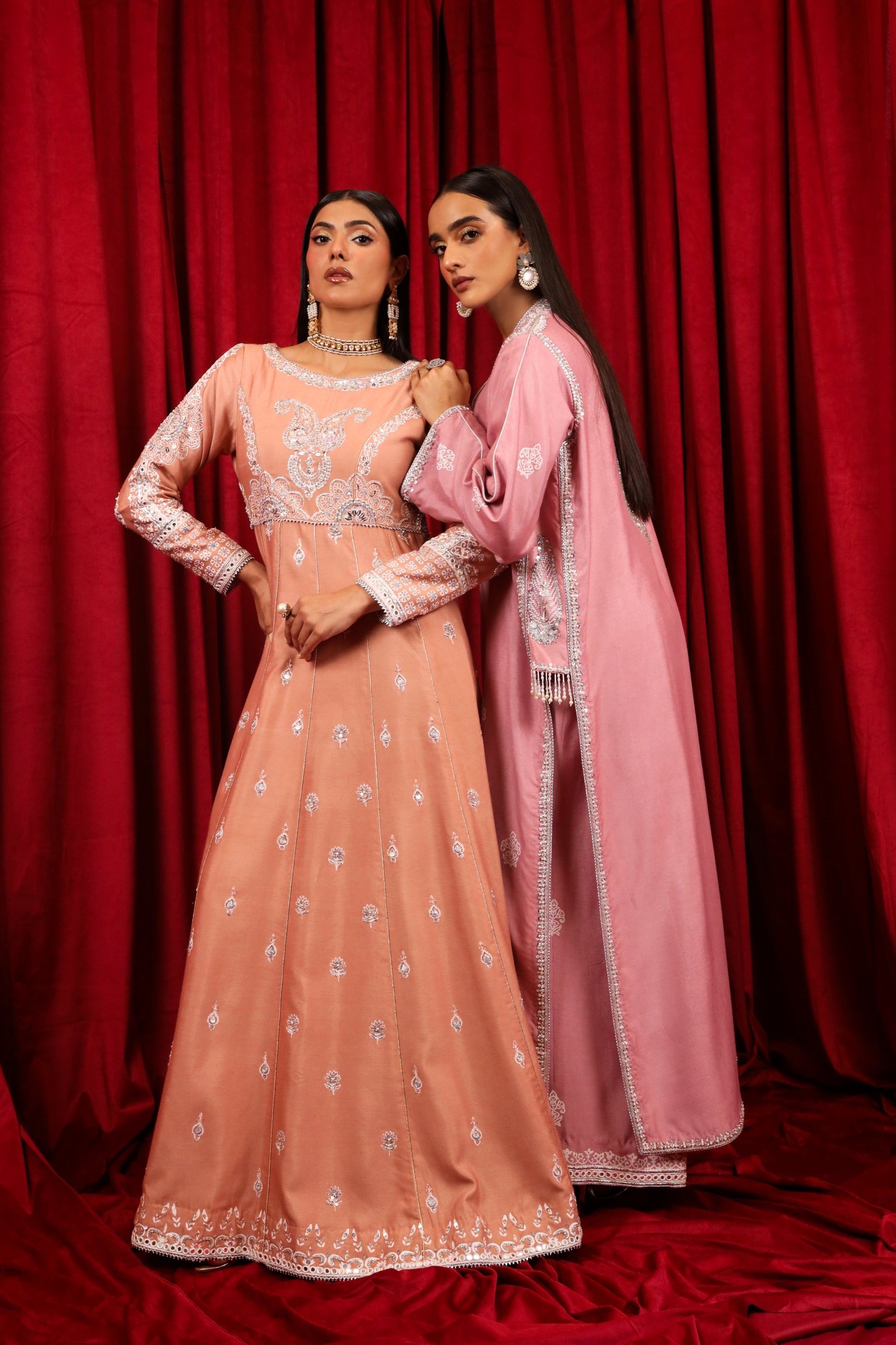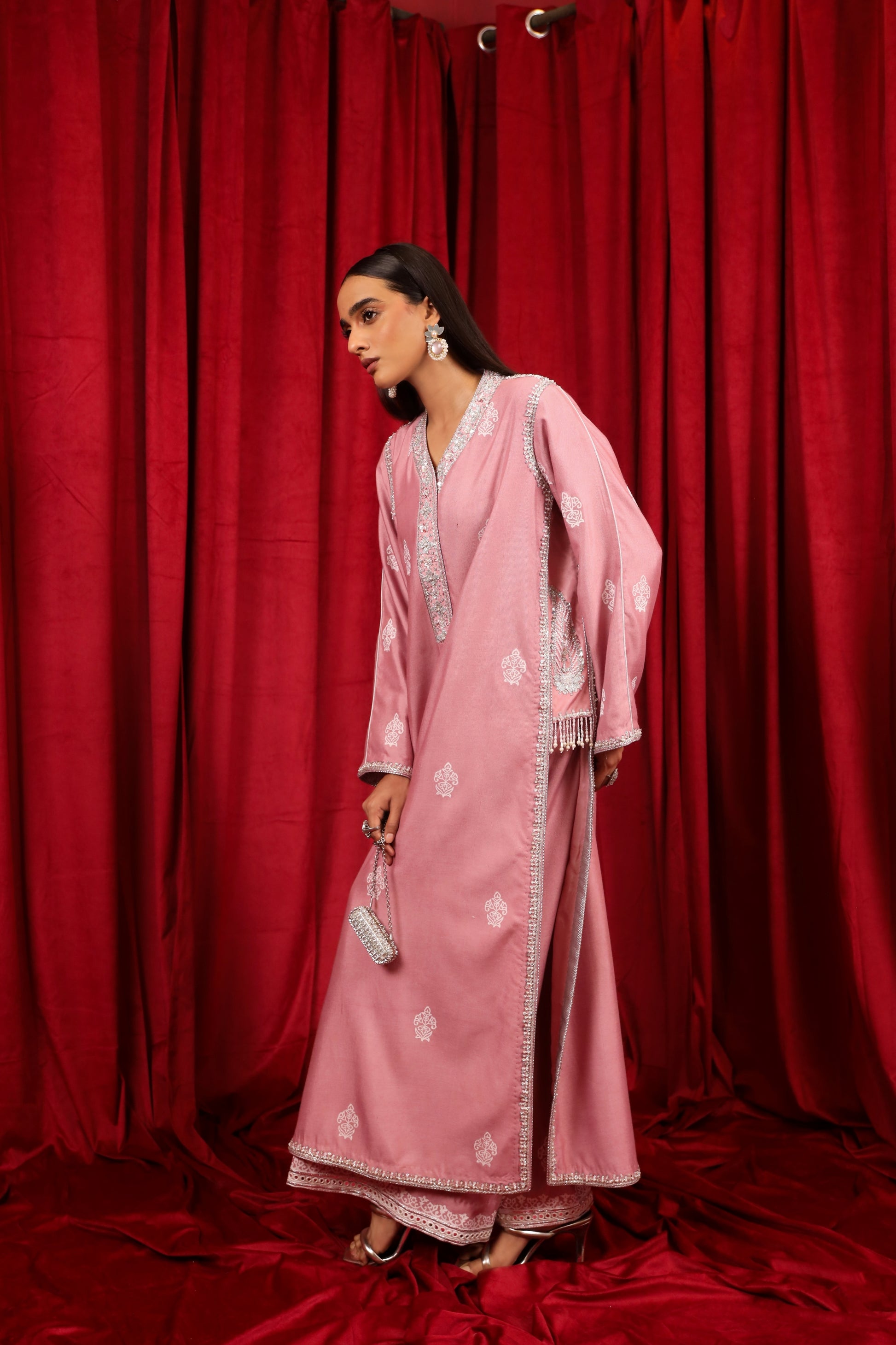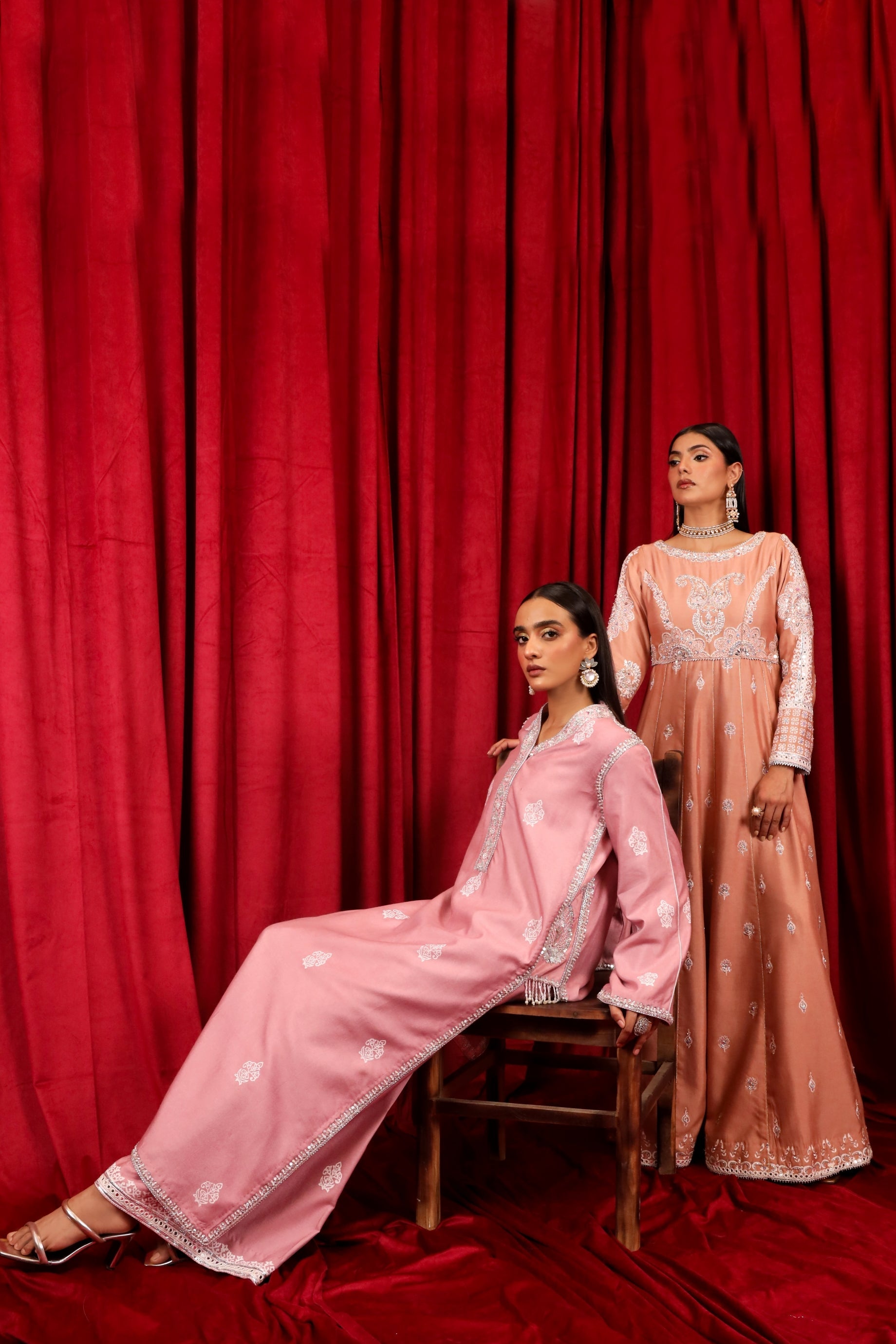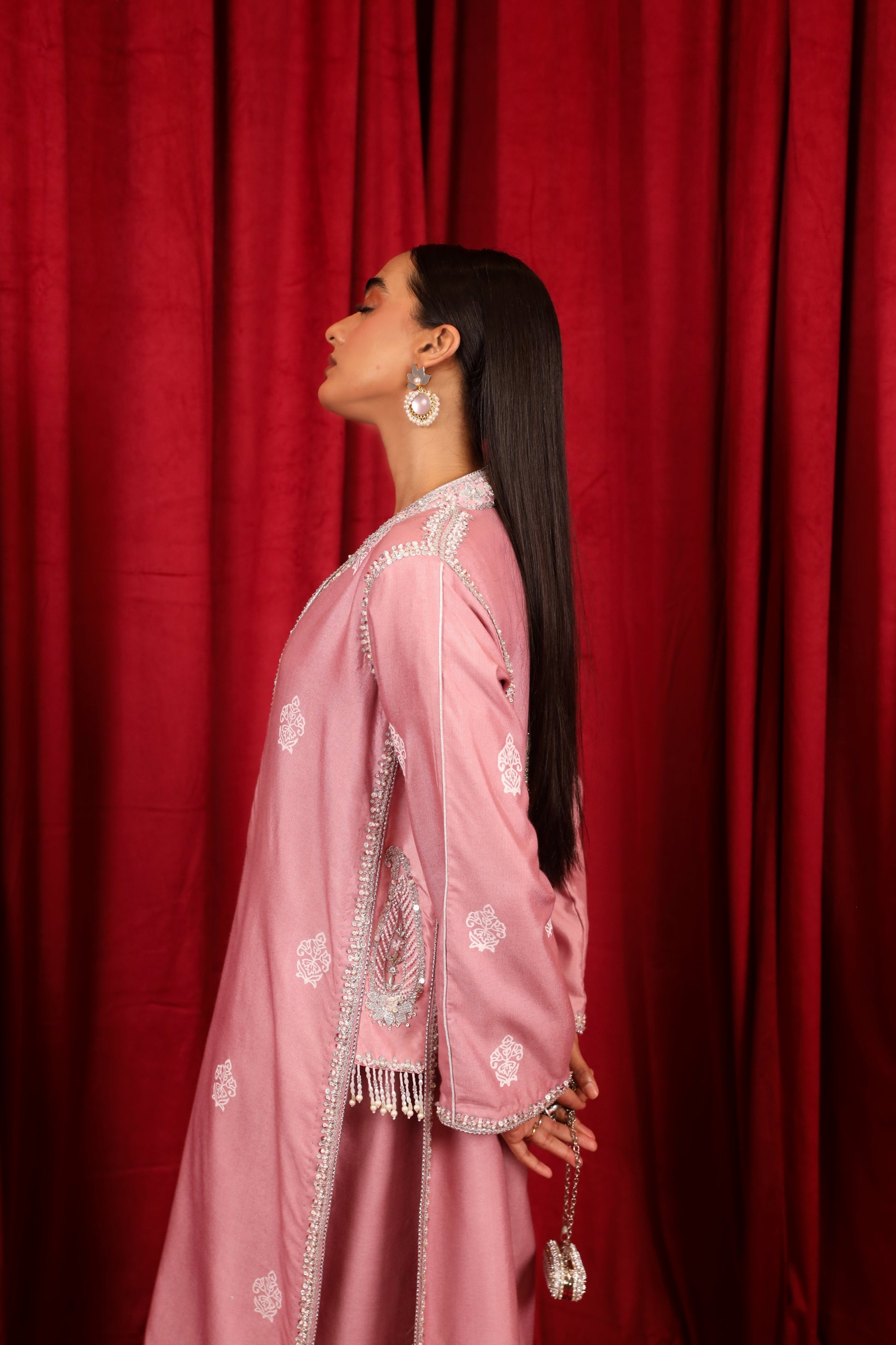 A contemporary long shirt with playful side tassels, paired with a flowing plazzo for modern elegance. Handcrafted all-side hemming, delicate silver detailing, and boti motifs enhance its artistry. The sculpted high-neckline adds sophistication, blending traditional craftsmanship with modern long length.