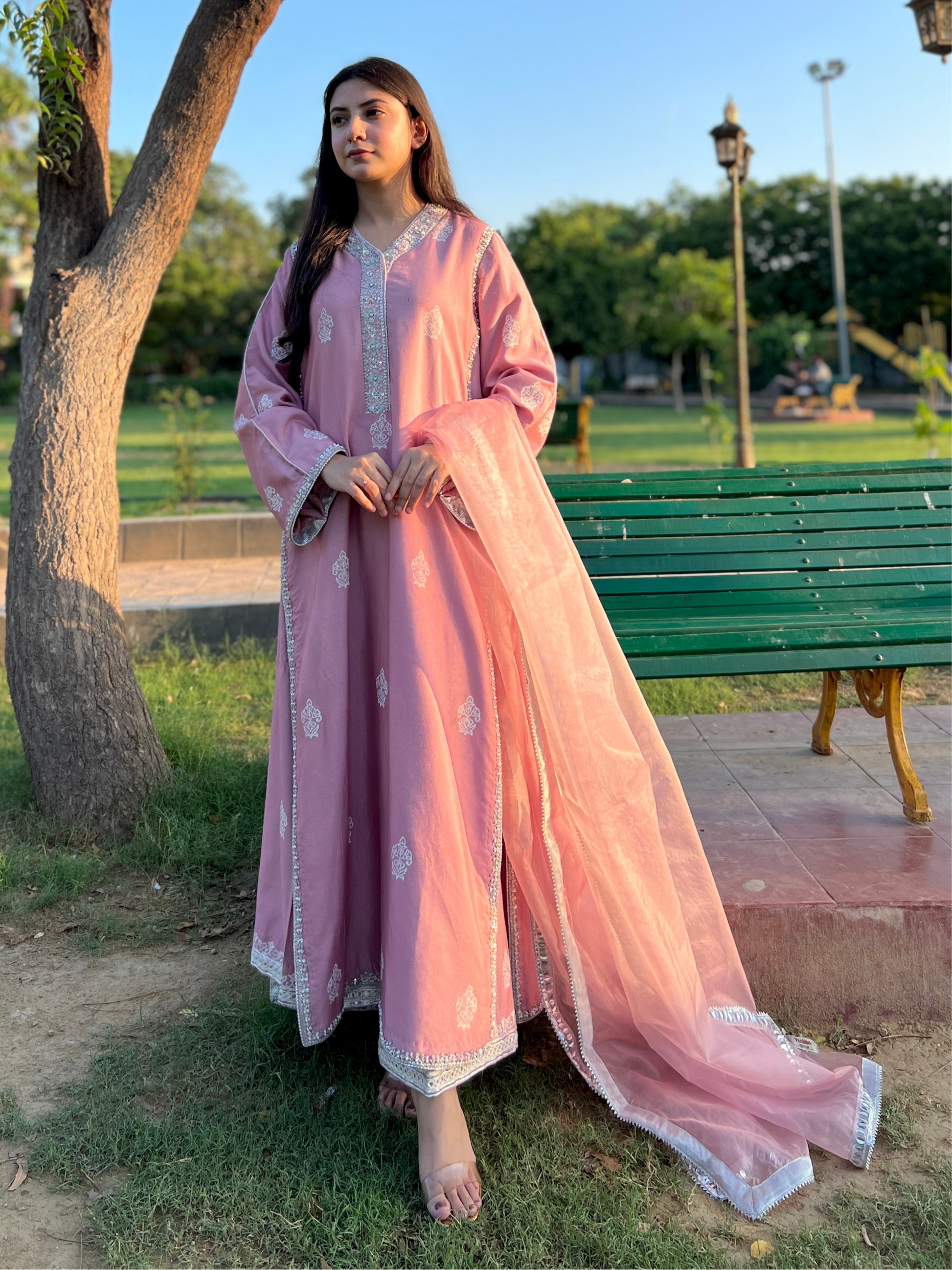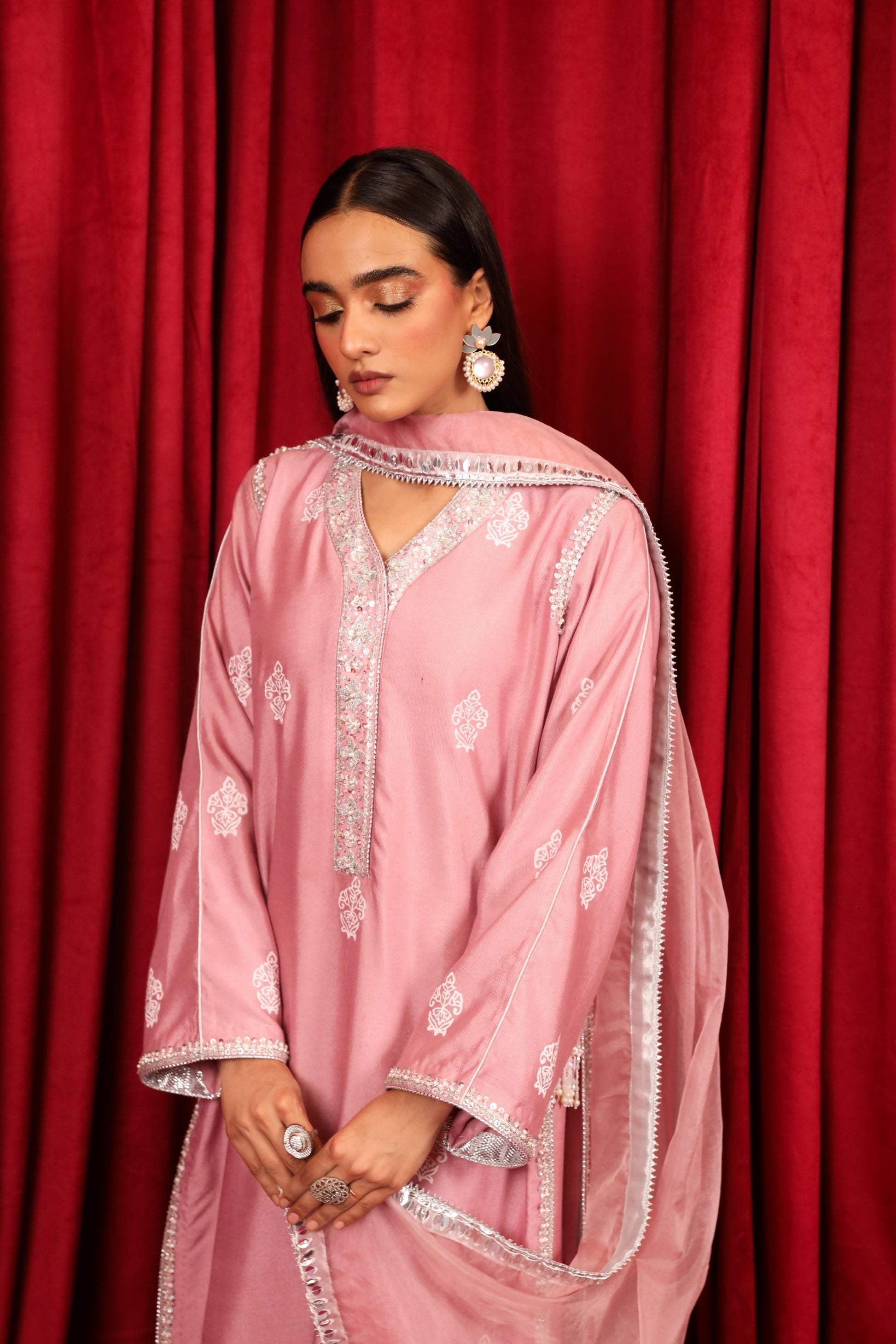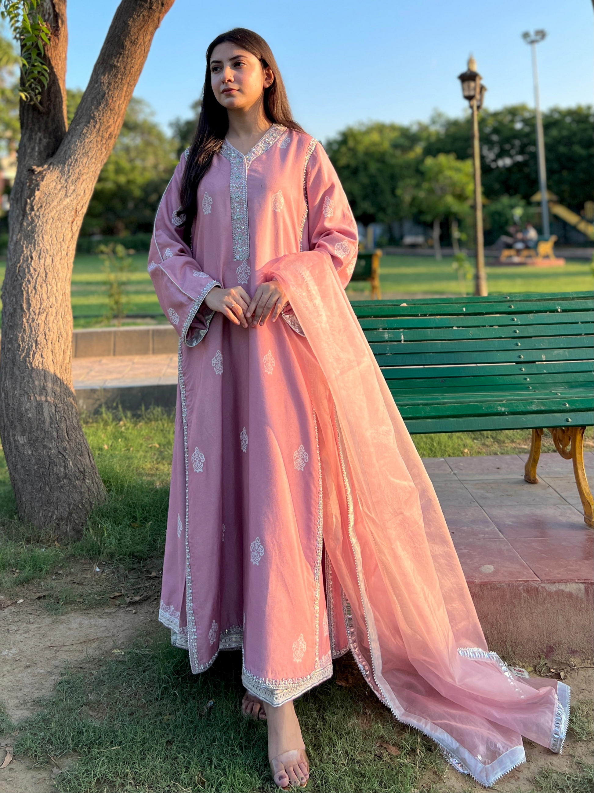 A contemporary long shirt with playful side tassels, paired with a flowing plazzo for modern elegance. Handcrafted all-side hemming, delicate silver detailing, and boti motifs enhance its artistry. The sculpted high-neckline adds sophistication, blending traditional craftsmanship with modern long length.
