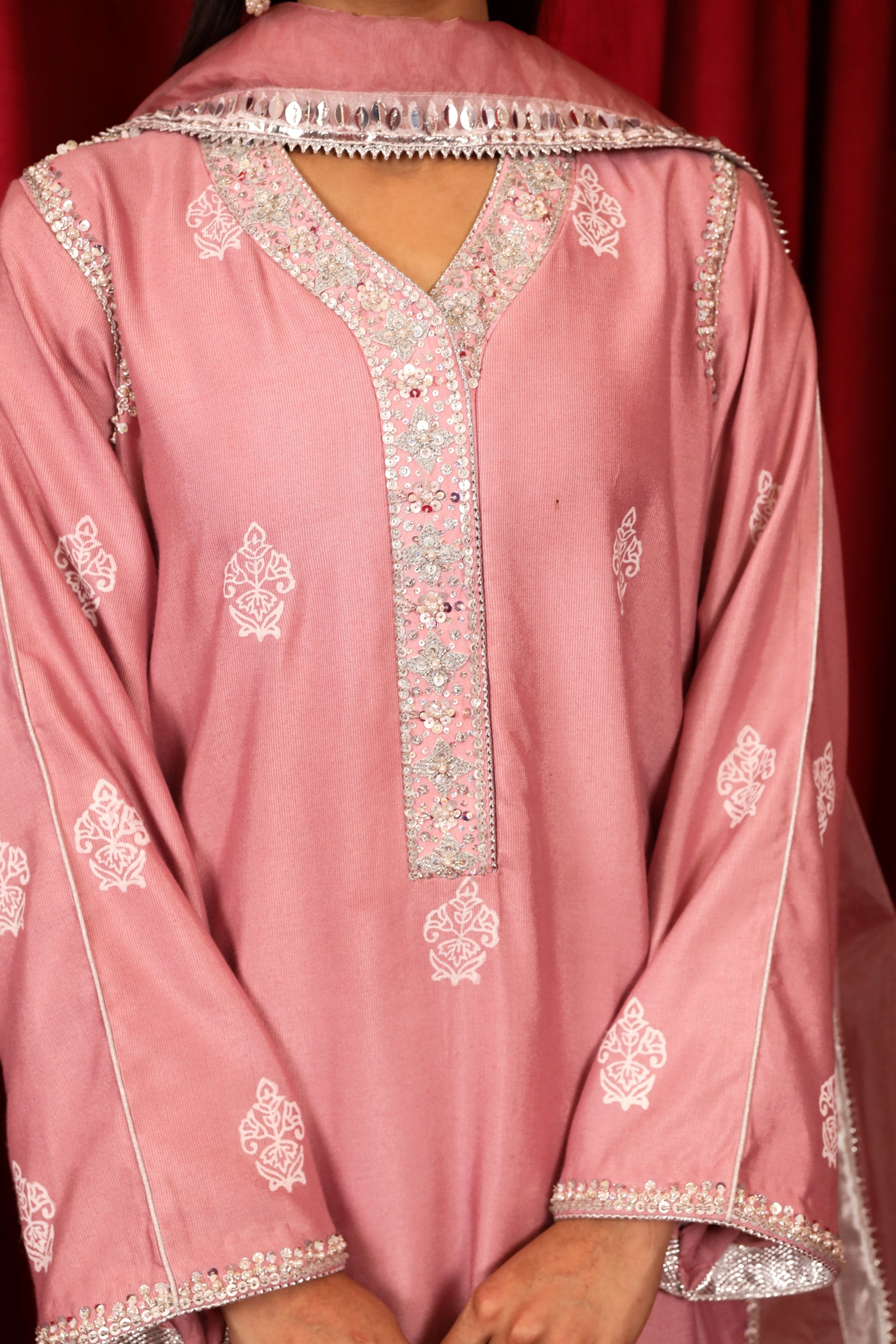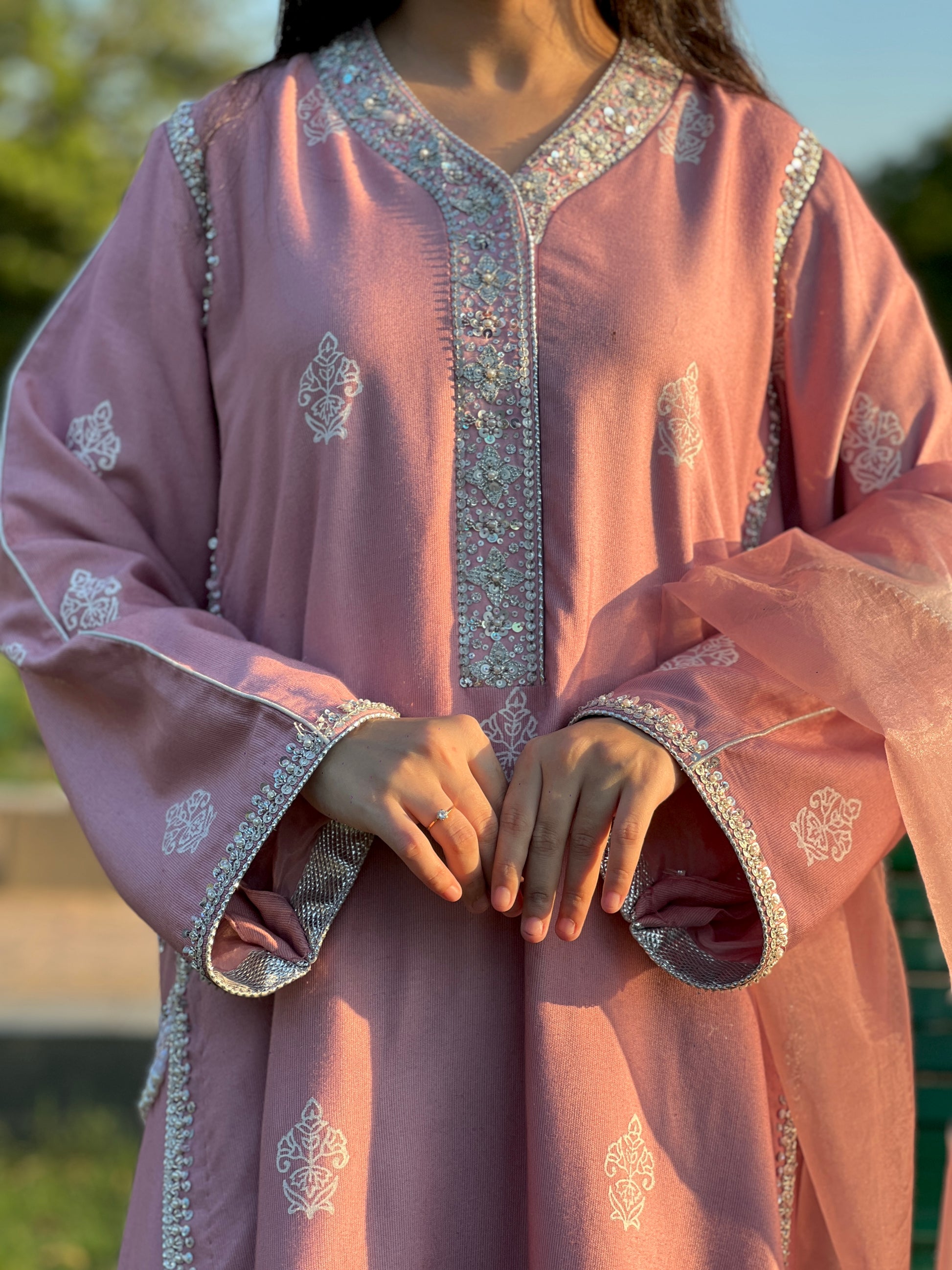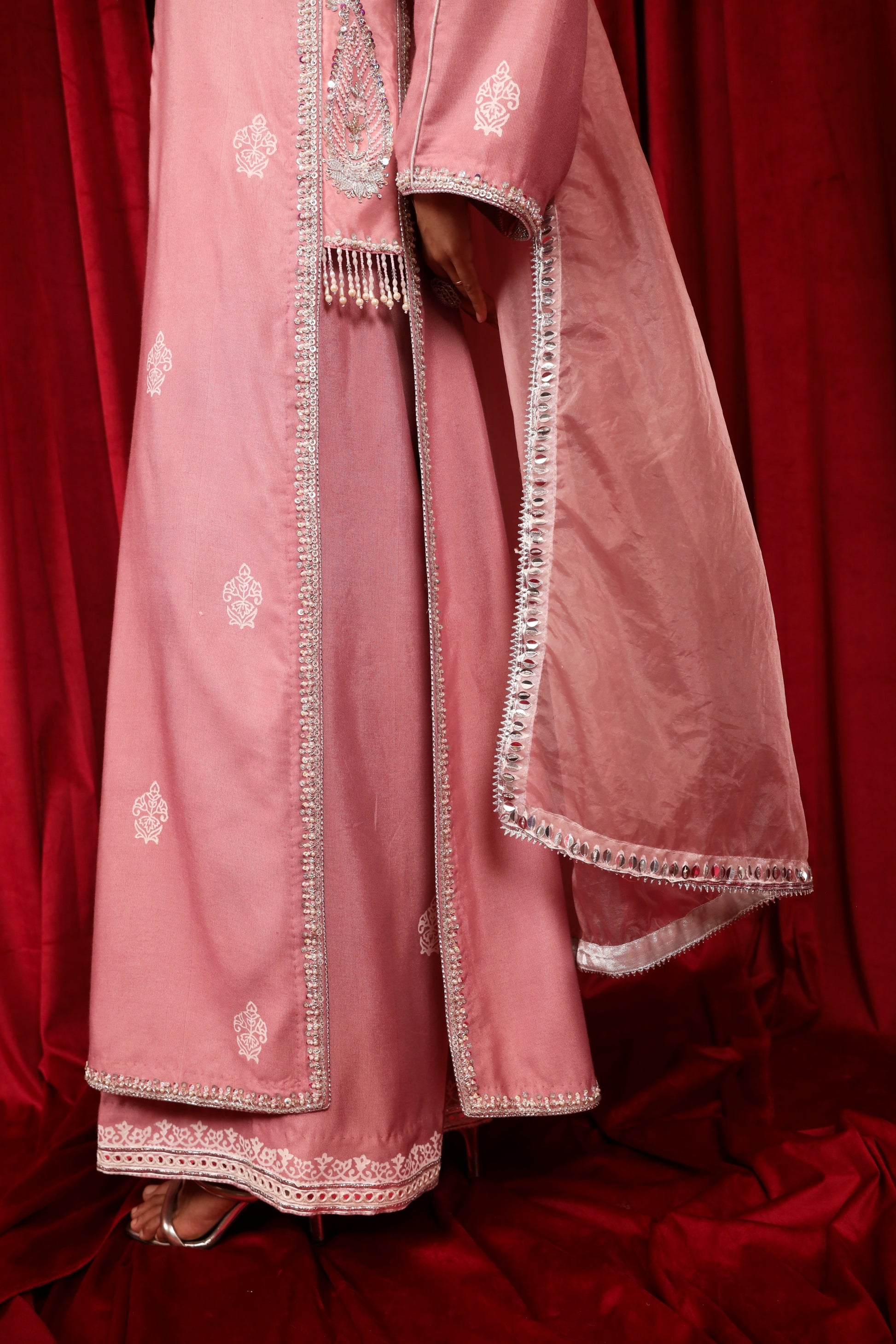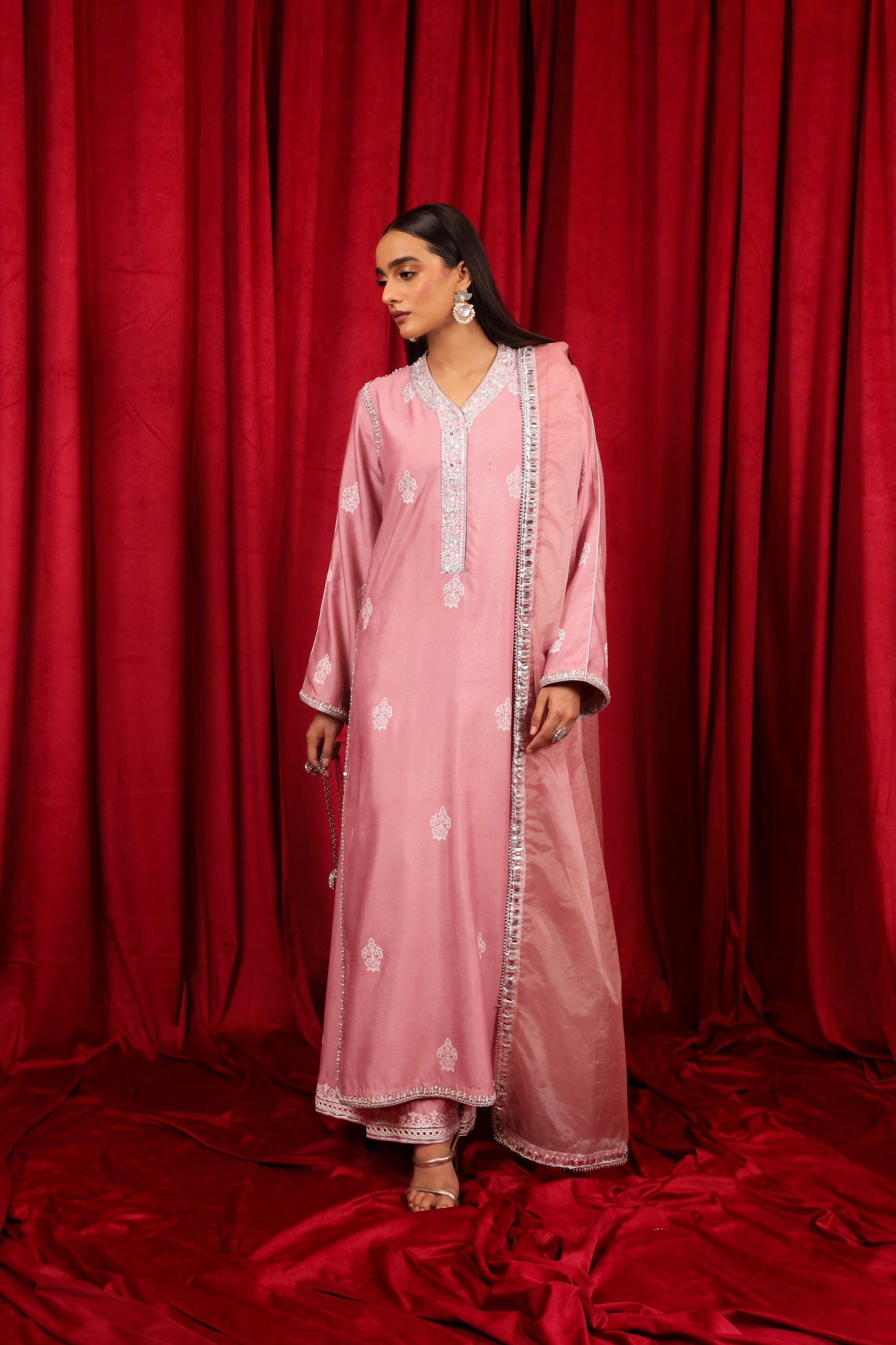 A contemporary long shirt with playful side tassels, paired with a flowing plazzo for modern elegance. Handcrafted all-side hemming, delicate silver detailing, and boti motifs enhance its artistry. The sculpted high-neckline adds sophistication, blending traditional craftsmanship with modern long length.