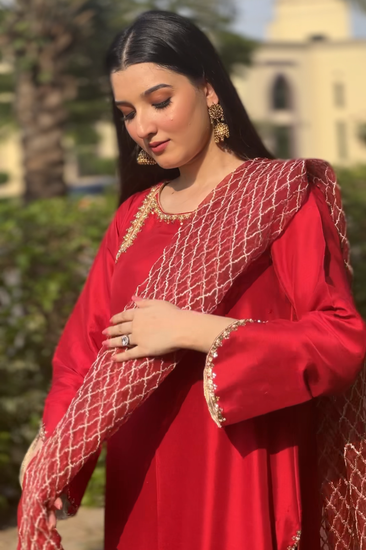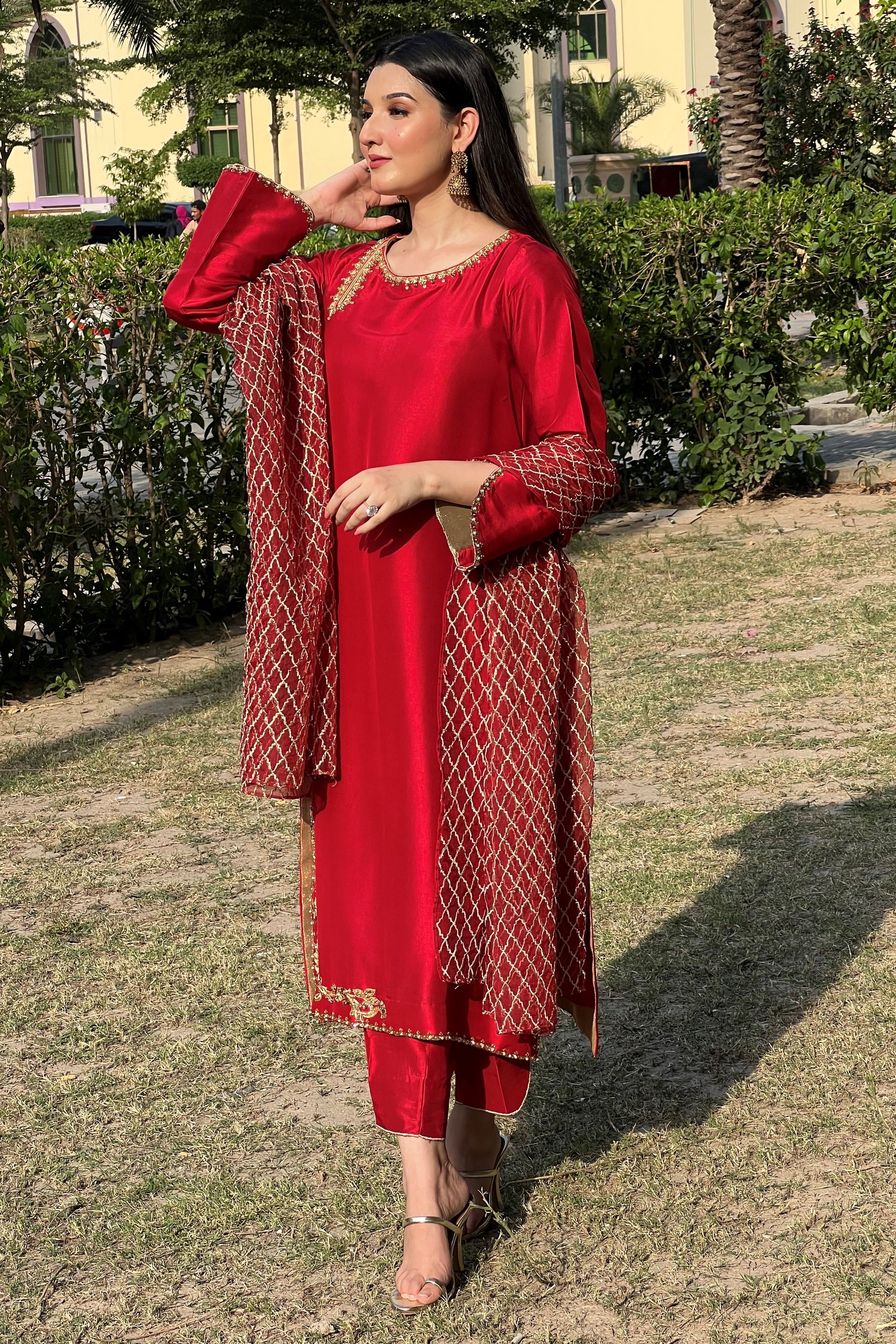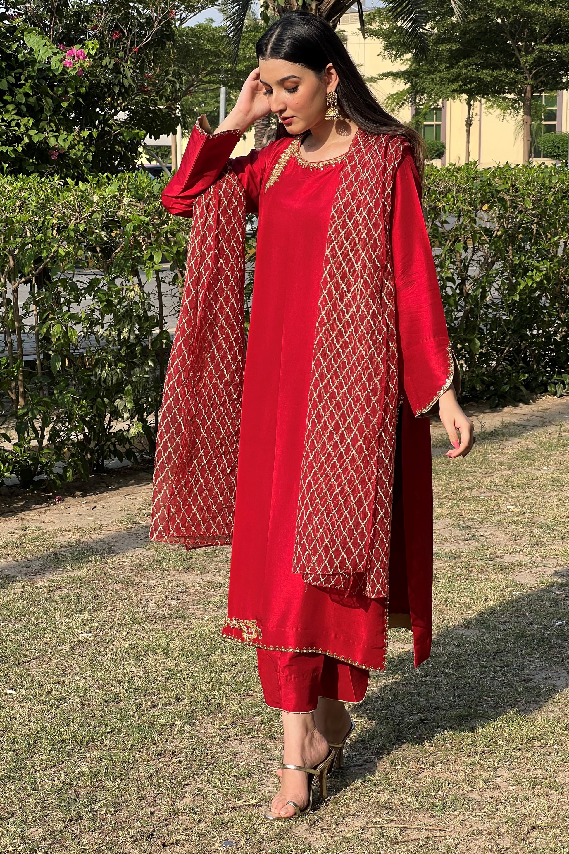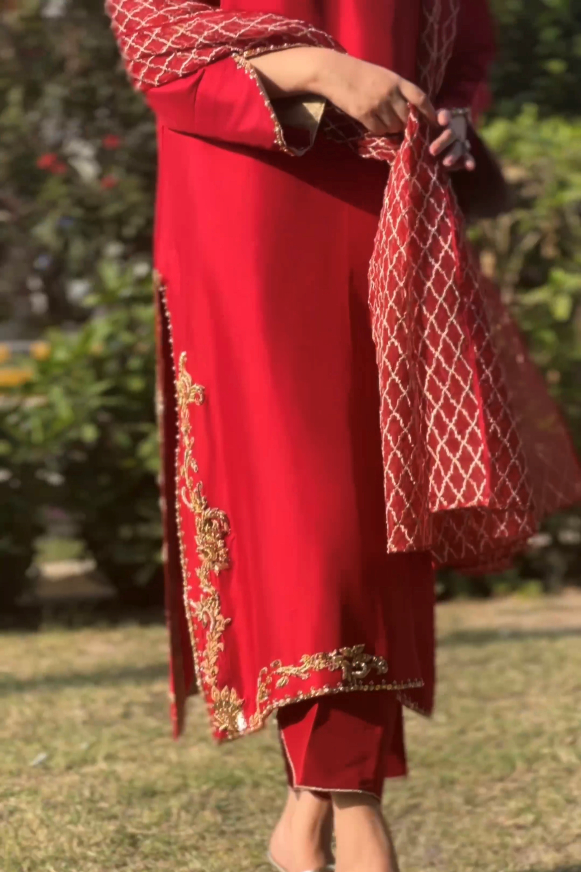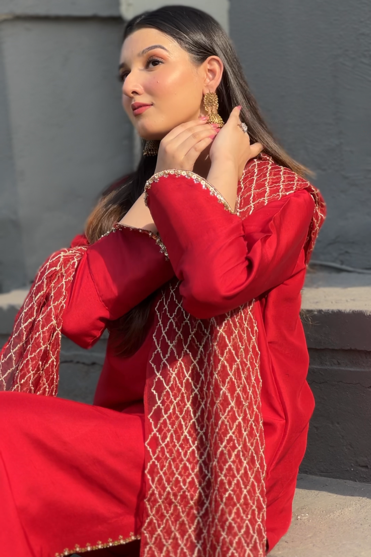 A luxurious red raw silk shirt adorned with handcrafted details including nakshi, dabka, sitara, and cutdana,Comes with matching red raw silk plazzo pants and an embroidered organza dupatta.