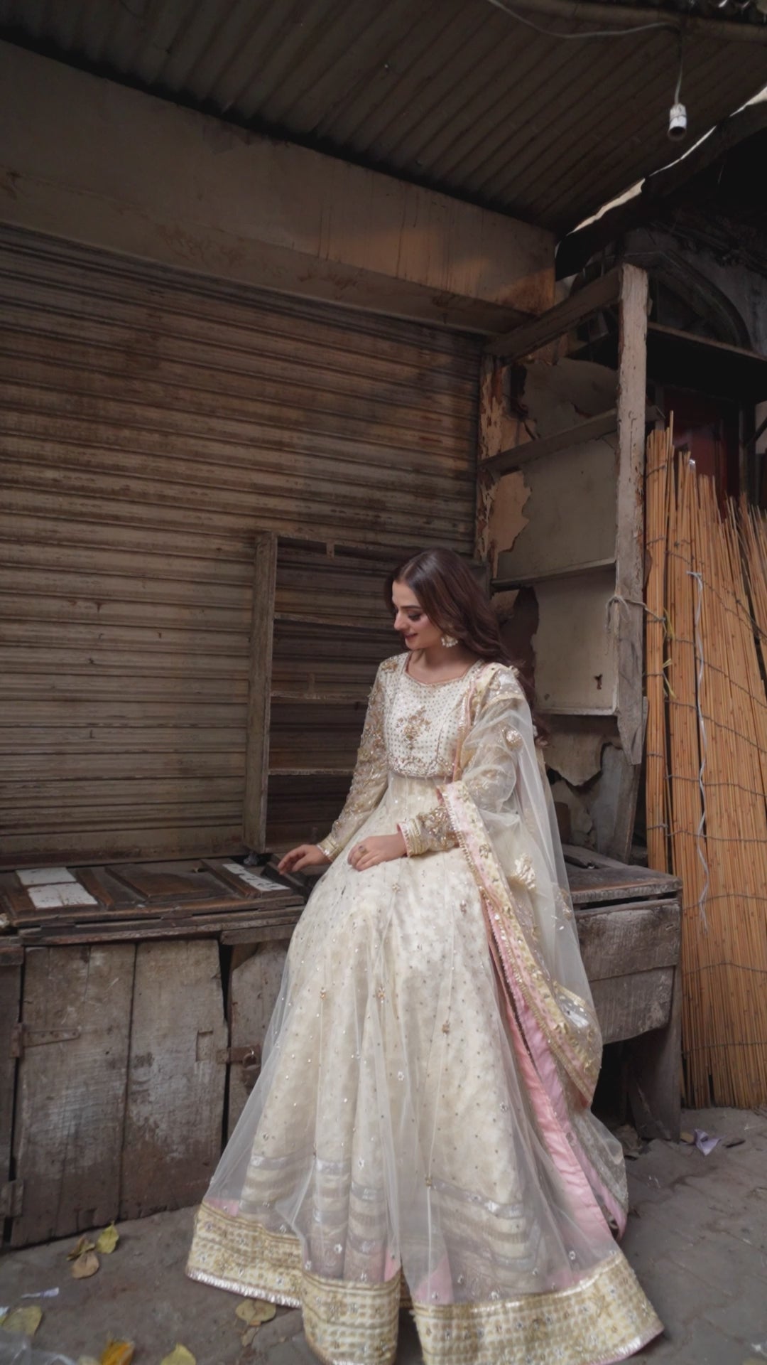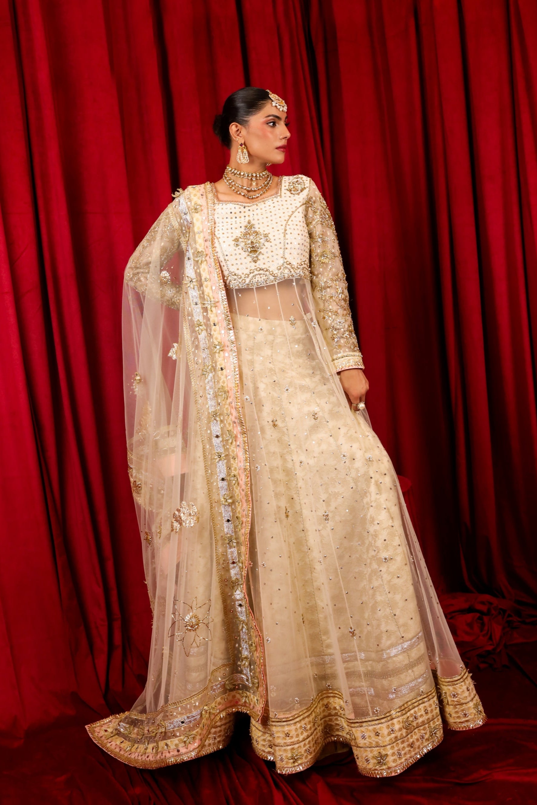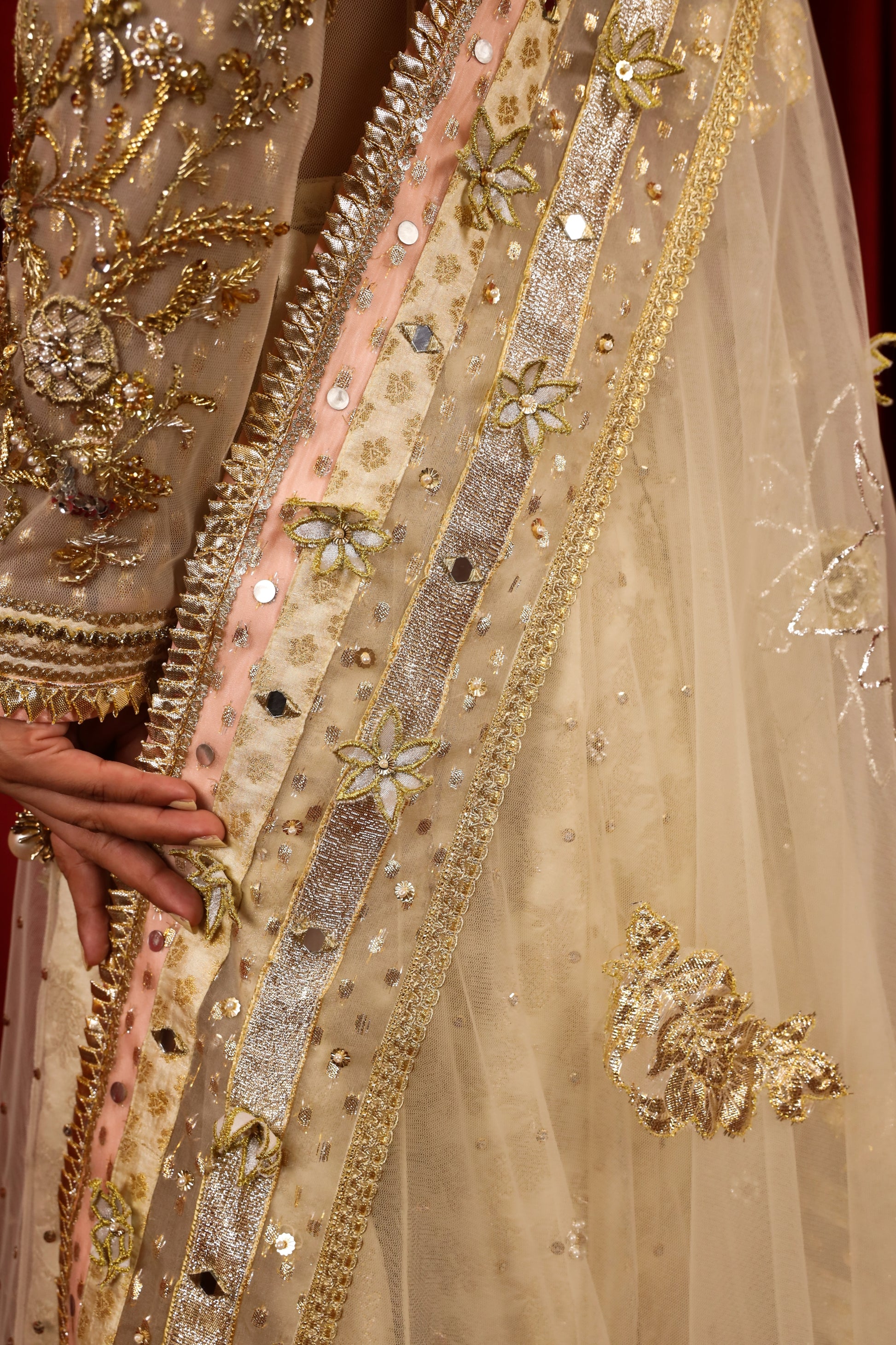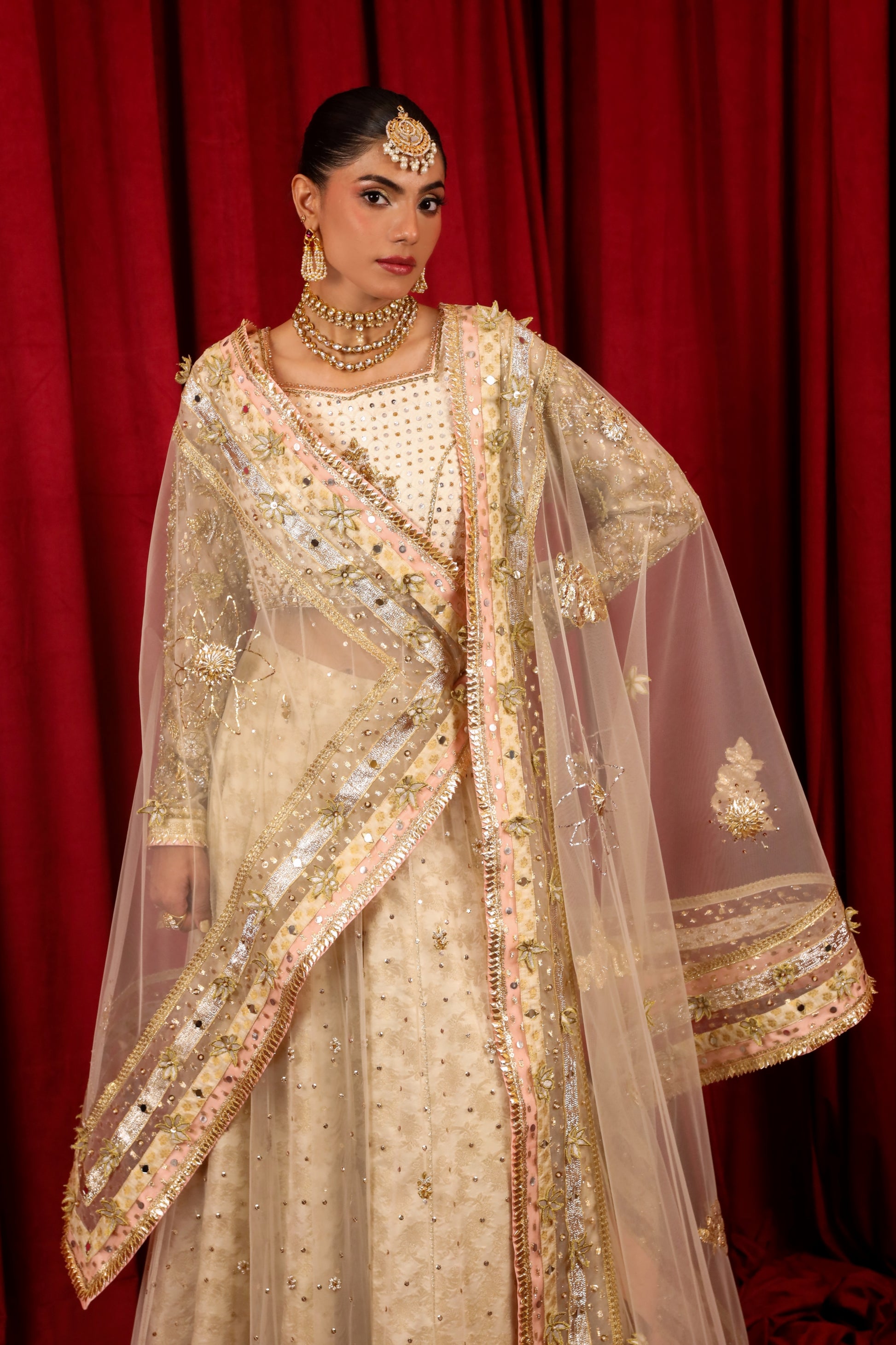 Handcrafted off-white pishwas with lehnga, crafted on net fabric and finished with intricate gotta lace. The borders bloom with 3D florals, while a modern neckline with playful tassels adds contemporary charm. A statement dupatta with a grand floral motif completes this regal silhouette where tradition meets modern artistry.
