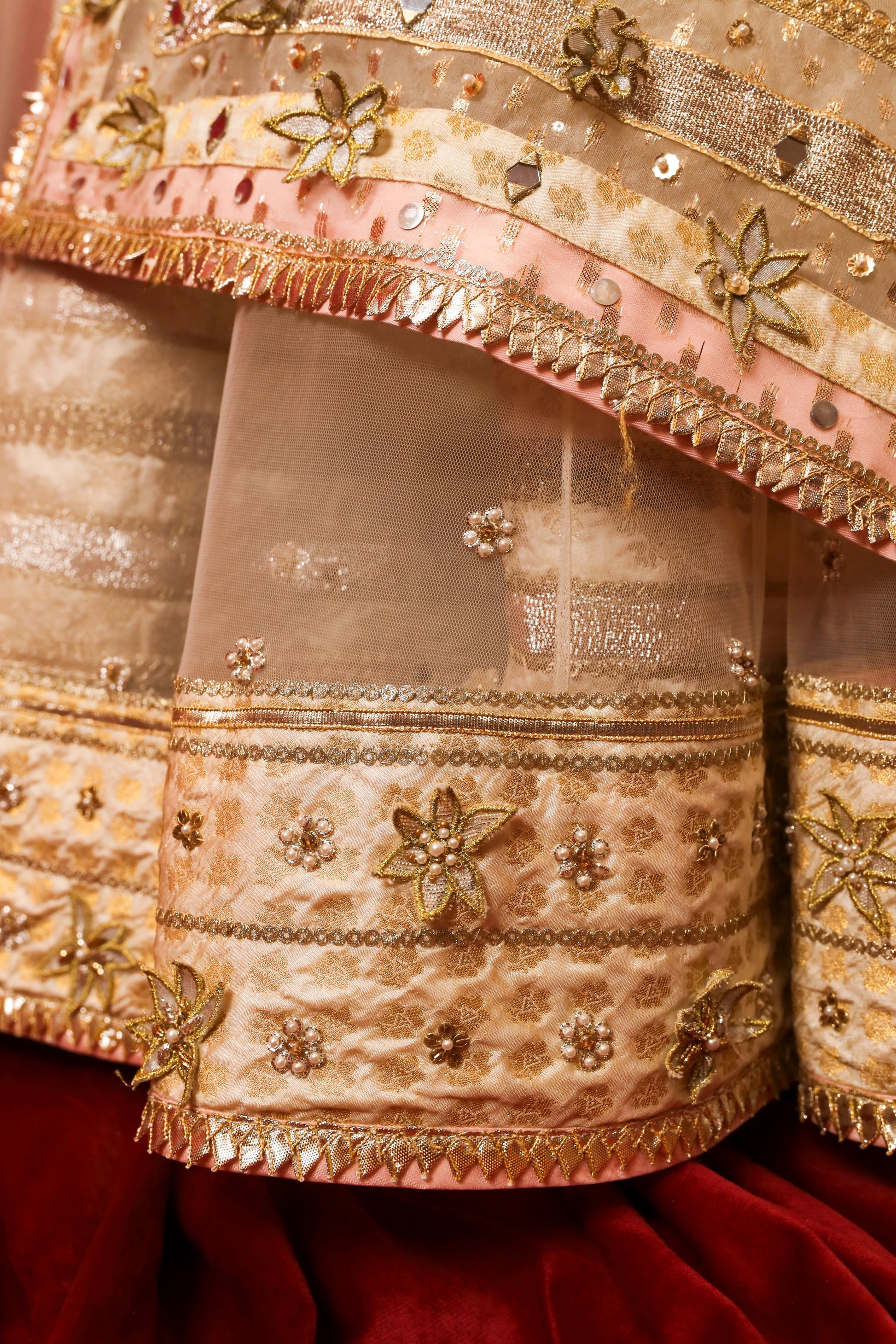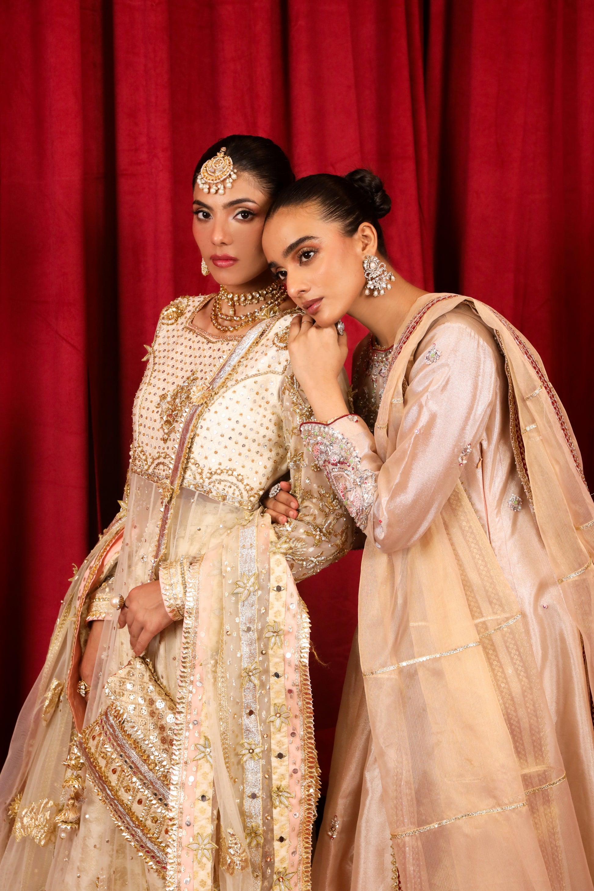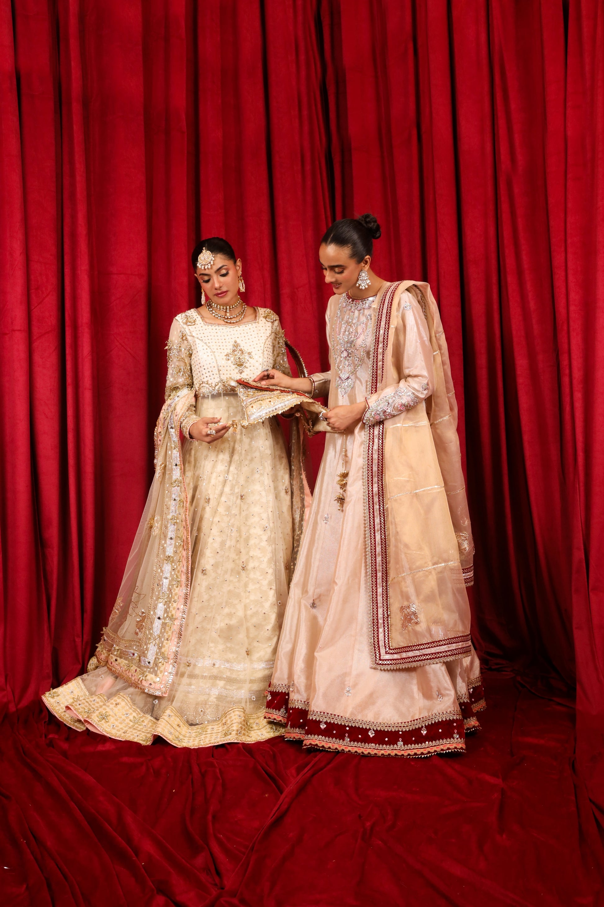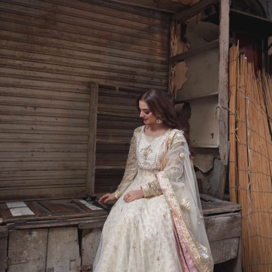 Handcrafted off-white pishwas with lehnga, crafted on net fabric and finished with intricate gotta lace. The borders bloom with 3D florals, while a modern neckline with playful tassels adds contemporary charm. A statement dupatta with a grand floral motif completes this regal silhouette where tradition meets modern artistry.