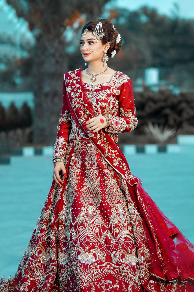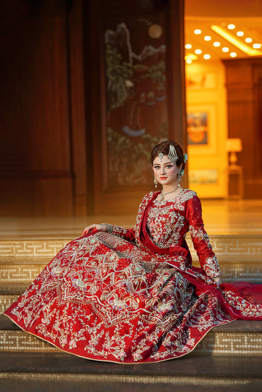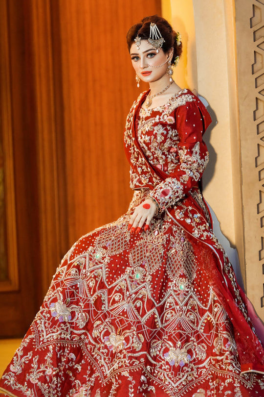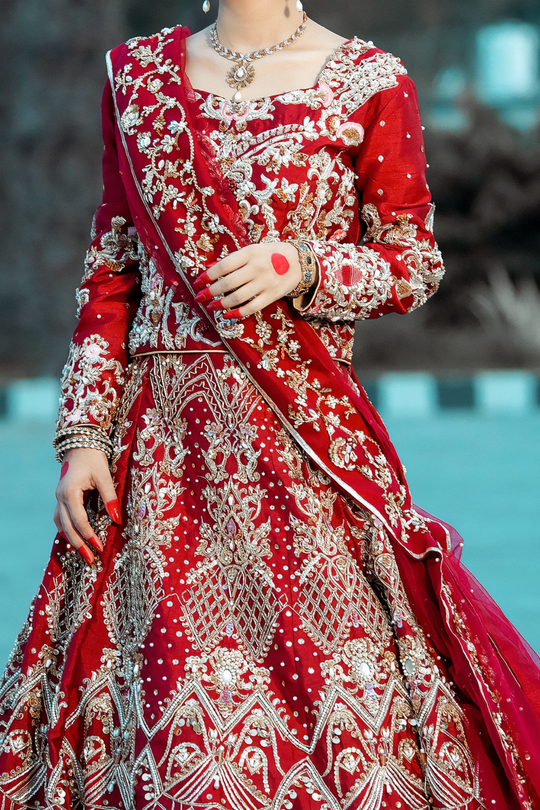A master worked bridal outfit that compliments your style and reflects your persona in multitudinous ways.Pick our beautifully hand embroidered lehnga for your upcoming event in burgundy colour, adorned with golden zardozi dabka and resham work.