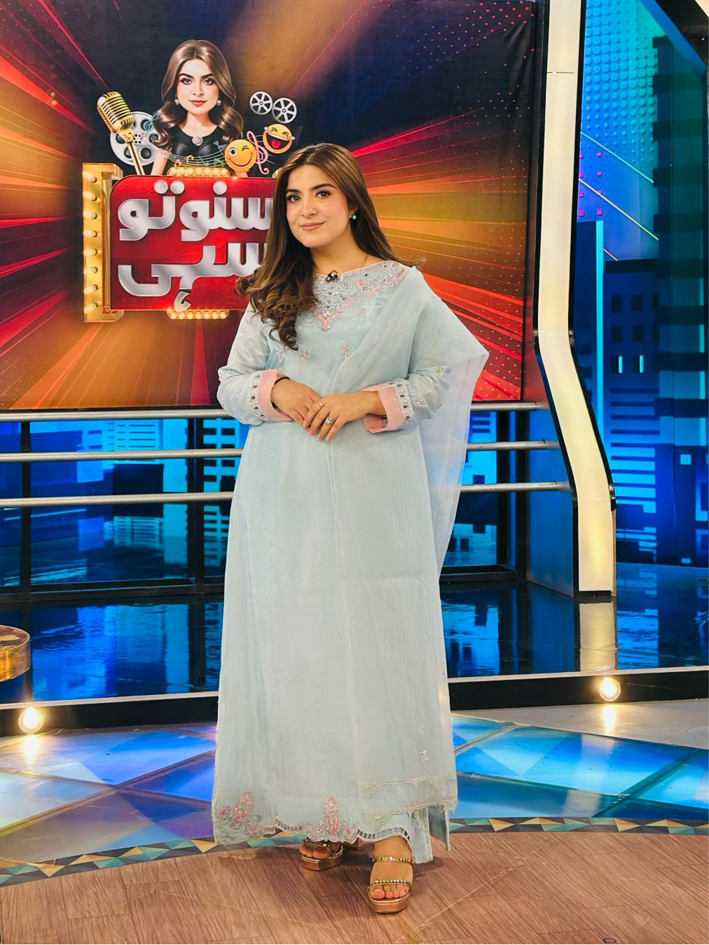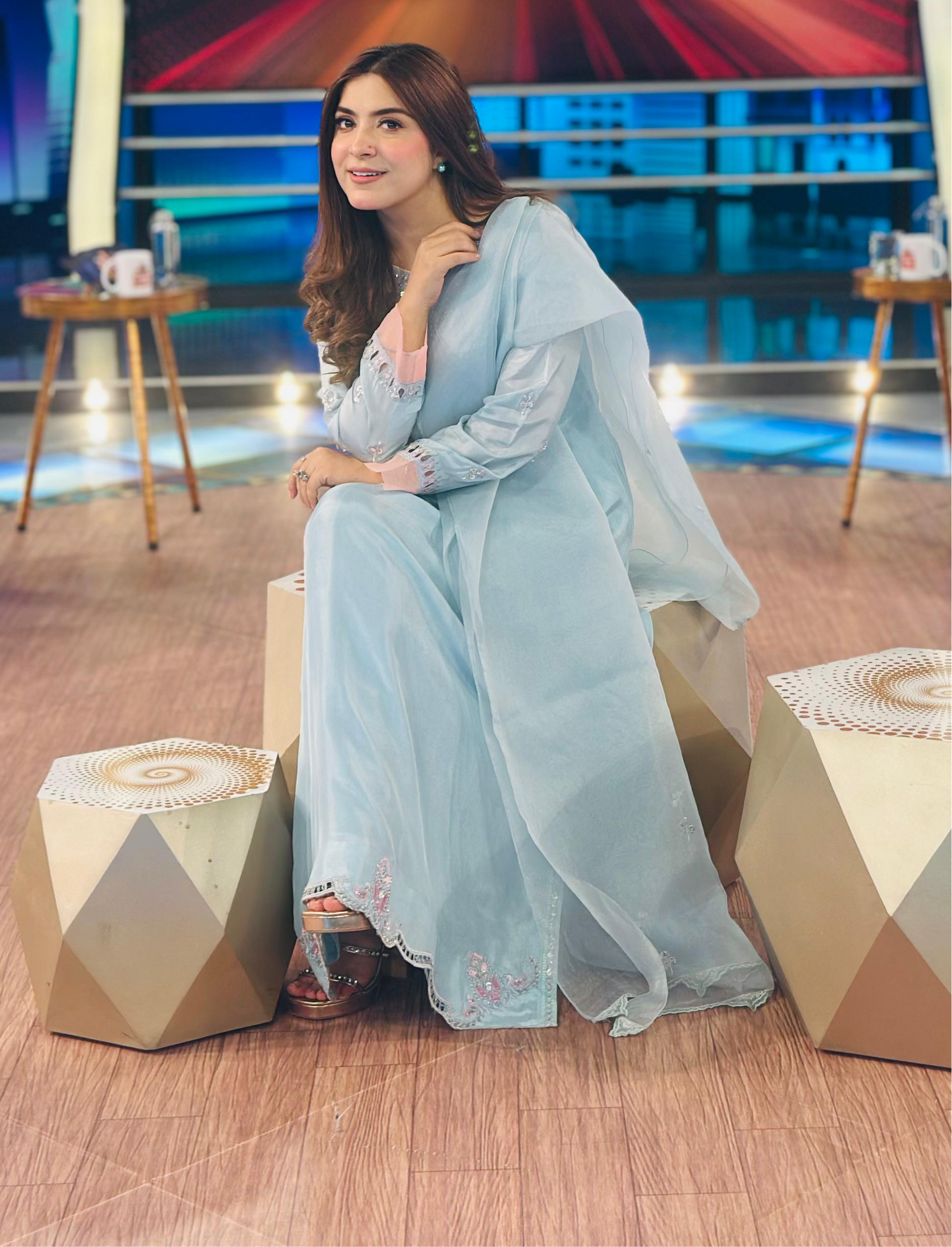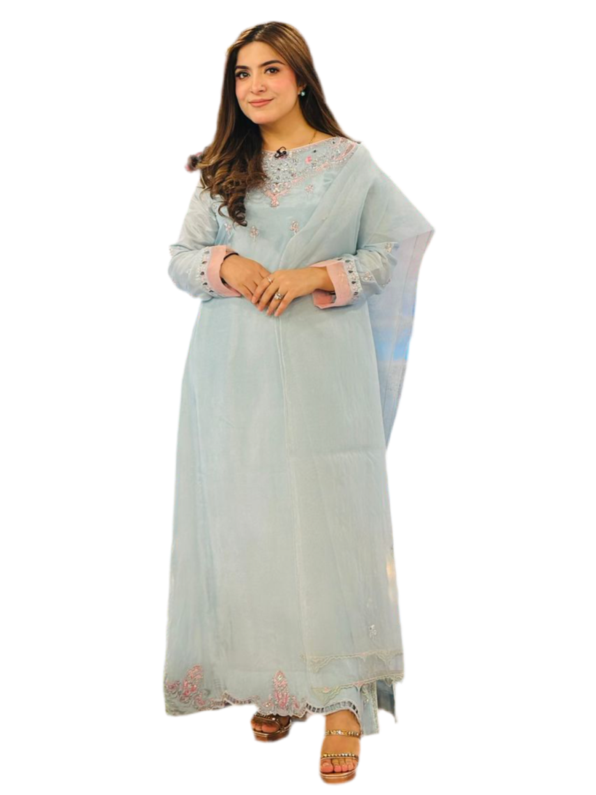This soft pastel blue floor-length shirt flows with elegance, paired effortlessly with a delicate organza dupatta — a look made for graceful moments.