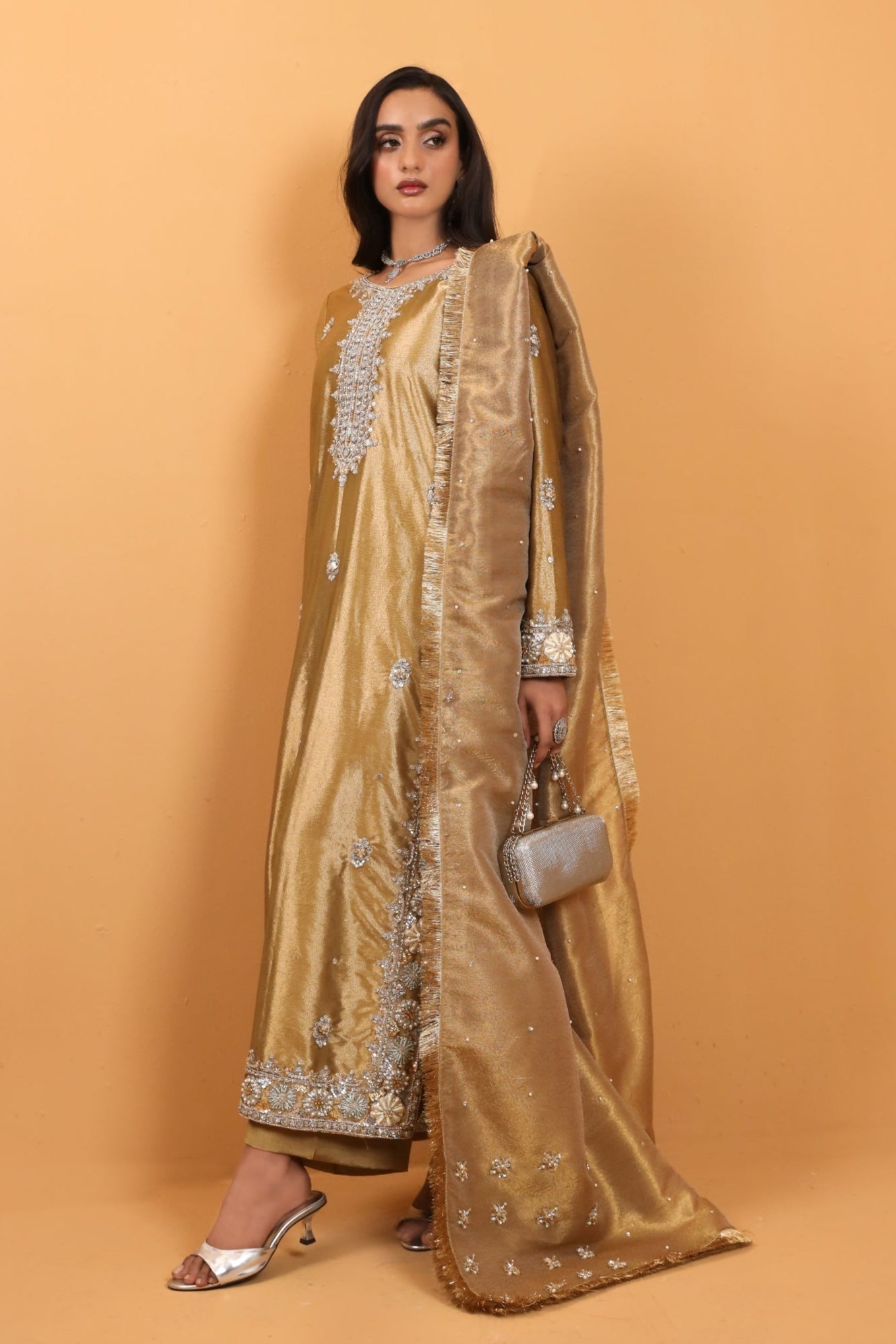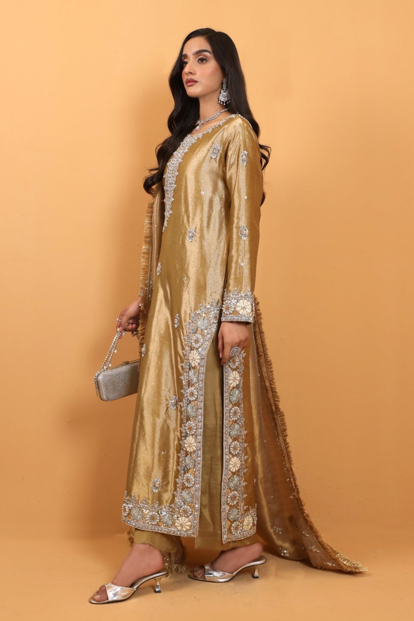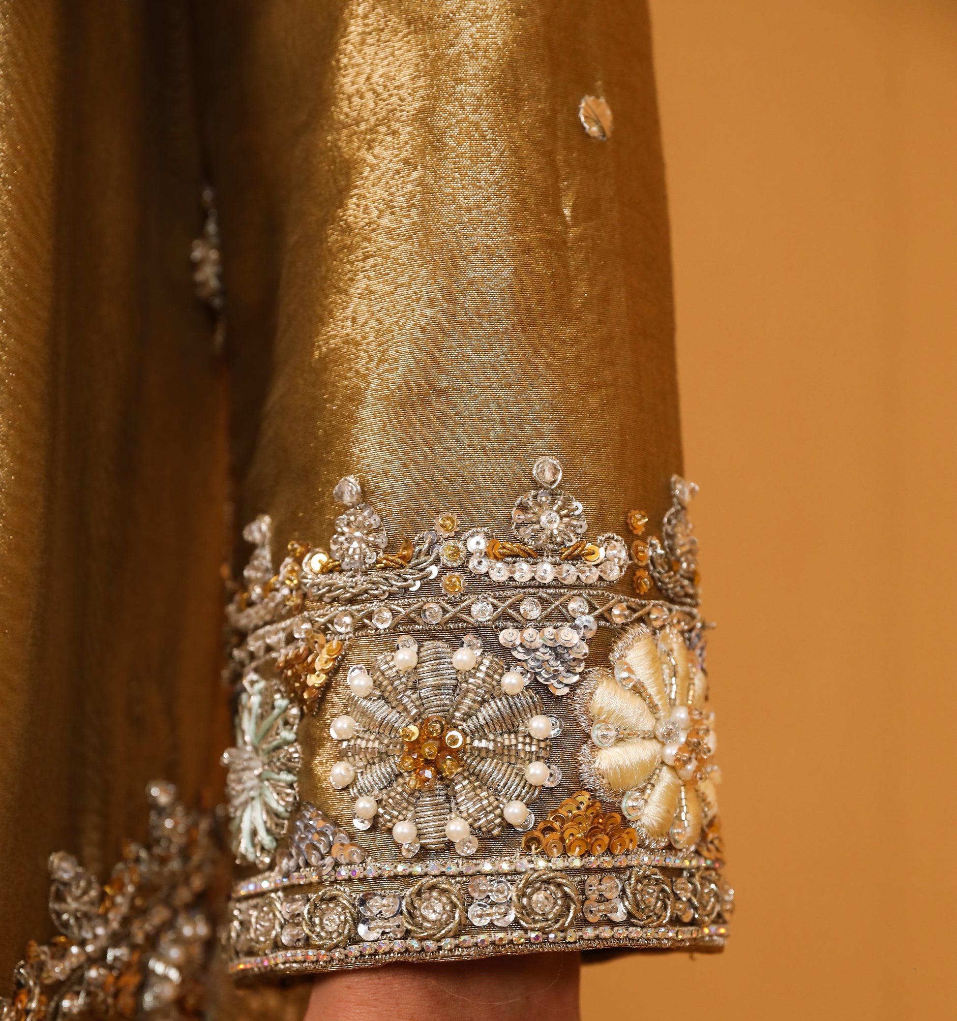 Discover the elegance of Elena, a stunning creation crafted from luxurious Tissue fabric. Adorned with intricate detailing of cora, dabka, and resham, the antique gold shirt exudes opulence. Complete the look with embroidered Raw Silk culottes and a sheer tissue organza dupatta, perfect for any special occasion.