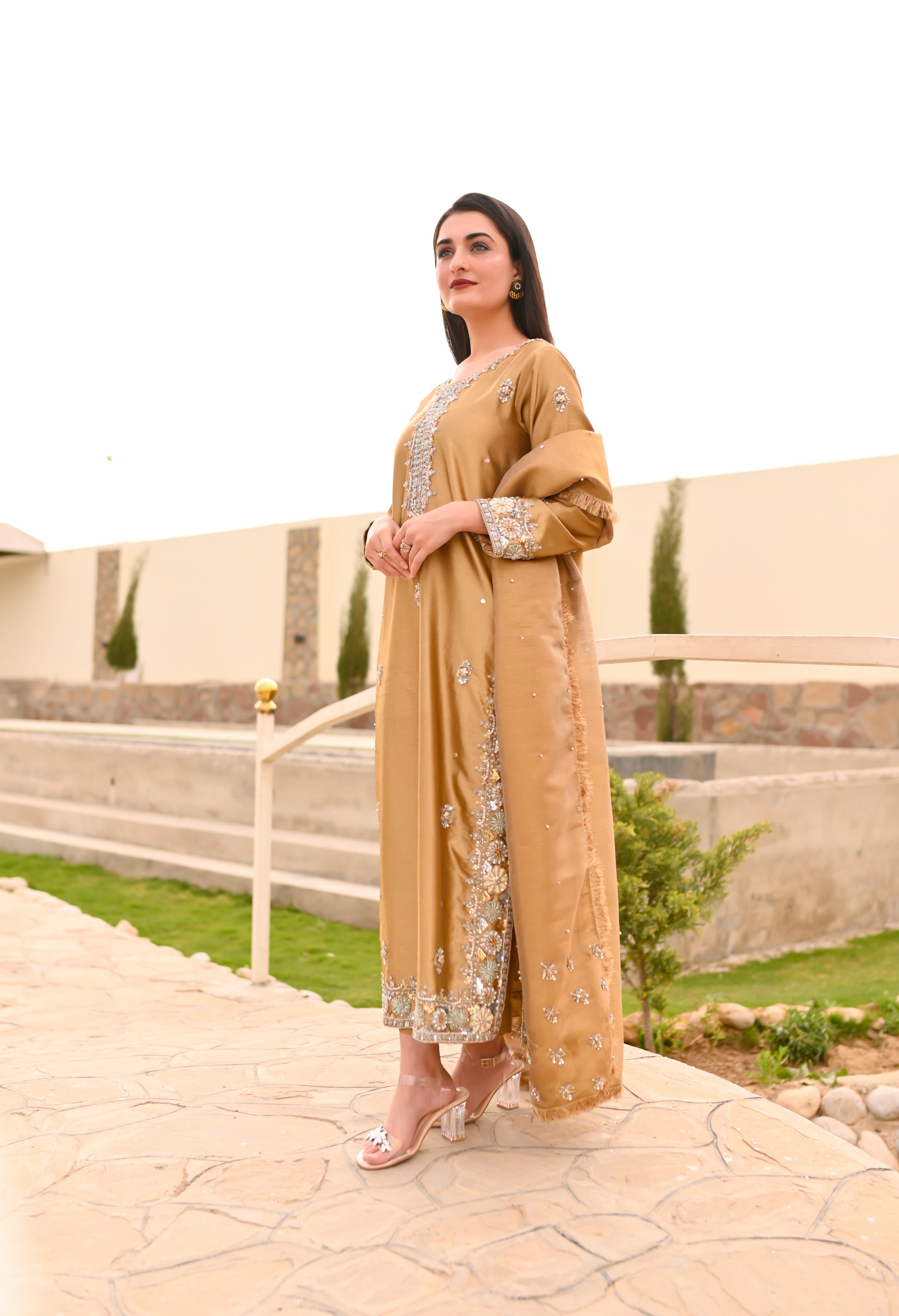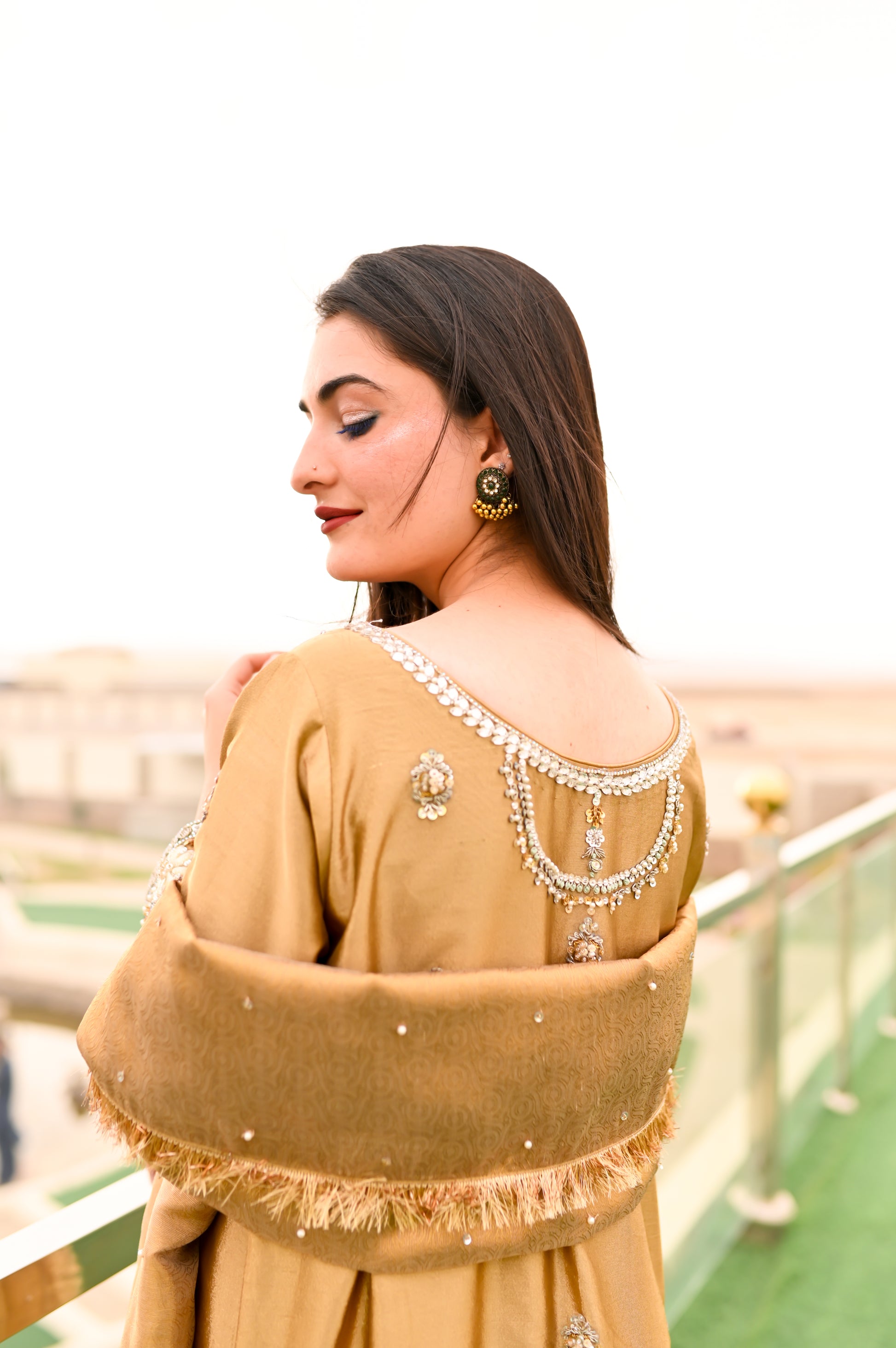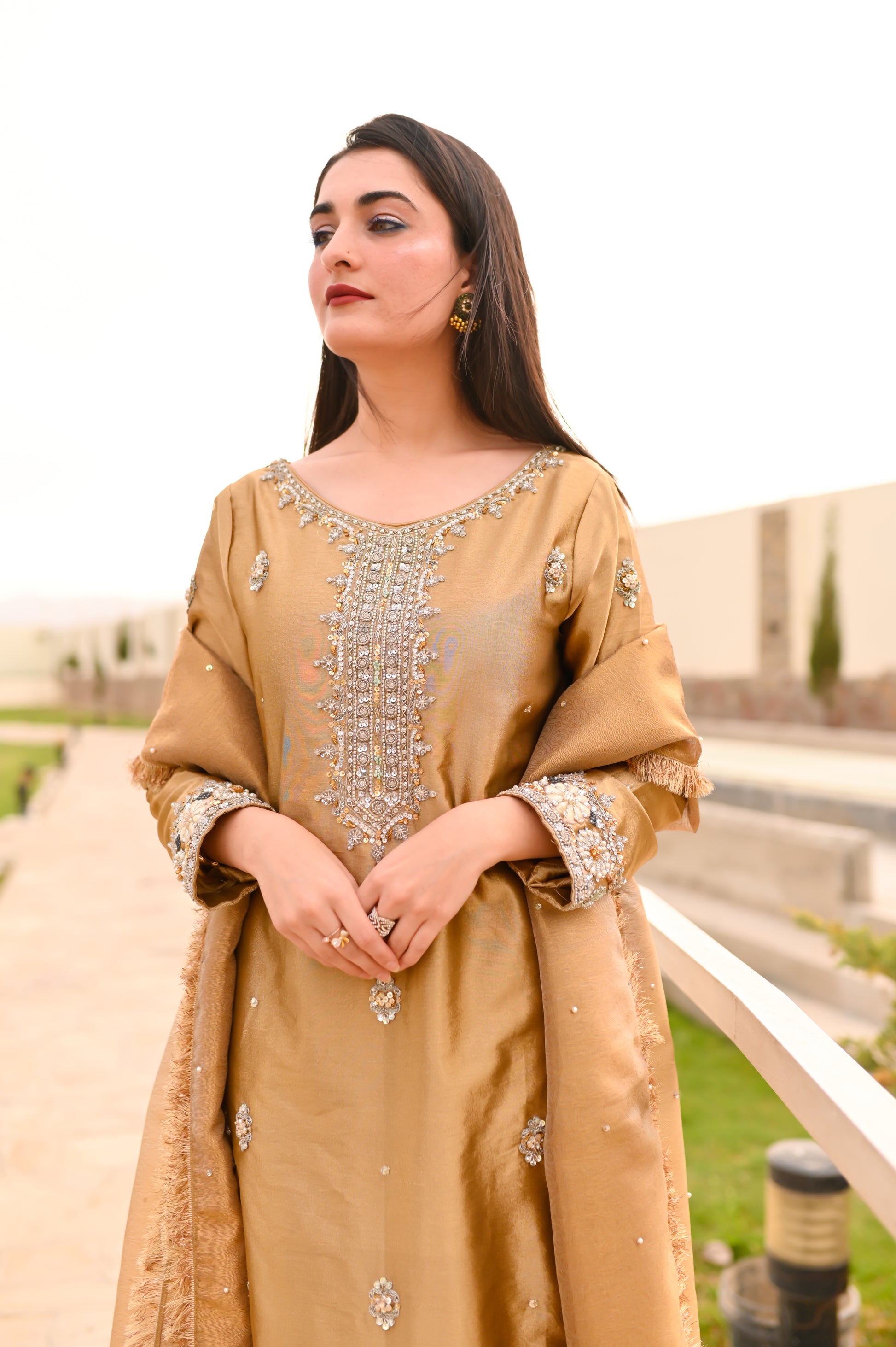 Discover the elegance of Elena, a stunning creation crafted from luxurious Tissue fabric. Adorned with intricate detailing of cora, dabka, and resham, the antique gold shirt exudes opulence. Complete the look with embroidered Raw Silk culottes and a sheer tissue organza dupatta, perfect for any special occasion.