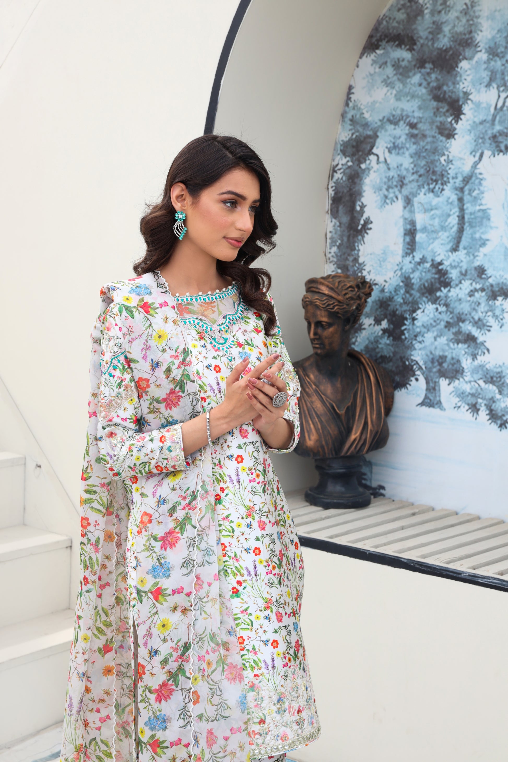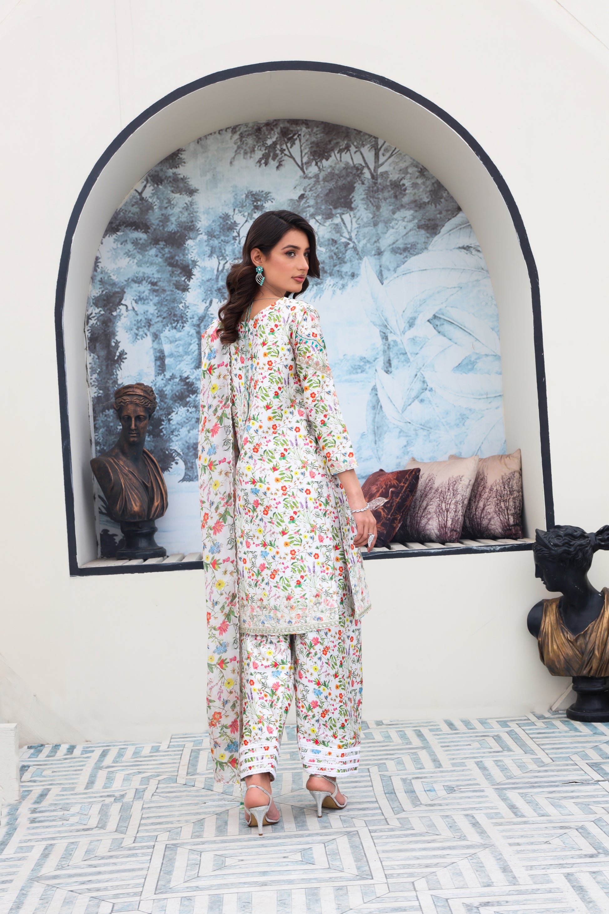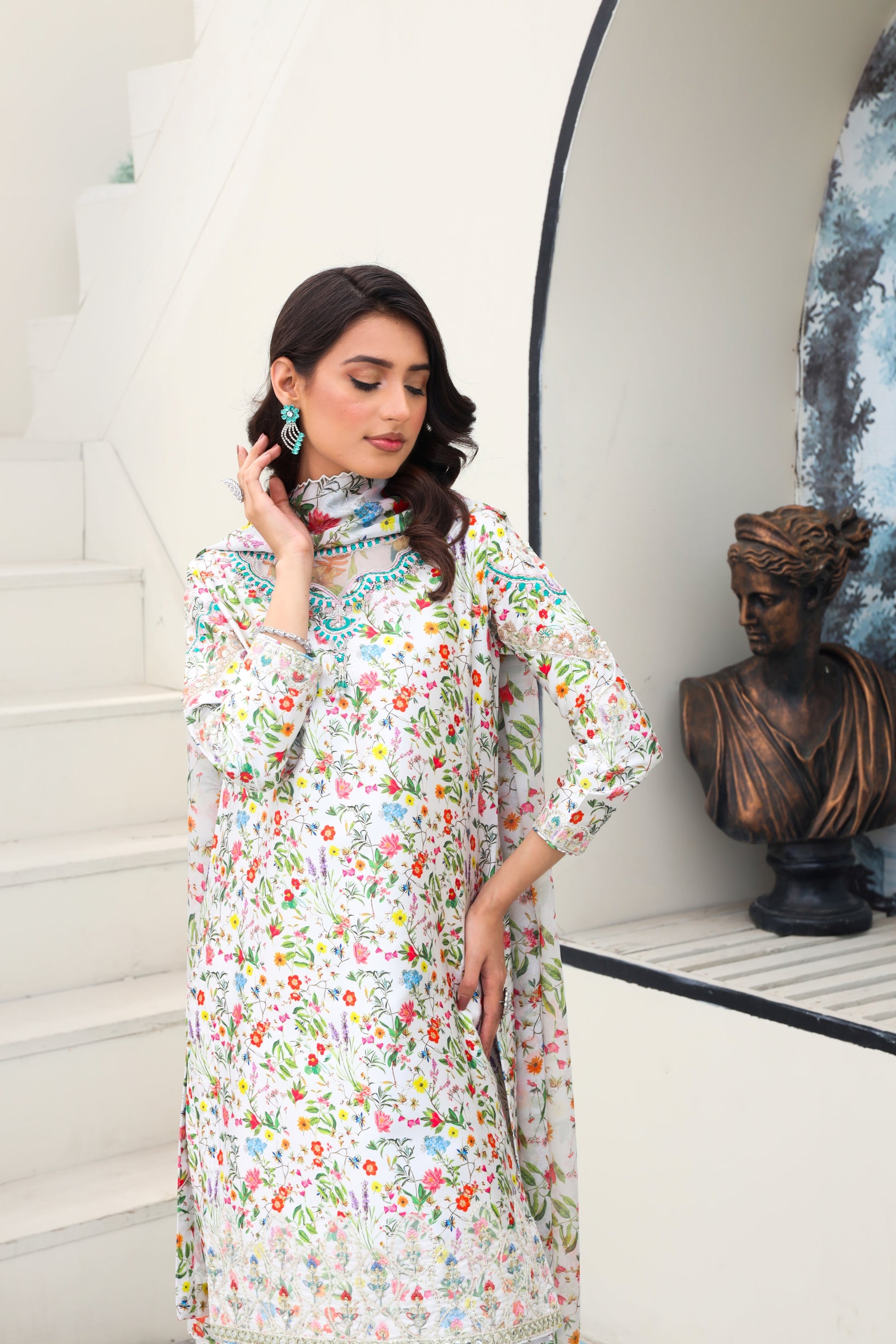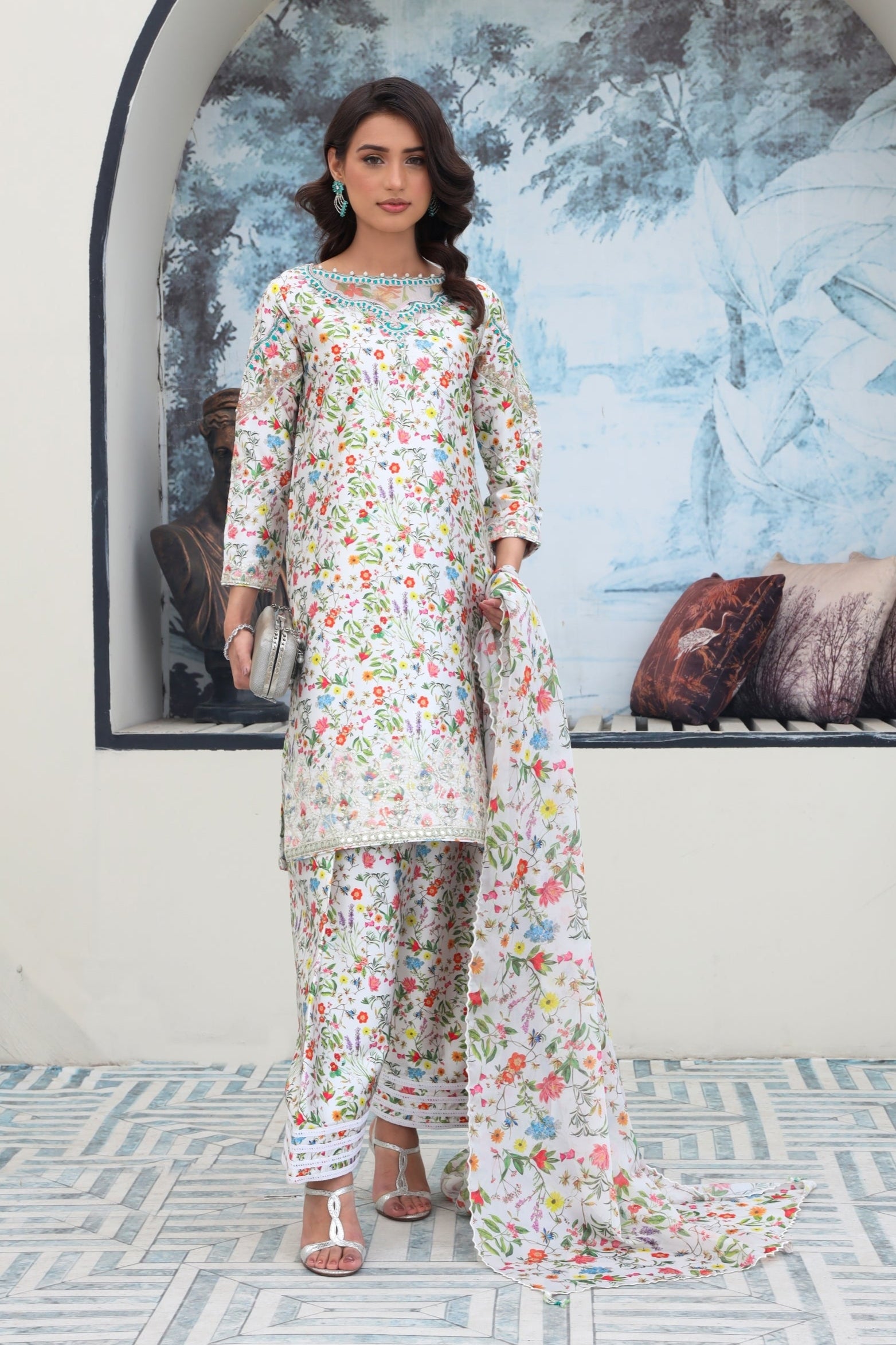 This classic ensemble features a full sleeve floral silk shirt, elegantly adorned on the neckline, back, daaman, and sleeves, paired with lace trims on the shalwar's bottom opening and finished with a matching multi-silk dupatta.