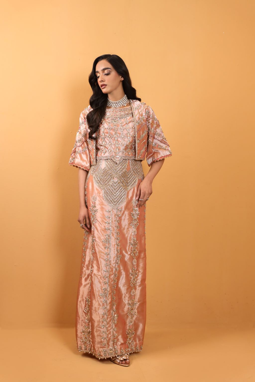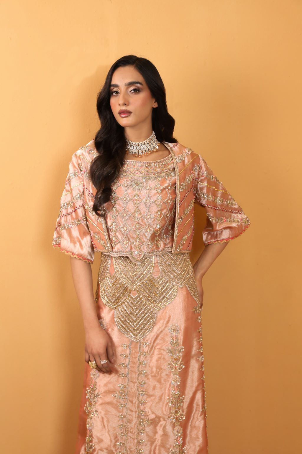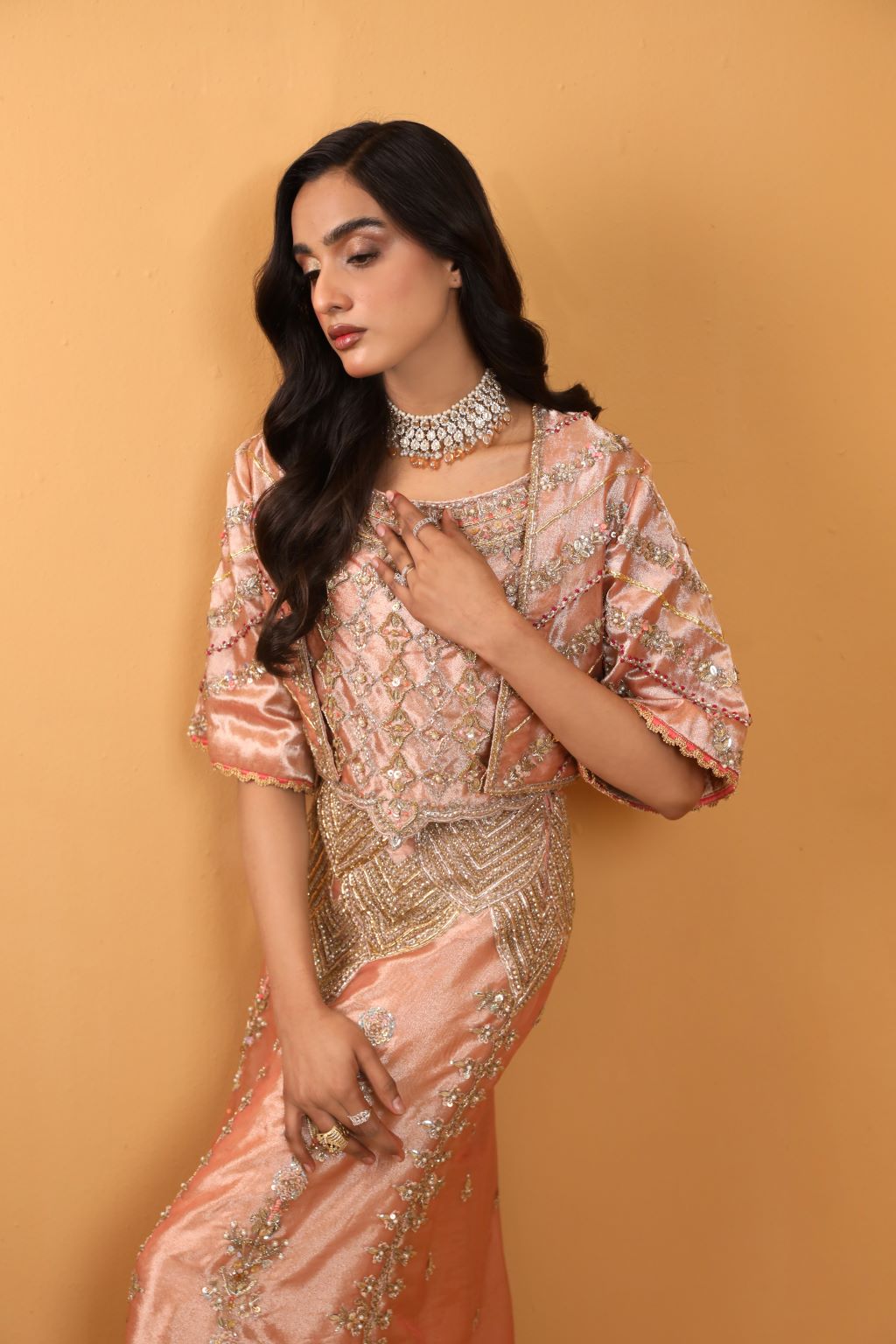 Bold and daring, Amal's signature couture exudes high-end femininity with its crystal and Swarovski embellishments and contemporary modern cut.