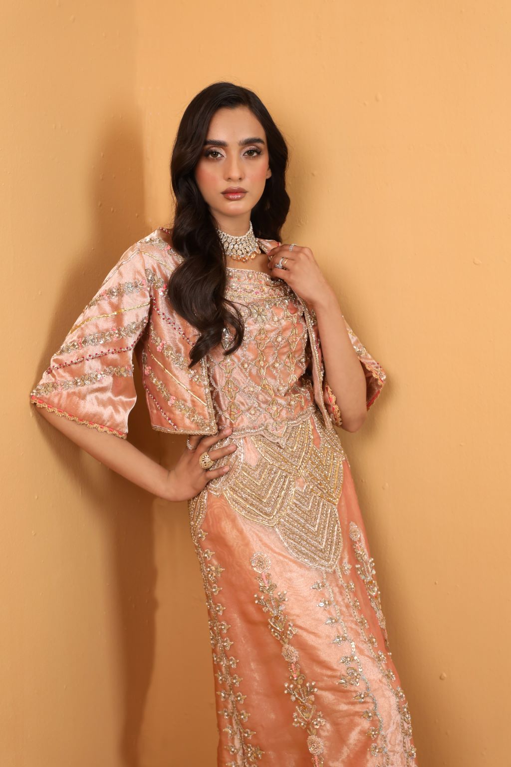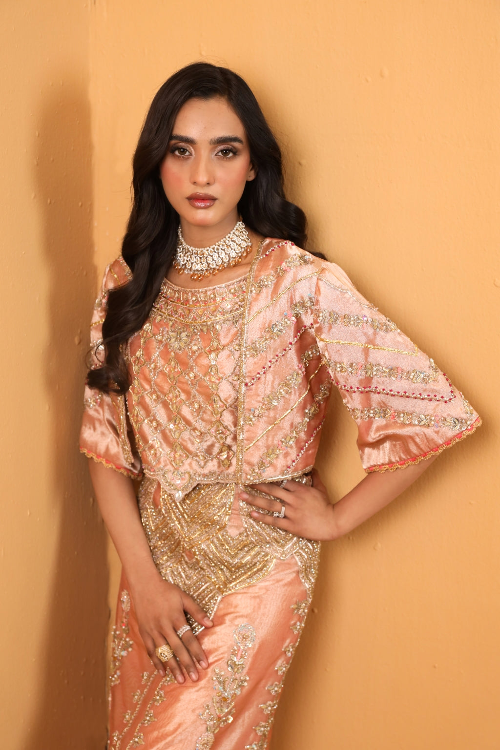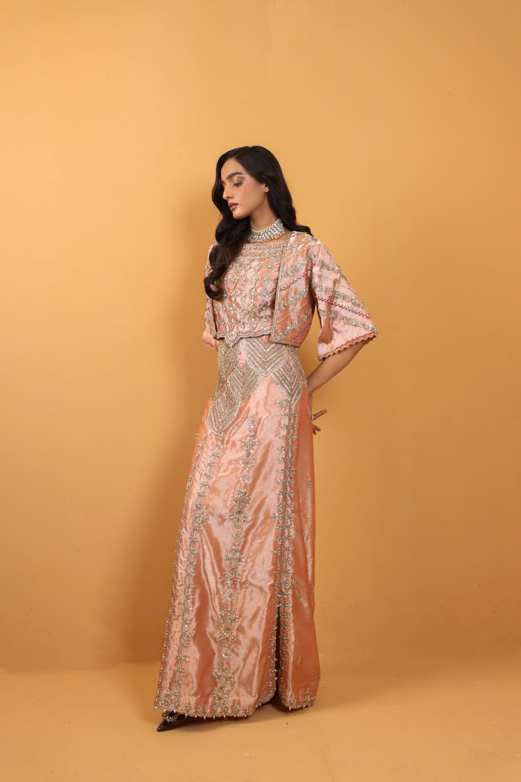 Bold and daring, Amal's signature couture exudes high-end femininity with its crystal and Swarovski embellishments and contemporary modern cut.