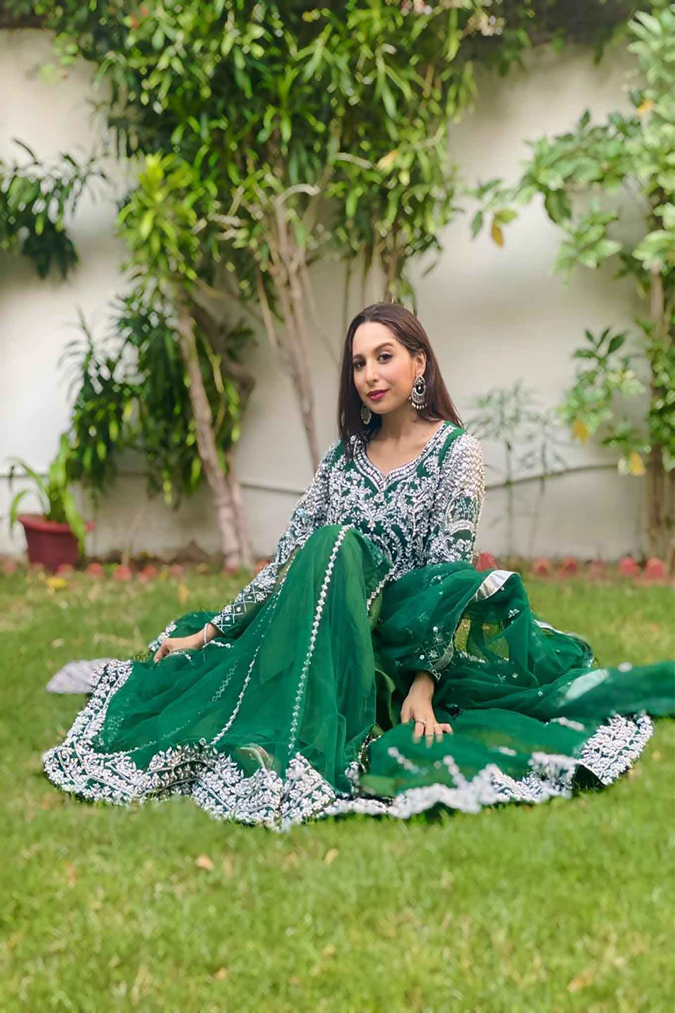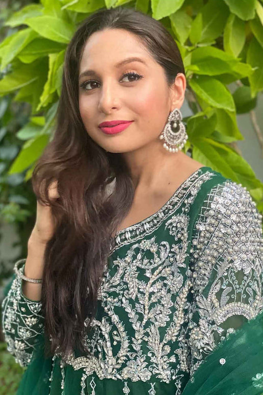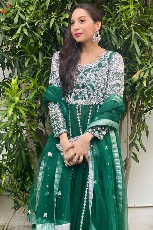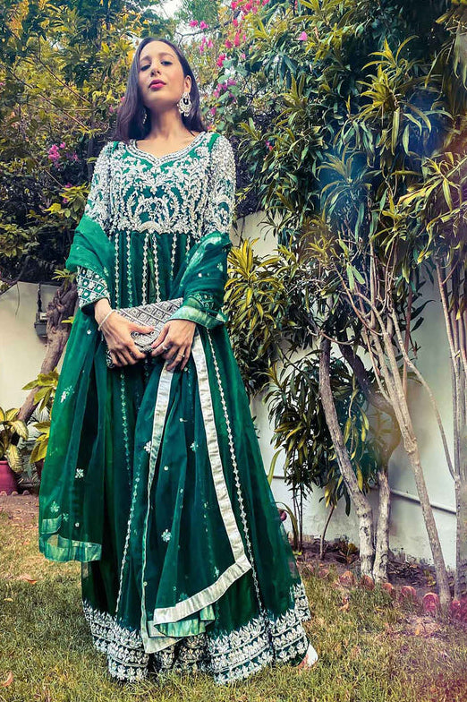 Traditional green kalidar with silver hand embellishment is synonymous to perfection. The colored details on the border along with Tila work is absolutely ethereal.it is perfect for any festive event."