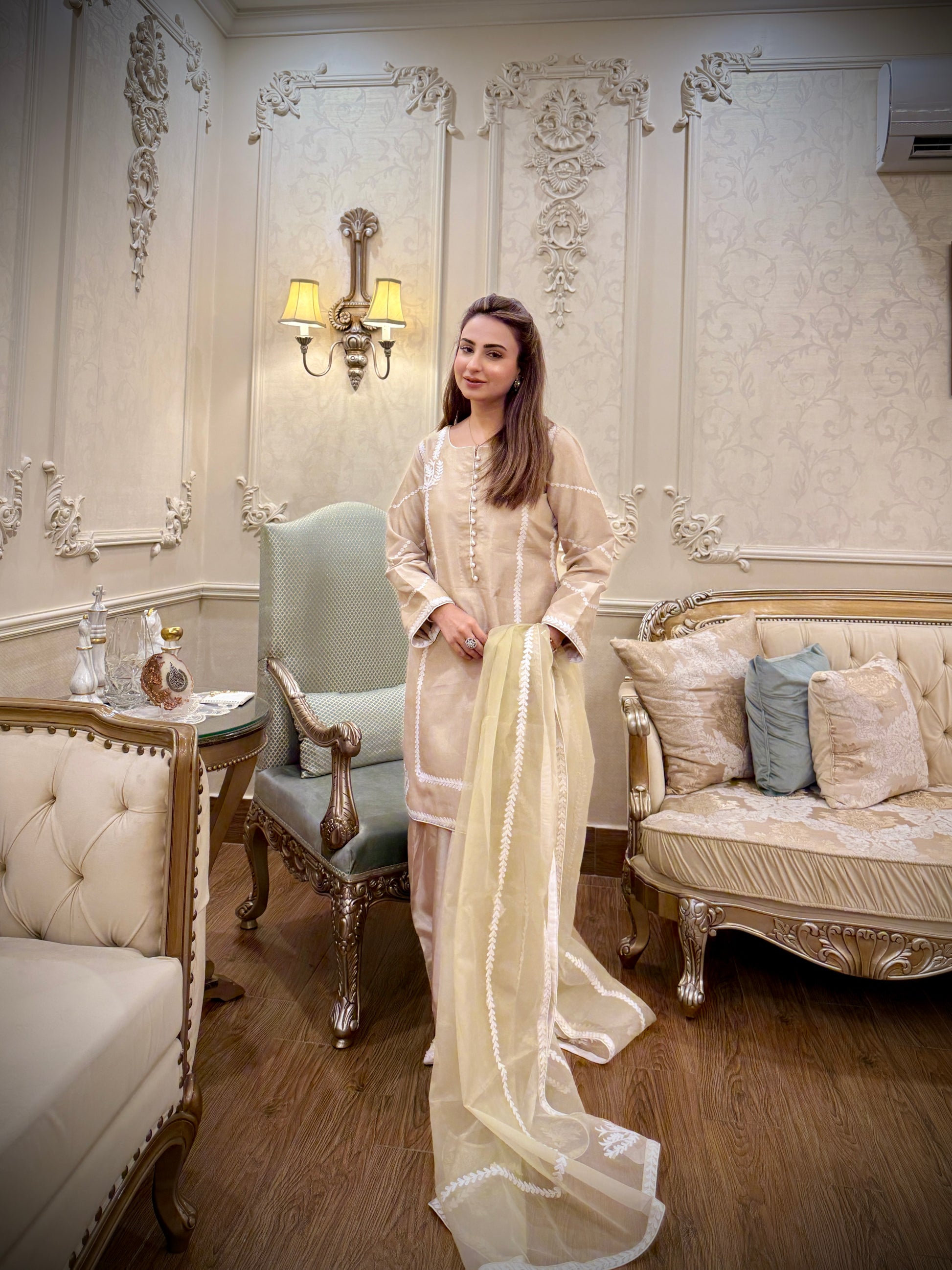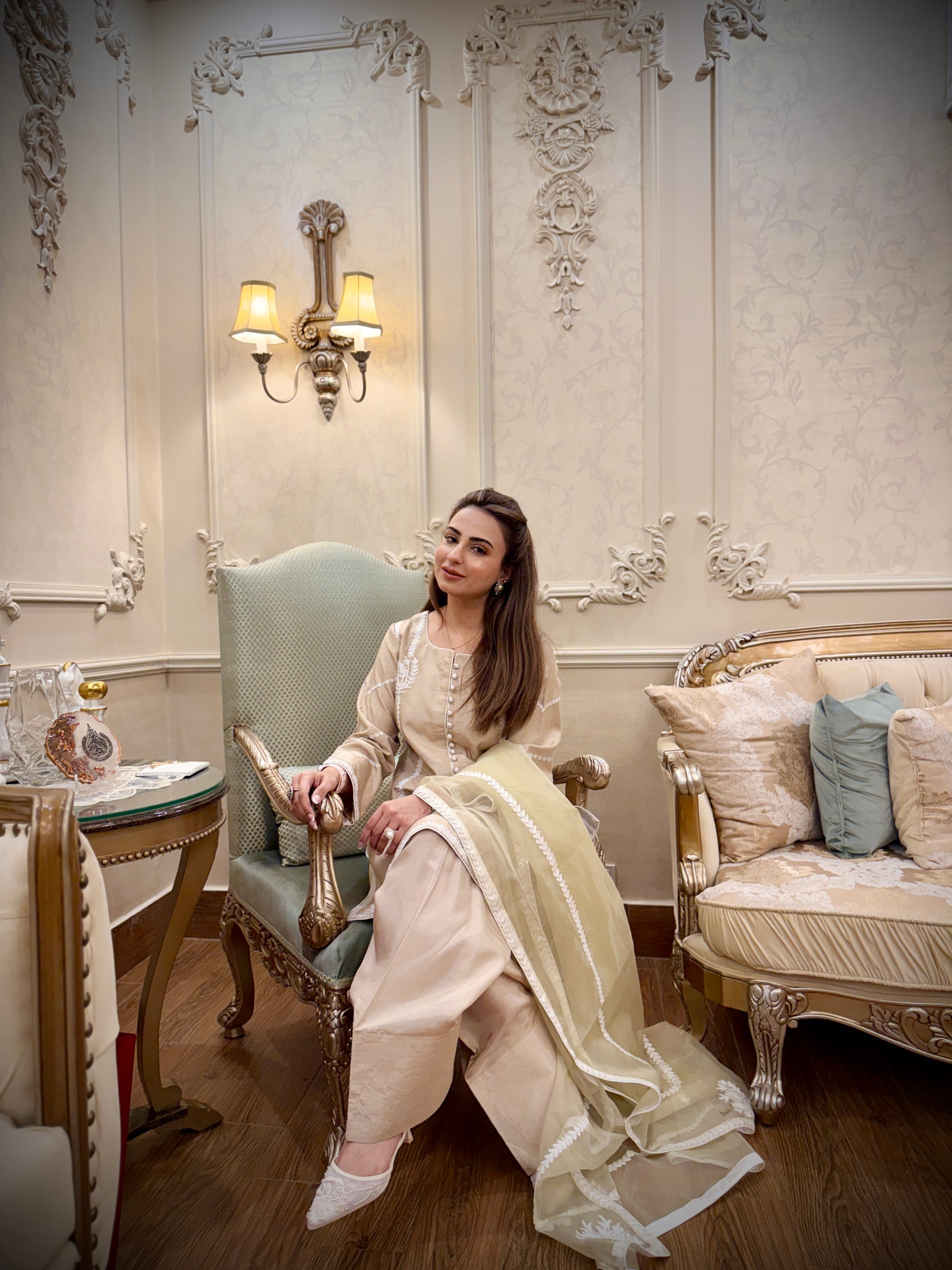 A symphony of heritage and luxury, this enchanting ensemble unfolds like a timeless tale. The elegant beige shirt is intricately embroidered with delicate artistry, while the traditional farshi shalwar radiates royal opulence. The organza dupatta with all-side double borders and corner motifs, adds an ethereal touch of Glamour.