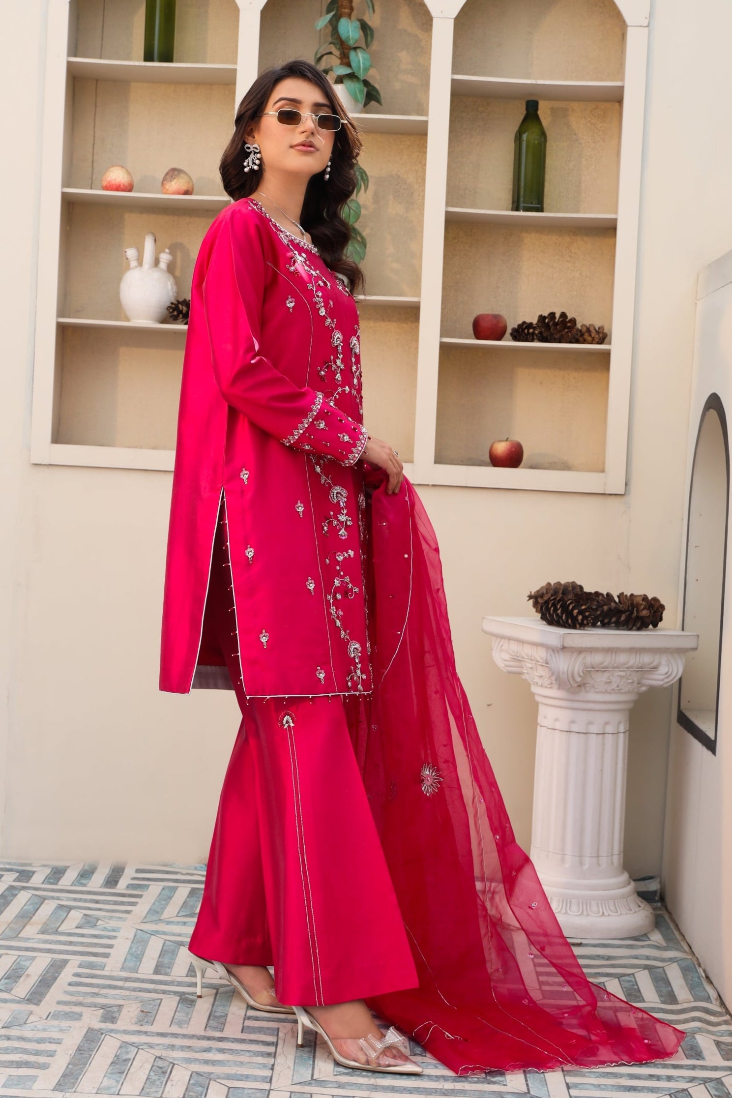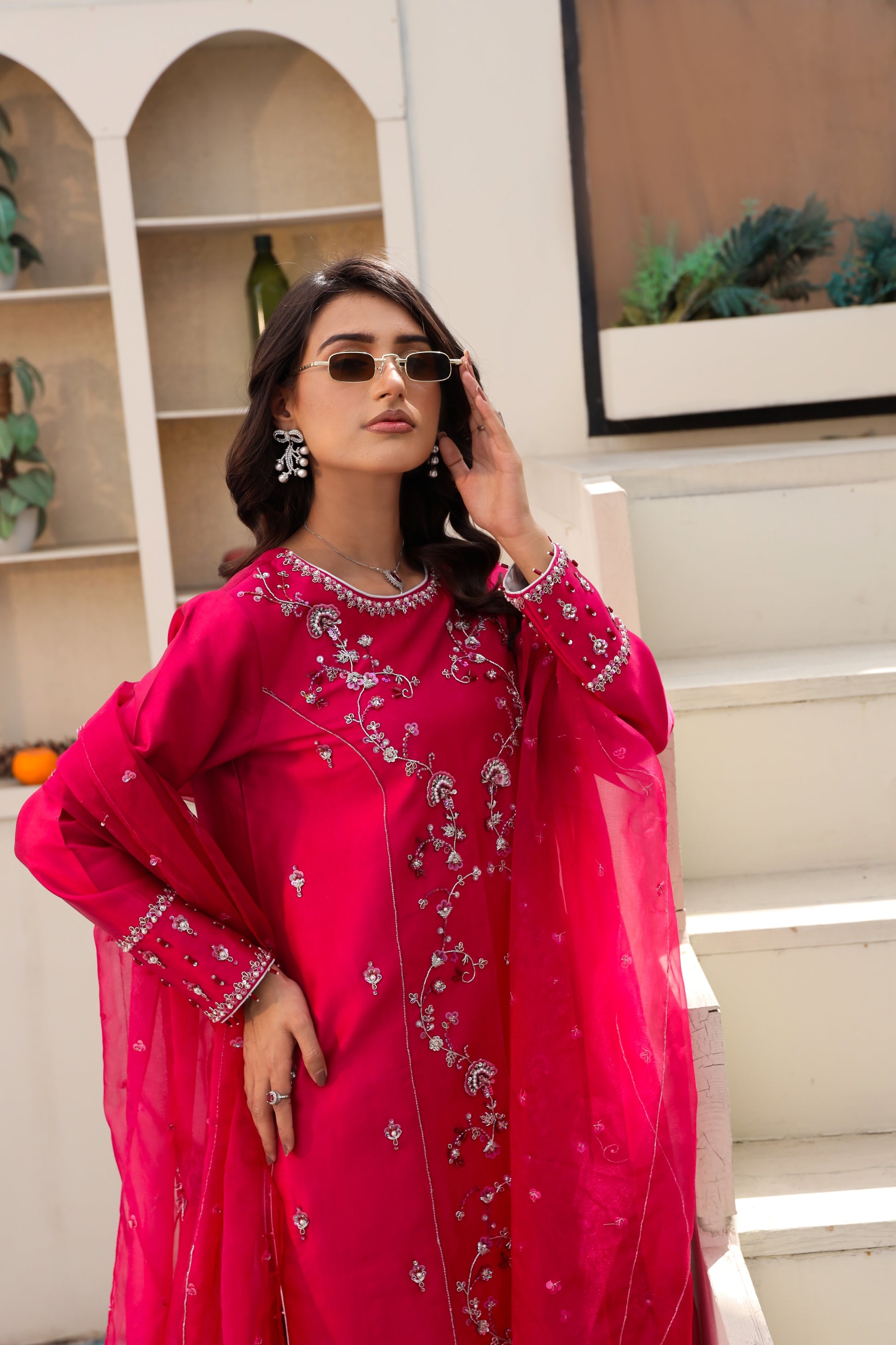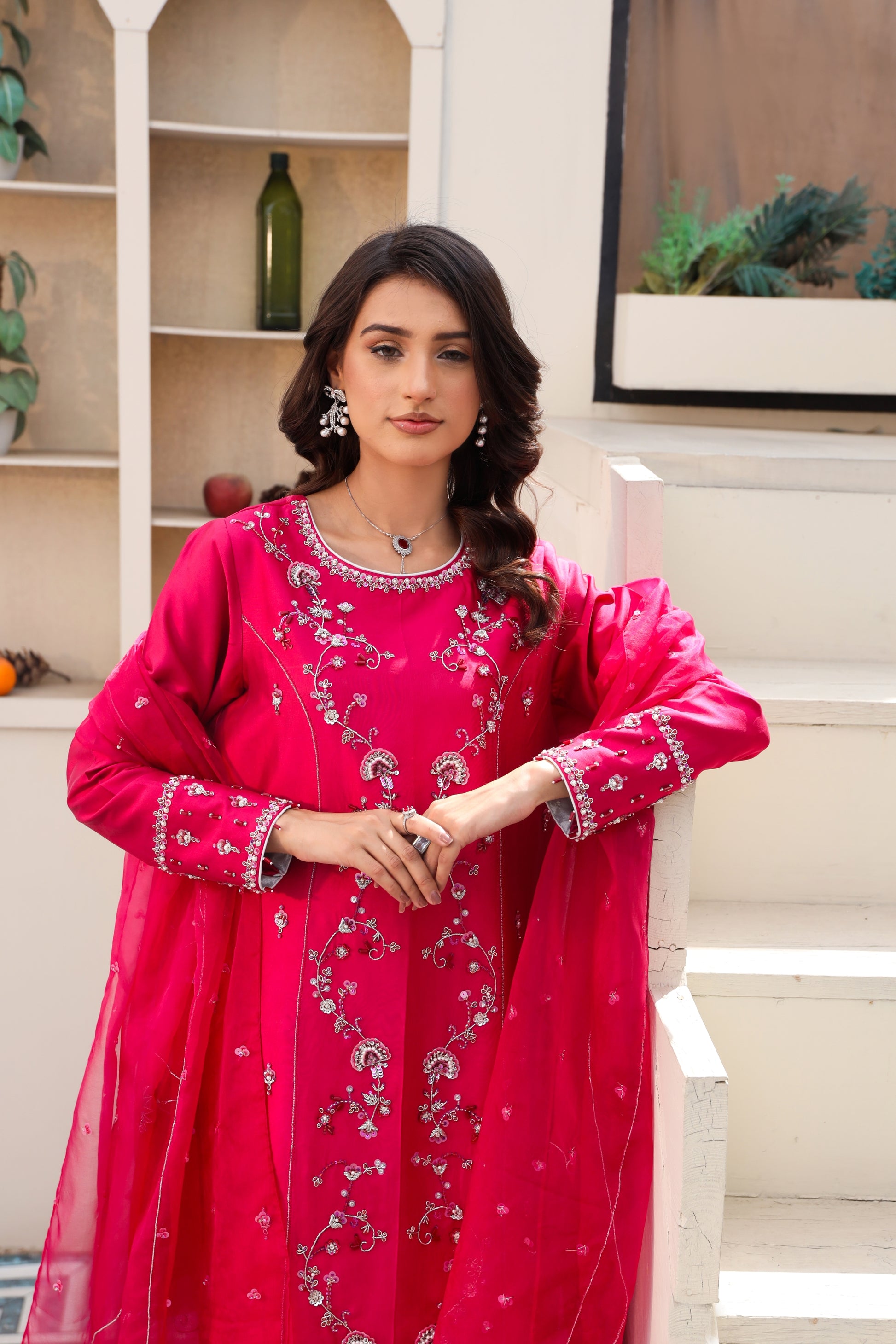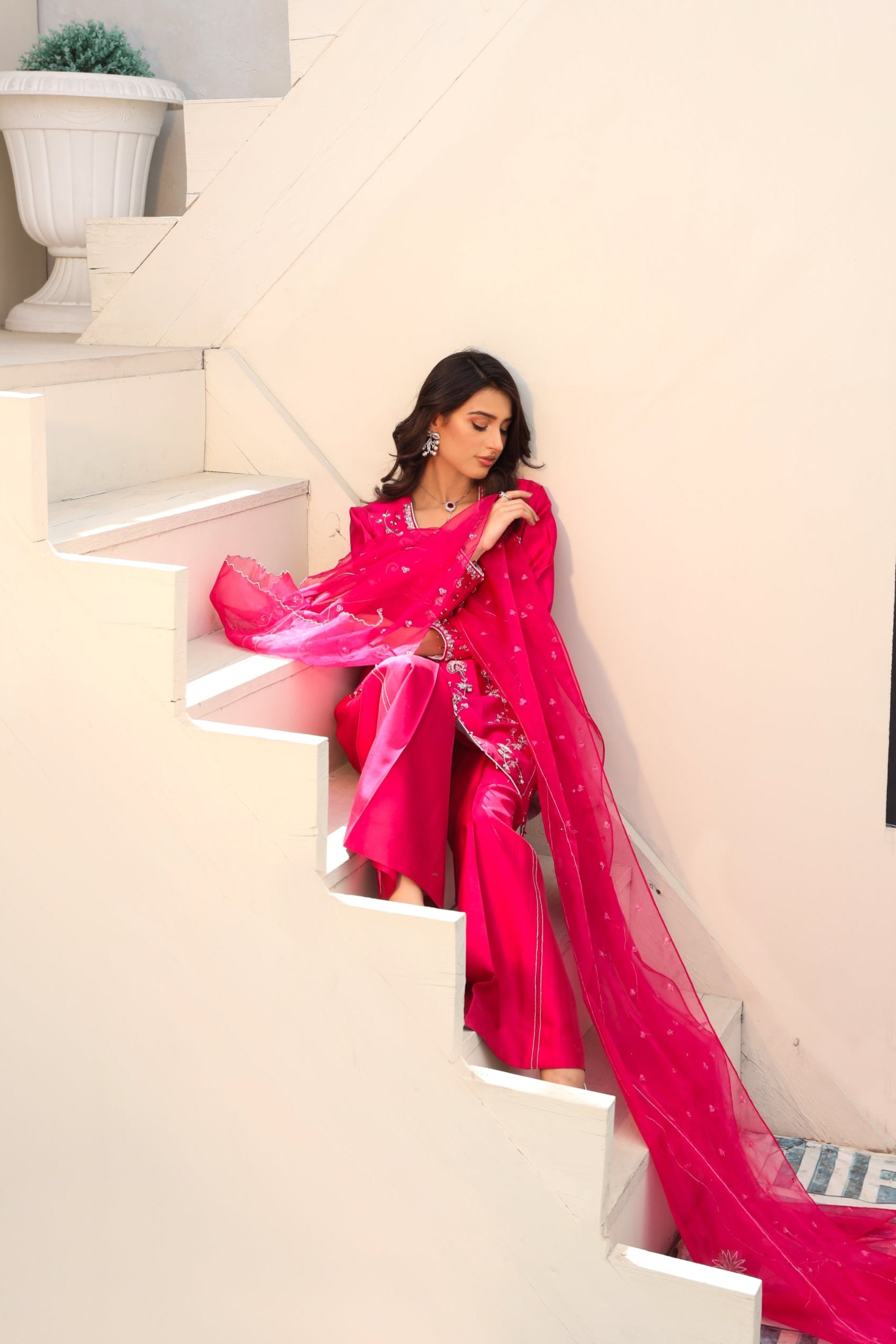 This hot pink ensemble exudes elegance and sophistication, featuring pure tussle silk short shirt with silver hand embellishments.Including a tailored modern pants , and an organza dupatta with delicate wind patterns.