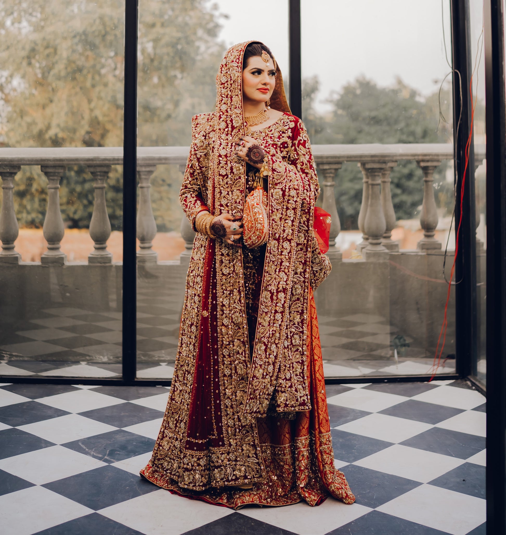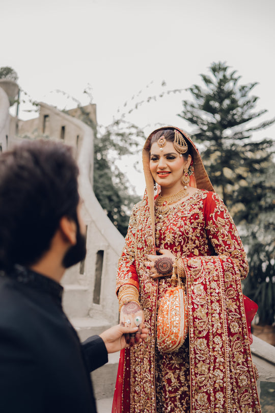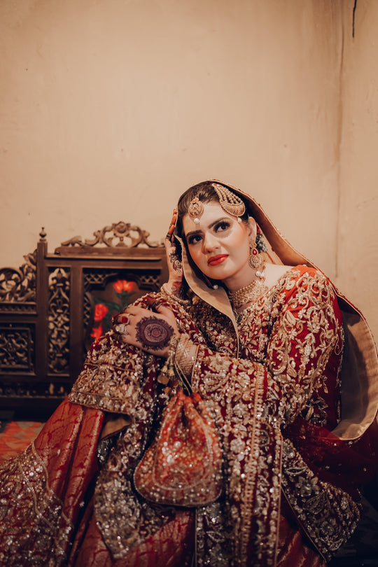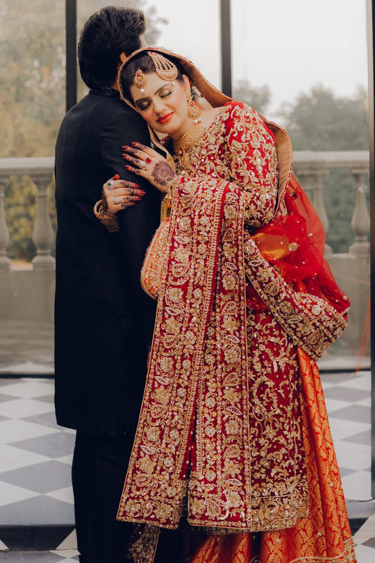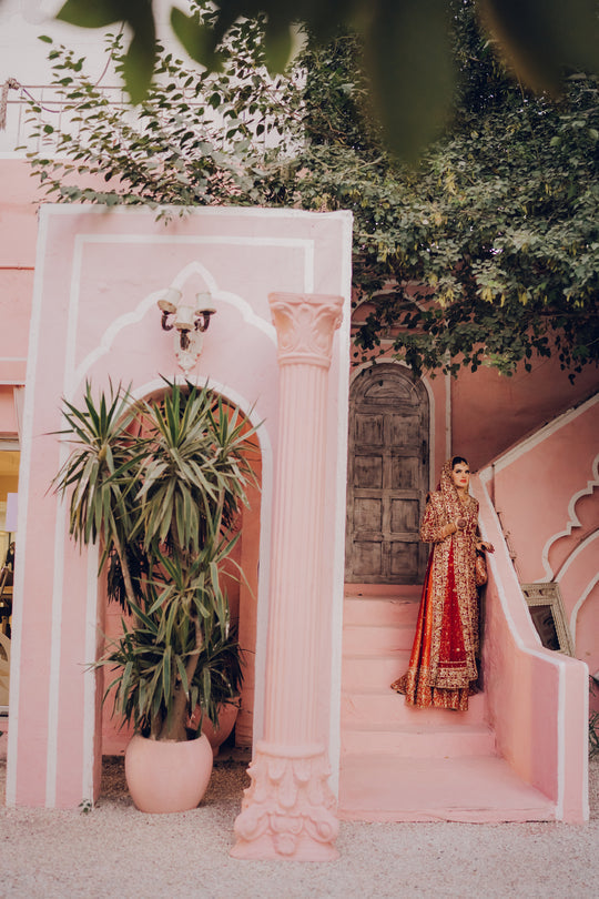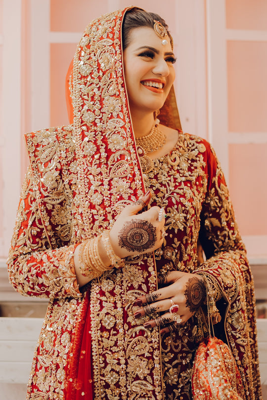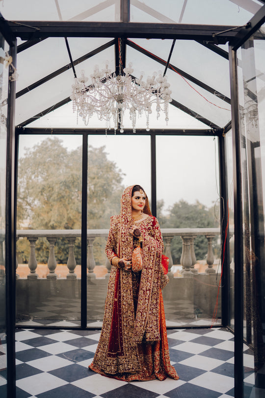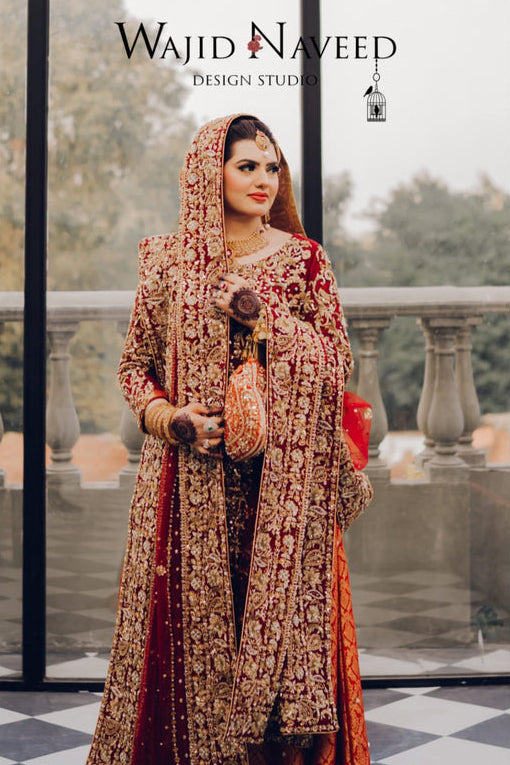Our gorgeous traditional Totally handmade masterpiece Intricately detail adorned with magical craftsmanship and the feminine silhouette  reflecting the designer love for heritage and classic sophistication. This bridal reflects on the theme of royalty with the finest craftsmanship and exquisite shade.