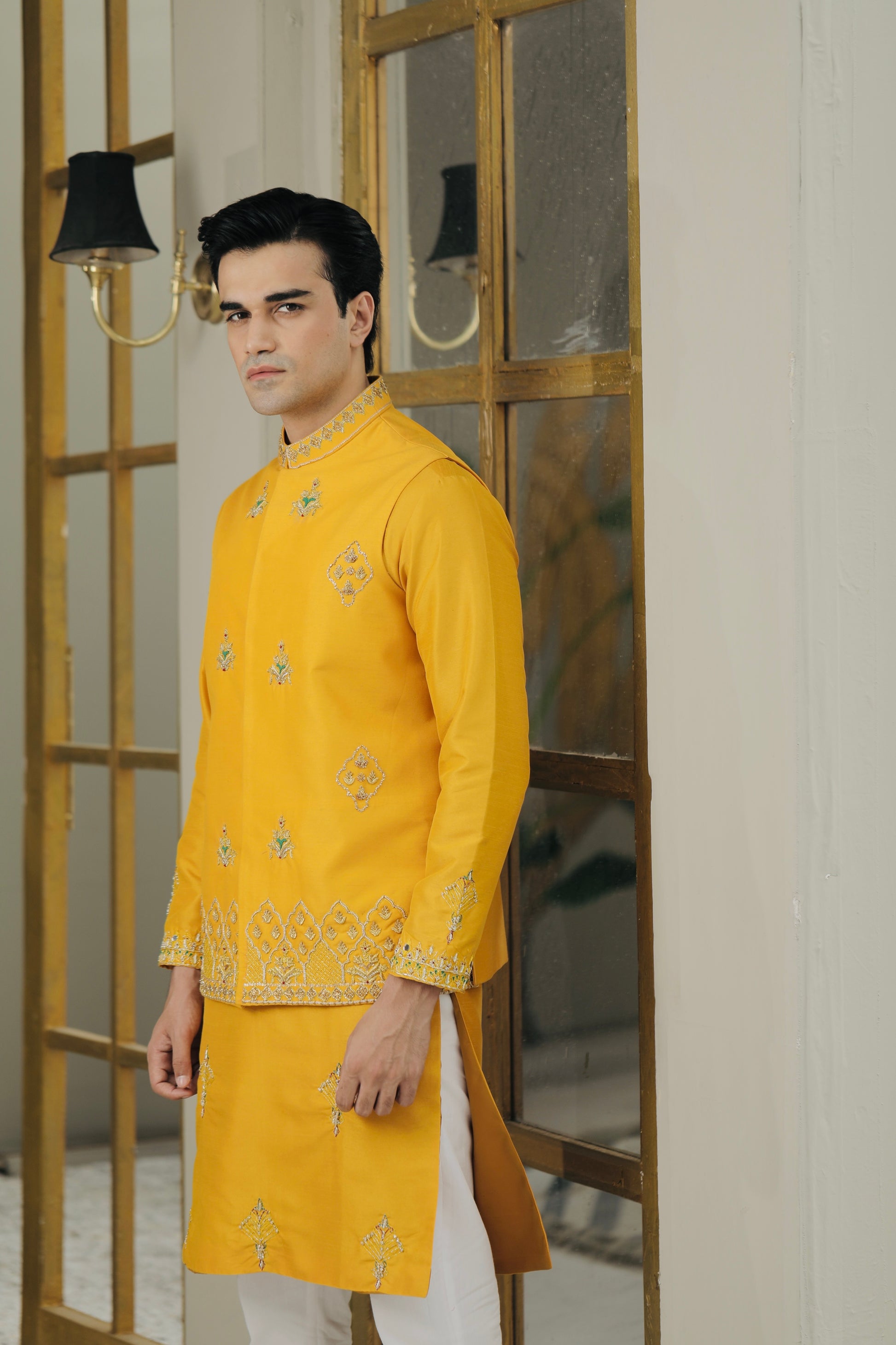 The ultimate shade sure to brighten up this spring season.The rawsilk waiscoat That includes gorgeous handwork embroidery techniques in same on same theme looks elegant and majestic.