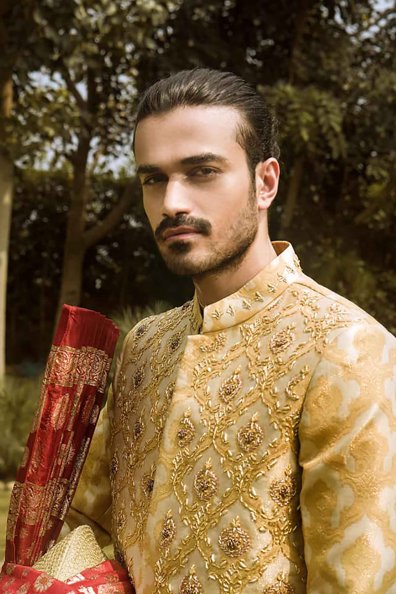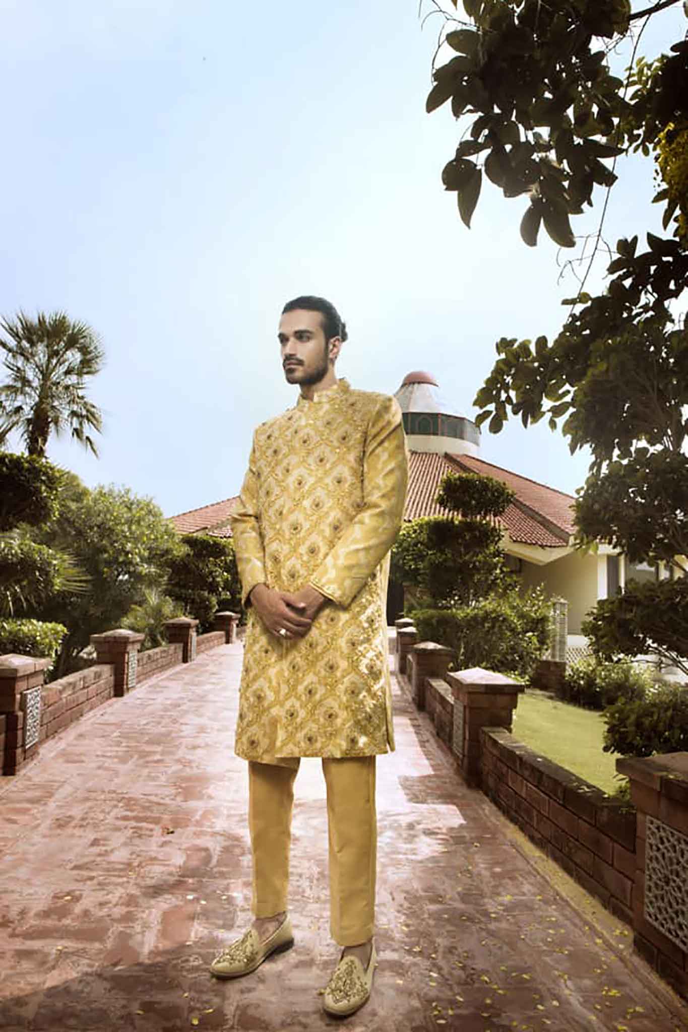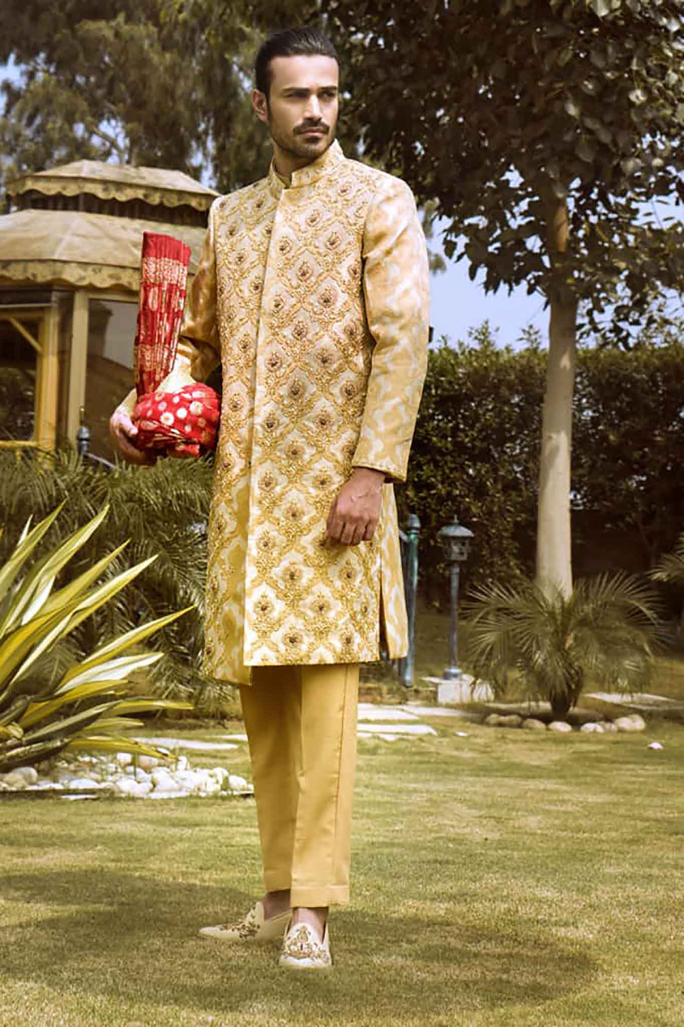 Stringing in hues of elegance,classy and rich making a statement in golden beautiful Embroidered sherwani with handmade embroidered shoes making this perfect choice for your best day.