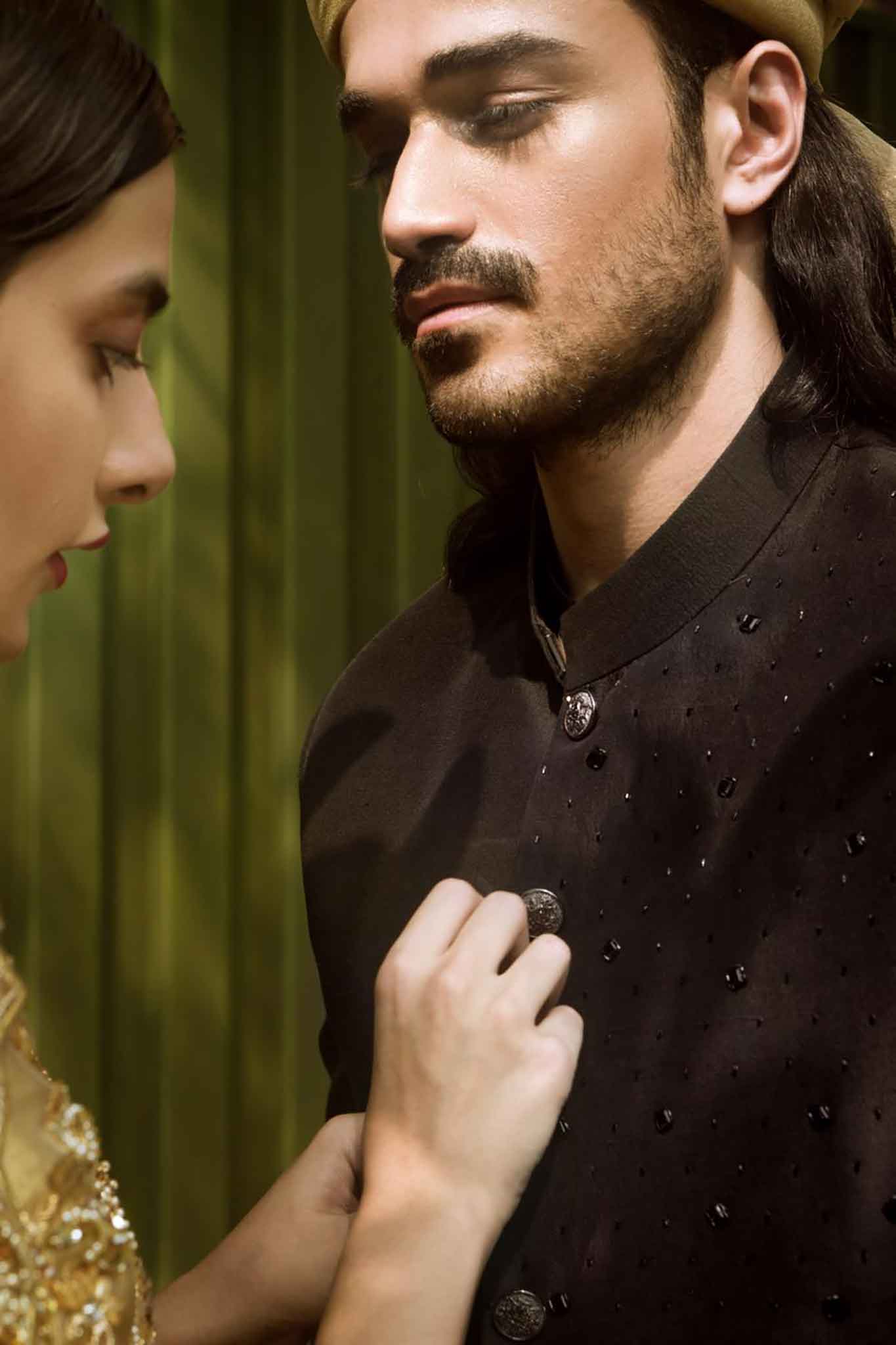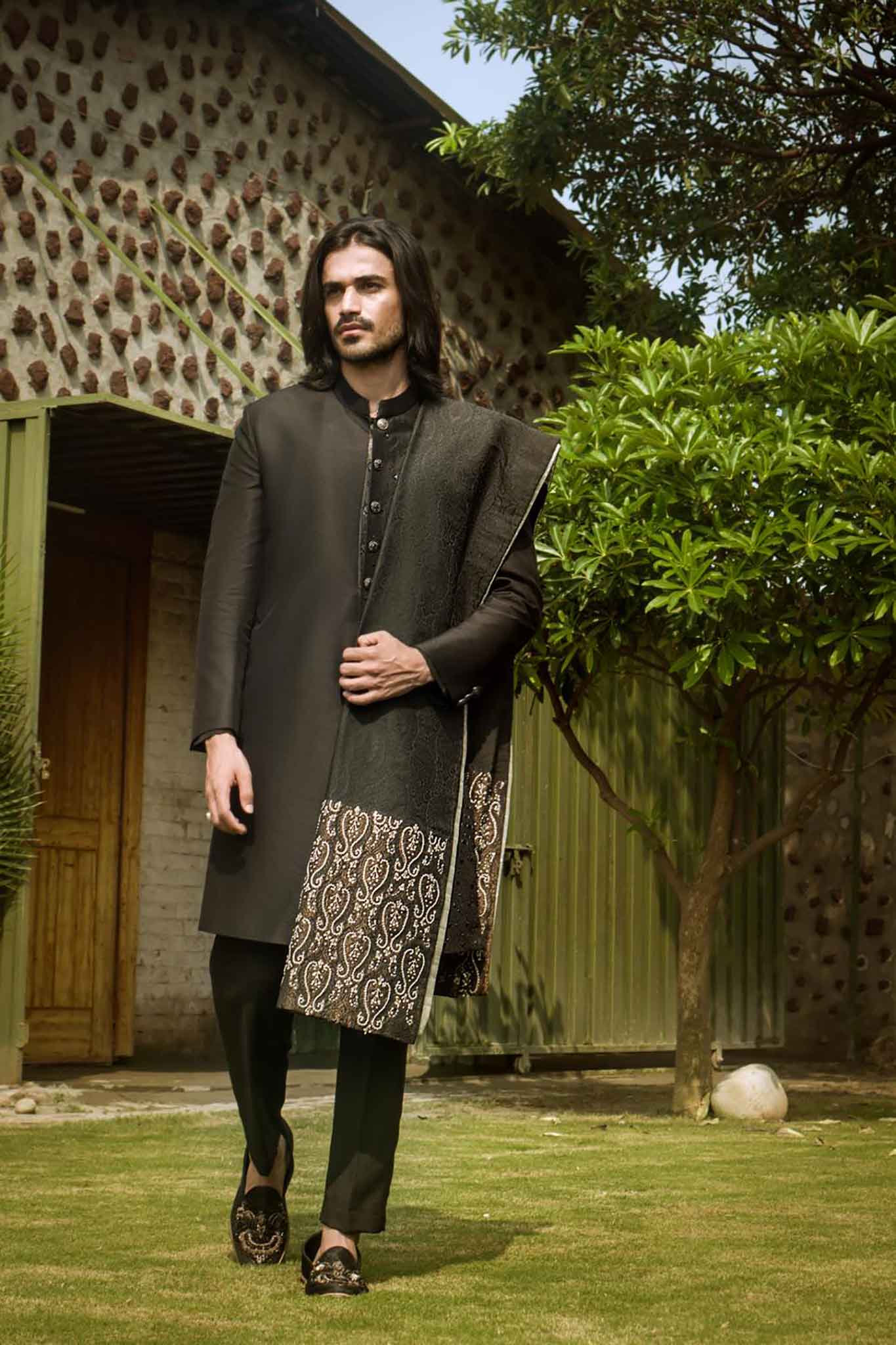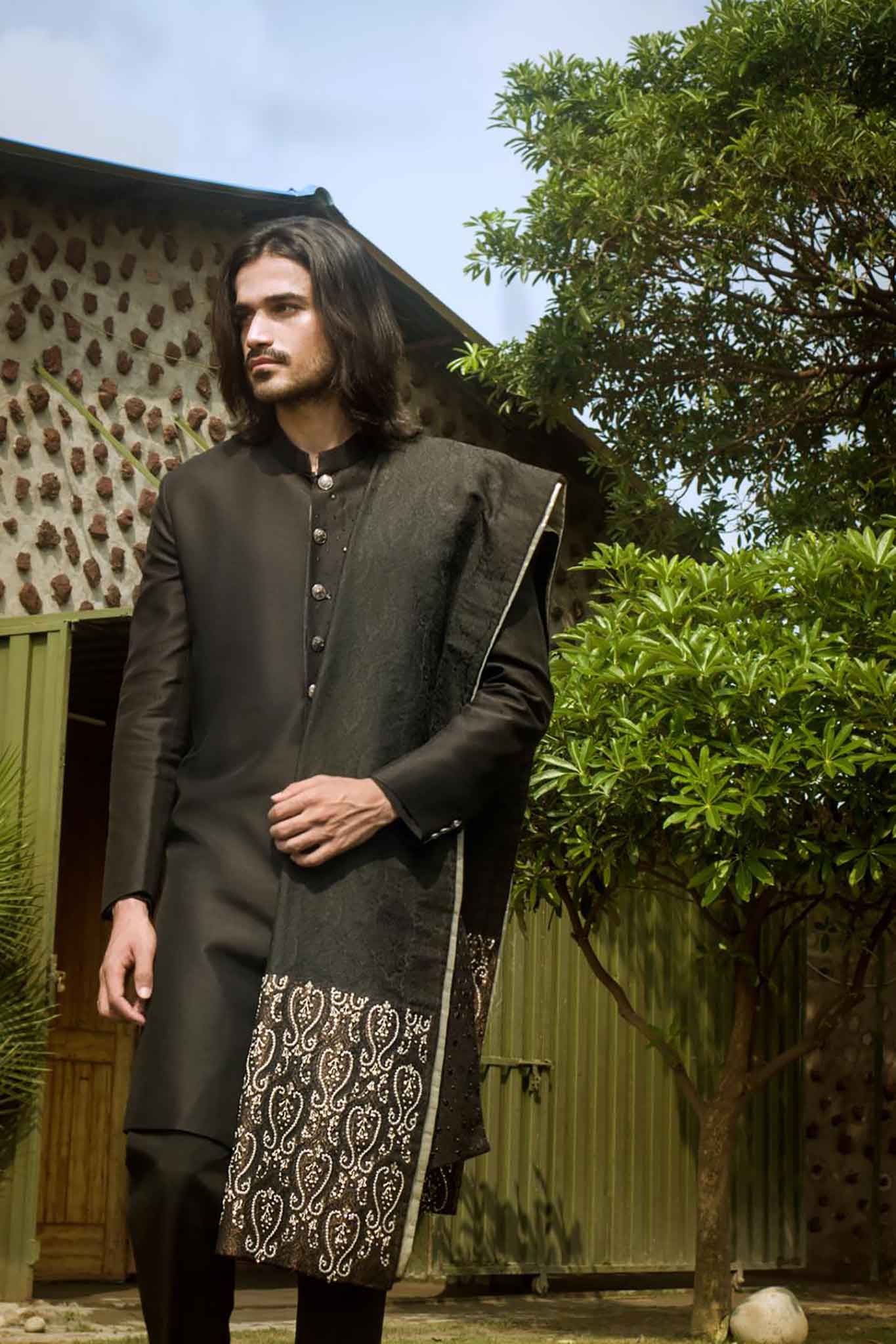 A Royal Blaack sherwani with intricate hand embroidered surface detailing.