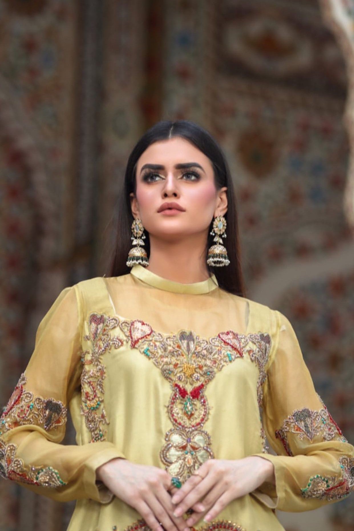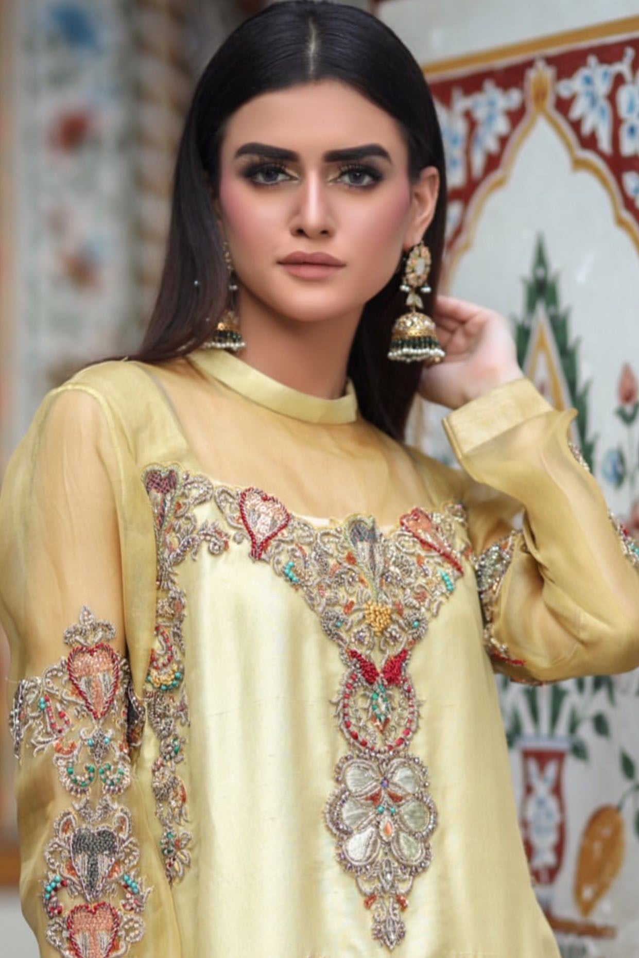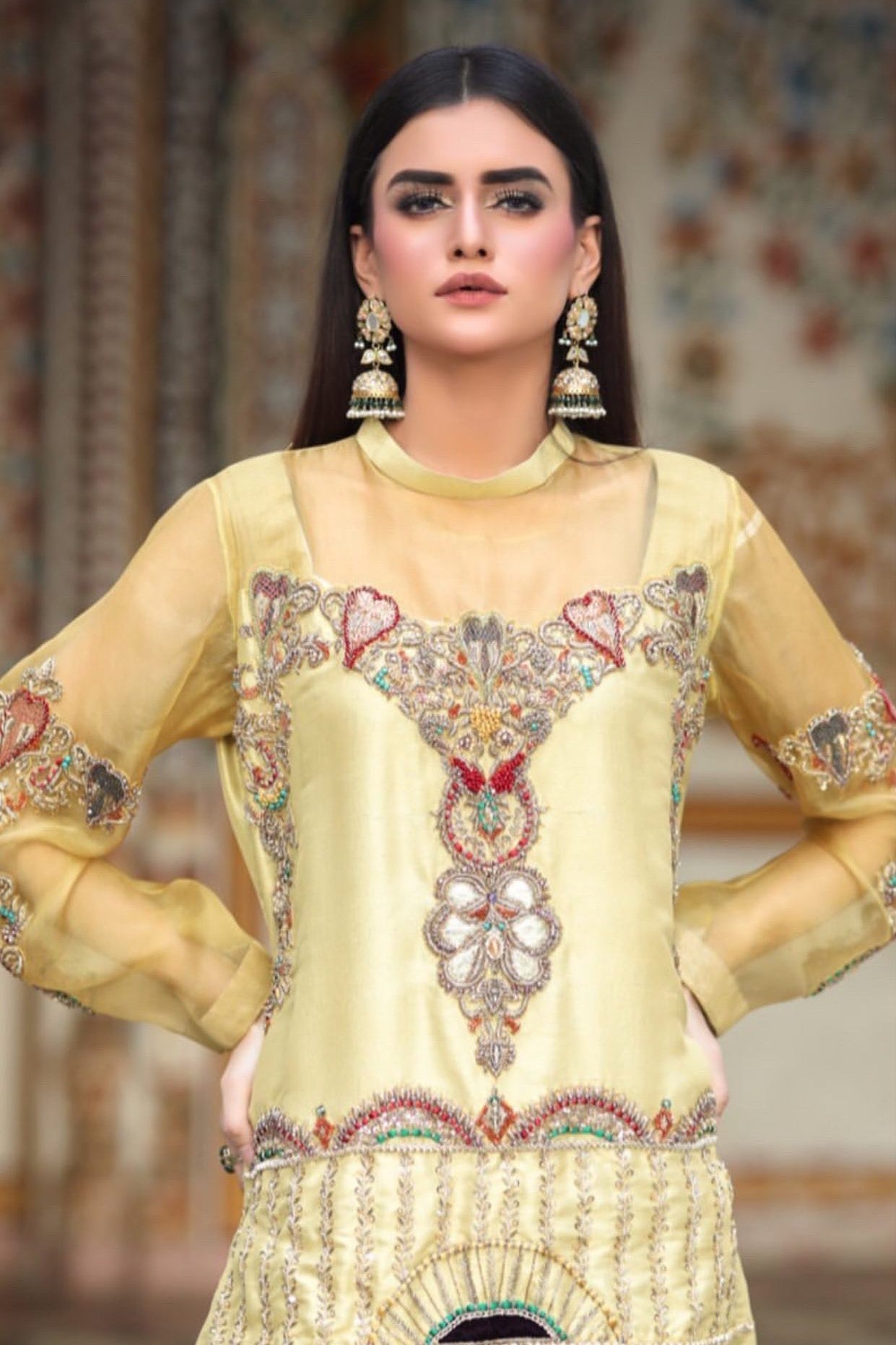 A Royal yellow colour modern style intricate hand embroidered shirt with intricate detailed border rawsilk plazzo eye-catching design is ideal for the season's festivities.