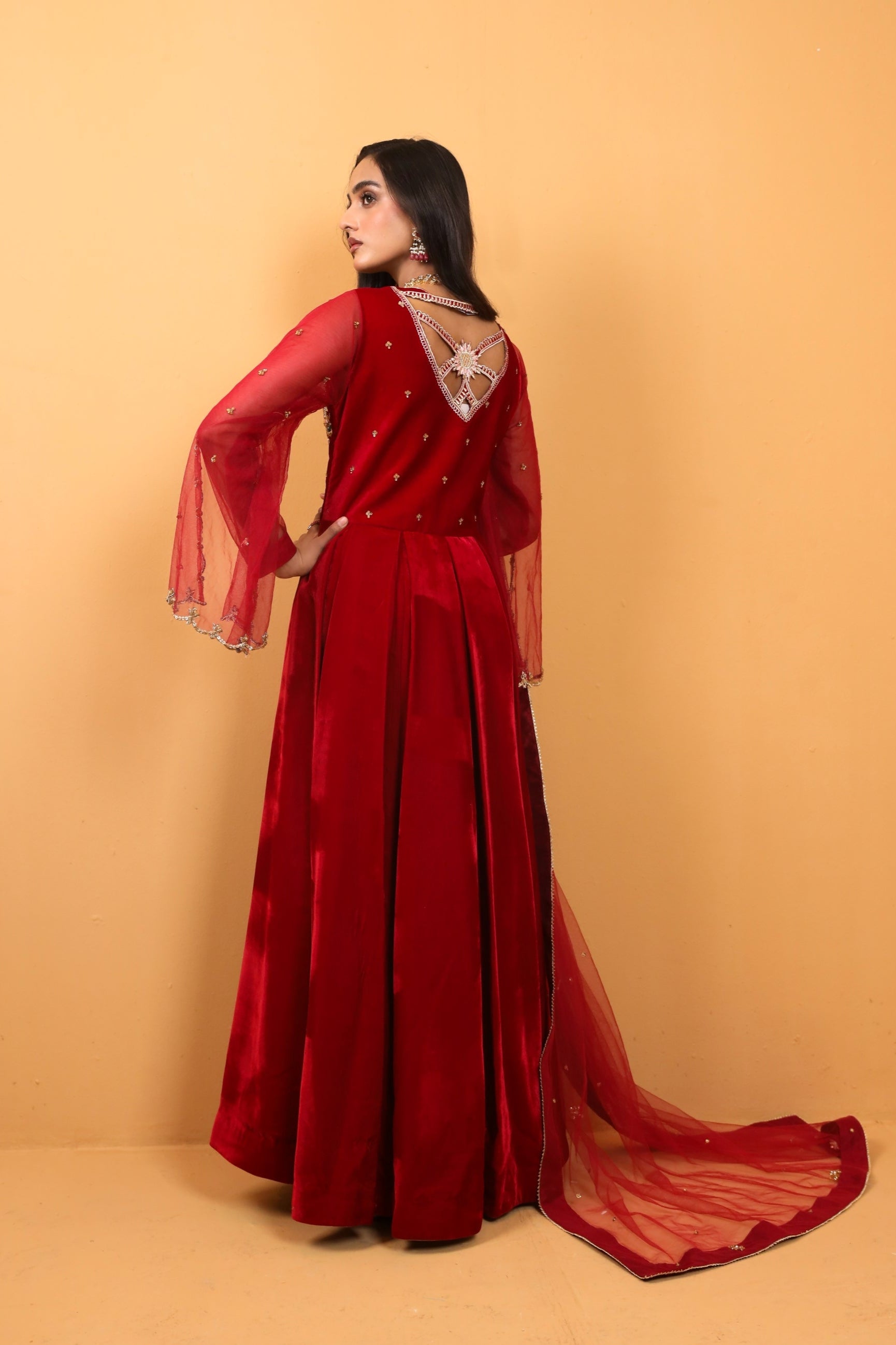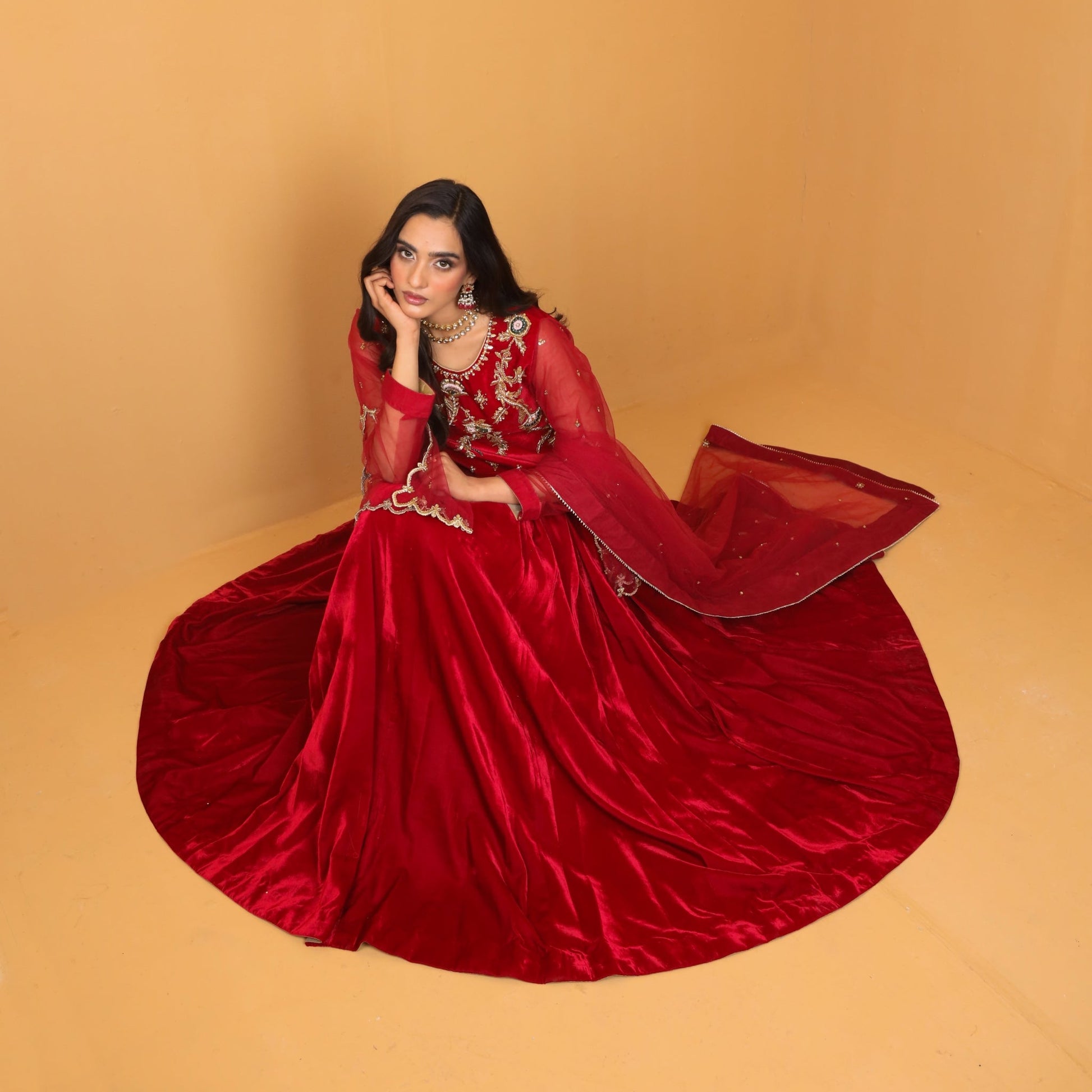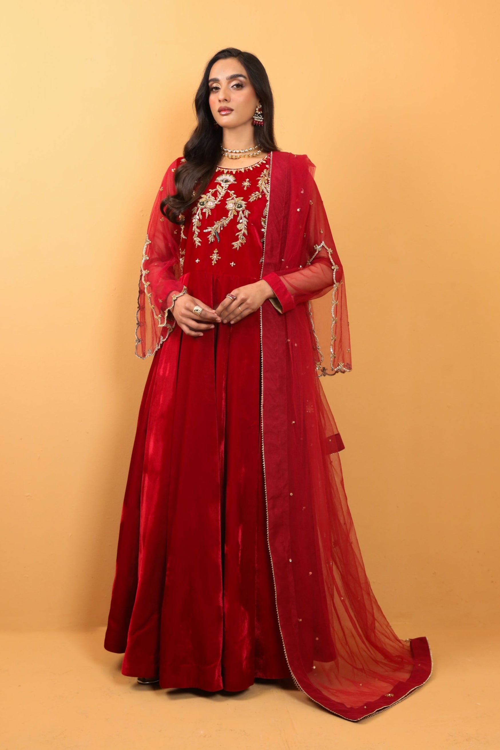 Embrace the art of sophistication with this exquisite red velvet modern cut pishwas, adorned with intricate hand embroidery, accompanied by an ethereal net dupatta, both delicately highlighted with floral motifs.