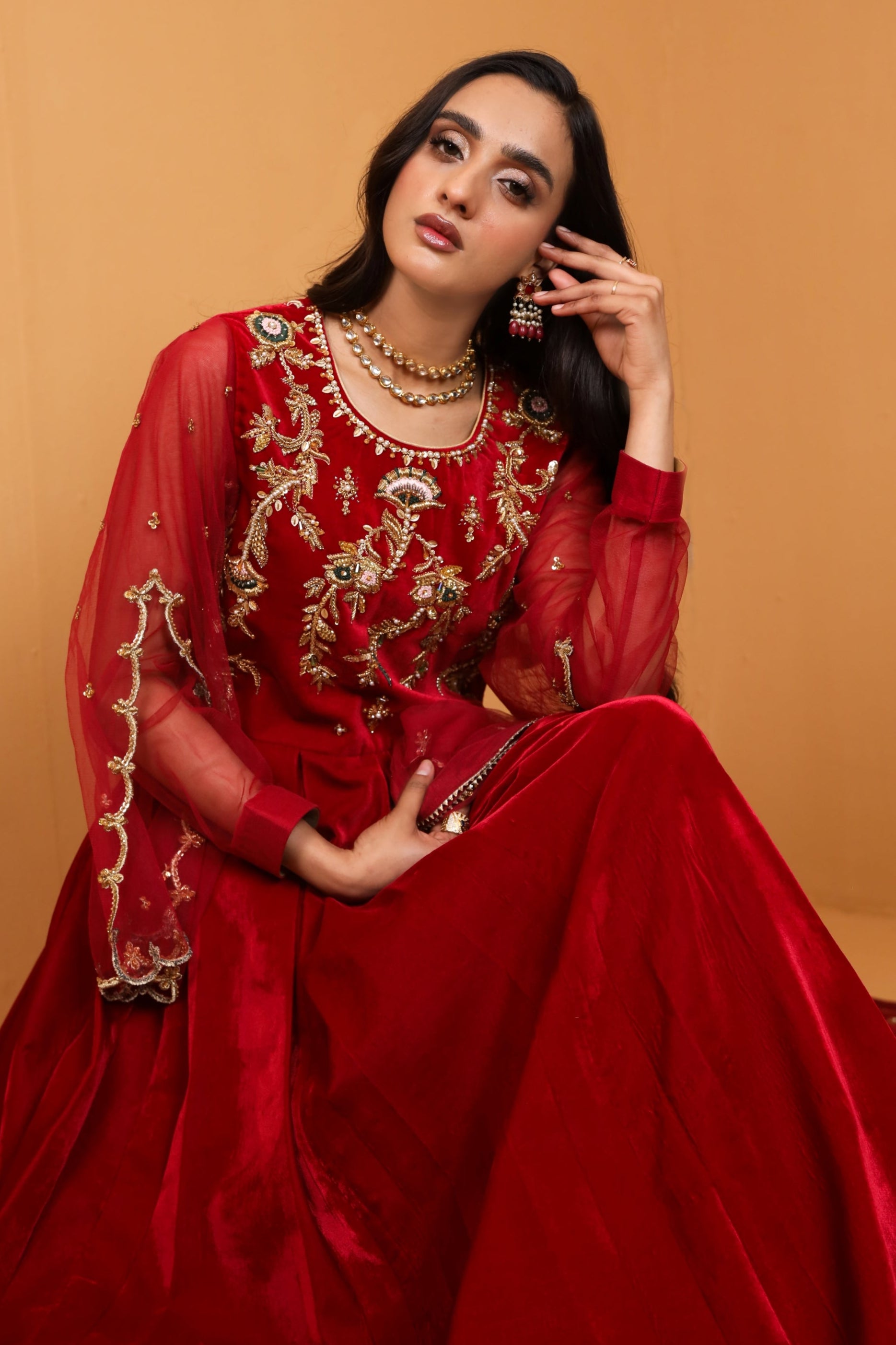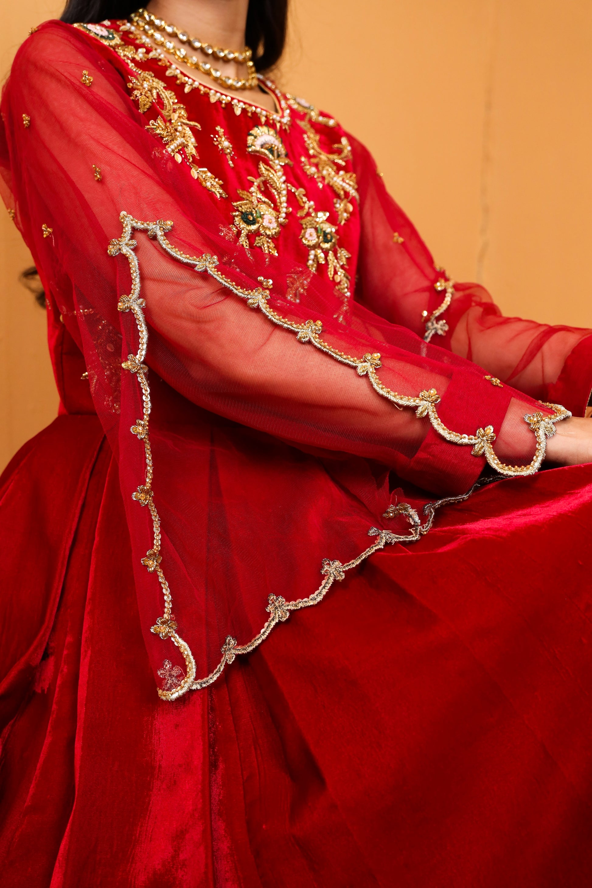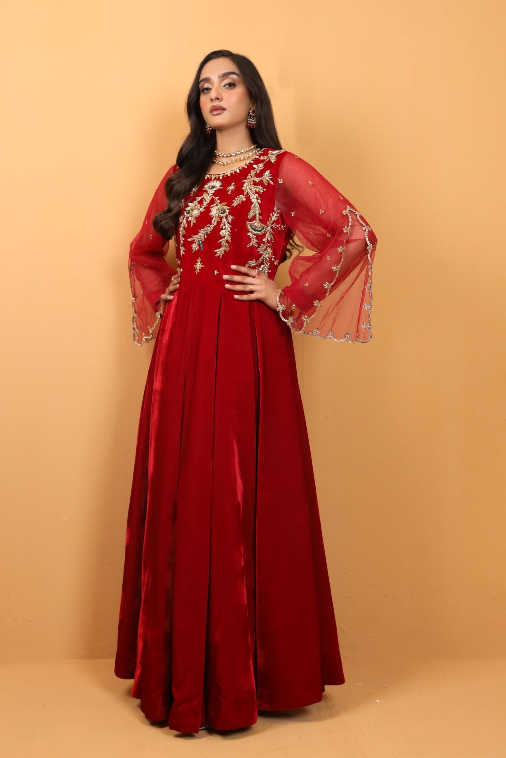 Embrace the art of sophistication with this exquisite red velvet modern cut pishwas, adorned with intricate hand embroidery, accompanied by an ethereal net dupatta, both delicately highlighted with floral motifs.