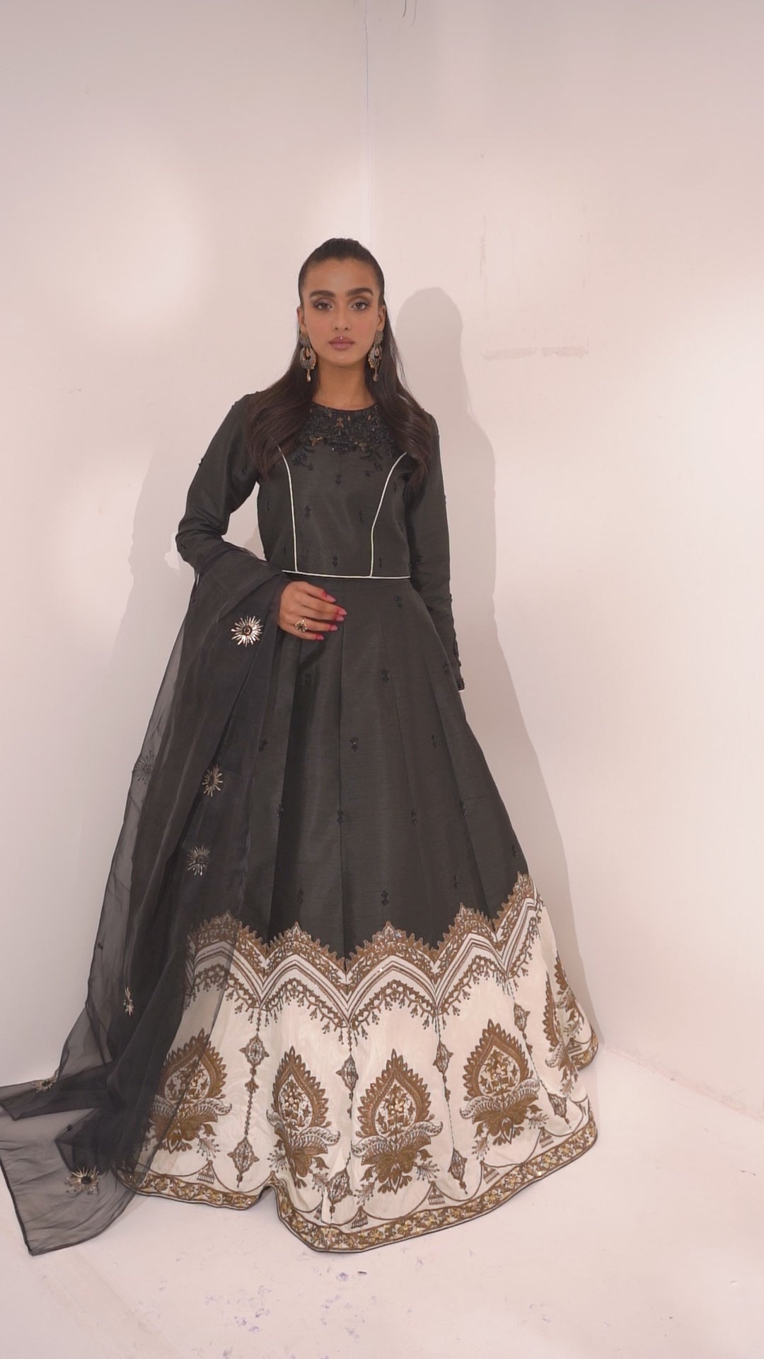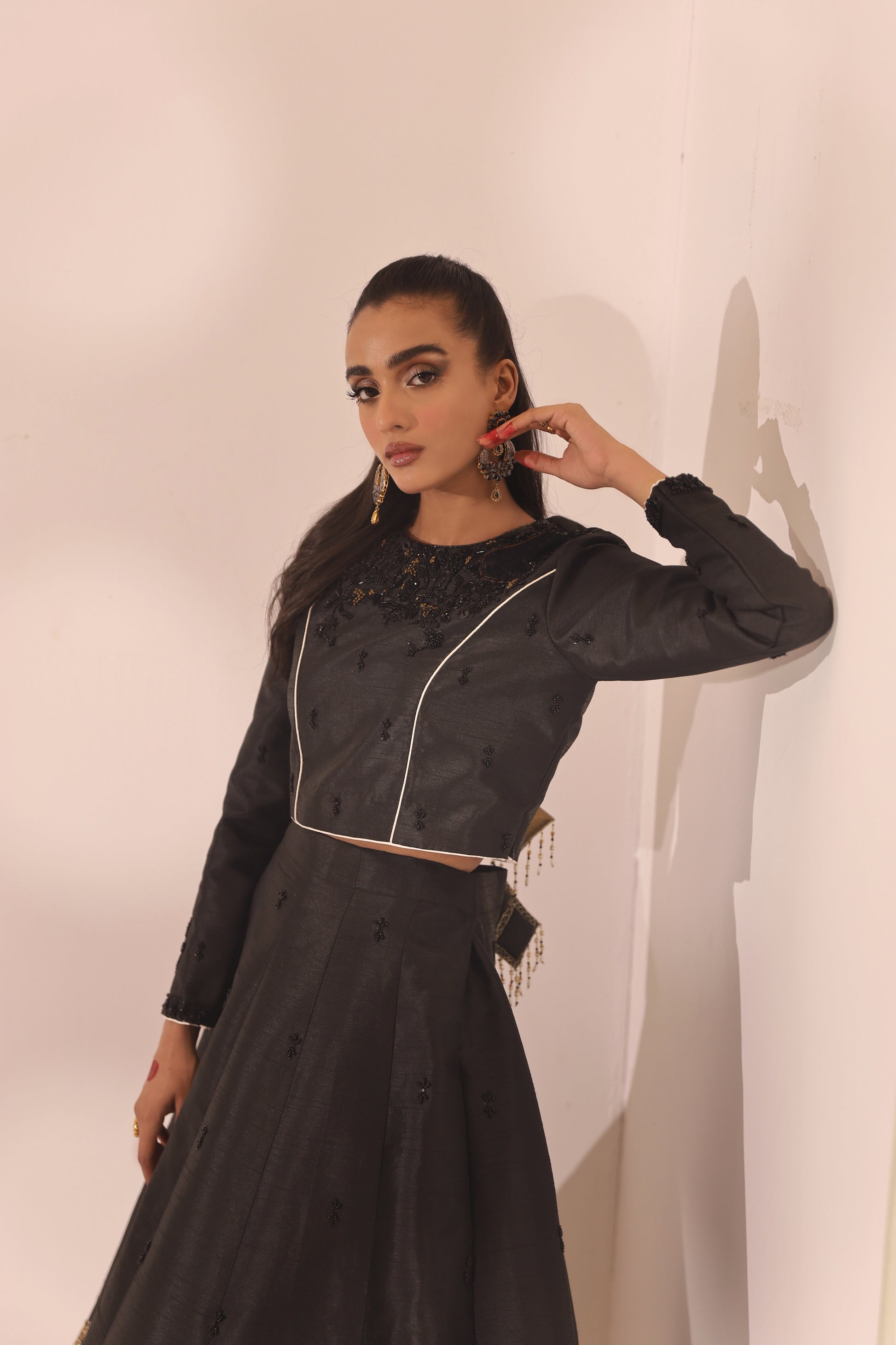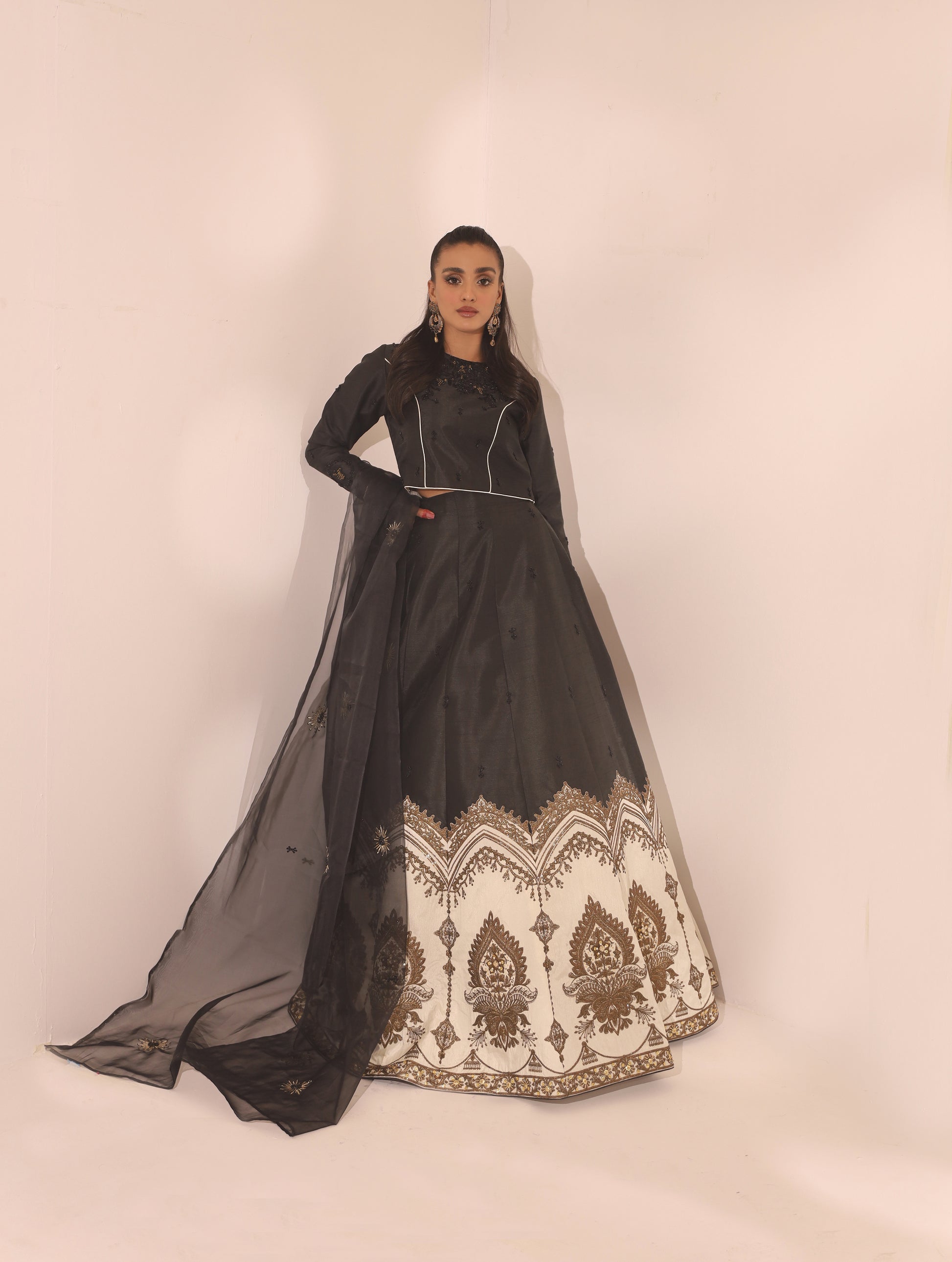 Delicately adorned beautifully embellished kurti and black and white lehenga paired with a festive black organza hand embellished dupatta that redefines the modern look.