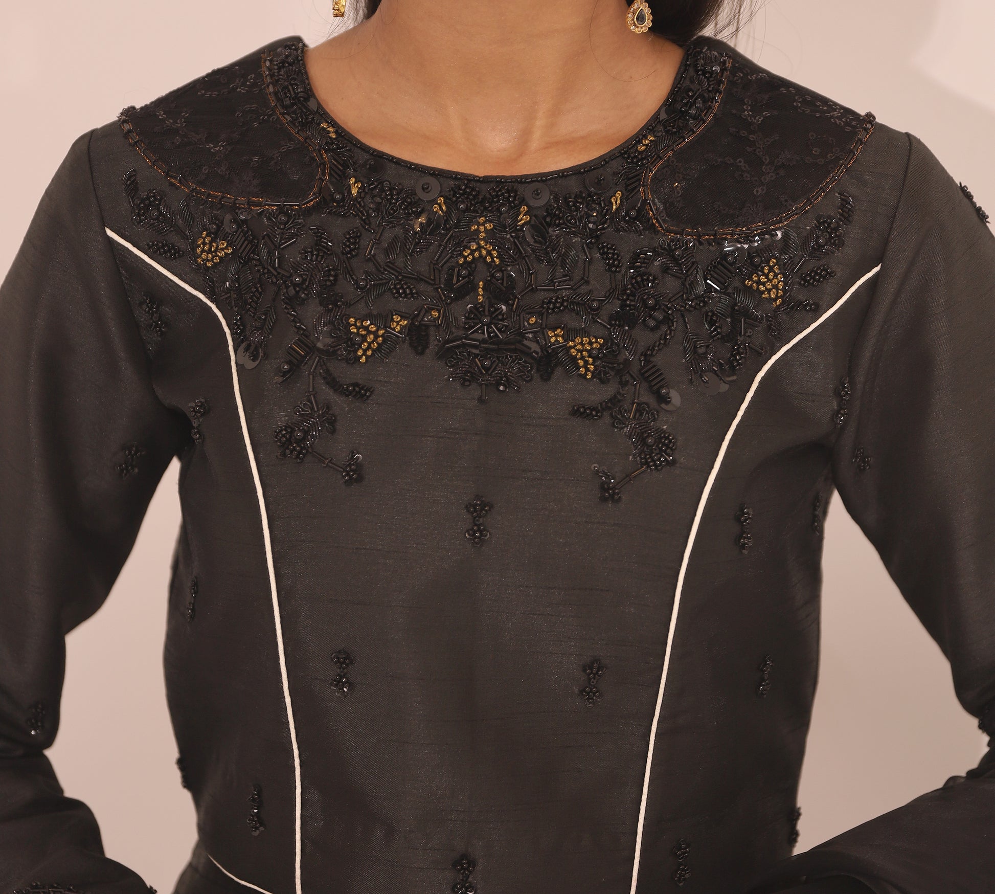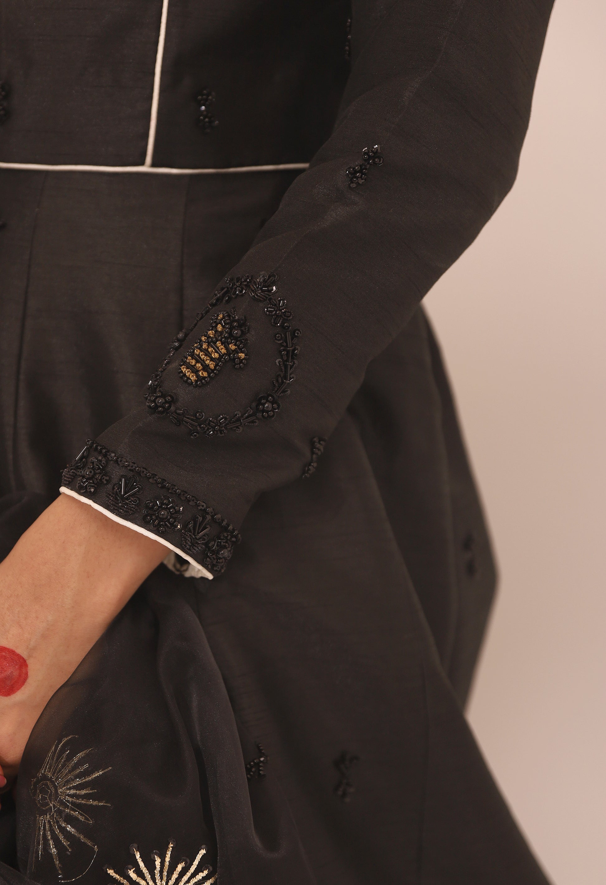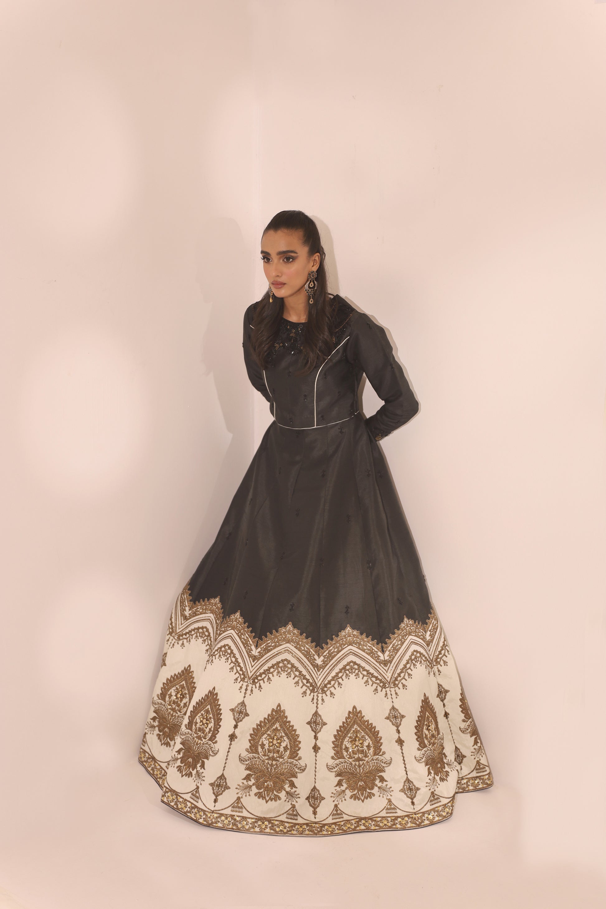 Delicately adorned beautifully embellished kurti and black and white lehenga paired with a festive black organza hand embellished dupatta that redefines the modern look.