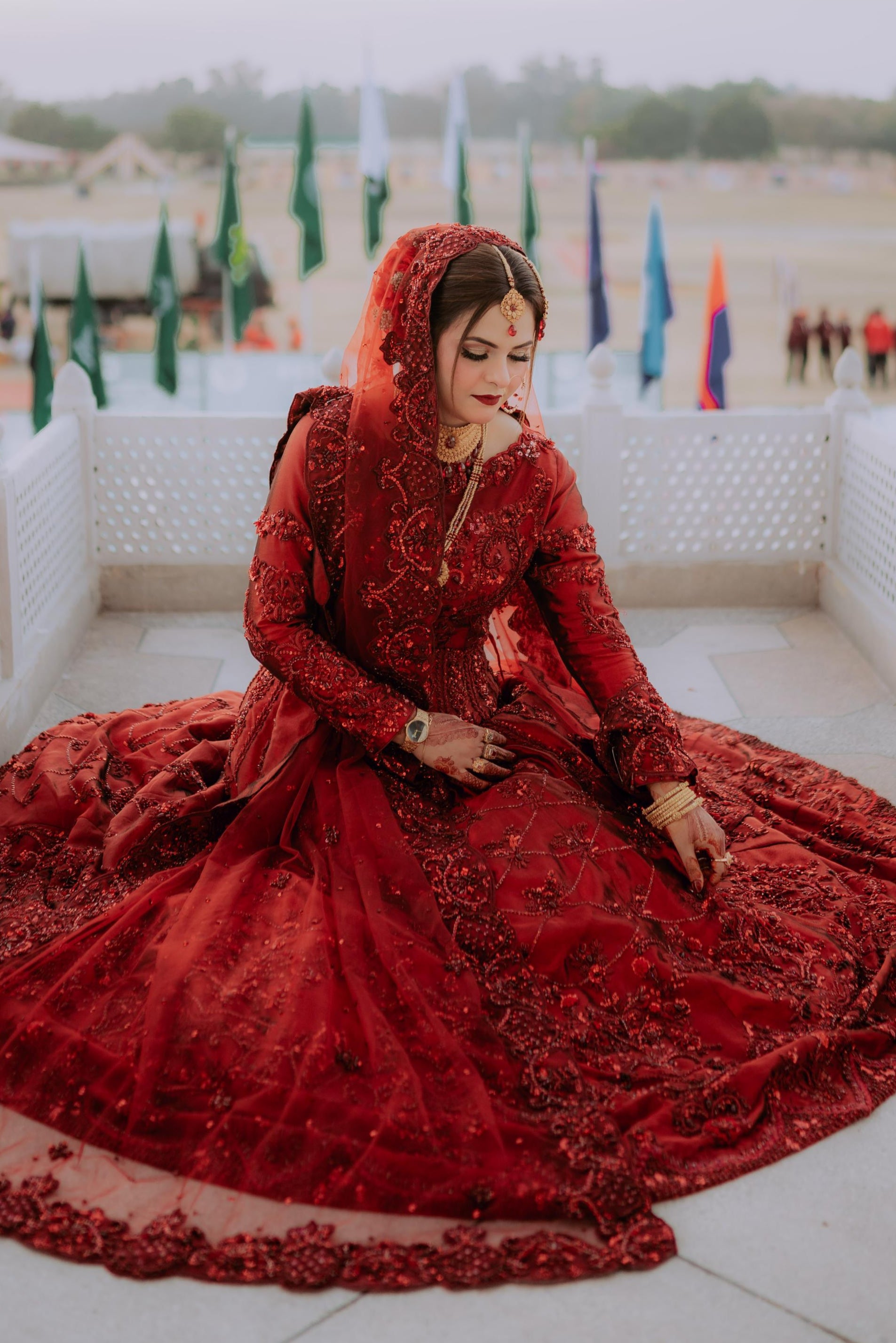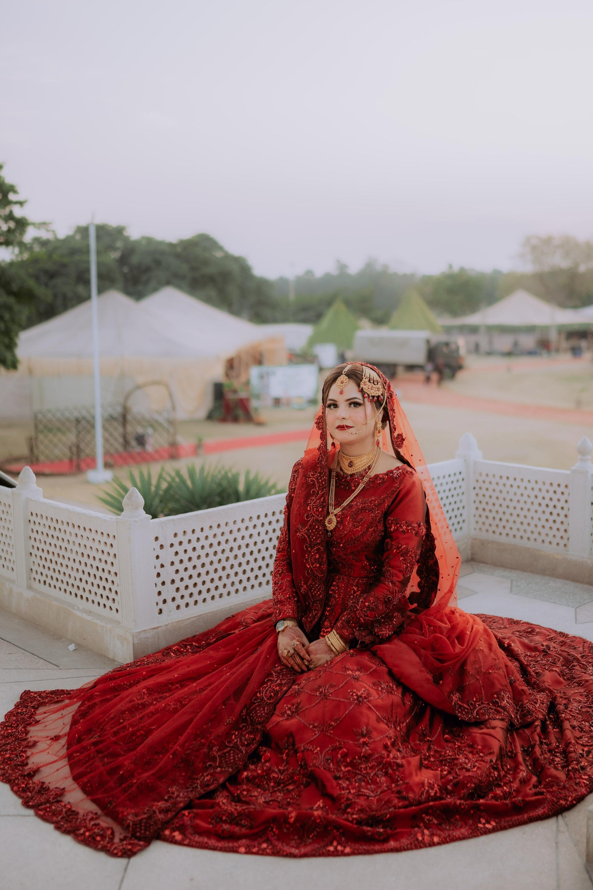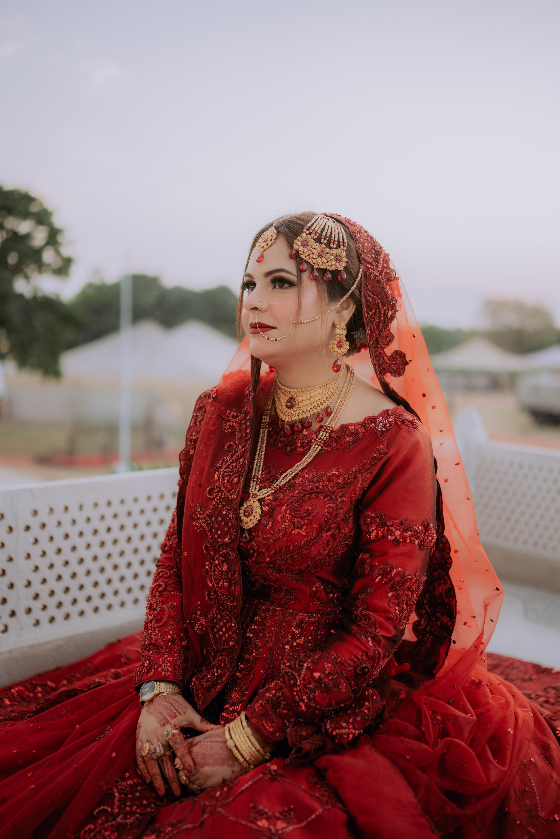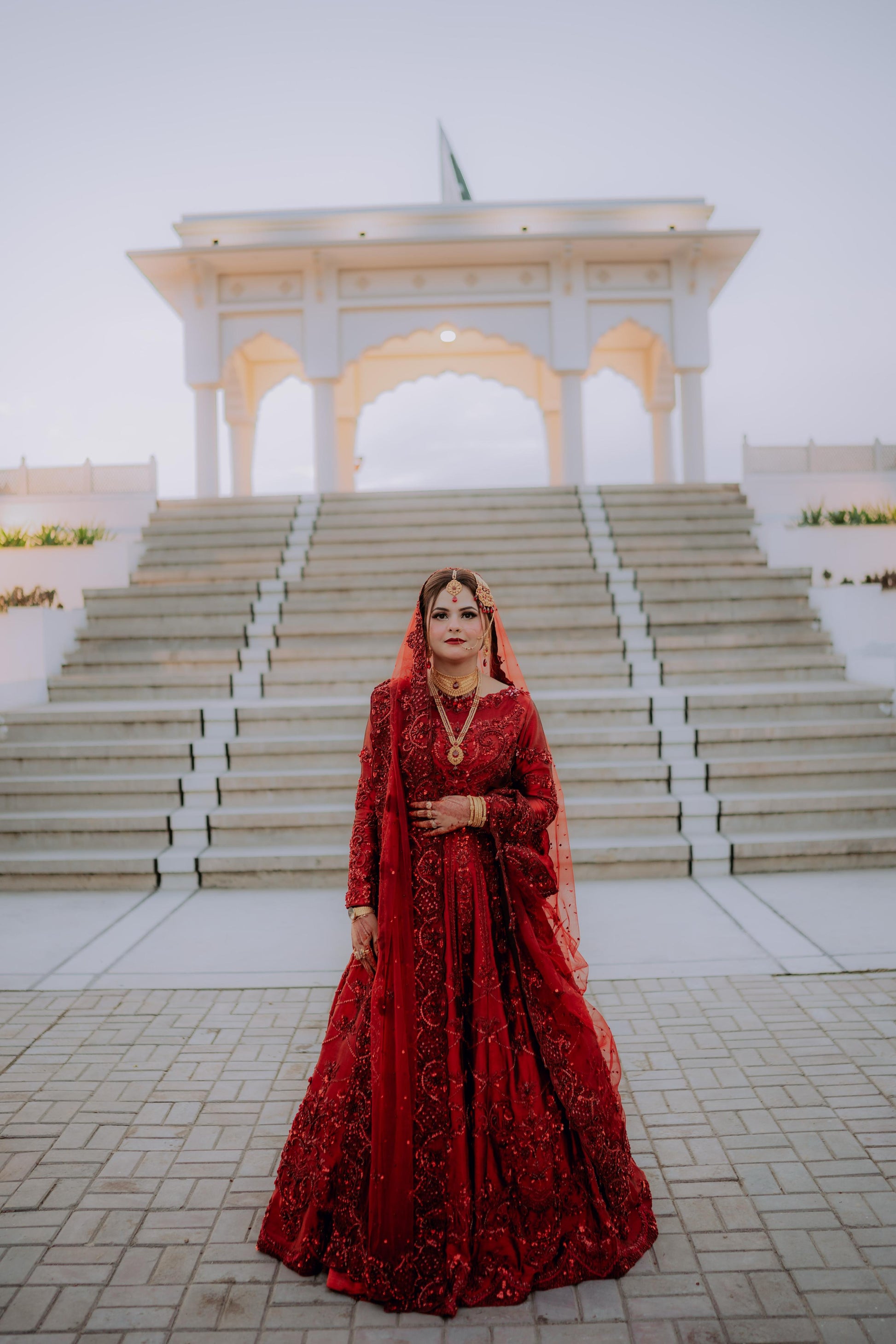 Regal and majestic red on red, meticulously curated for brides seeking a traditional signature lehenga choli. This ensemble boasts intricate nakshi dabka, tilla, and resham work. It is accompanied by a four-side heavy cut work embellished border that exudes exceptional bridal charm and radiance.