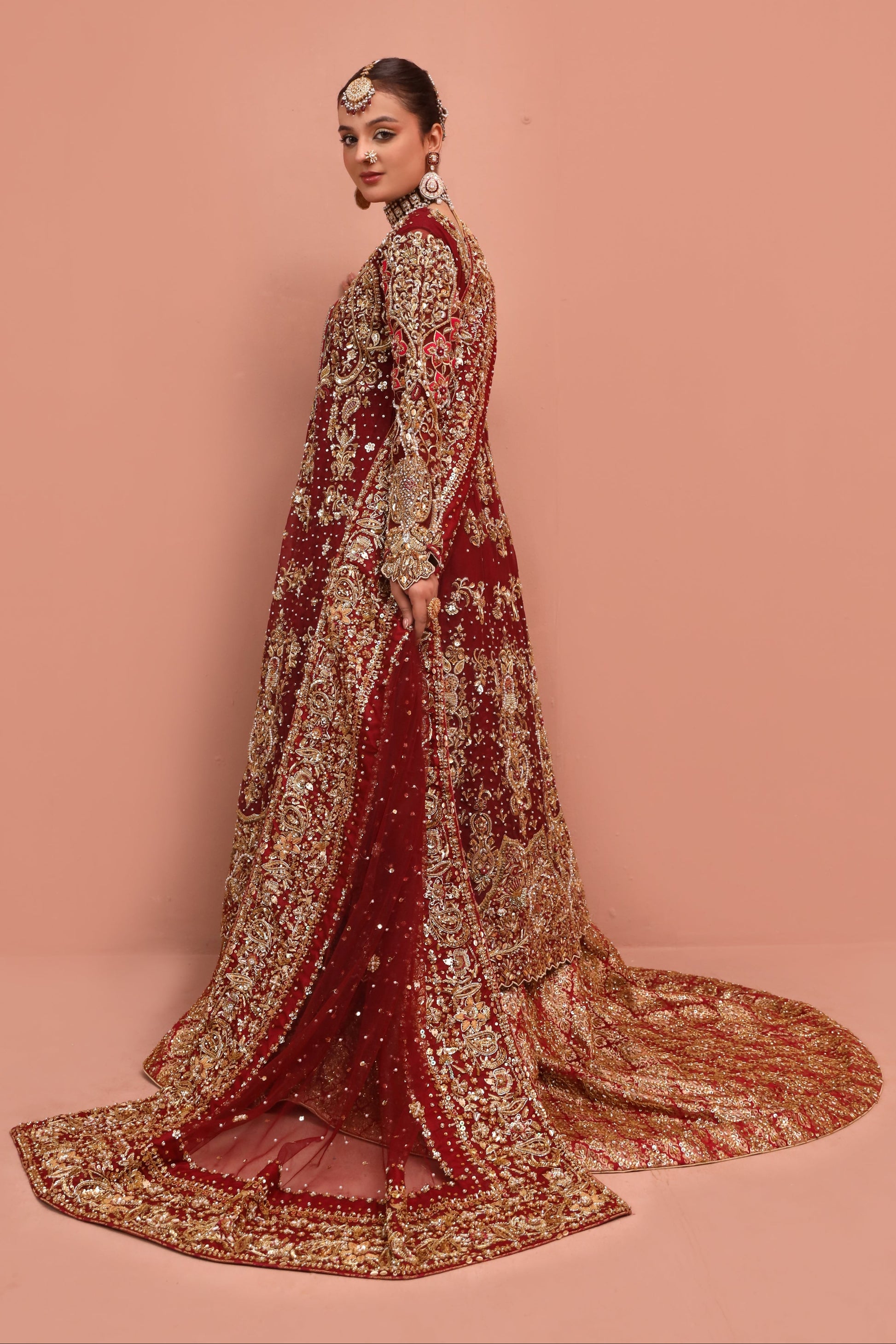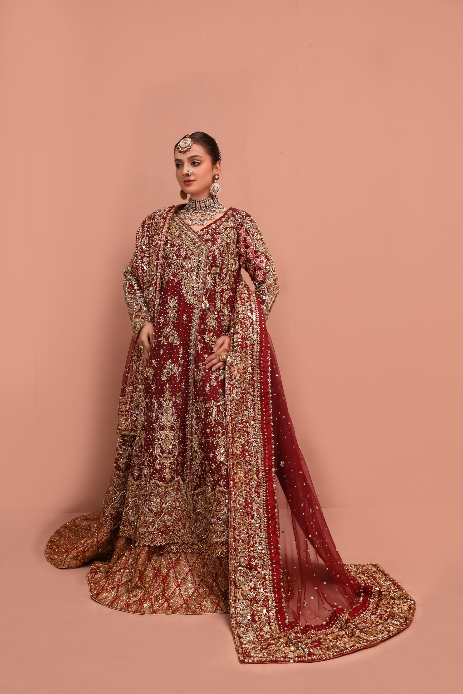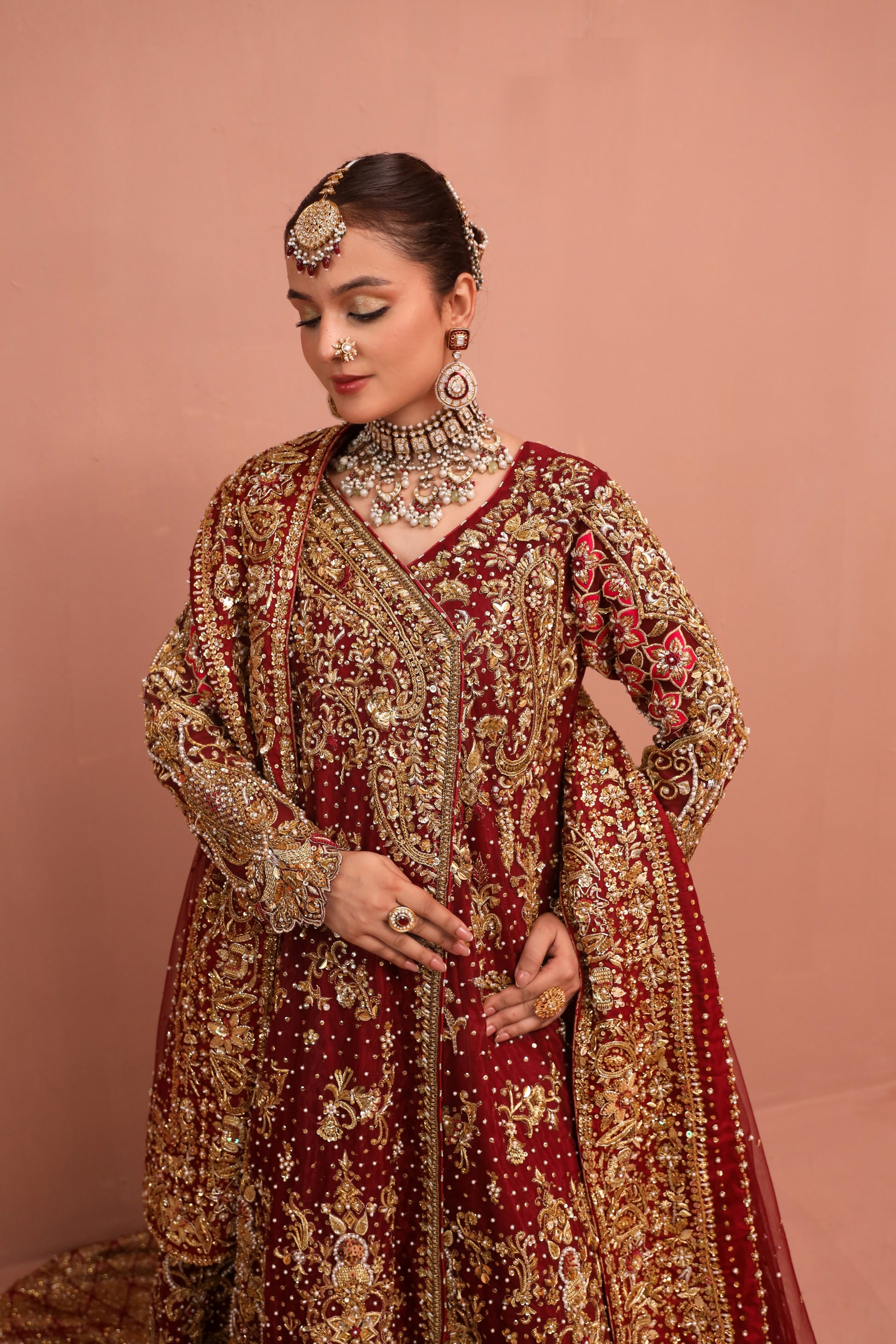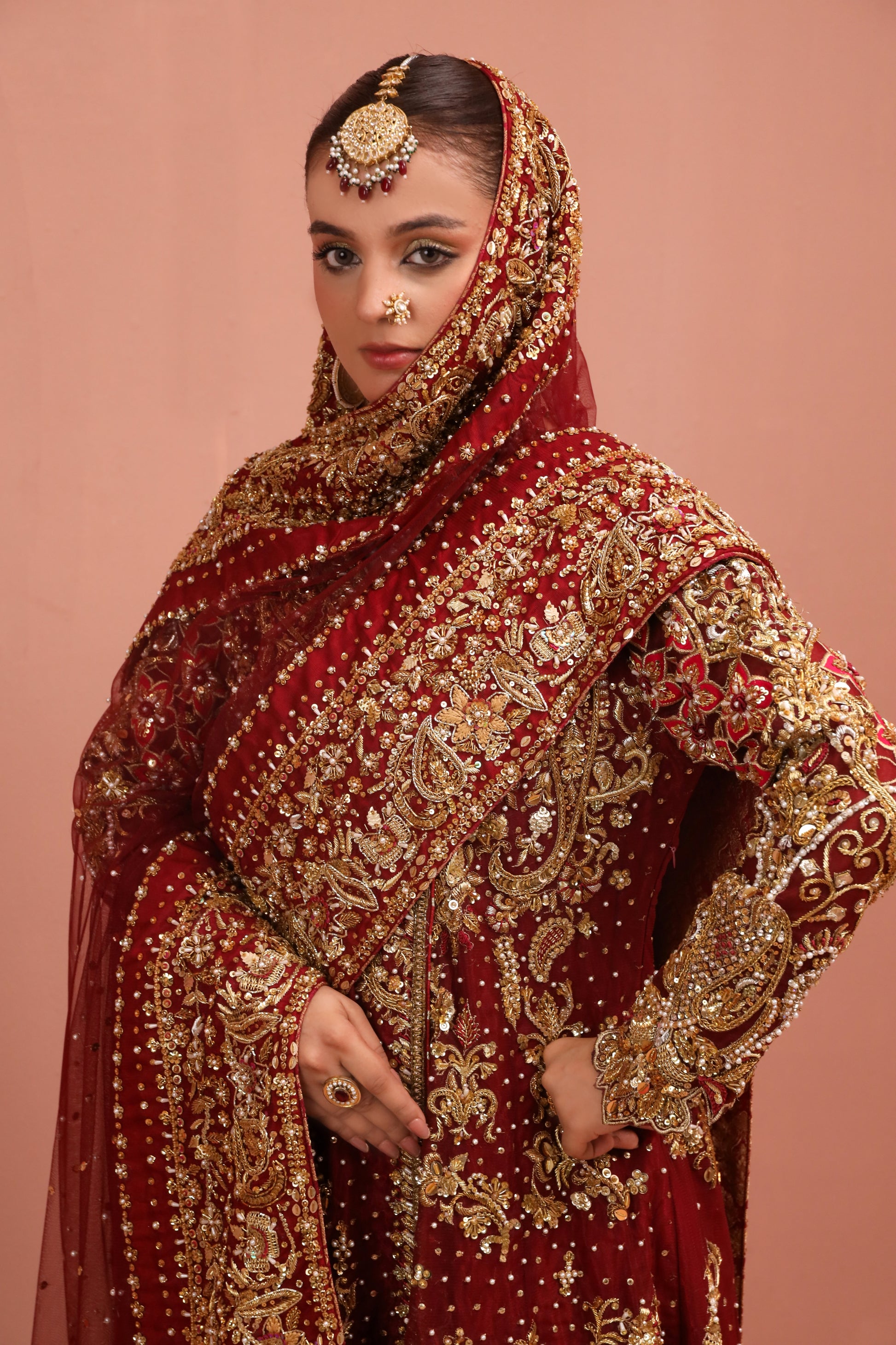 A masterpiece of heritage and grandeur — every inch of this red angrakha-style bridal is meticulously handcrafted with intricate 3D artistry, bringing royal dreams to life. Paired with a 4-yard fully handmade dupatta, this ensemble embodies timeless majesty and regal grace.