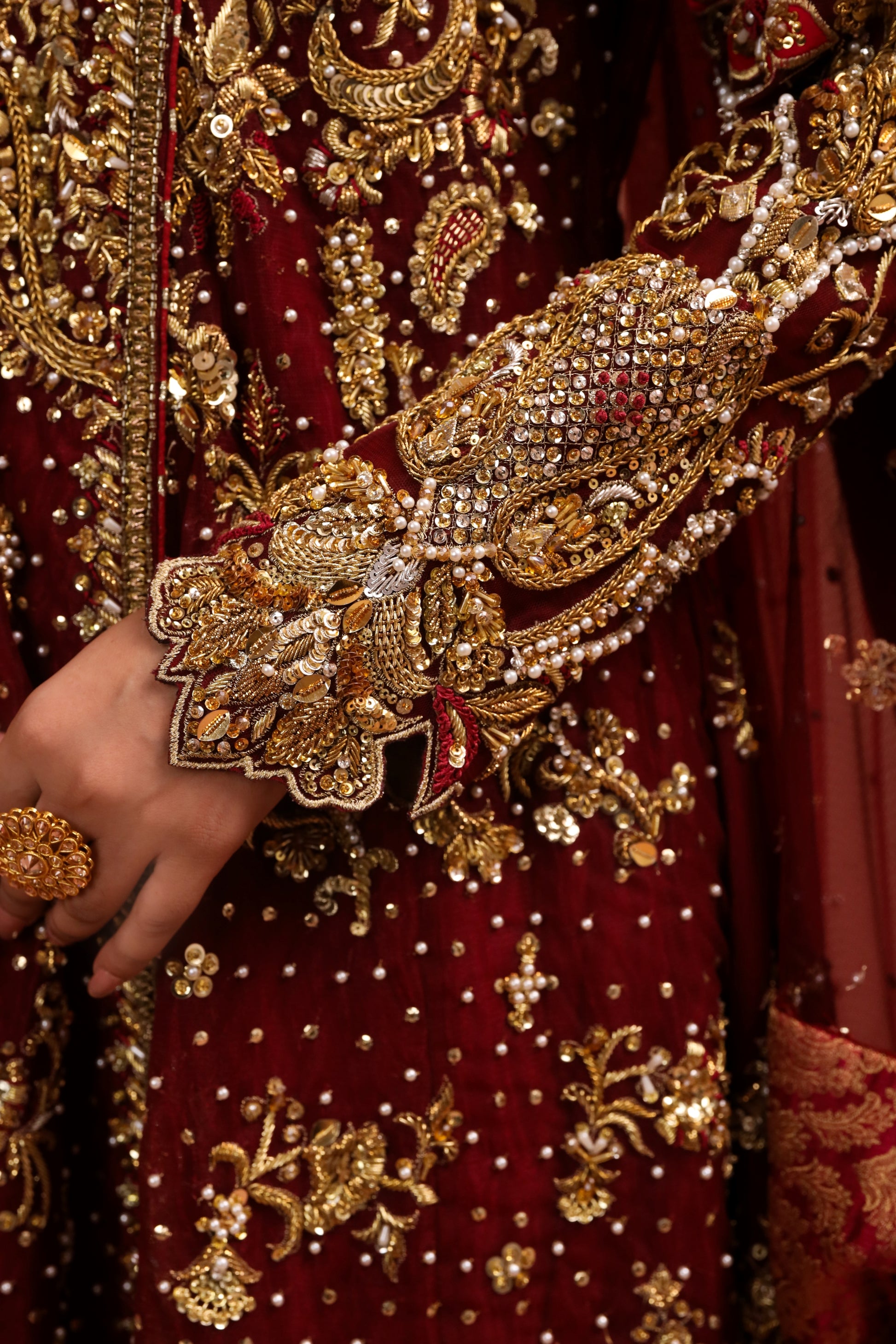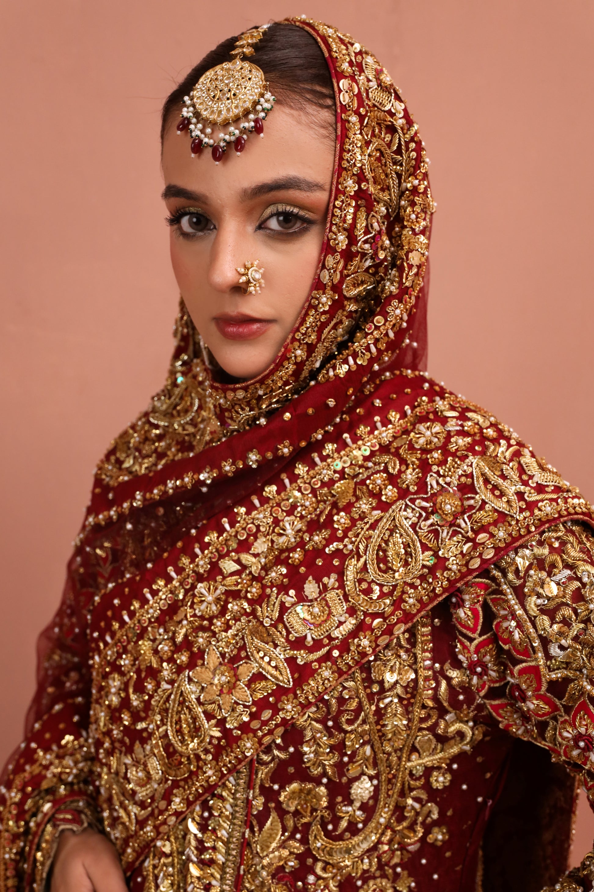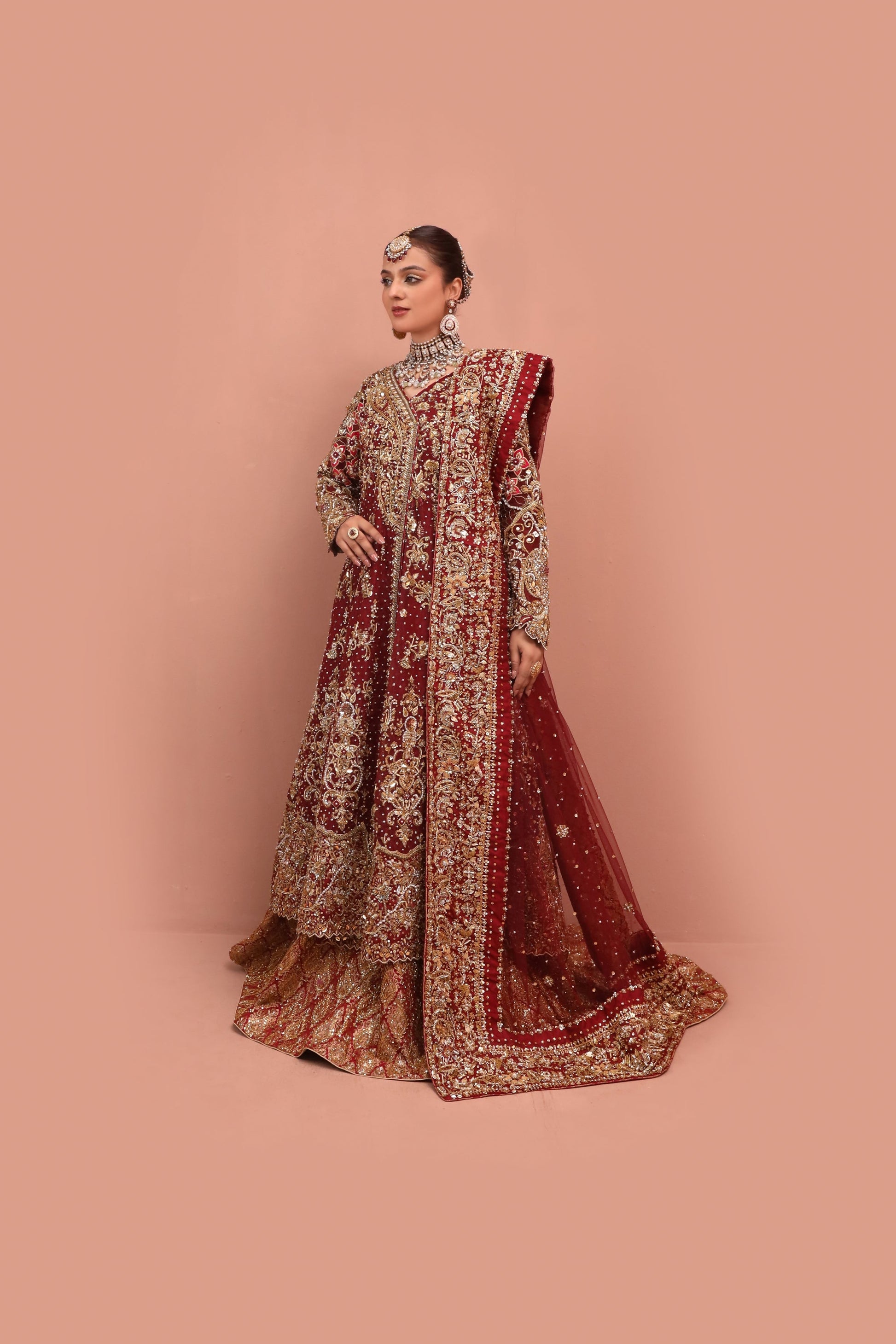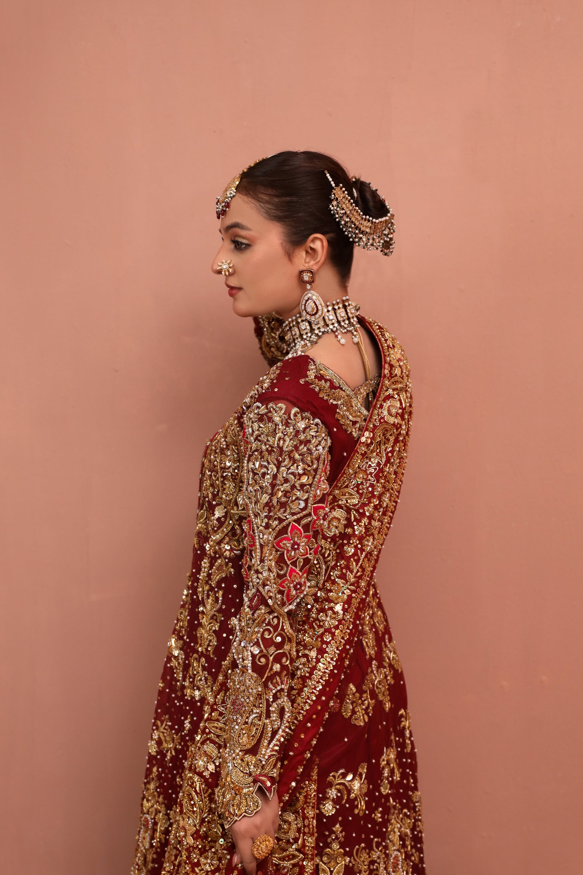 A masterpiece of heritage and grandeur — every inch of this red angrakha-style bridal is meticulously handcrafted with intricate 3D artistry, bringing royal dreams to life. Paired with a 4-yard fully handmade dupatta, this ensemble embodies timeless majesty and regal grace.