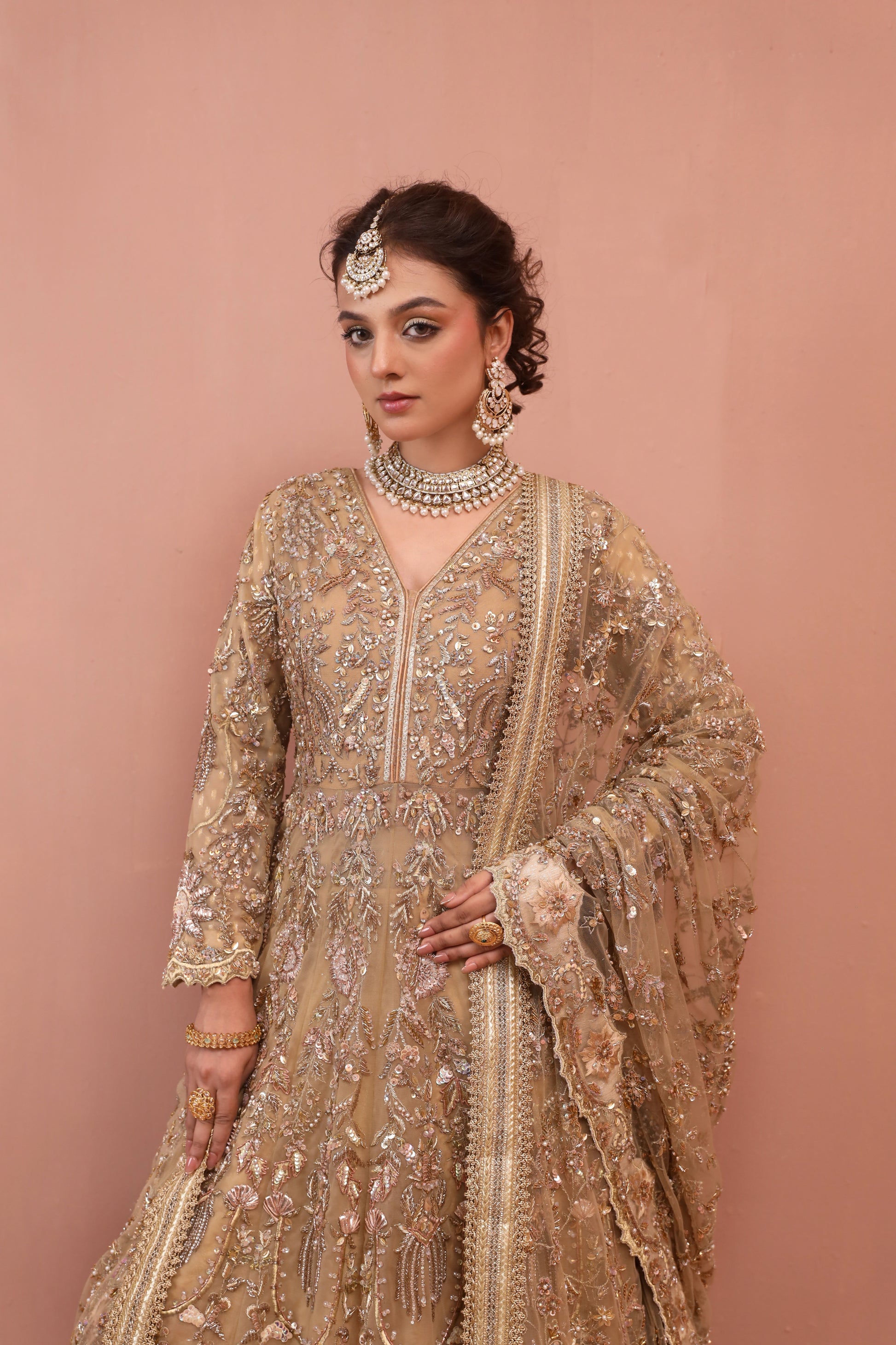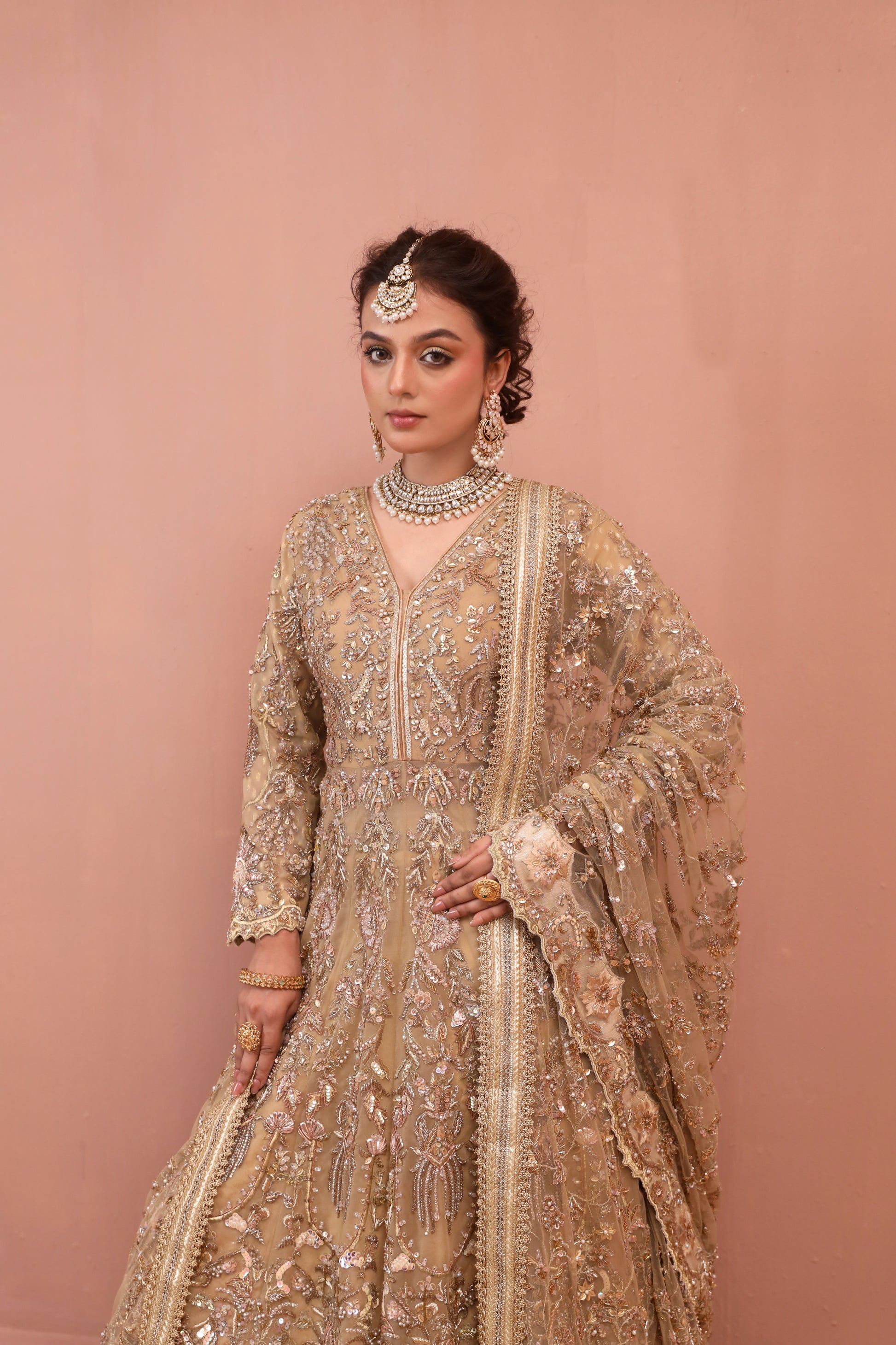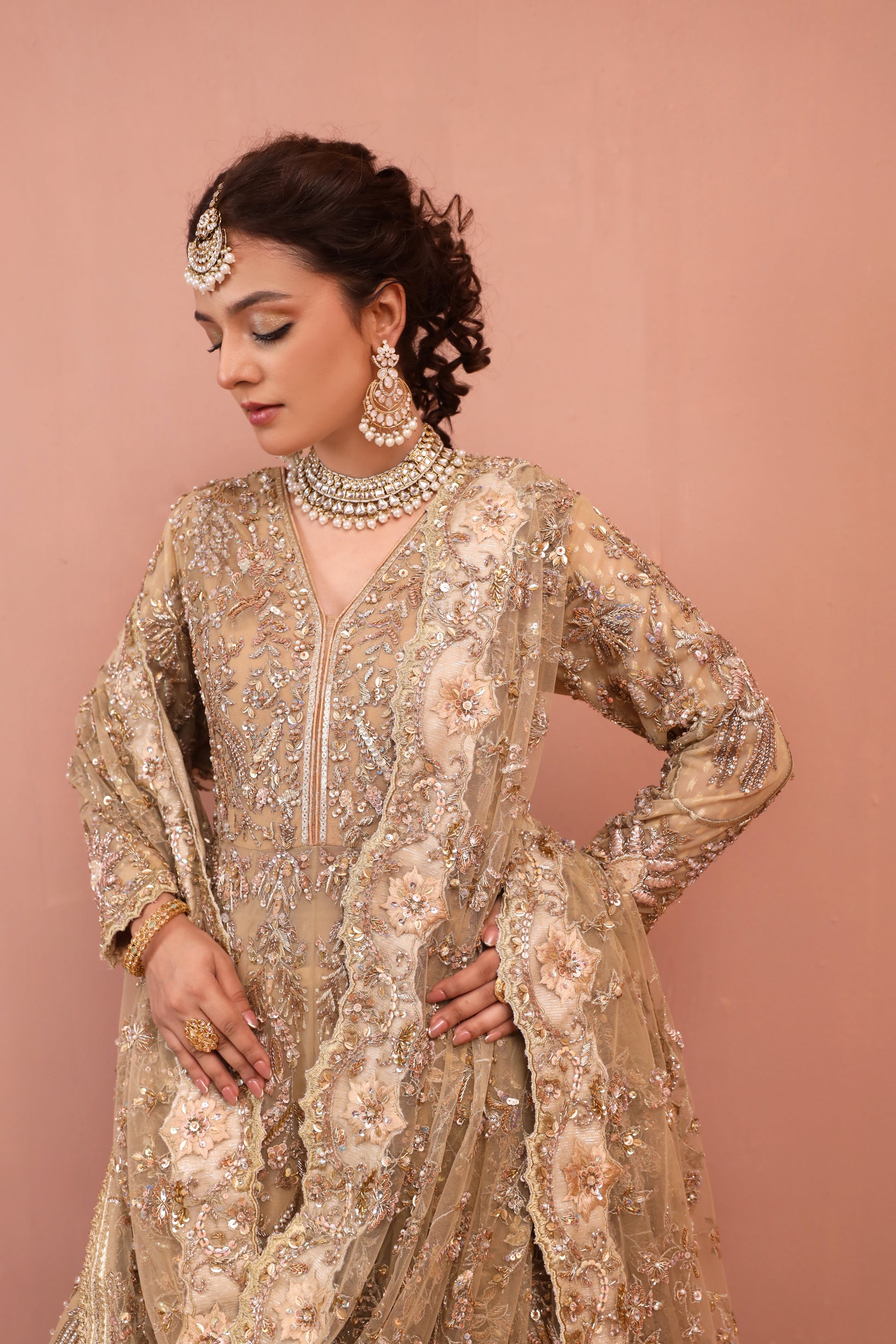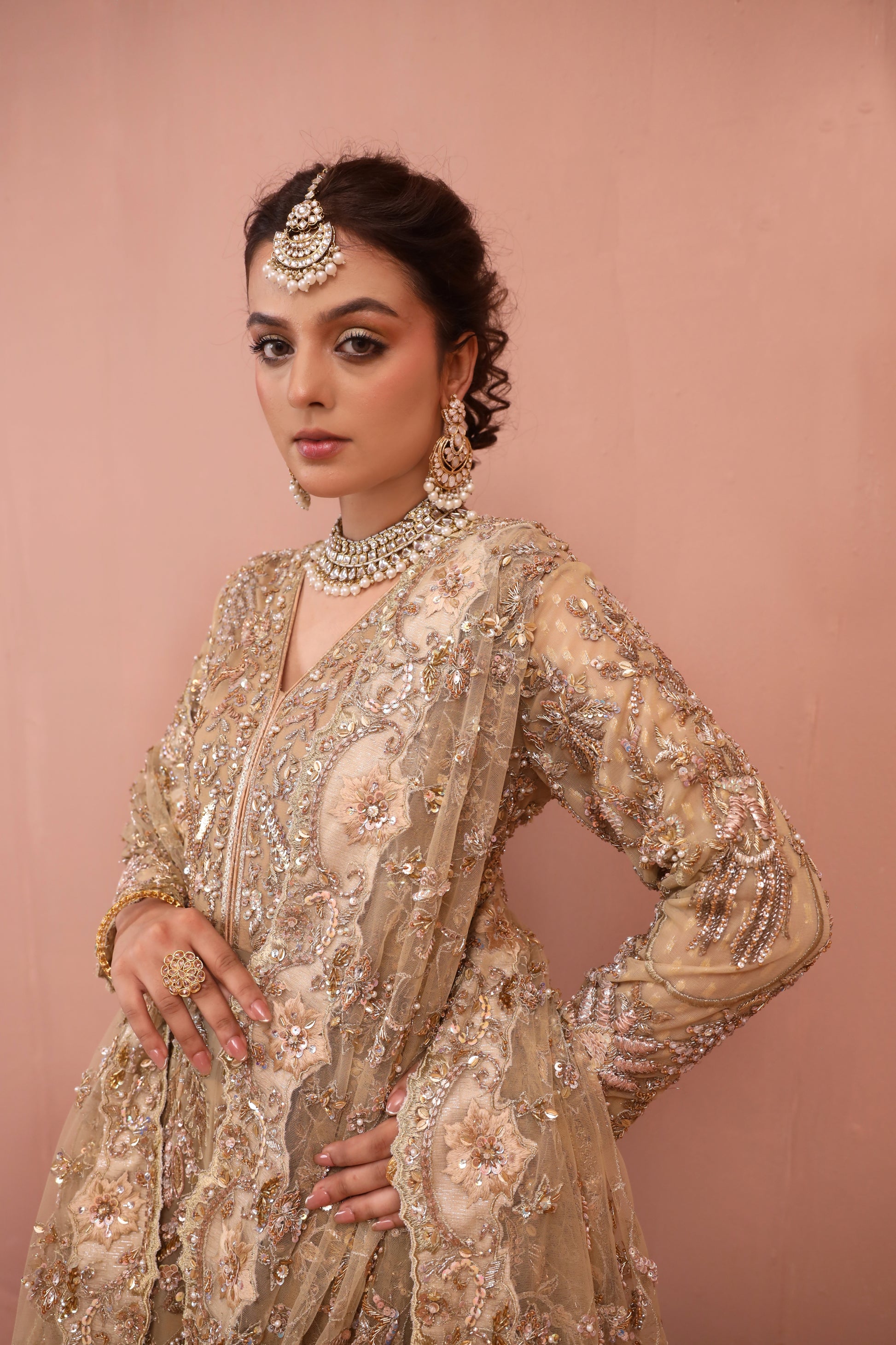A truly masterpiece for the bride who believes in subtle grandeur.The delicate net bridal flows effortlessly, while intricate Ada handwork graces every inch, reflecting the essence of heritage artistry. Paired with a heavy heirloom net shawl and flairy lehnga,this look blends modern elegance with traditional charm .