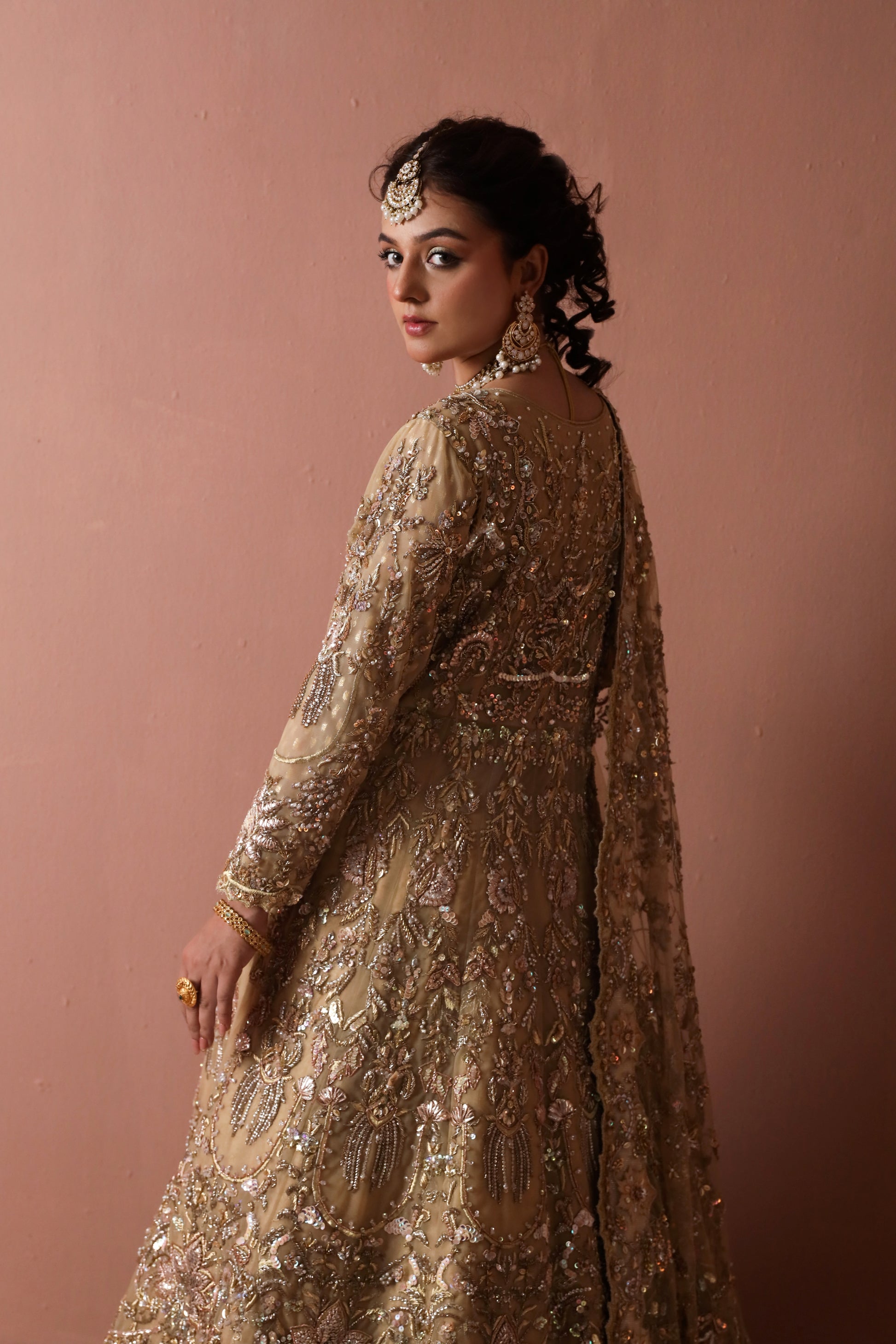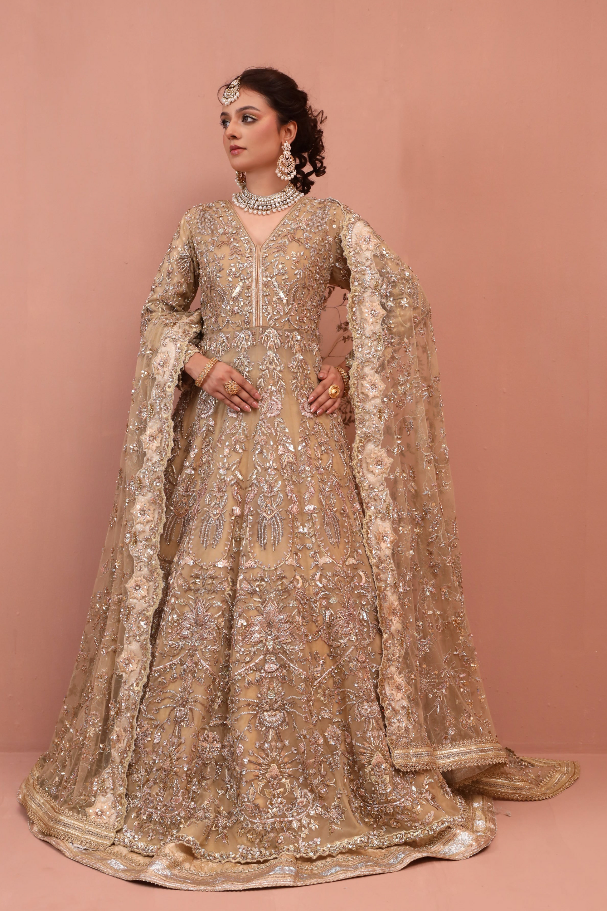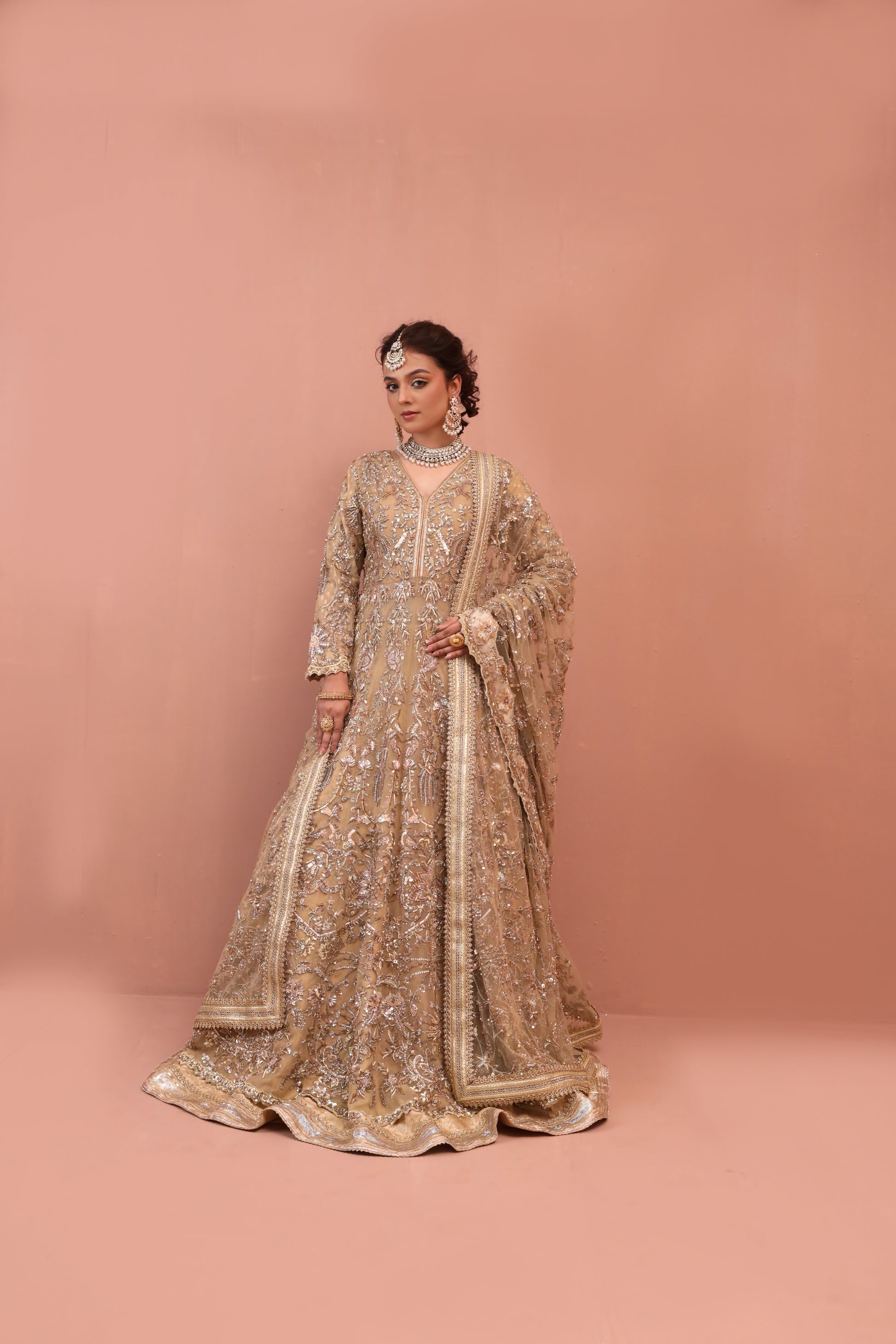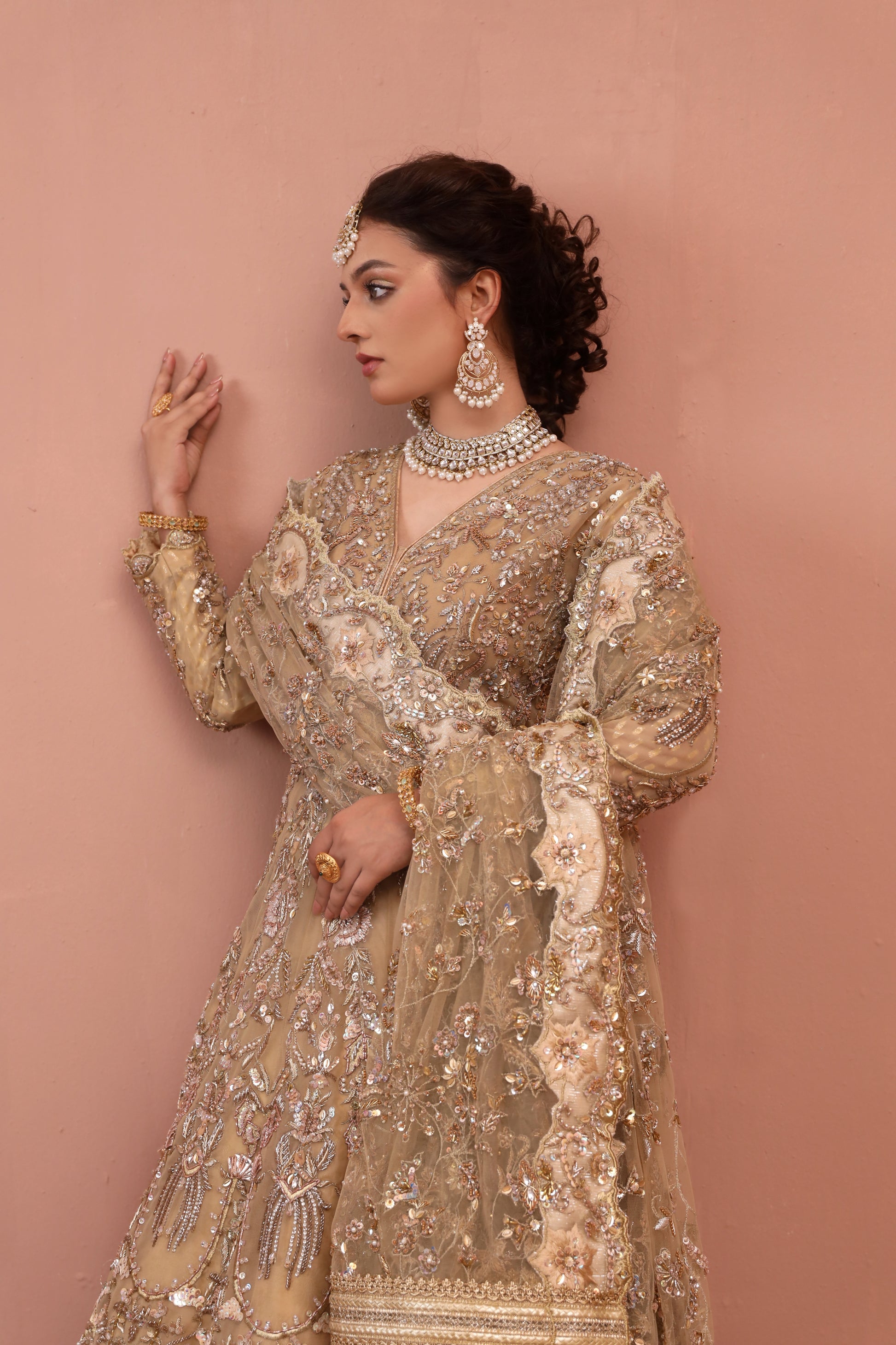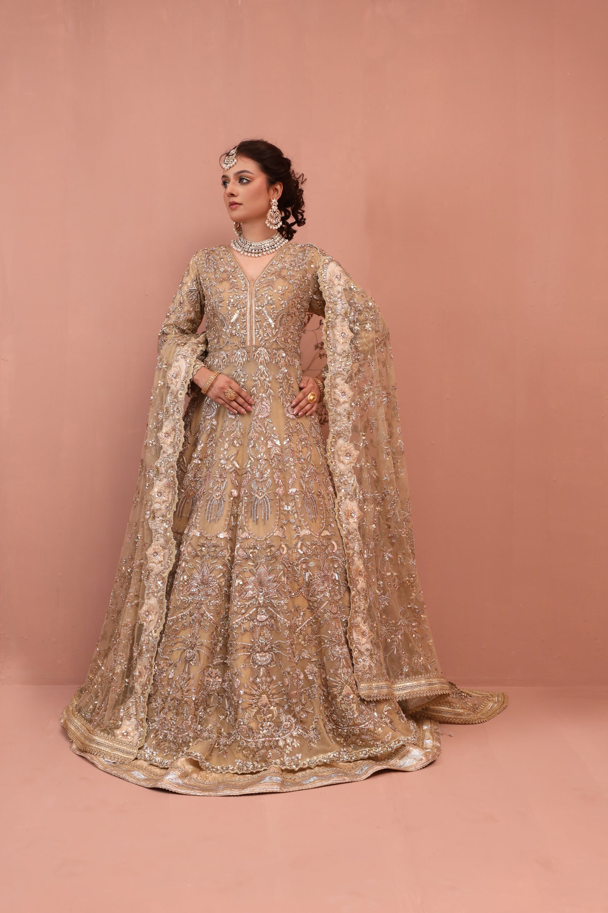 A truly masterpiece for the bride who believes in subtle grandeur.The delicate net bridal flows effortlessly, while intricate Ada handwork graces every inch, reflecting the essence of heritage artistry. Paired with a heavy heirloom net shawl and flairy lehnga,this look blends modern elegance with traditional charm .