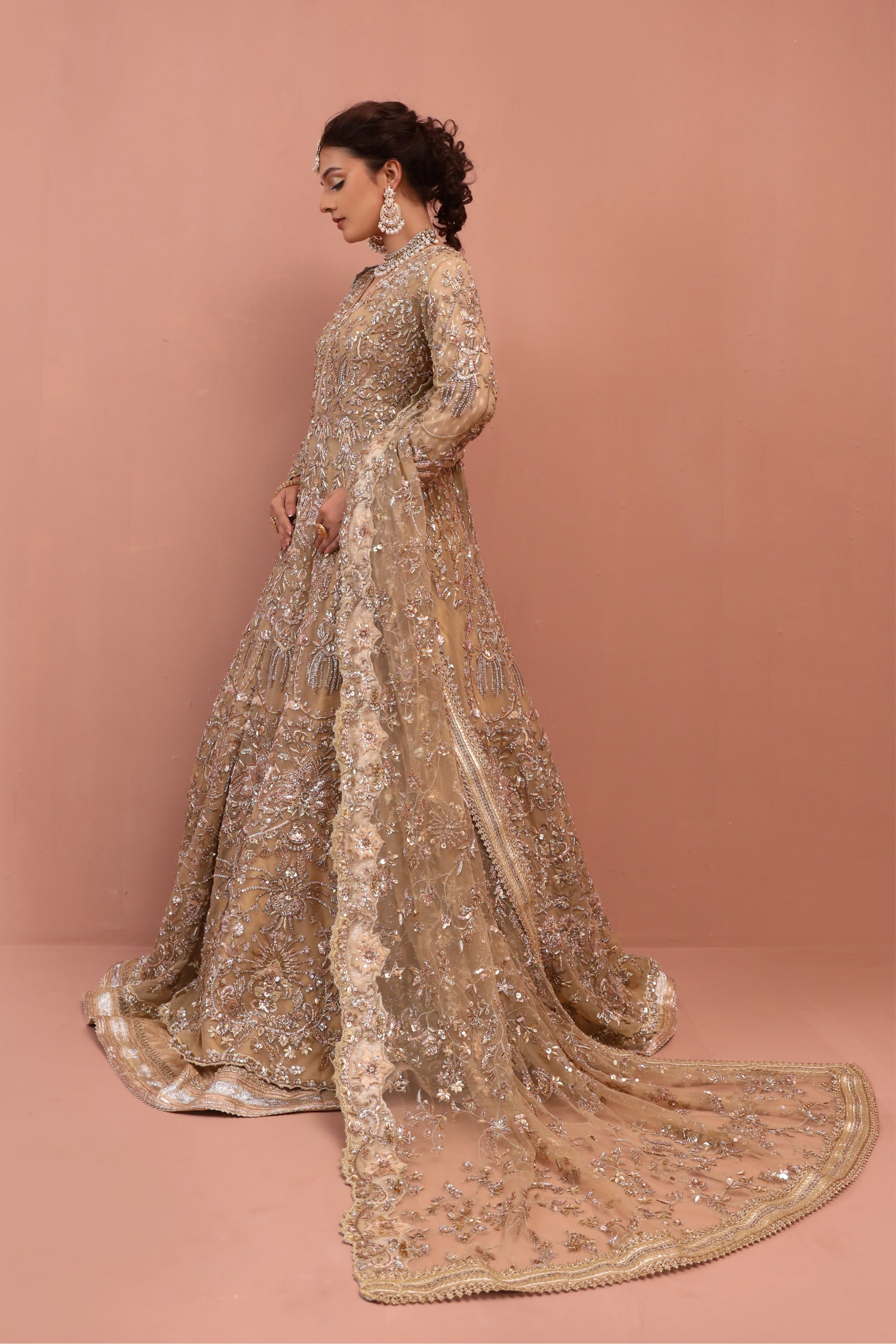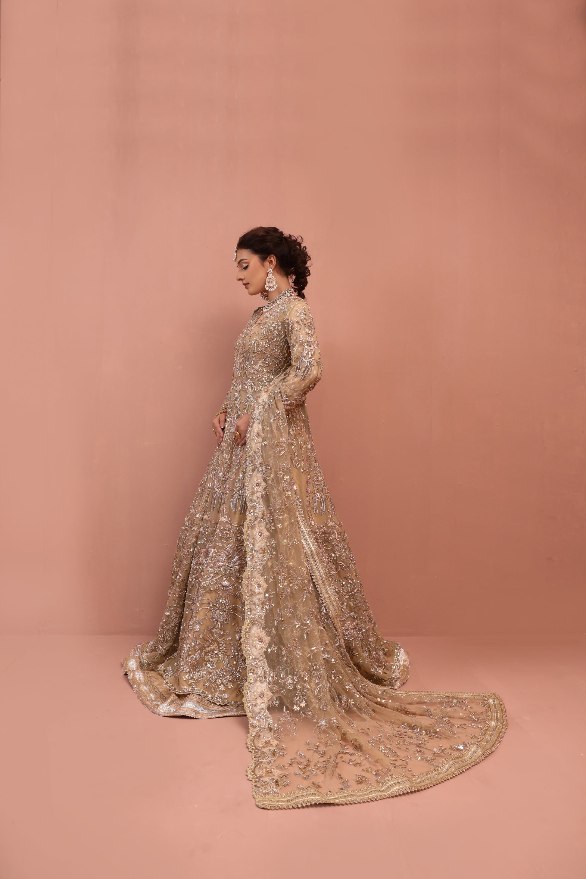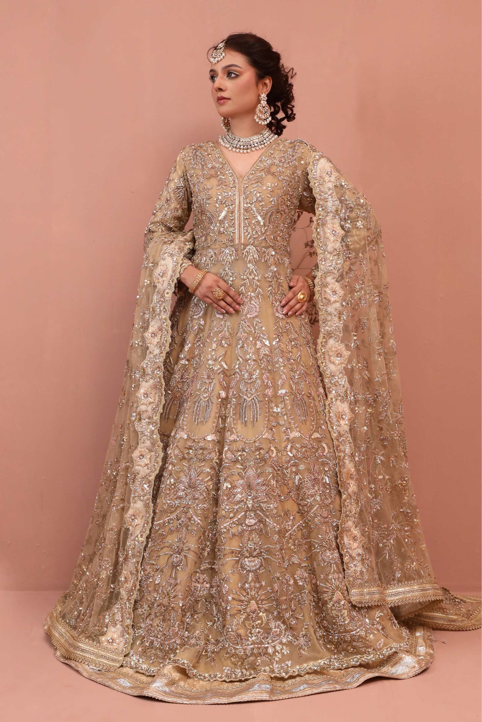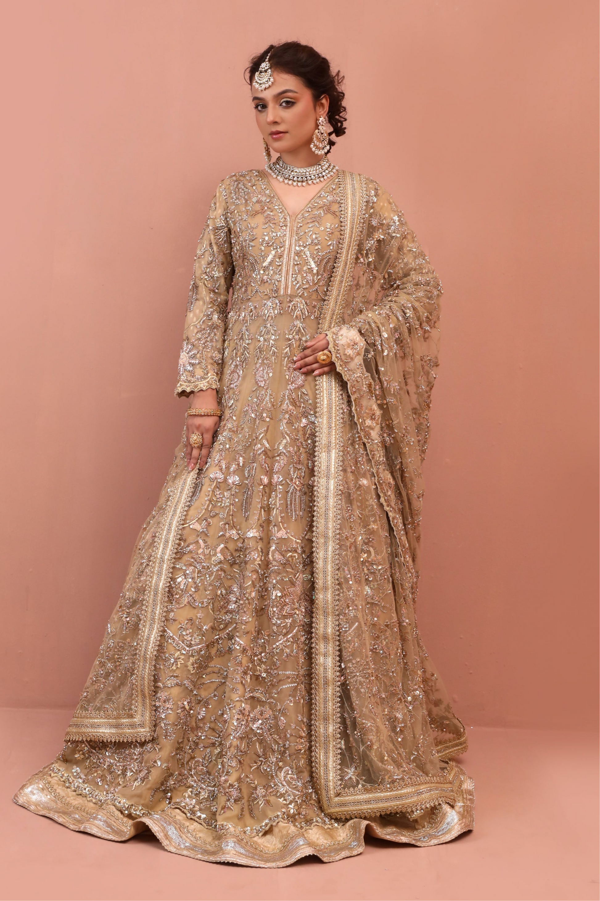 A truly masterpiece for the bride who believes in subtle grandeur.The delicate net bridal flows effortlessly, while intricate Ada handwork graces every inch, reflecting the essence of heritage artistry. Paired with a heavy heirloom net shawl and flairy lehnga,this look blends modern elegance with traditional charm .