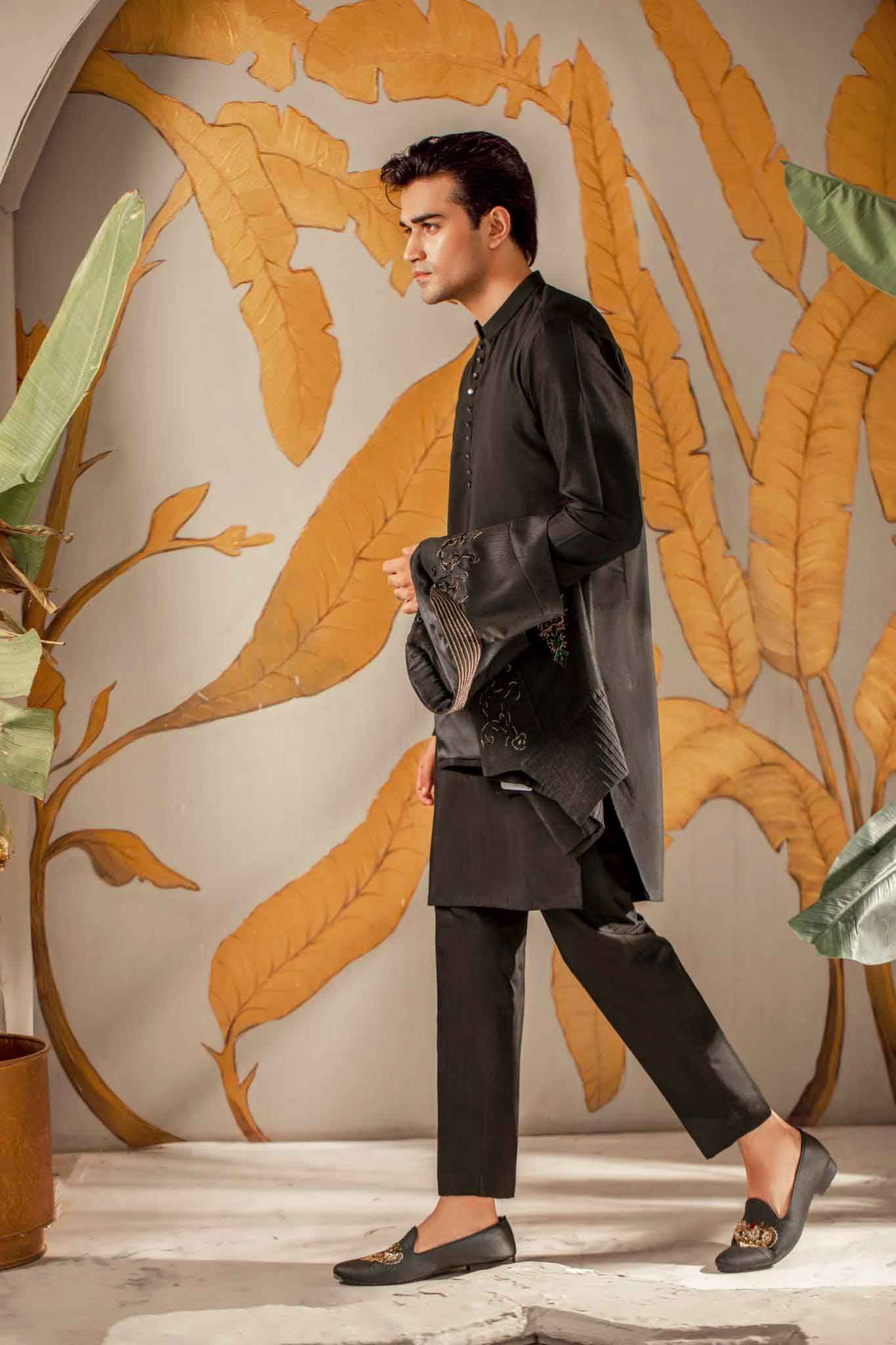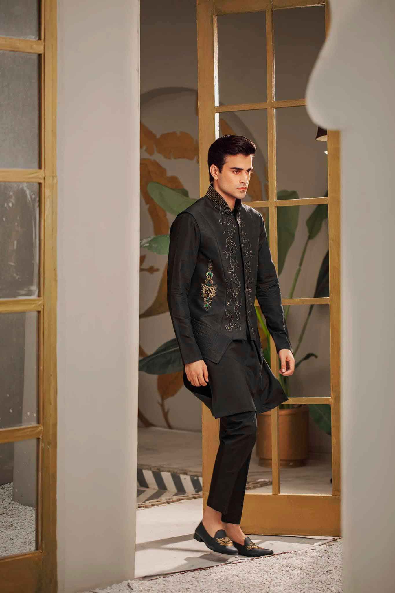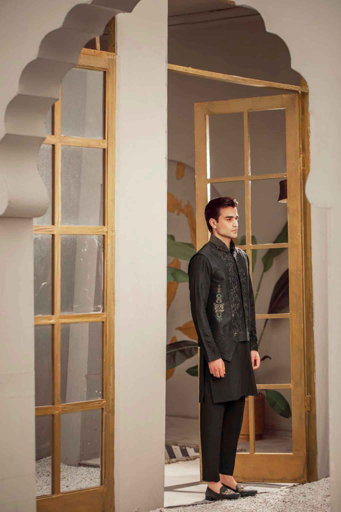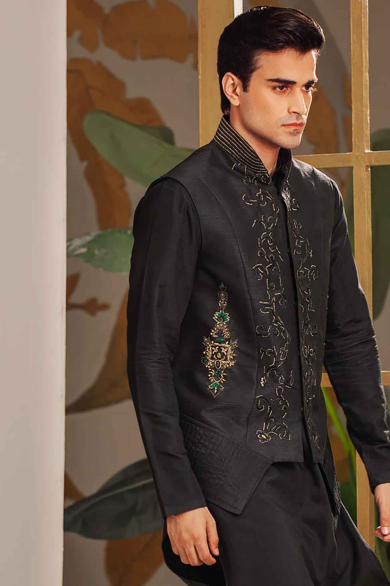A richly embroidered black-on-black turkish waiscoat to create the perfect high contrast with embroidered high collar.There is nothing more luxurious than black outfit that is encrusted with signature embroideries and breathtaking detail.