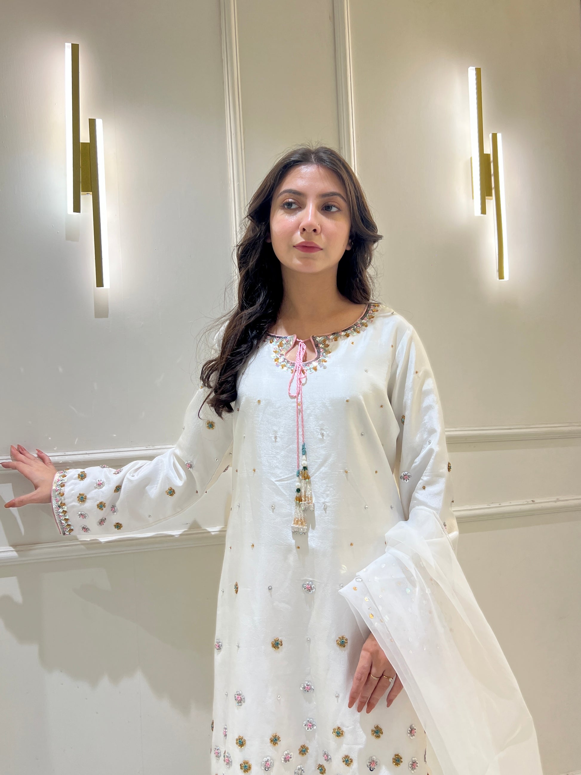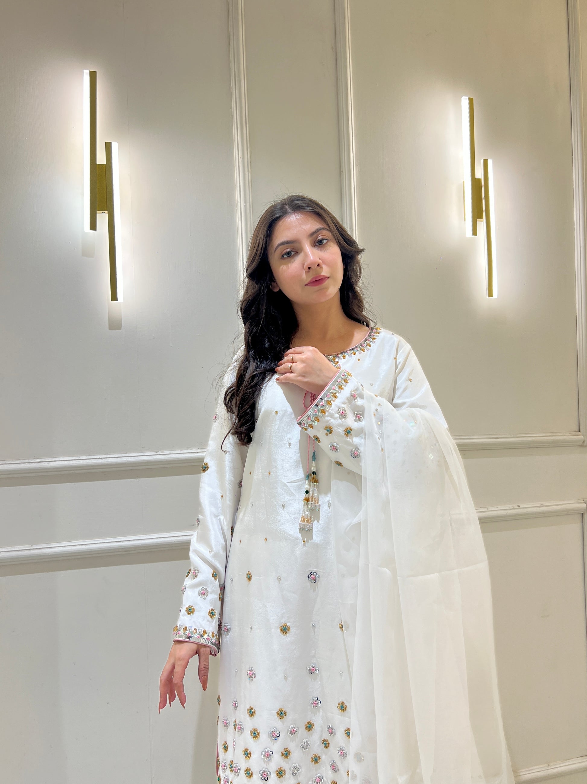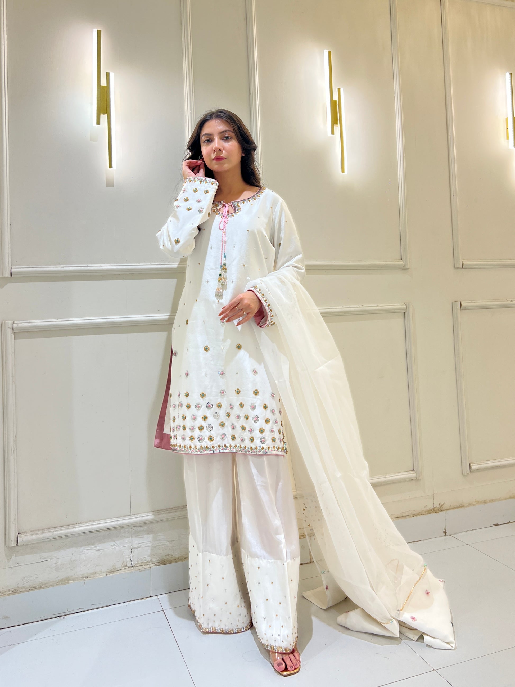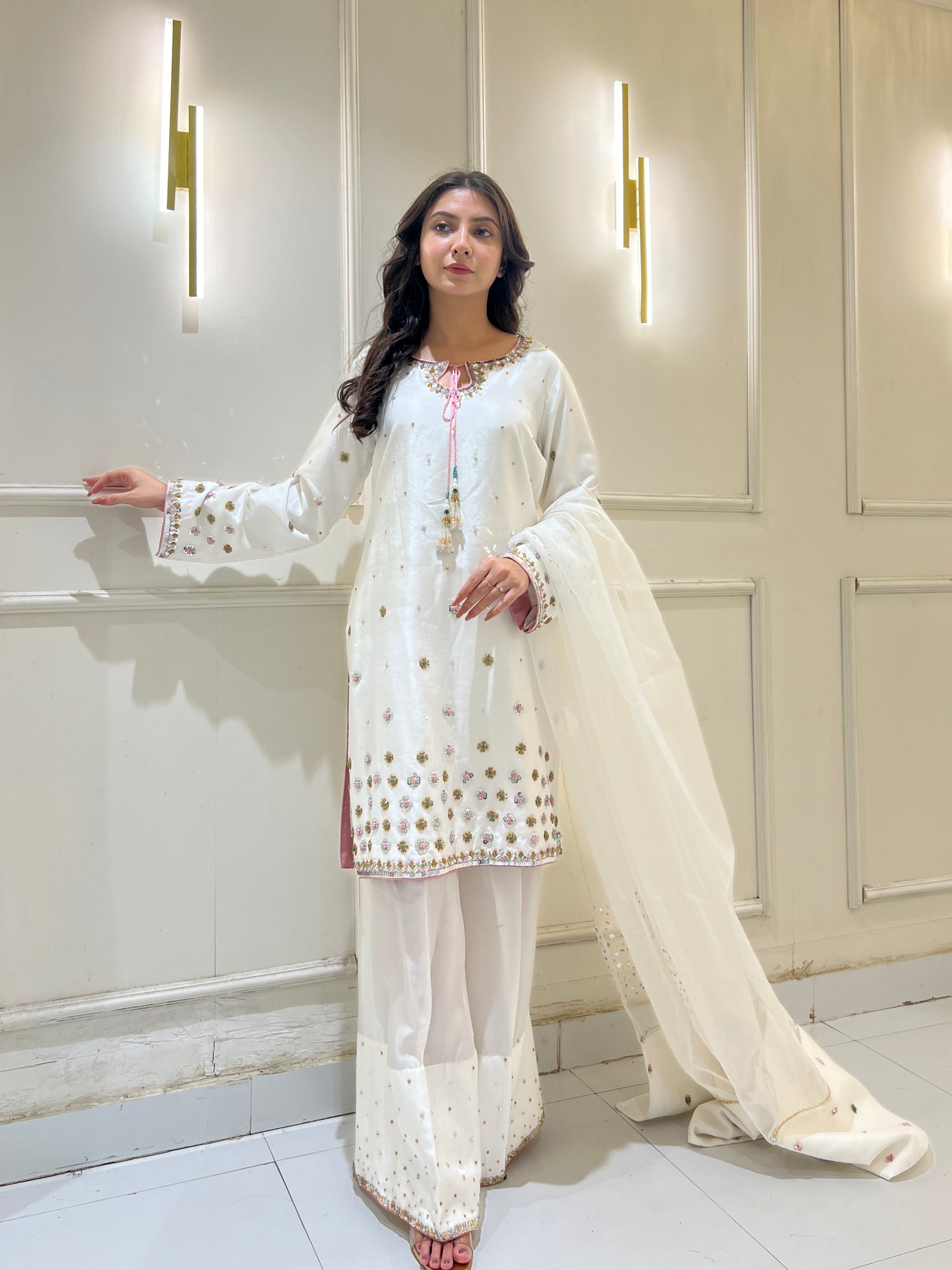 This breathtaking Sheesha silk white outfit embodies elegance, with a tussel added neckline, hand-embellished 3D border, and delicate floral details. Paired with a white farshi Shalwar and organza embellished dupatta, it's ideal for formal events.