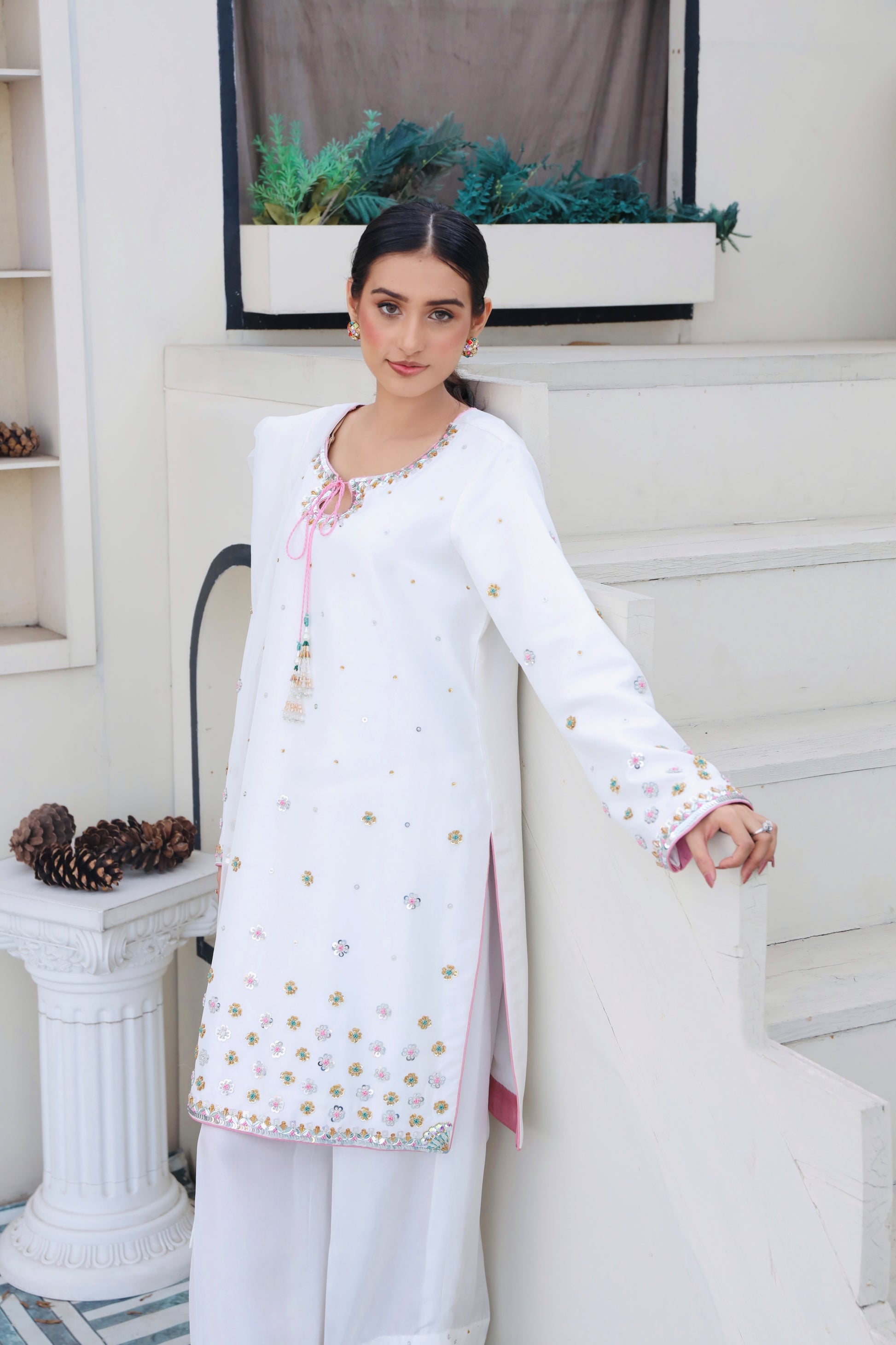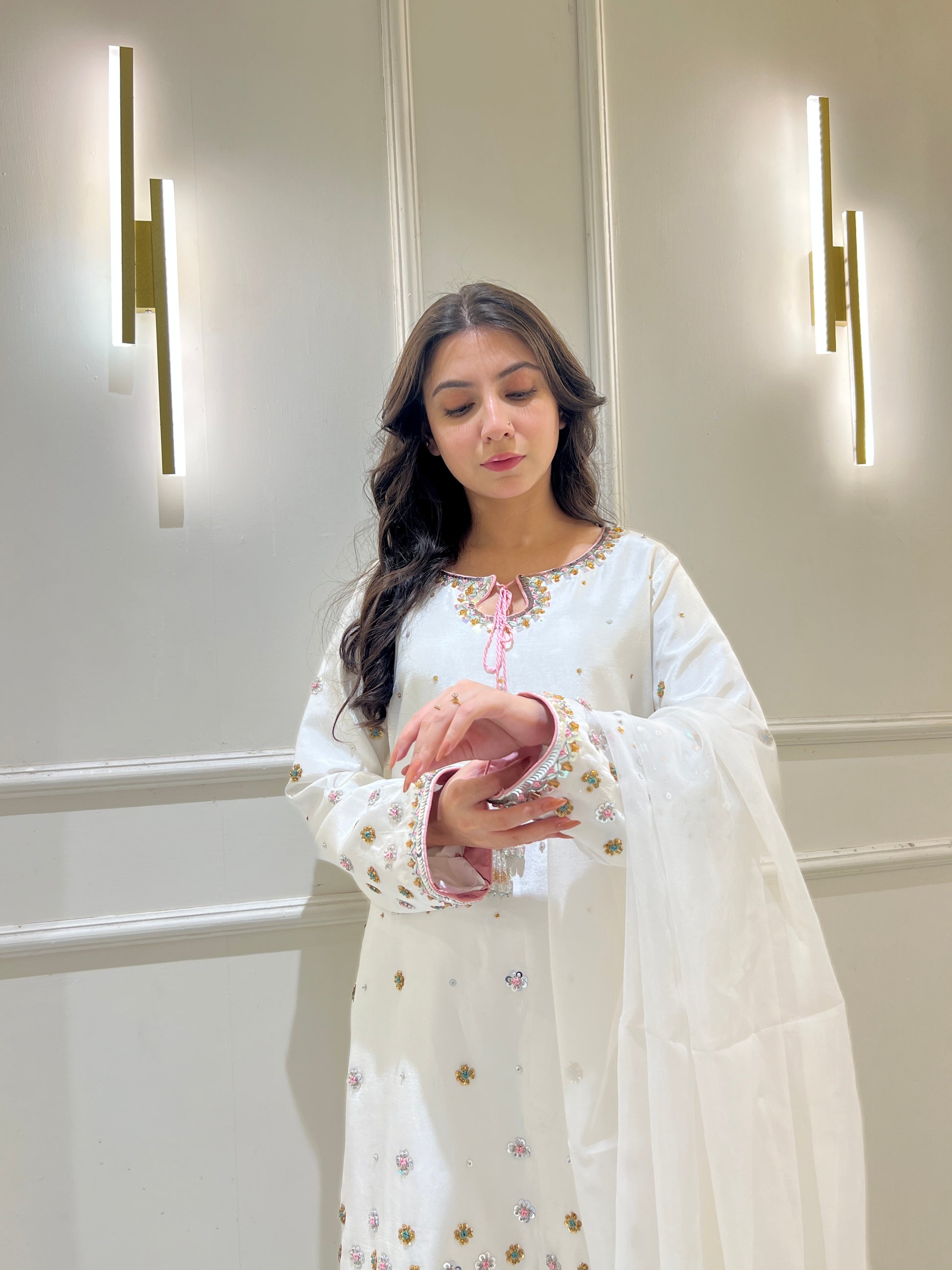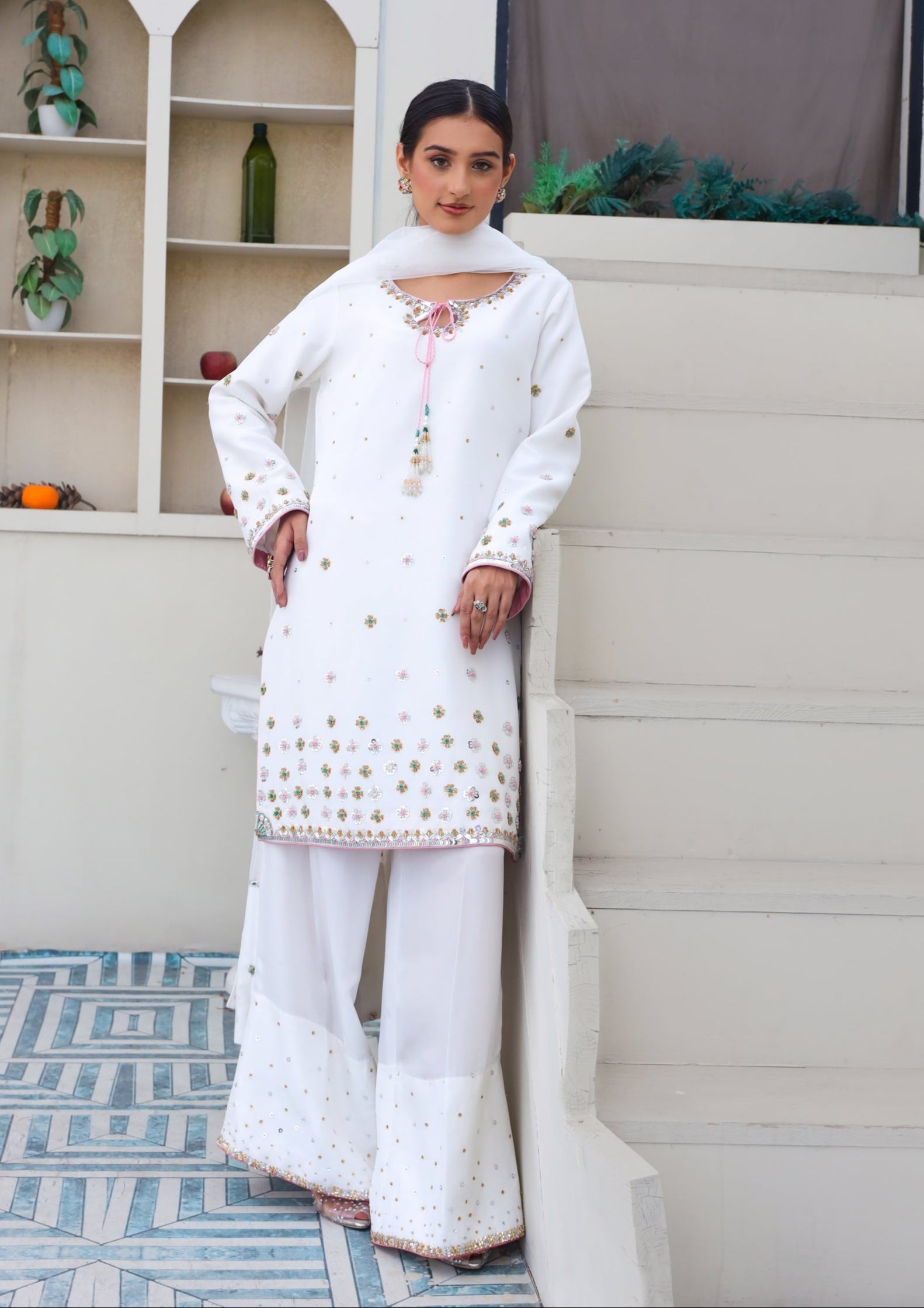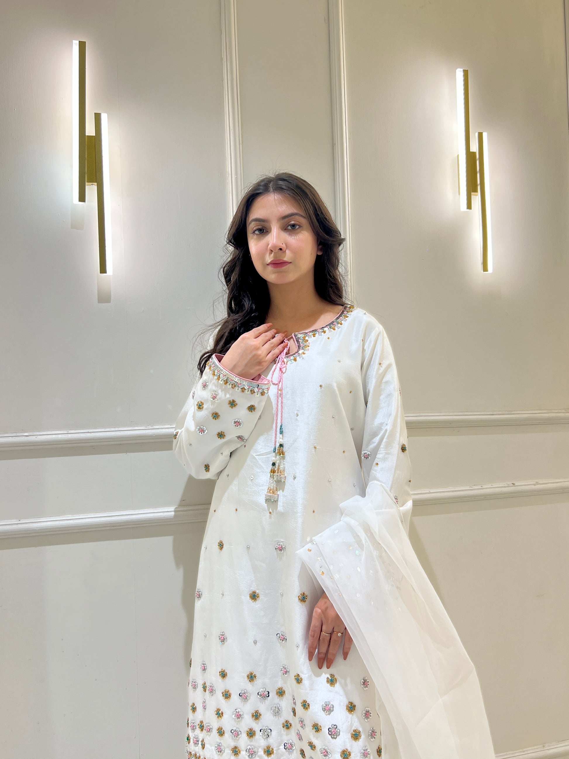 This breathtaking Sheesha silk white outfit embodies elegance, with a tussel added neckline, hand-embellished 3D border, and delicate floral details. Paired with a white farshi Shalwar and organza embellished dupatta, it's ideal for formal events.