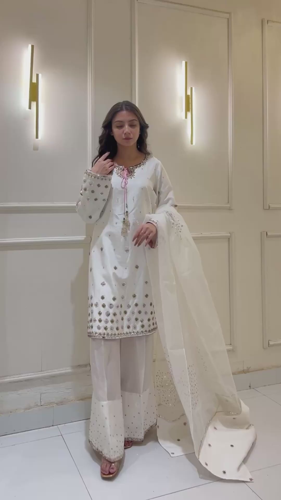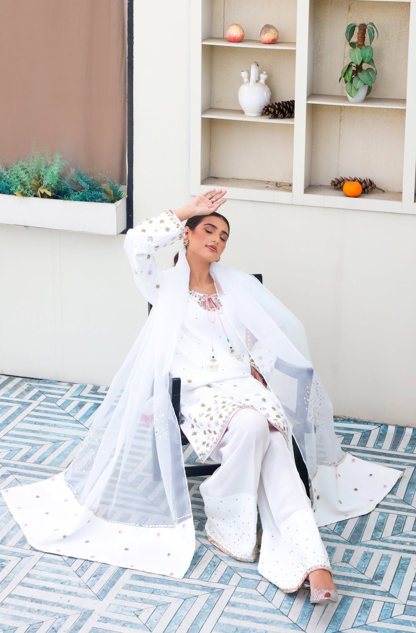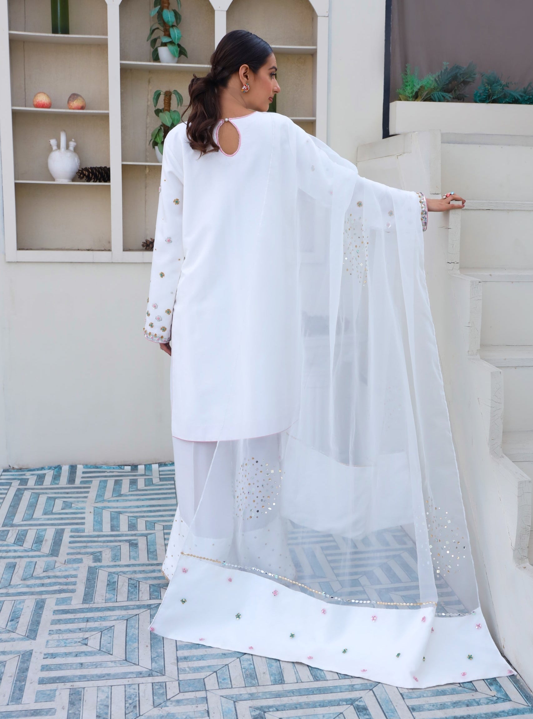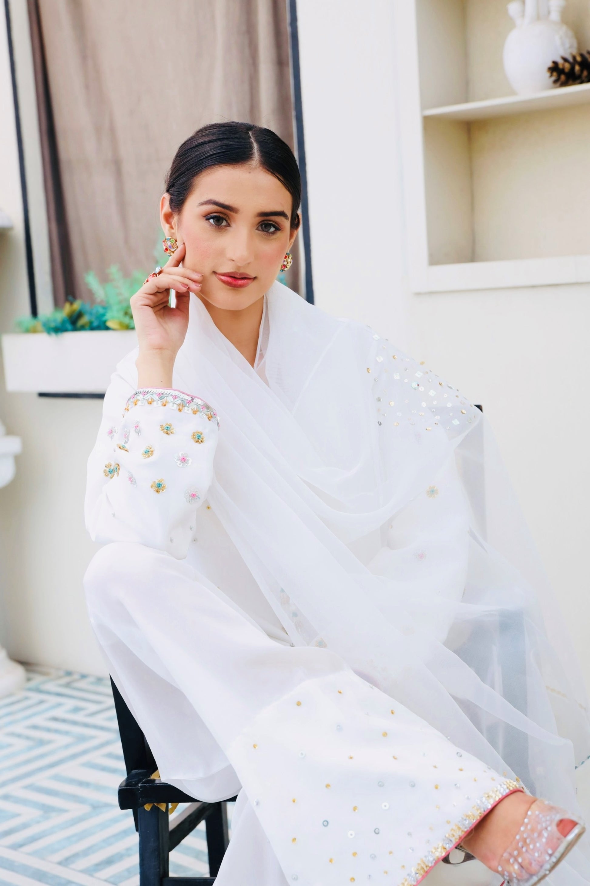 This breathtaking Sheesha silk white outfit embodies elegance, with a tussel added neckline, hand-embellished 3D border, and delicate floral details. Paired with a white farshi Shalwar and organza embellished dupatta, it's ideal for formal events.
