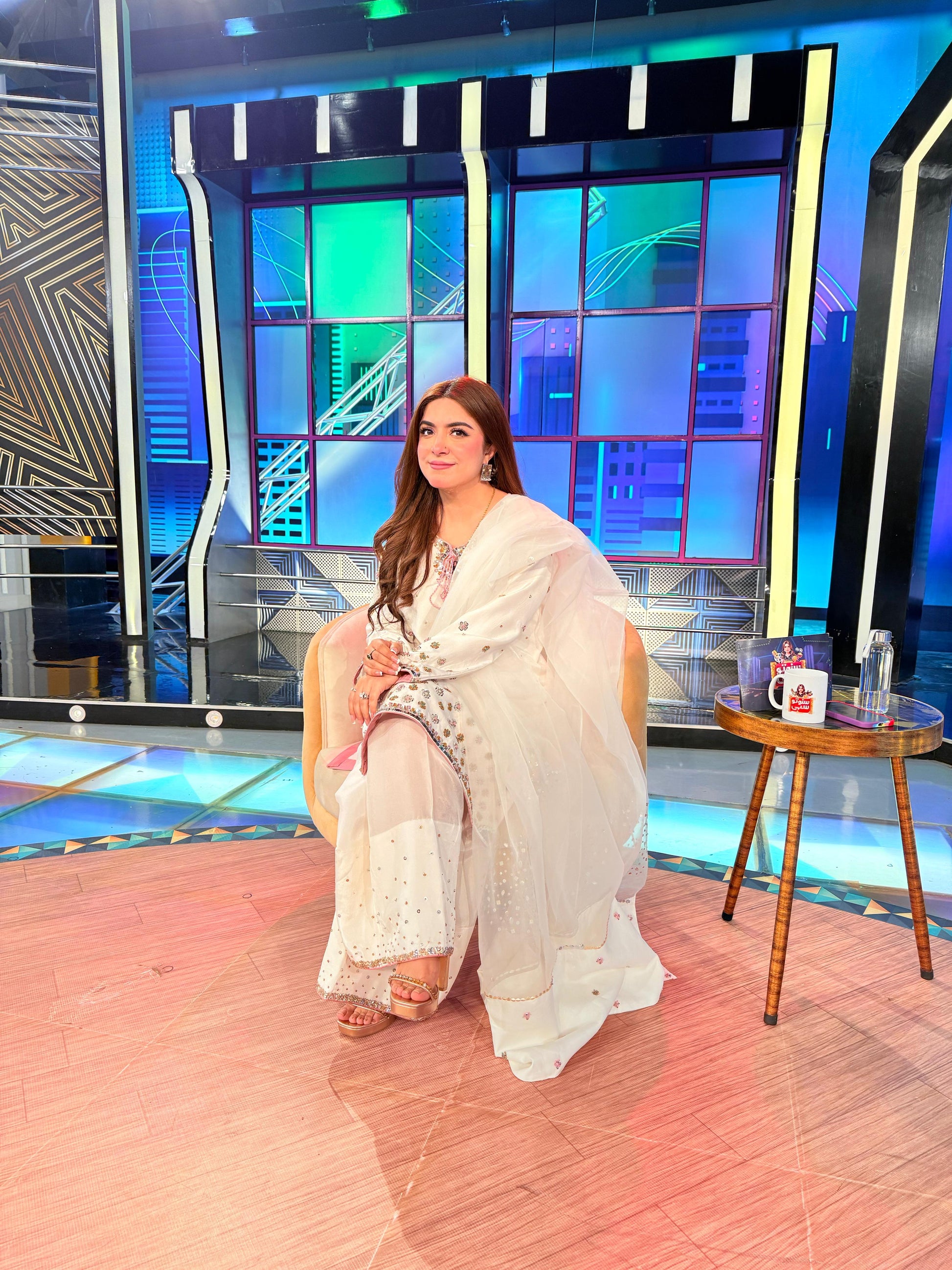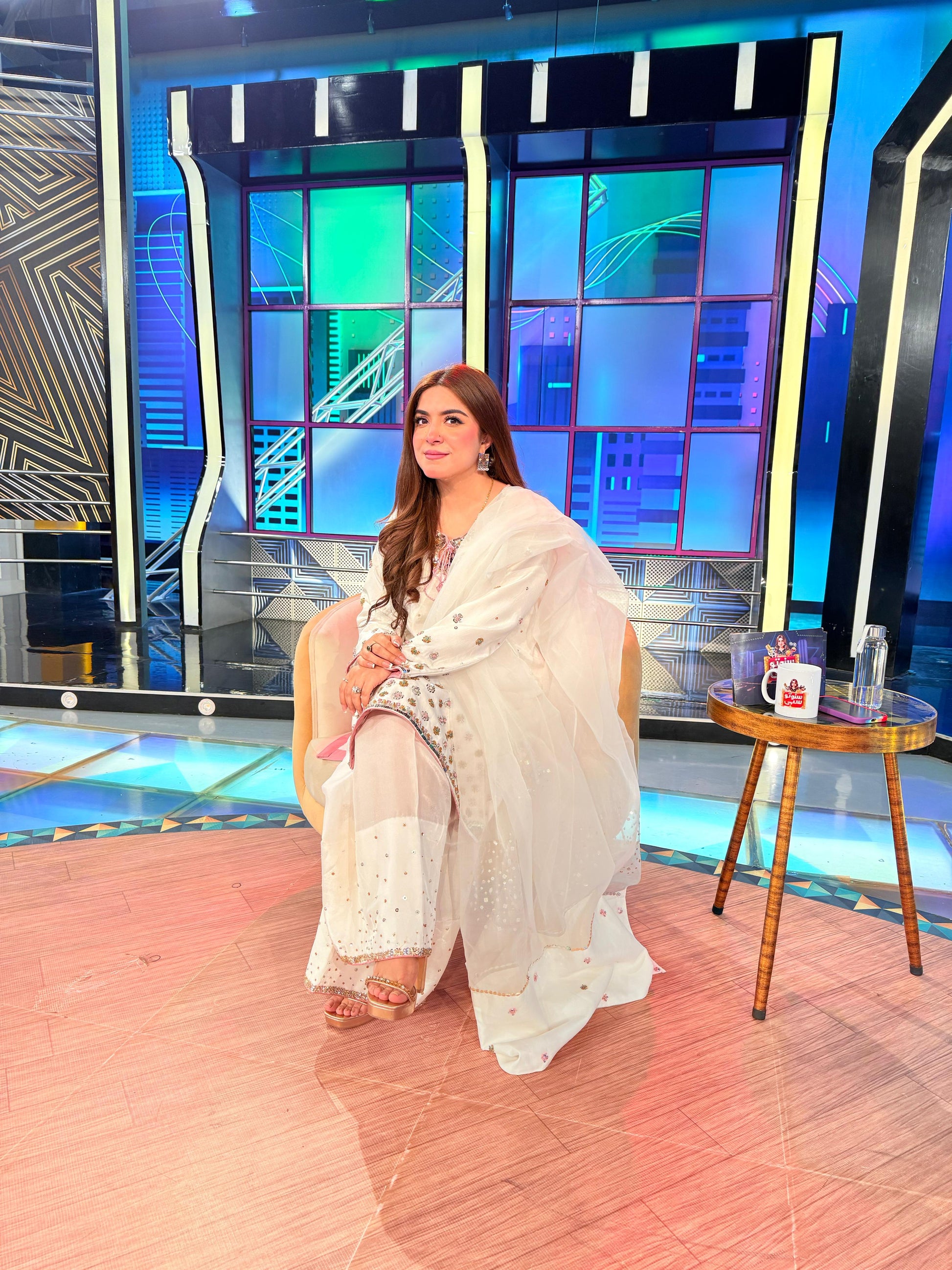 Paired with a white farshi Shalwar and embellished organza-adorned dupatta.