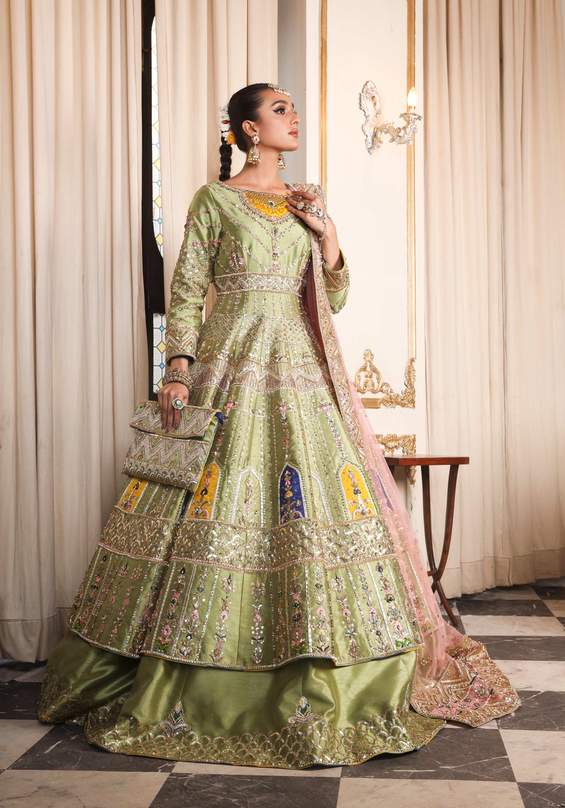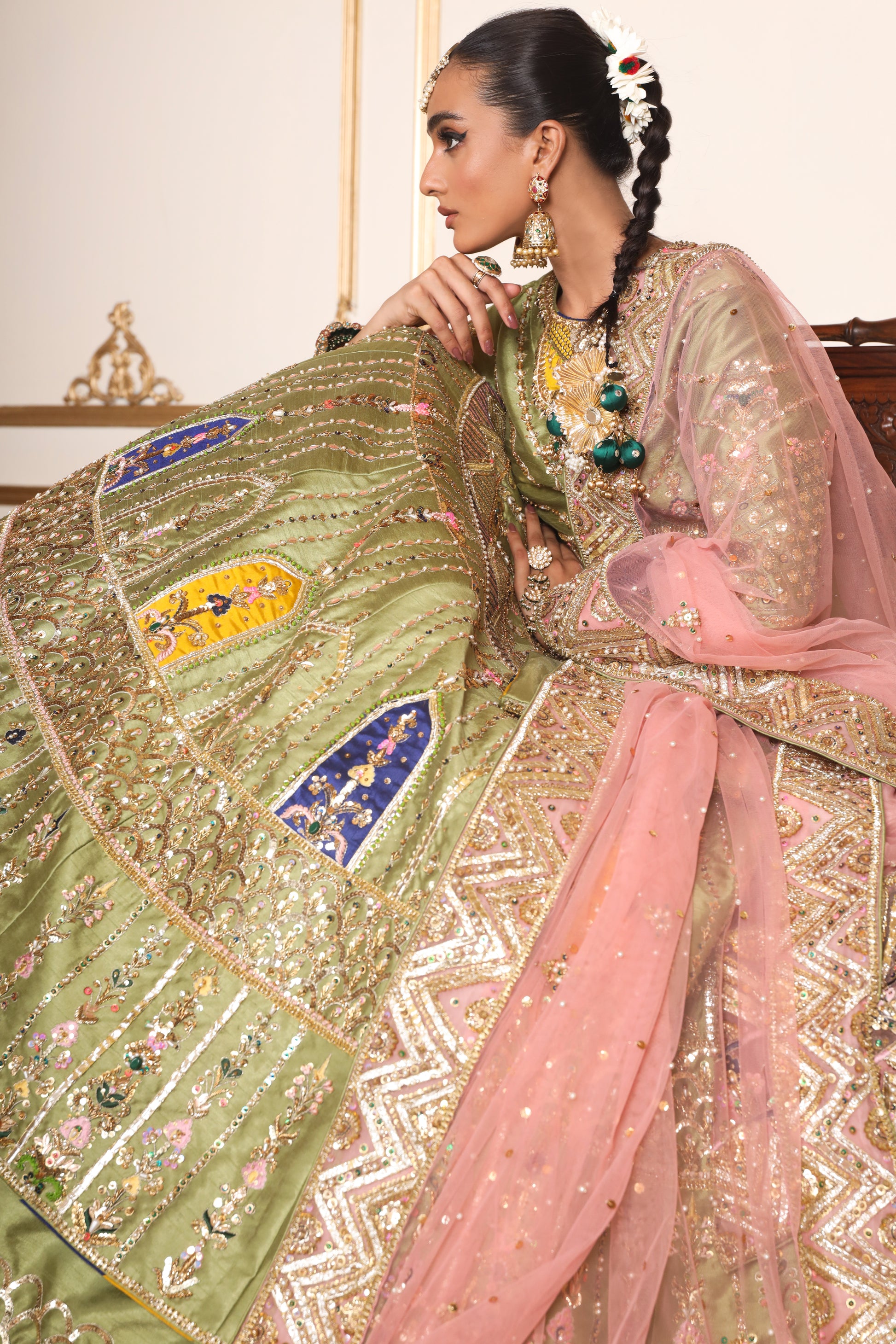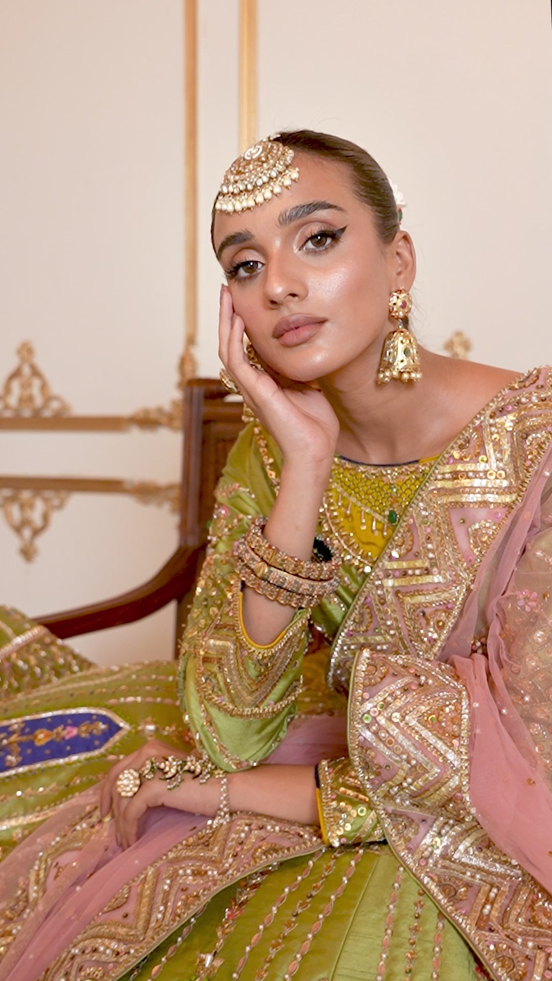 Ruhi is our multicolor gown featuring an intricate mix of ruby, emerald, sapphire jewel tones making it perfect choice to worn flairy ethinc lehnga.