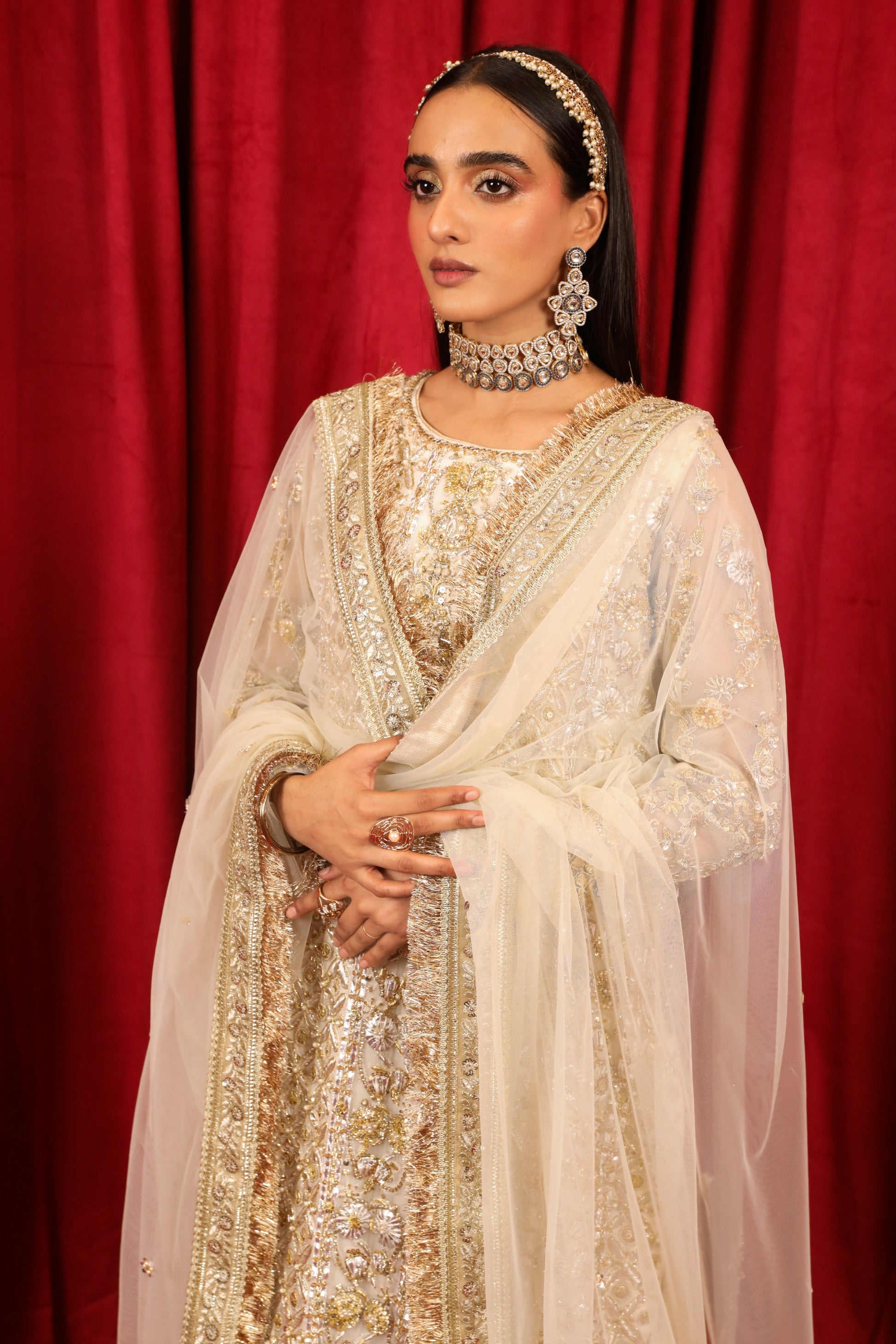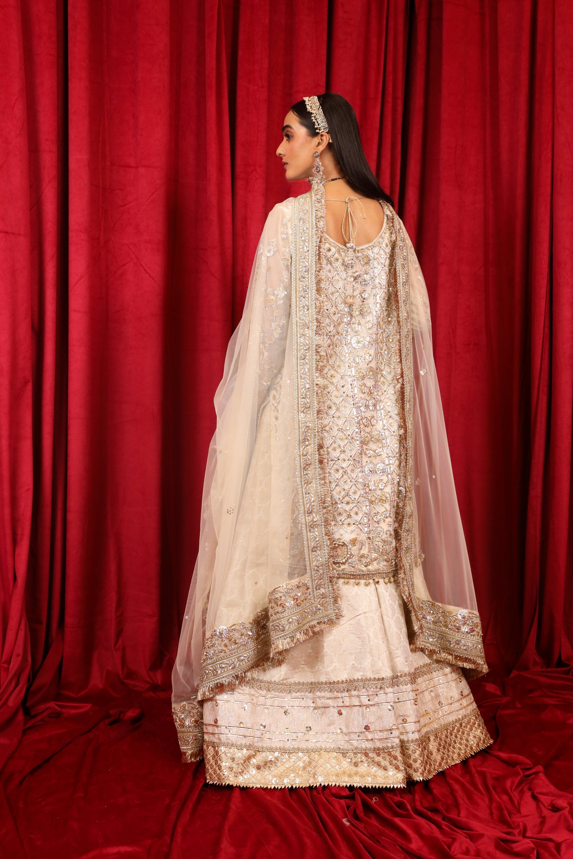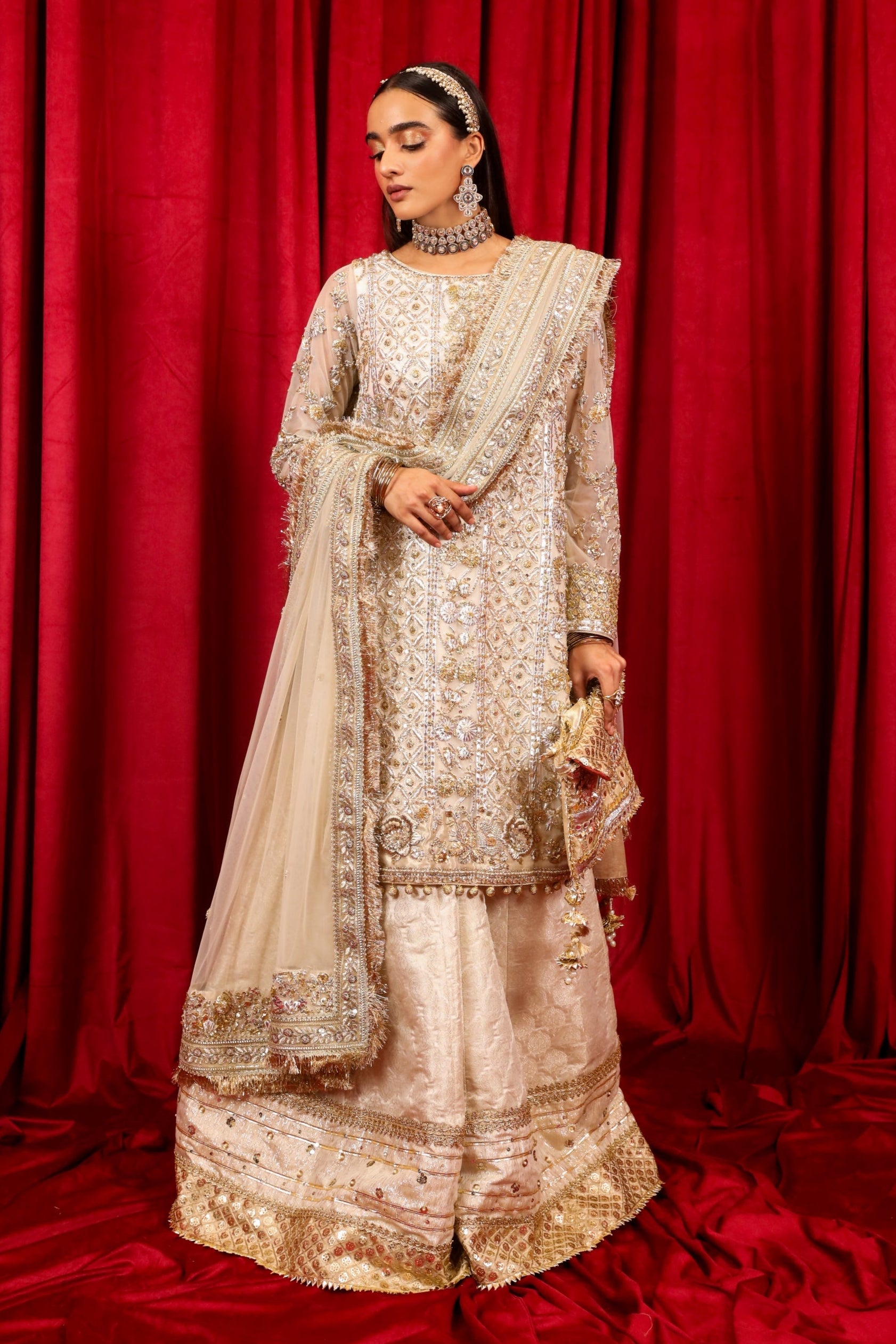 A metallic taupe masterpiece, lavishly handcrafted with cora-dabka, zardozi, sequins, and pastel embroidery. The front is adorned with gotta and mirror accents, evoking timeless elegance. A richly embellished zari-net dupatta with kiran finishing and 3D florals completes the look, paired effortlessly with a flared sharara for modern heritage charm.