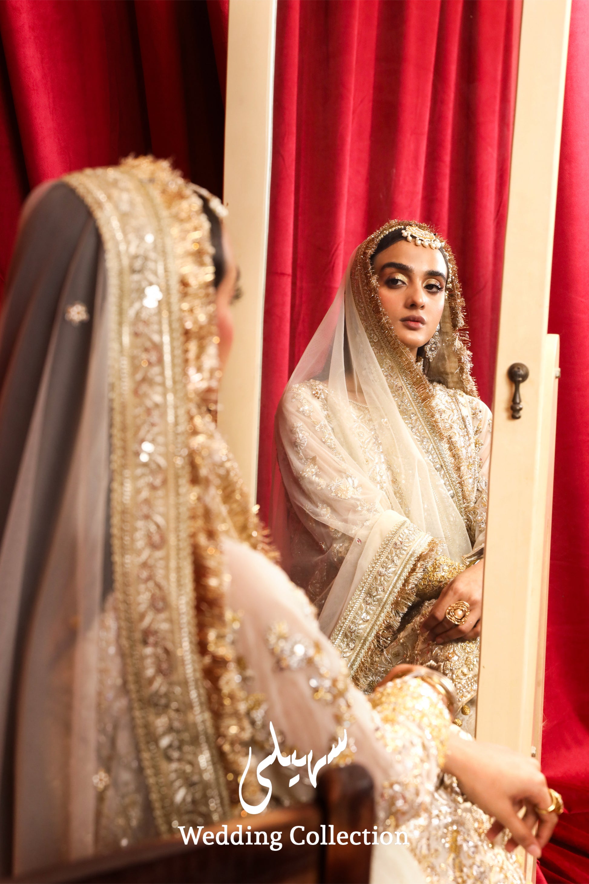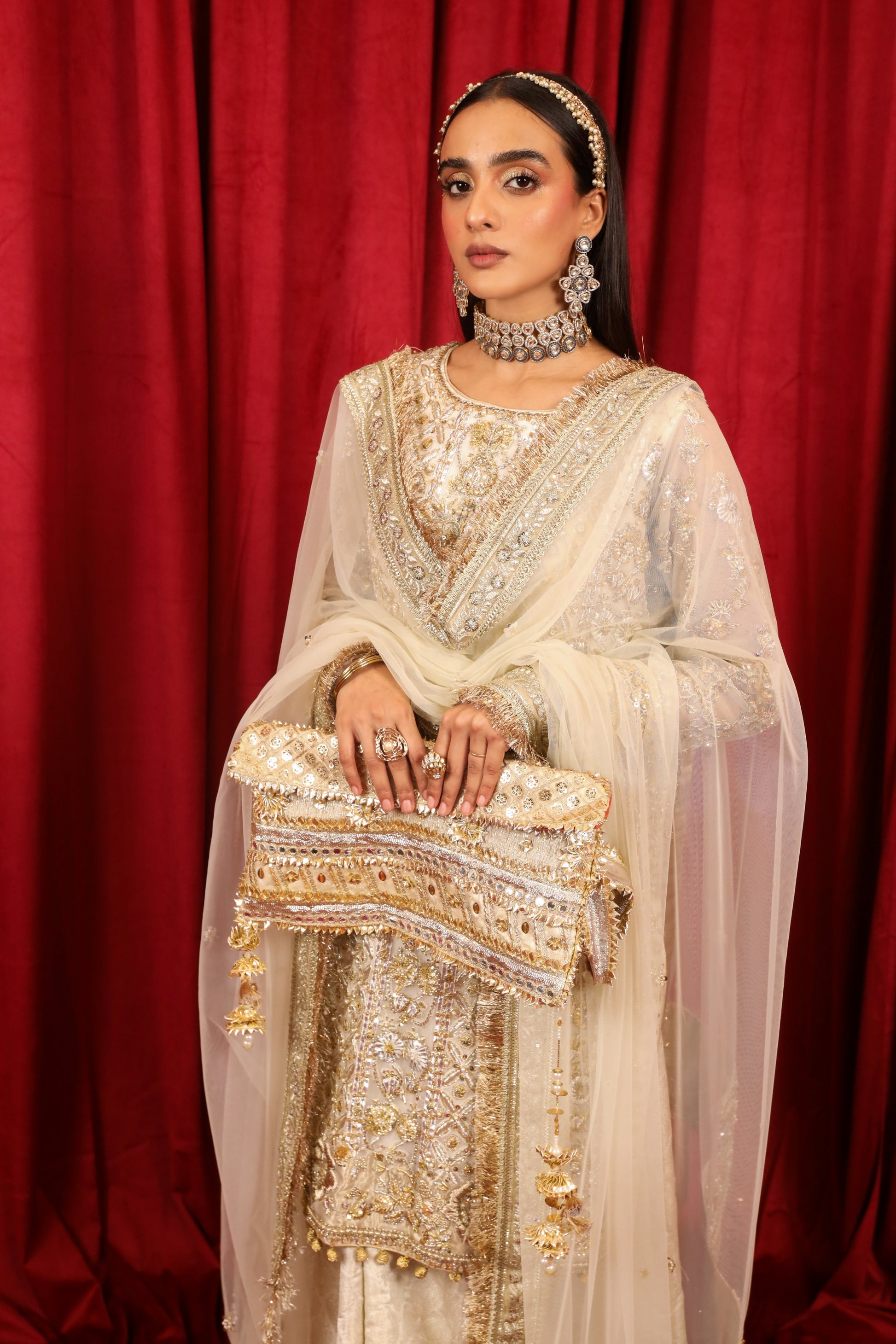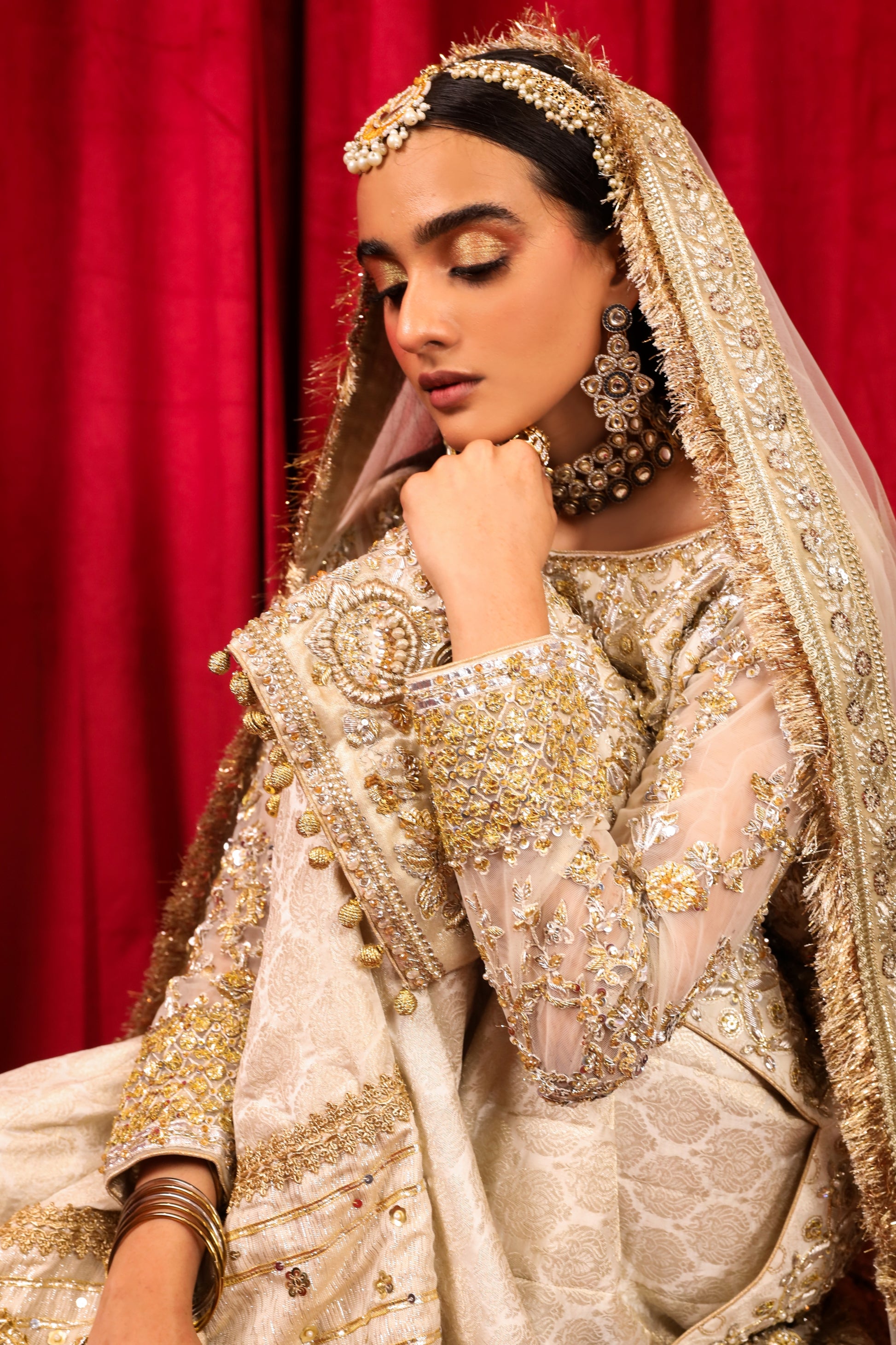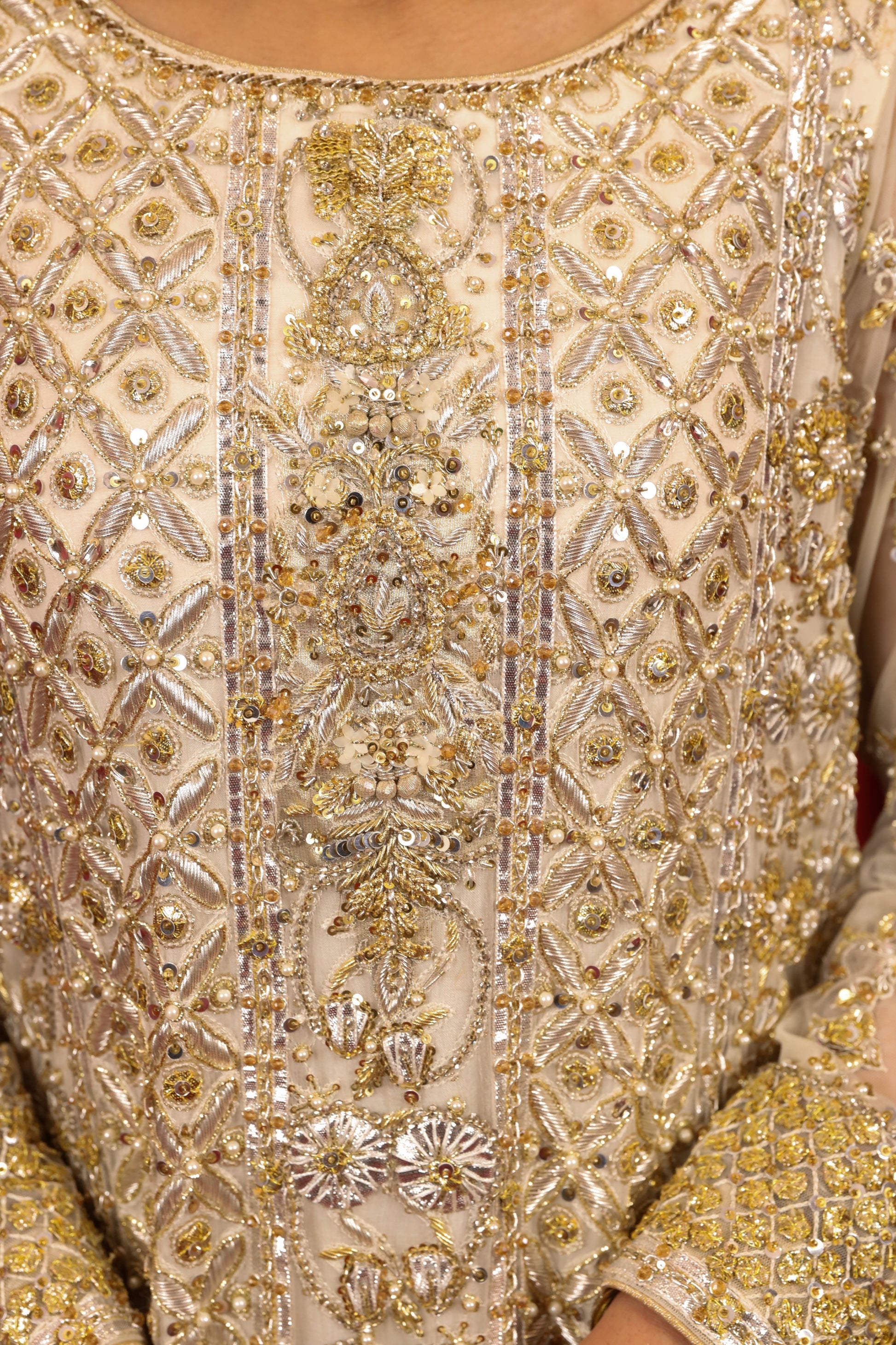A metallic taupe masterpiece, lavishly handcrafted with cora-dabka, zardozi, sequins, and pastel embroidery. The front is adorned with gotta and mirror accents, evoking timeless elegance. A richly embellished zari-net dupatta with kiran finishing and 3D florals completes the look, paired effortlessly with a flared sharara for modern heritage charm.