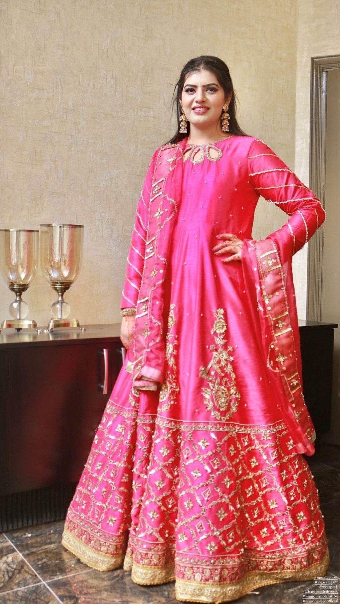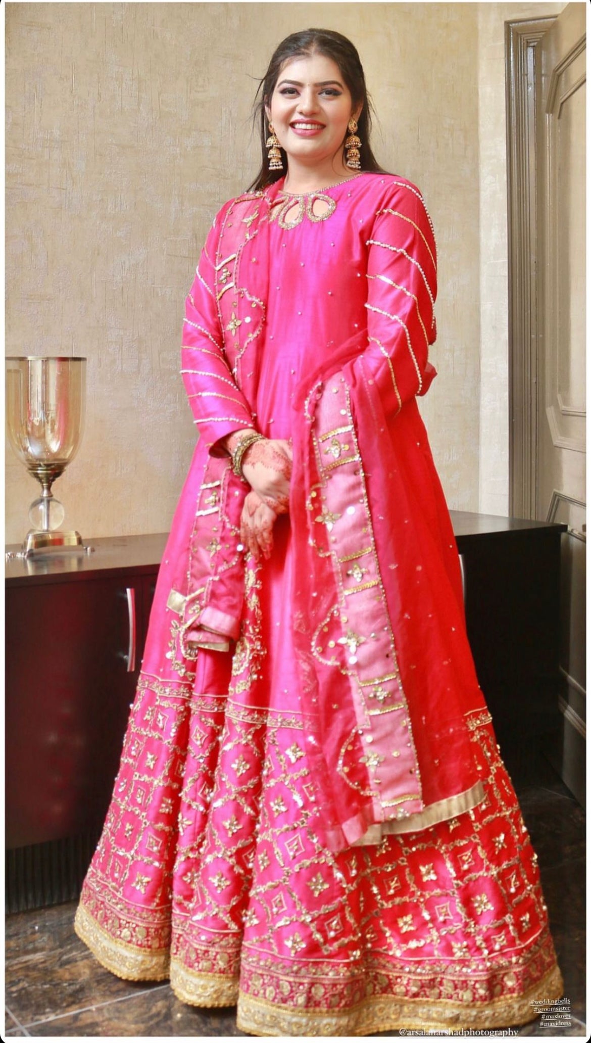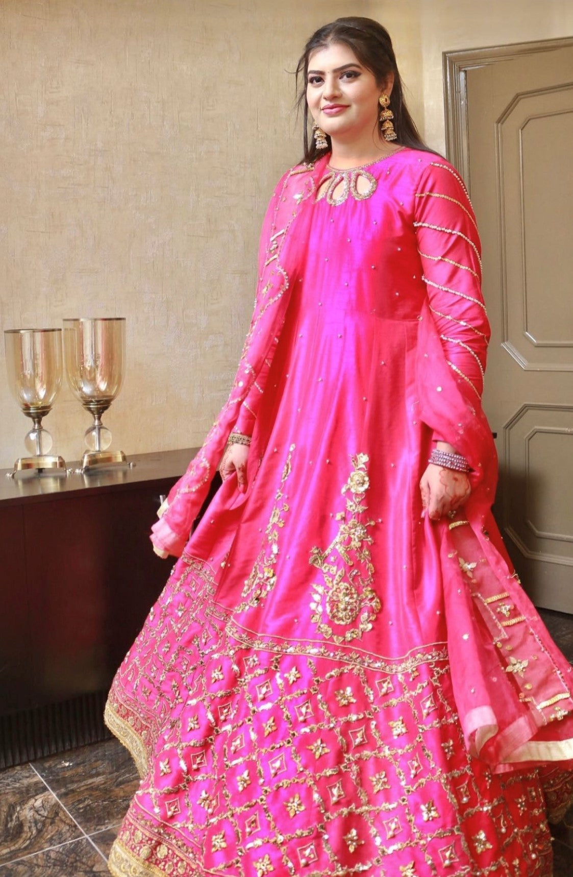 A shocking pink Maxi adorned with naqshi,kora,sequins and diamonties.The regal design and exquisite detail makes it absolutely mesmerising.