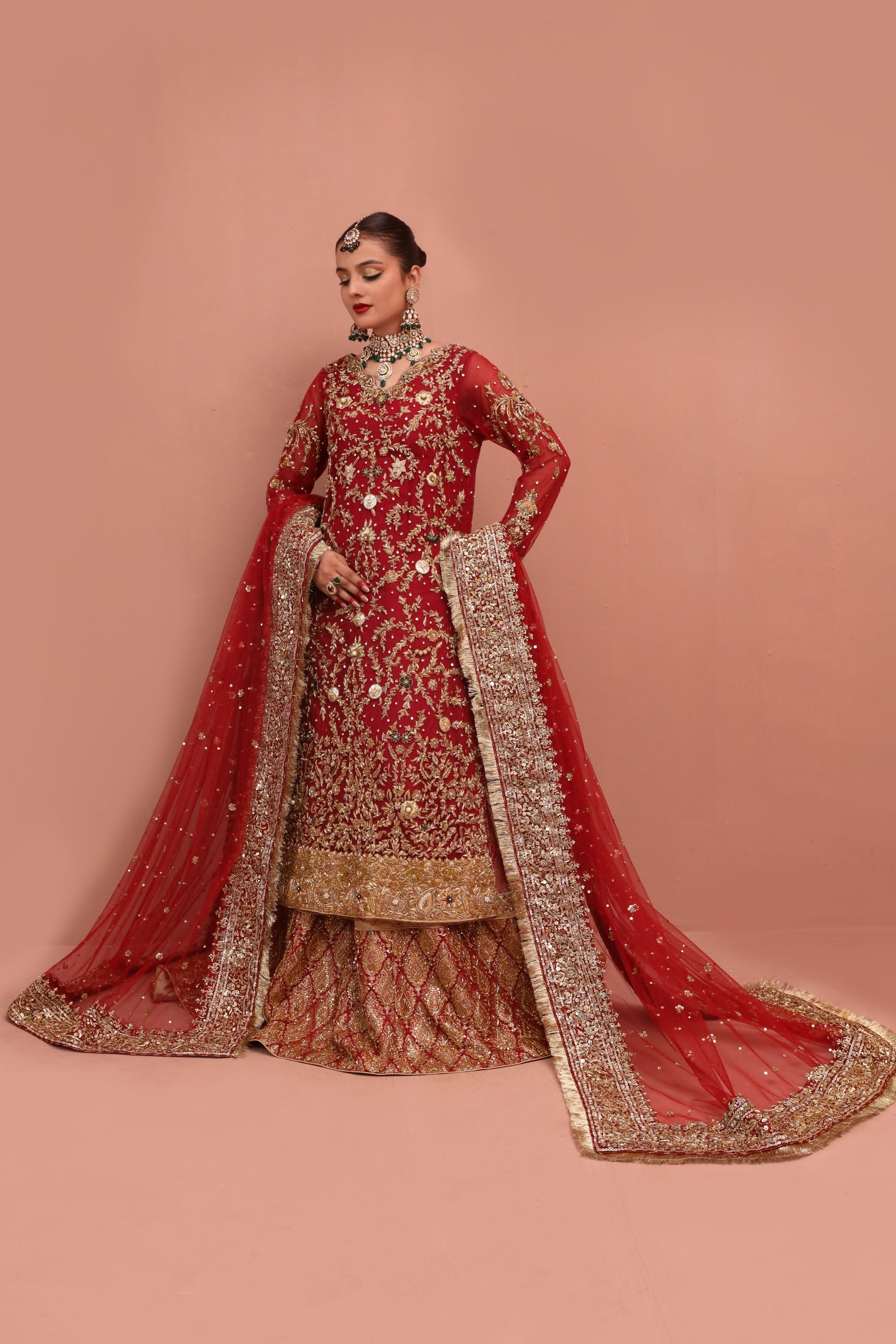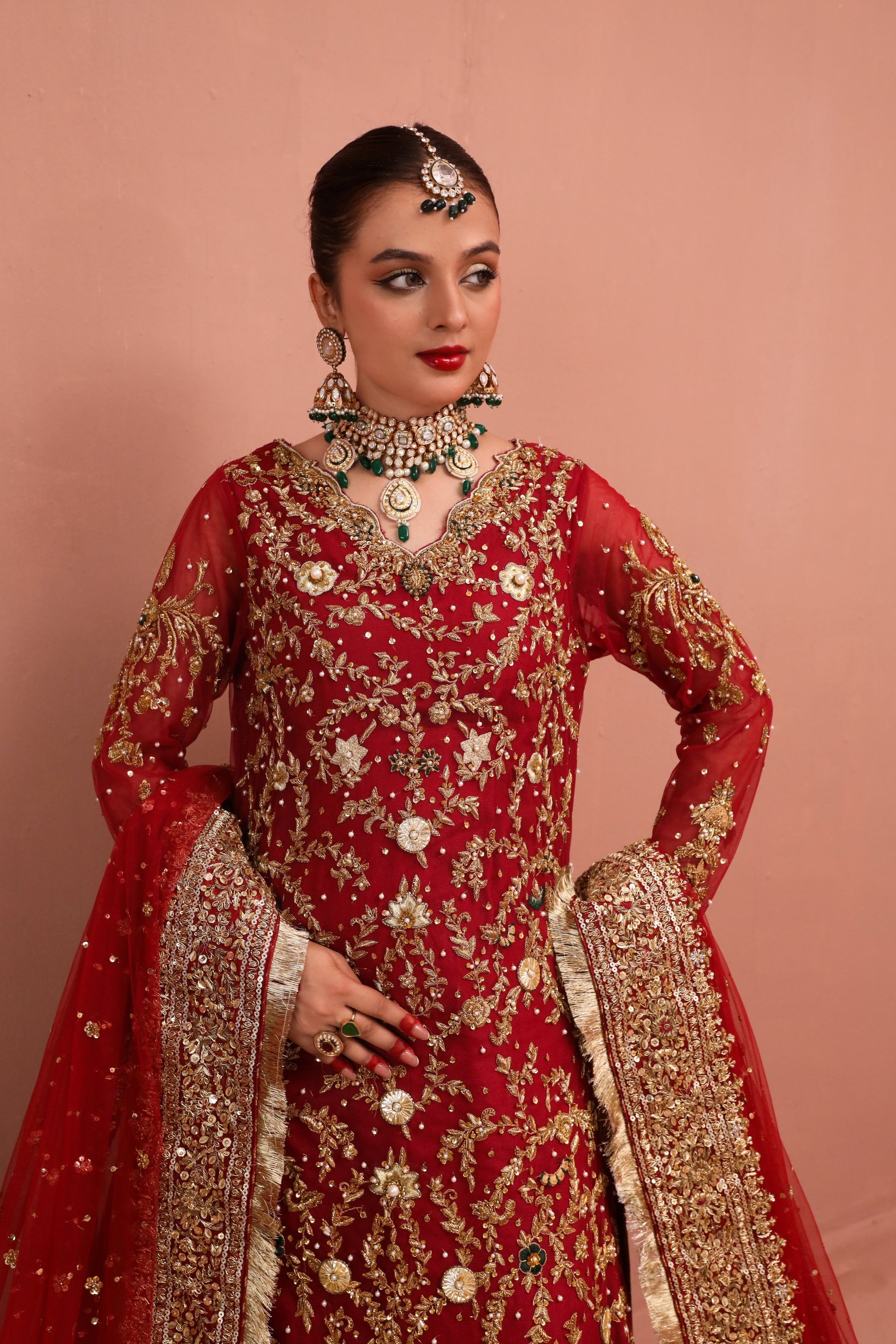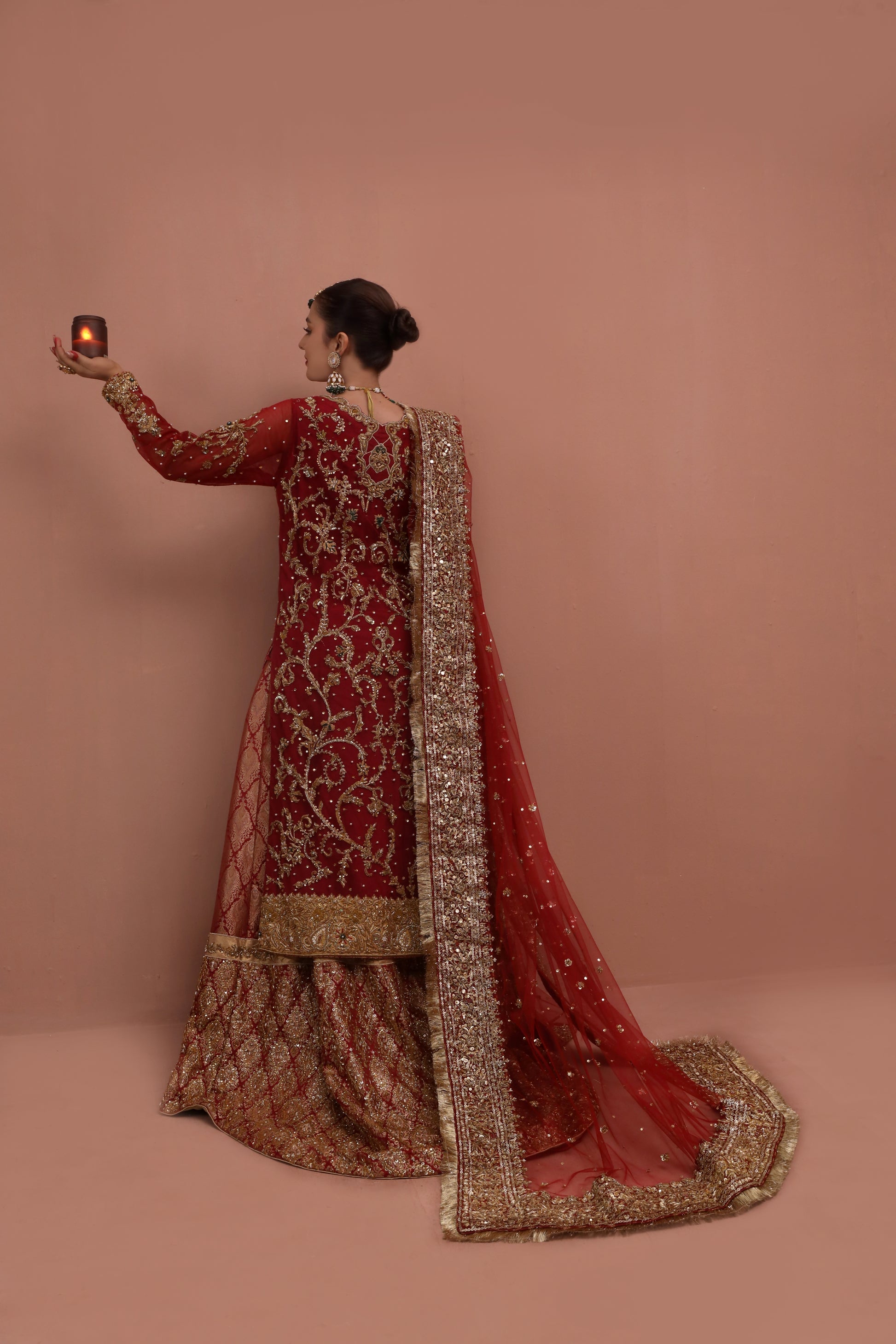 Stunning bridal net shirt with jamawar farshi lehnga features exquisite thread and cora dabka embroidery, complemented by a modern back neckline adorned with delicate tassels. Paired with a heavy four-sided heritage dupatta, this heirloom piece from our most awaited collection embodies grace, craftsmanship, and royal elegance.