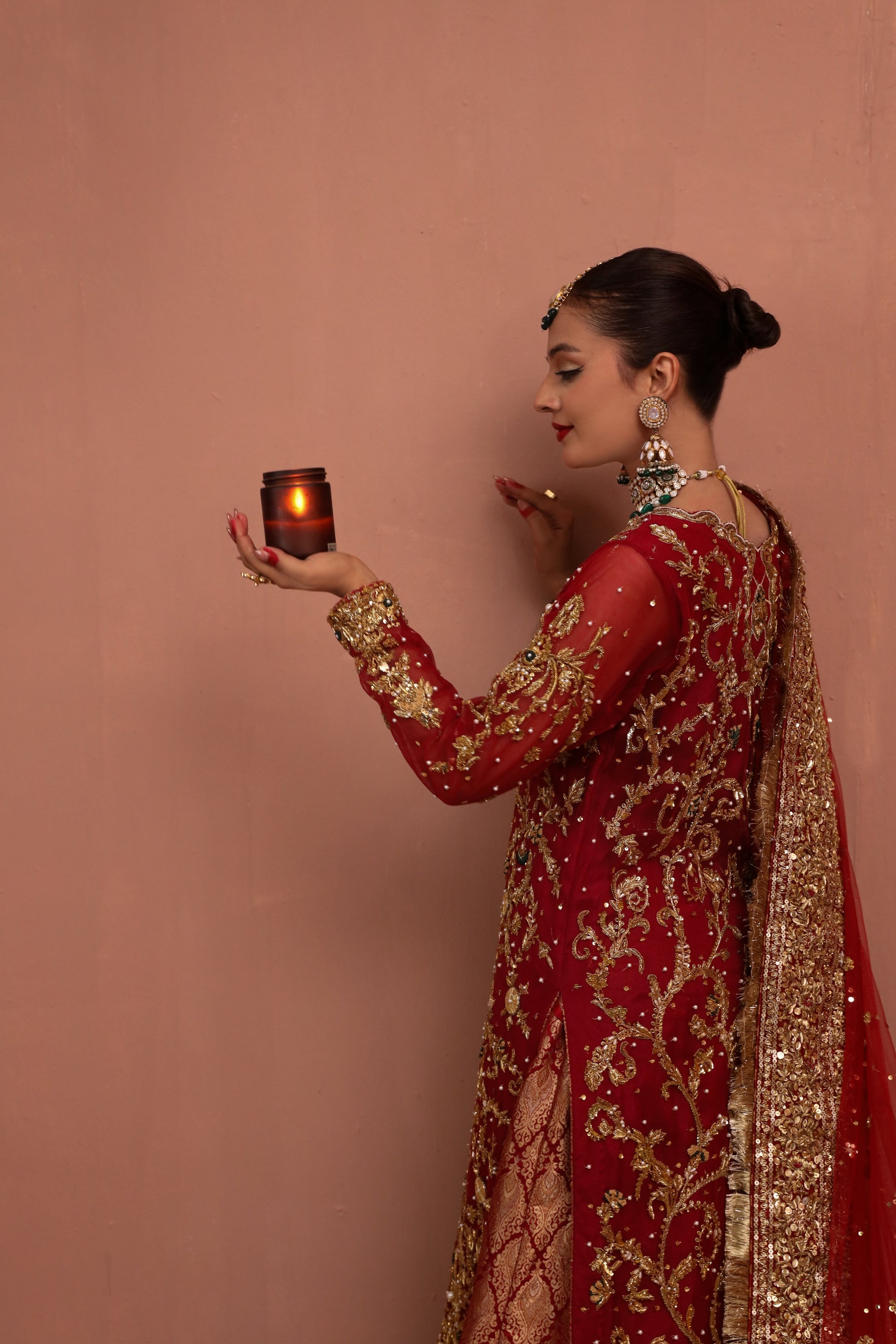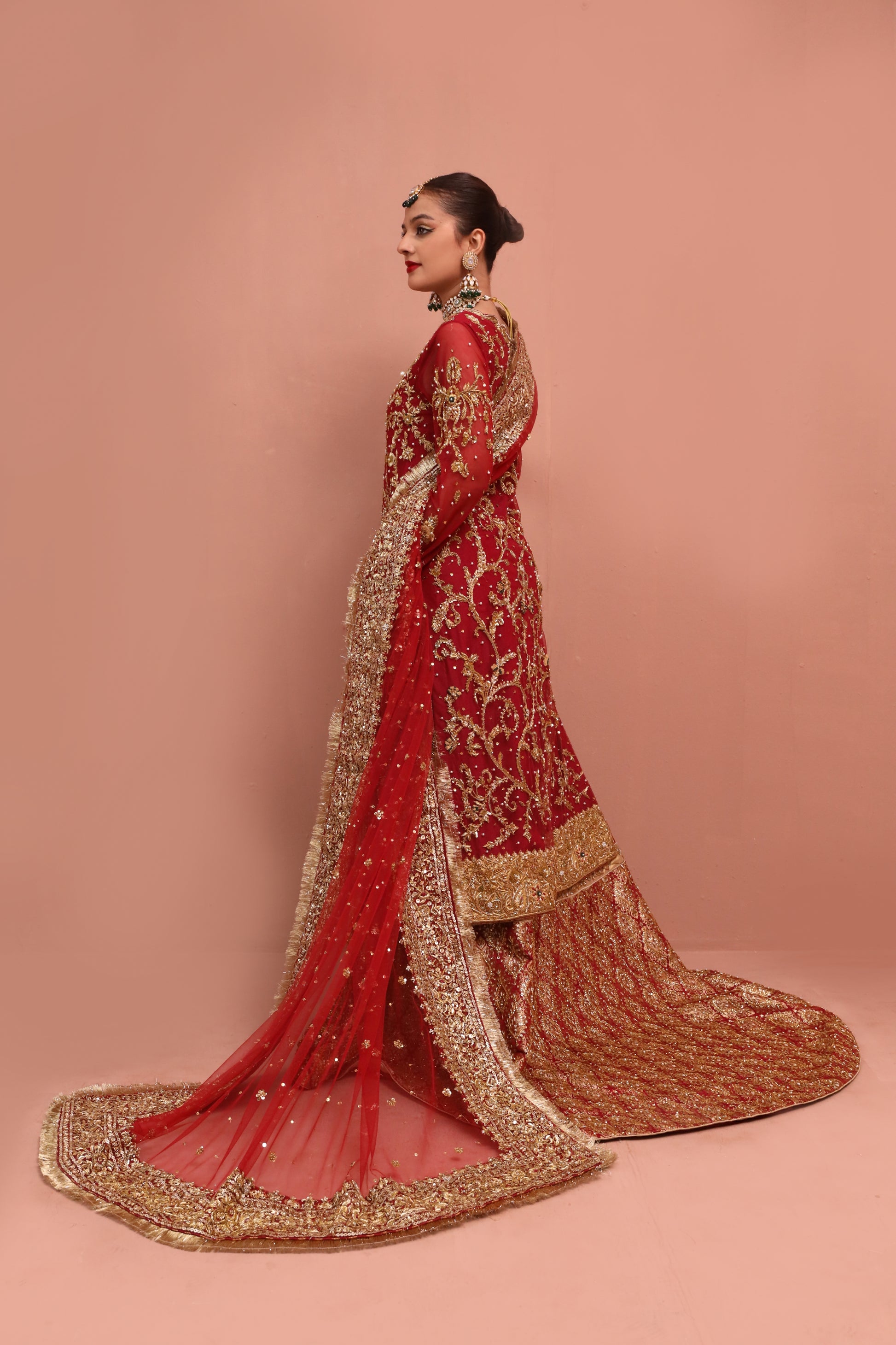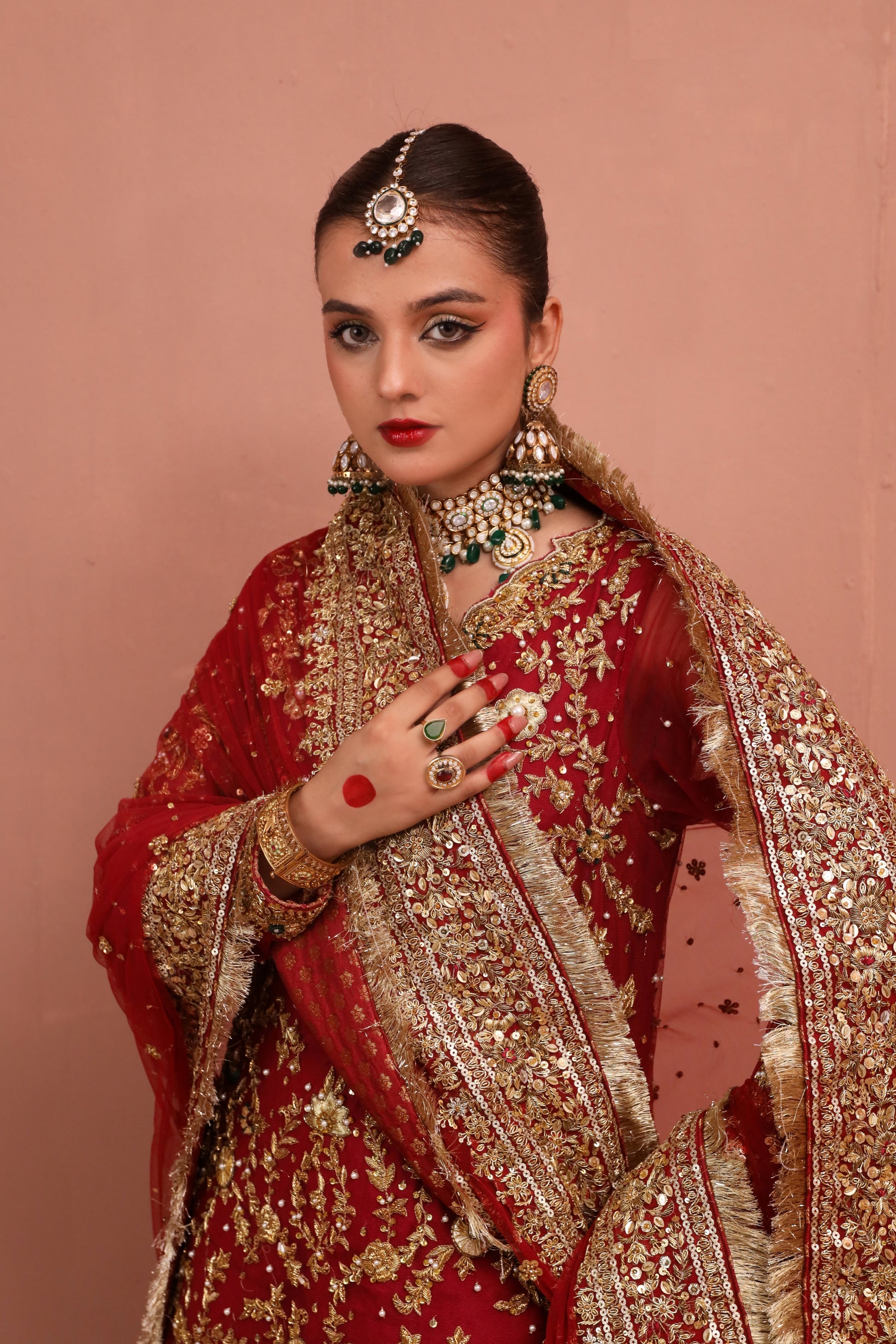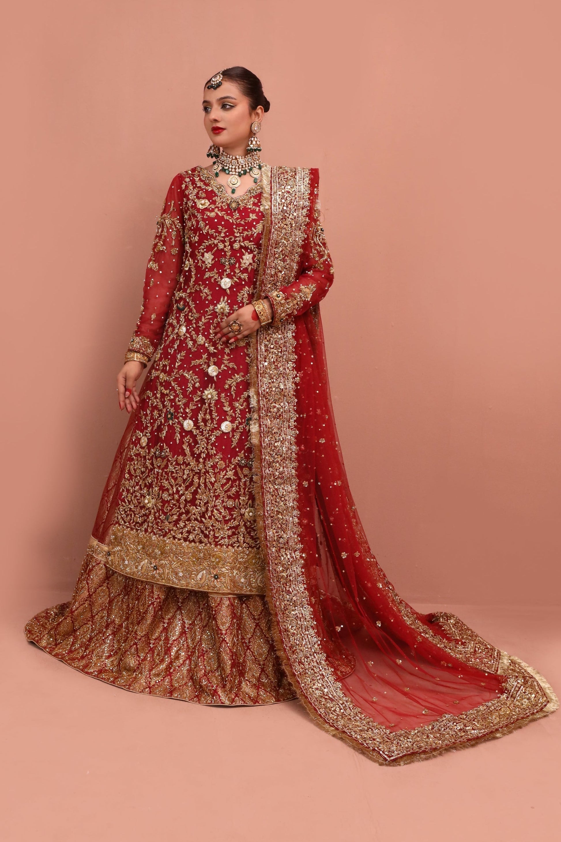 Stunning bridal net shirt with jamawar farshi lehnga features exquisite thread and cora dabka embroidery, complemented by a modern back neckline adorned with delicate tassels. Paired with a heavy four-sided heritage dupatta, this heirloom piece from our most awaited collection embodies grace, craftsmanship, and royal elegance.