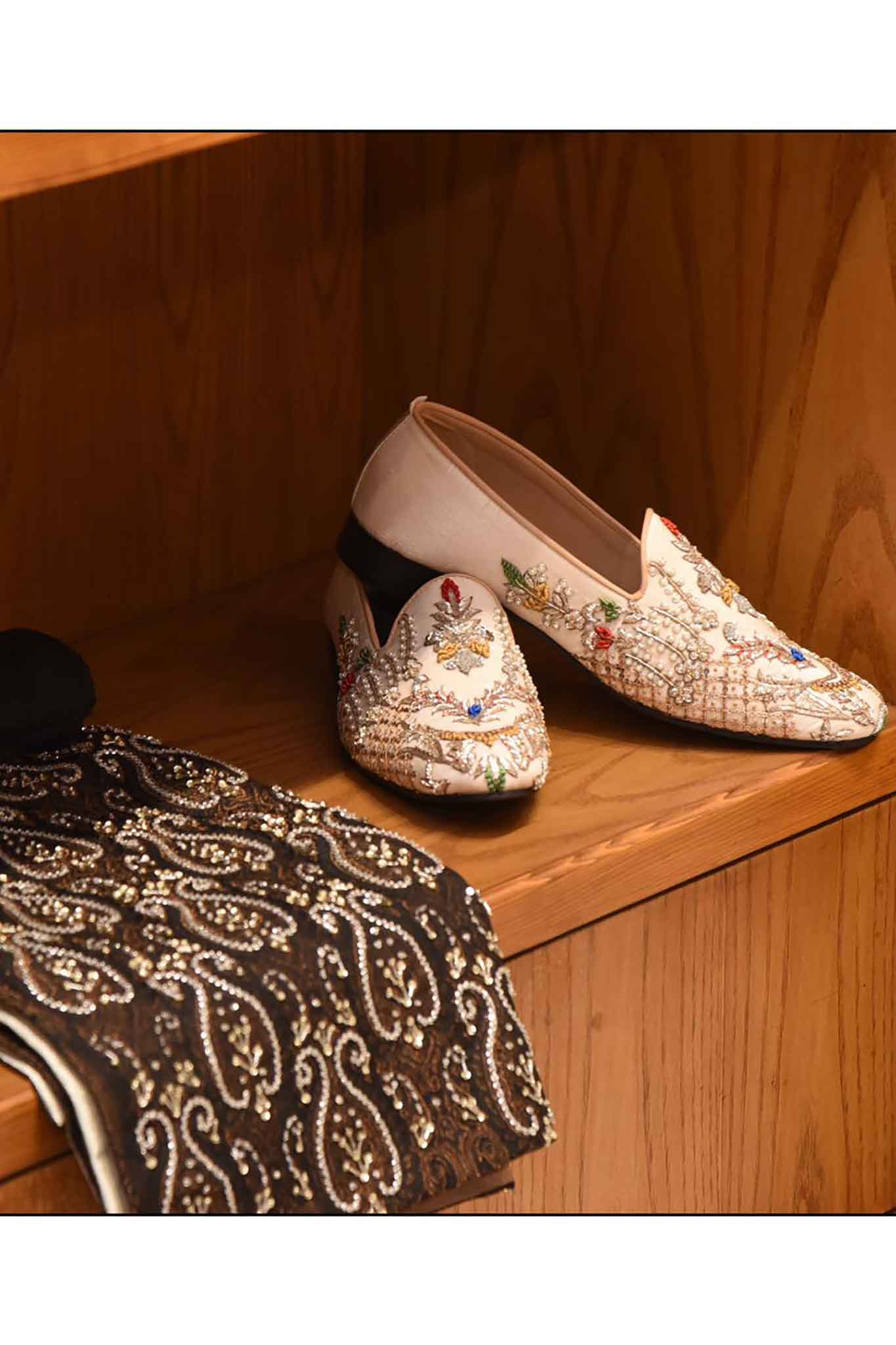 Elegance, luxury, and sophistication define wedding looks adorned with handmade white Jamawar shoes.
