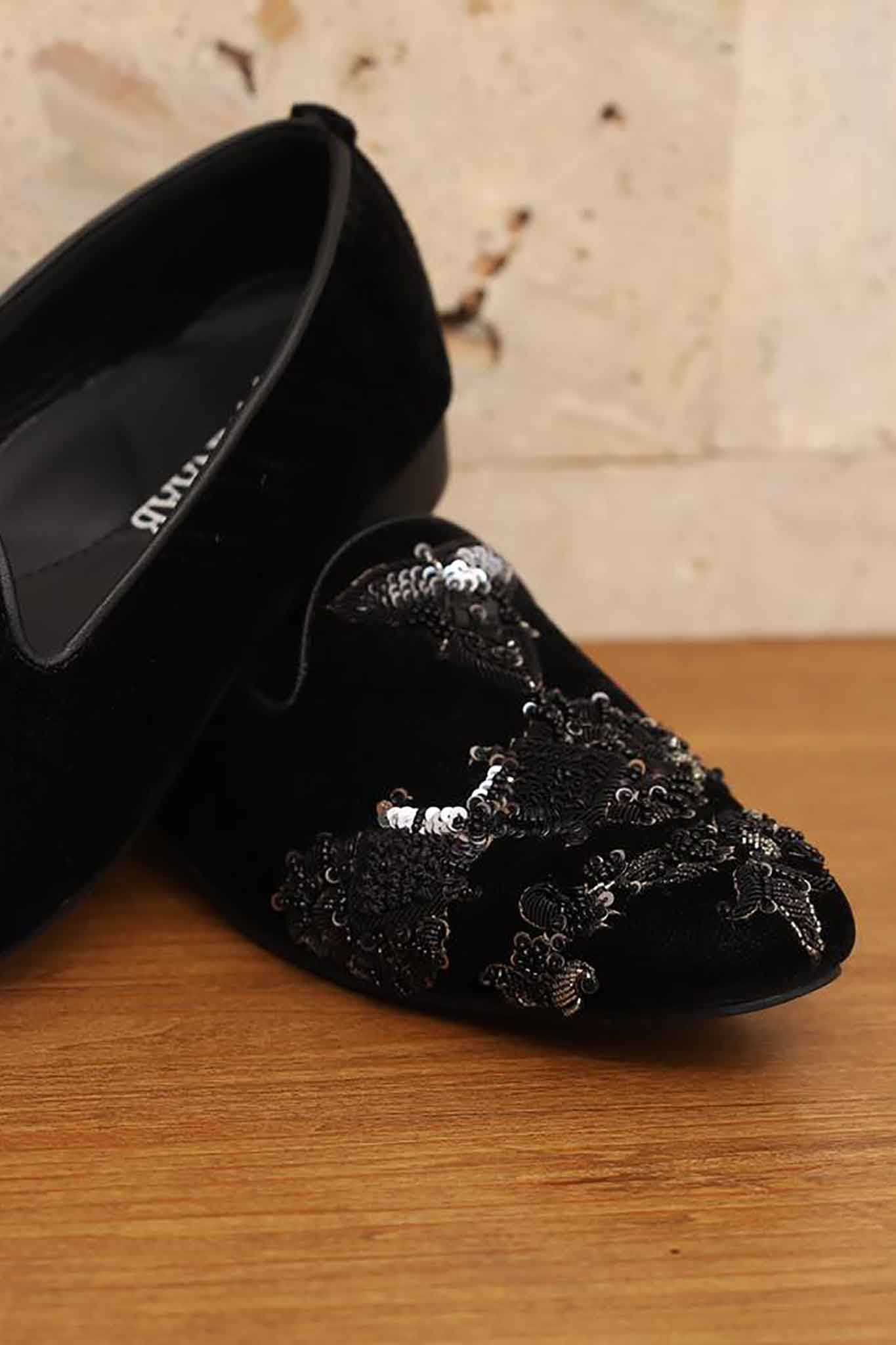 Black velvet shoes with delicate black cora dabka embellishments provide a stylish juxtaposition to any color, conveying an air of opulence.