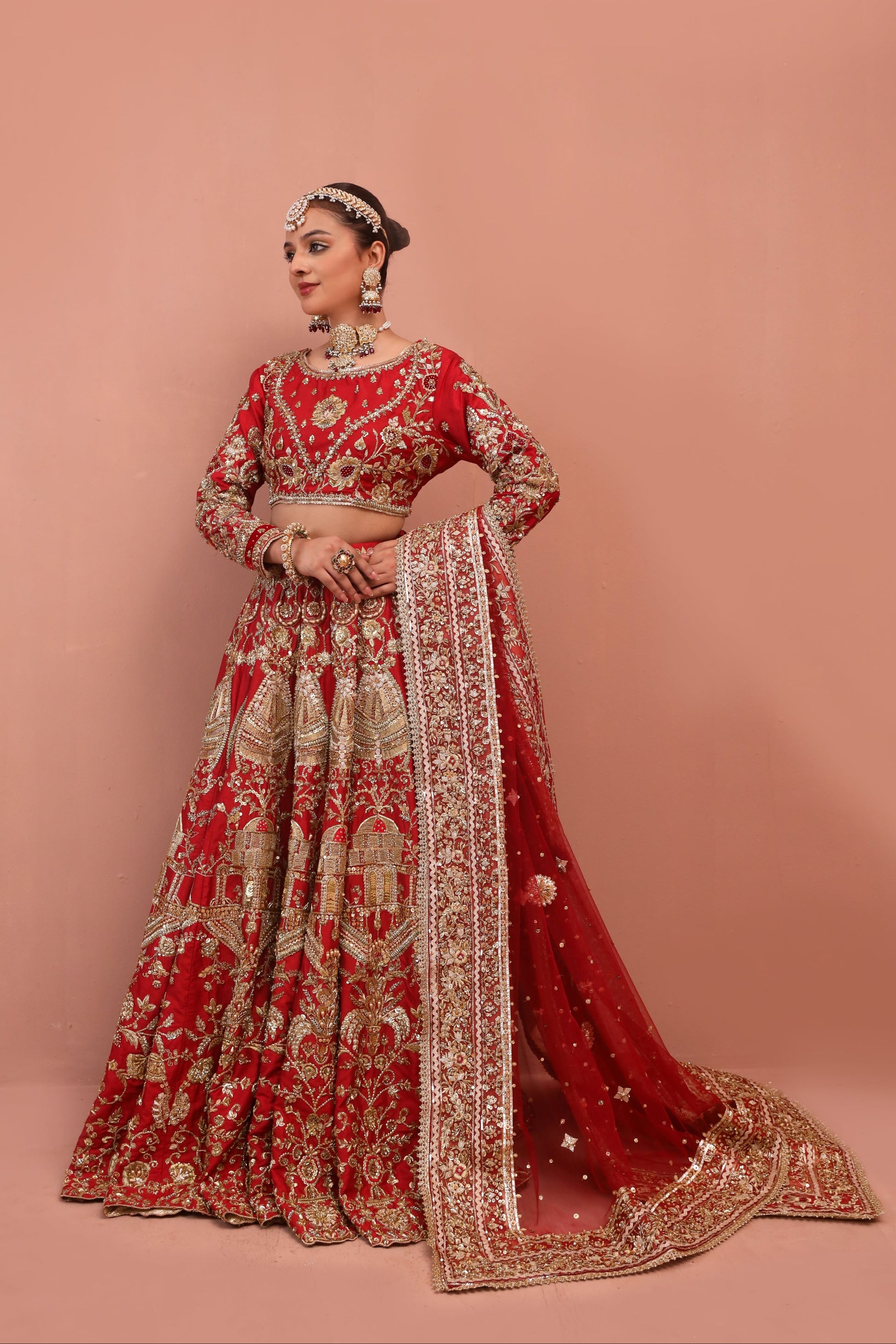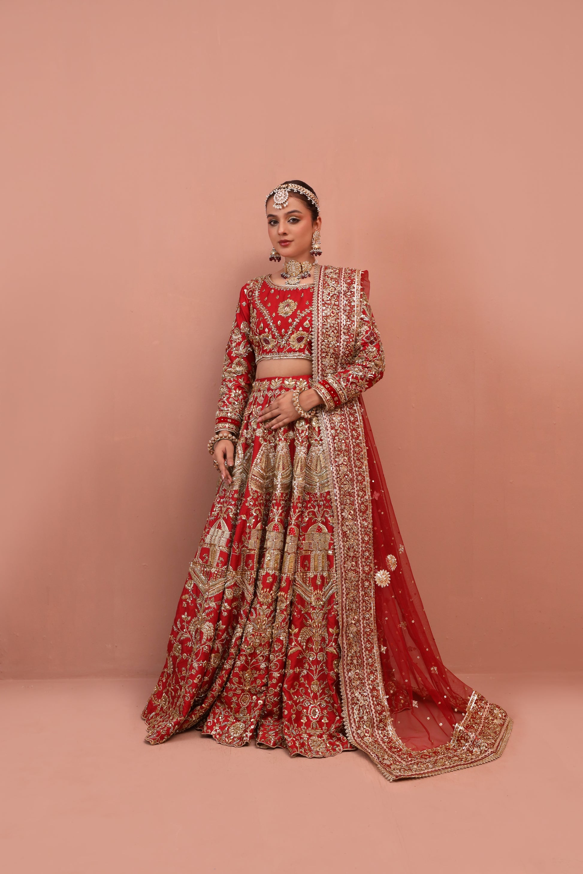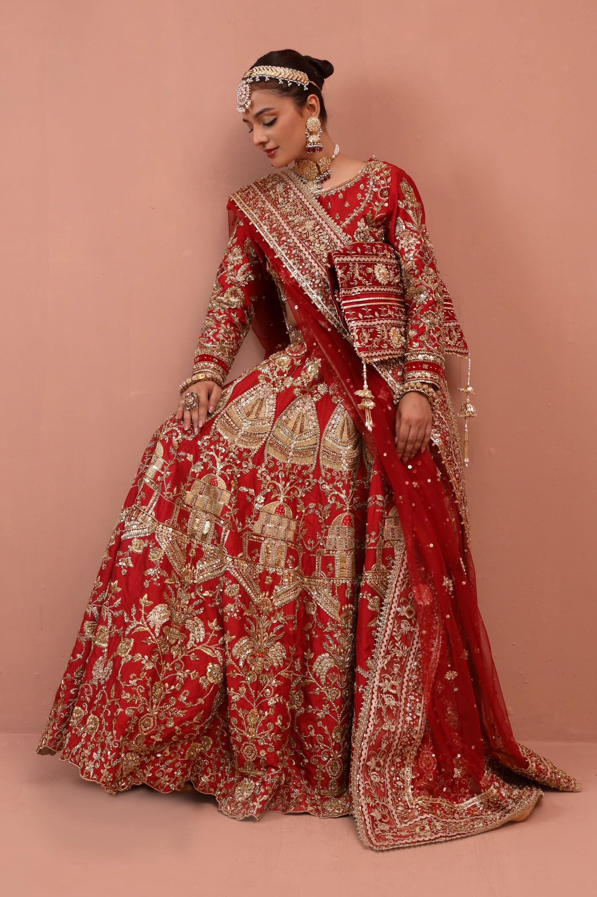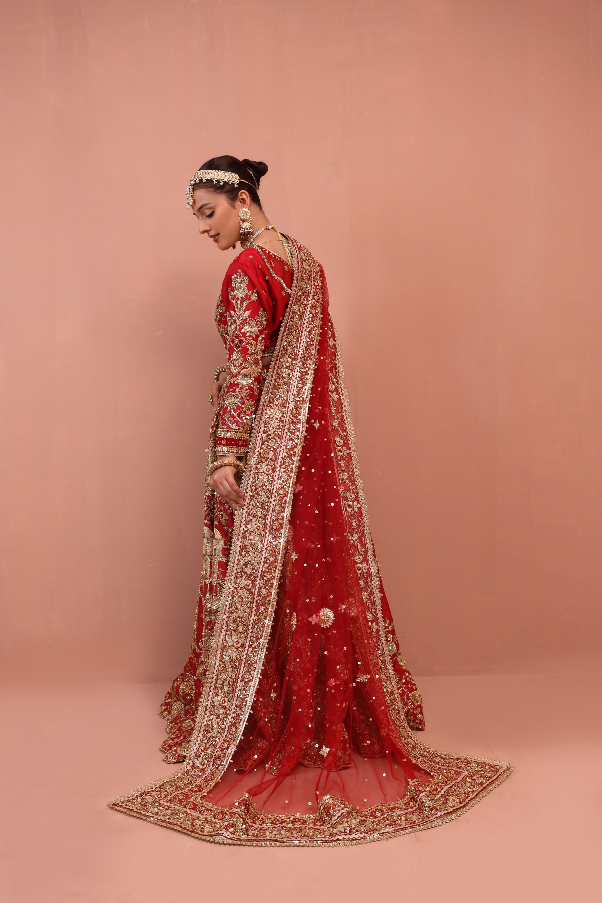 A true celebration of heritage and artistry, this exquisite red bridal lehenga features intricate cora dabka embroidery, adorned with Swarovski crystals and multi-colored gemstones that add a captivating sparkle. Paired with a modern-cut choli enhanced with an organza patch, the ensemble strikes a perfect balance between tradition and contemporary grace. The look is completed with a richly embellished dupatta that reflects timeless elegance in every thread.