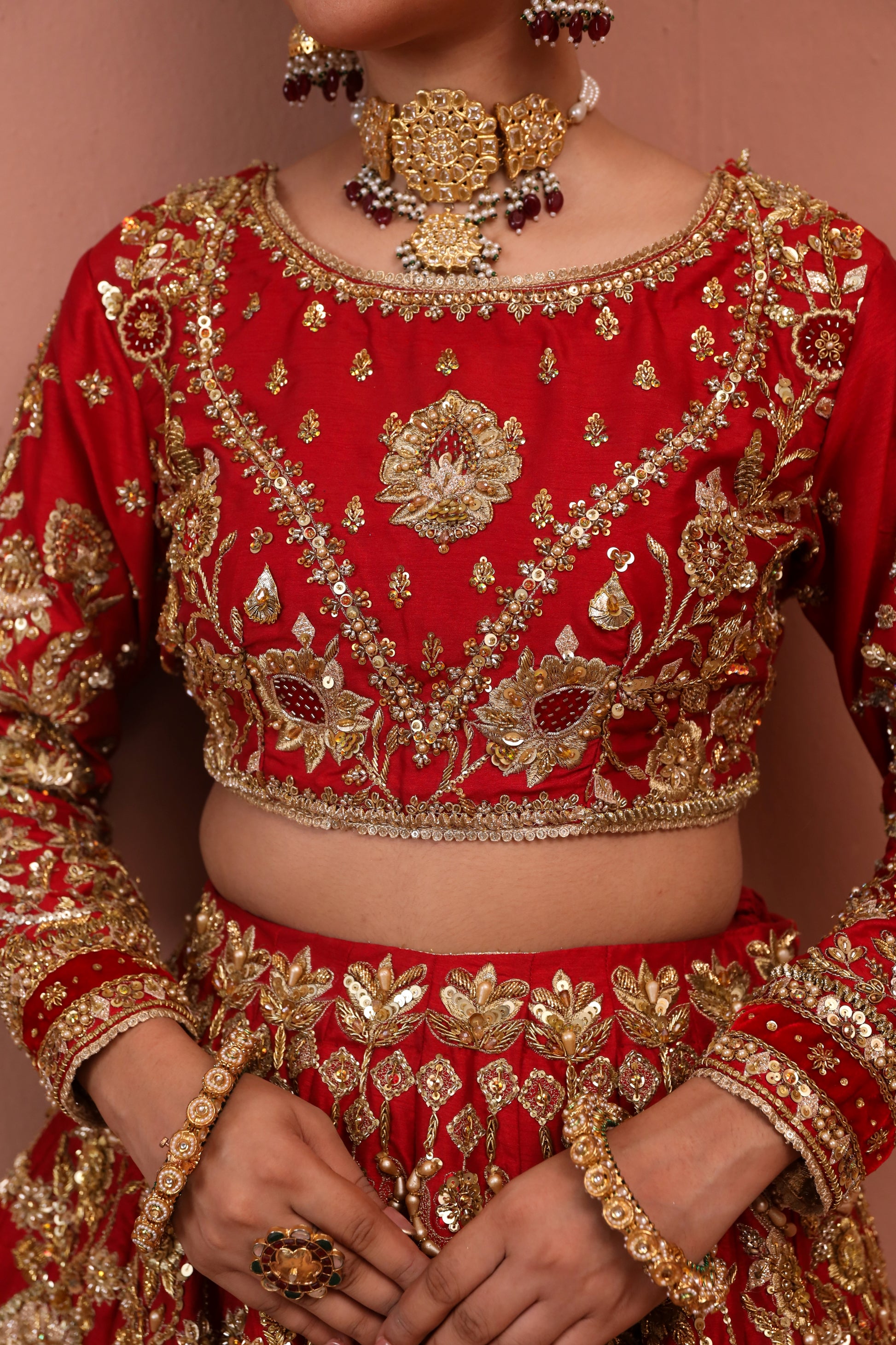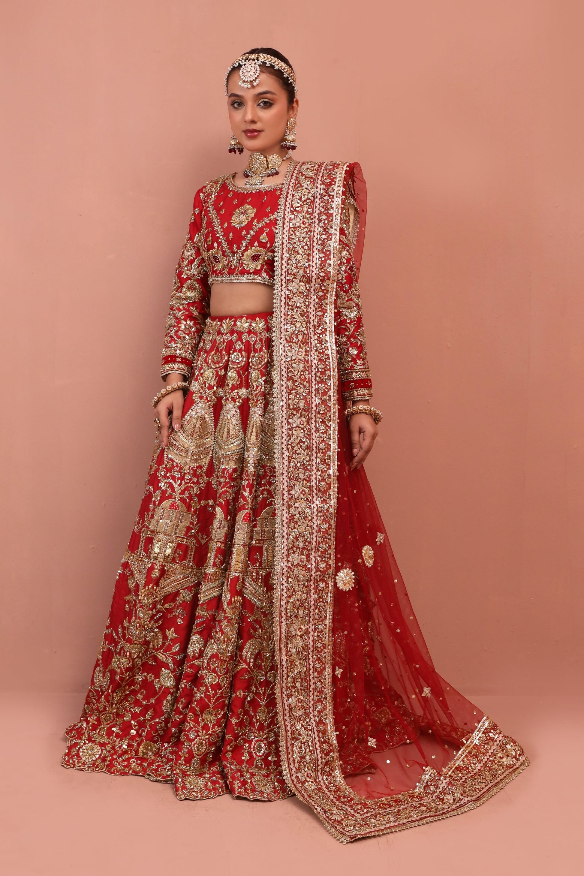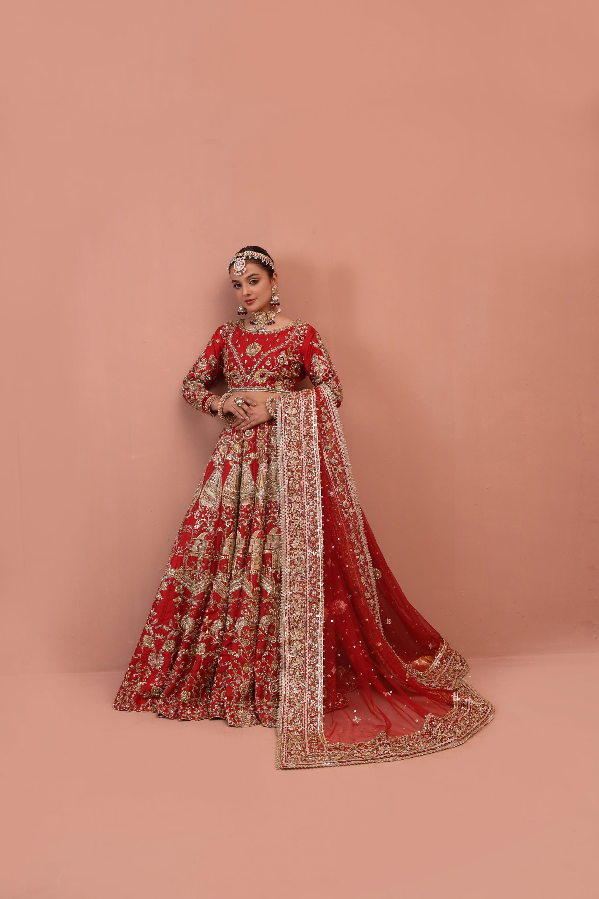 A true celebration of heritage and artistry, this exquisite red bridal lehenga features intricate cora dabka embroidery, adorned with Swarovski crystals and multi-colored gemstones that add a captivating sparkle. Paired with a modern-cut choli enhanced with an organza patch, the ensemble strikes a perfect balance between tradition and contemporary grace. The look is completed with a richly embellished dupatta that reflects timeless elegance in every thread.