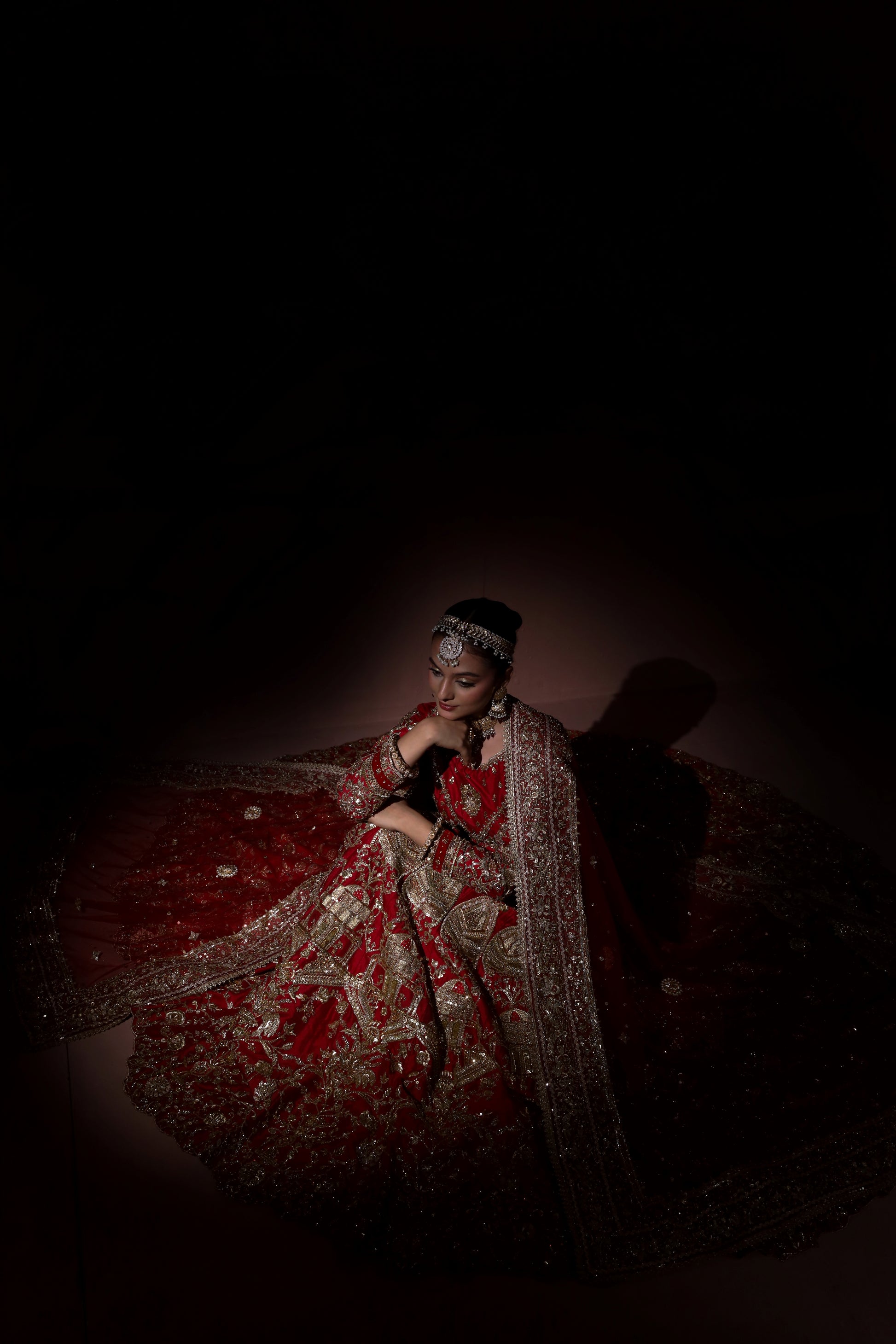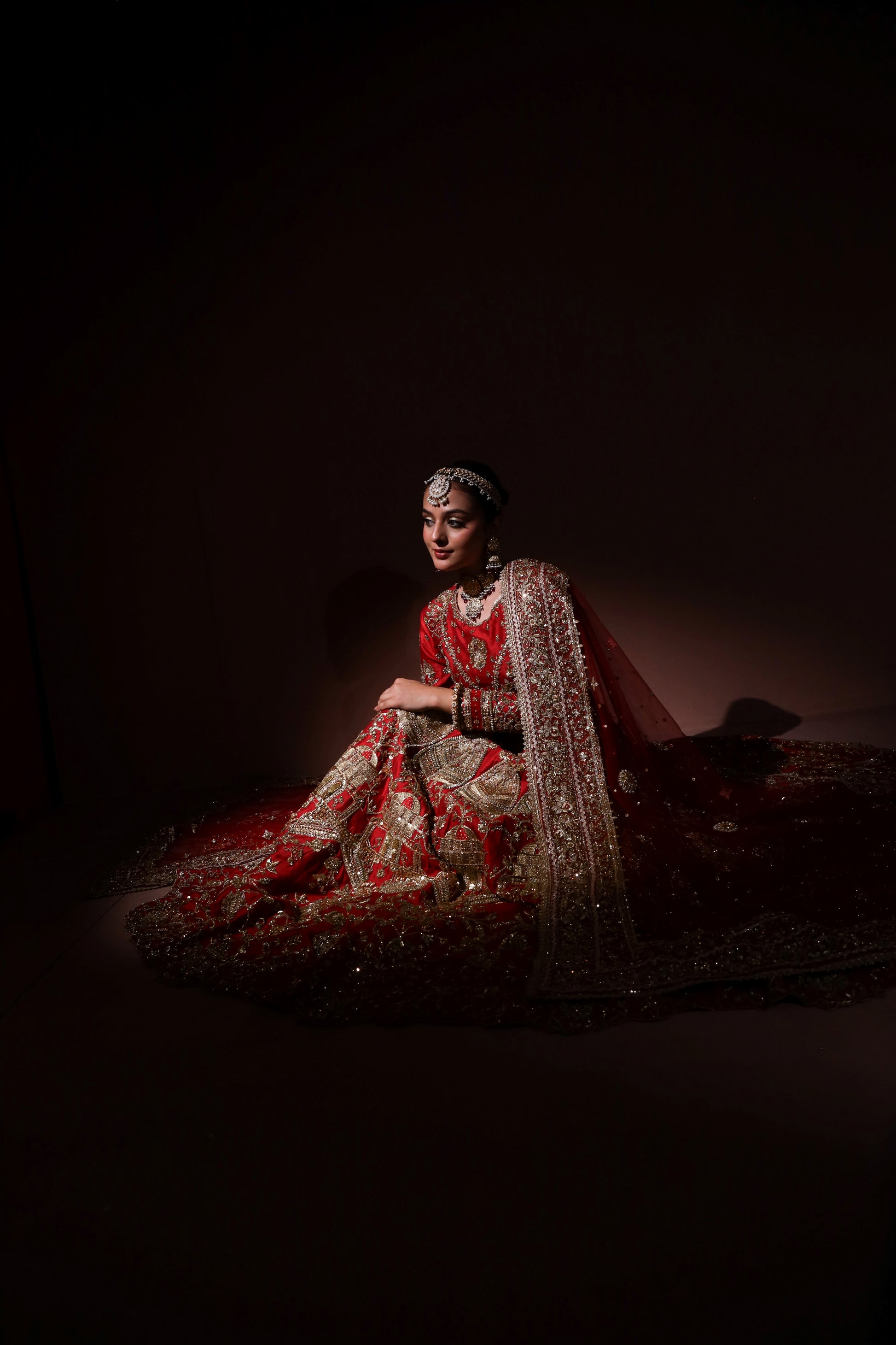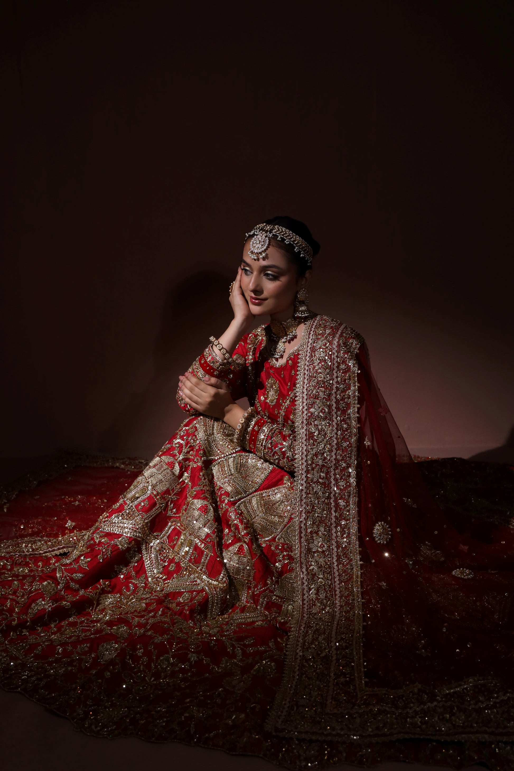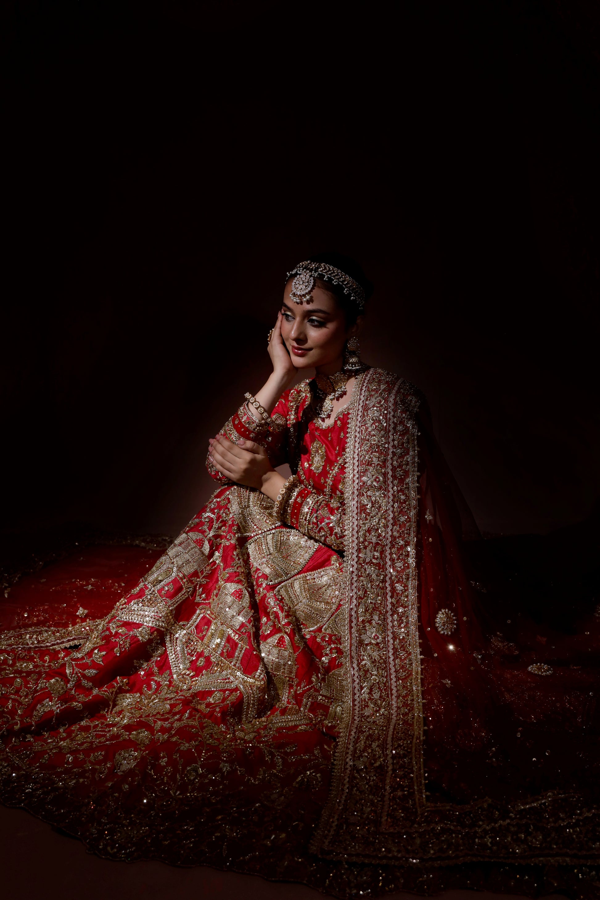 A true celebration of heritage and artistry, this exquisite red bridal lehenga features intricate cora dabka embroidery, adorned with Swarovski crystals and multi-colored gemstones that add a captivating sparkle. Paired with a modern-cut choli enhanced with an organza patch, the ensemble strikes a perfect balance between tradition and contemporary grace. The look is completed with a richly embellished dupatta that reflects timeless elegance in every thread.