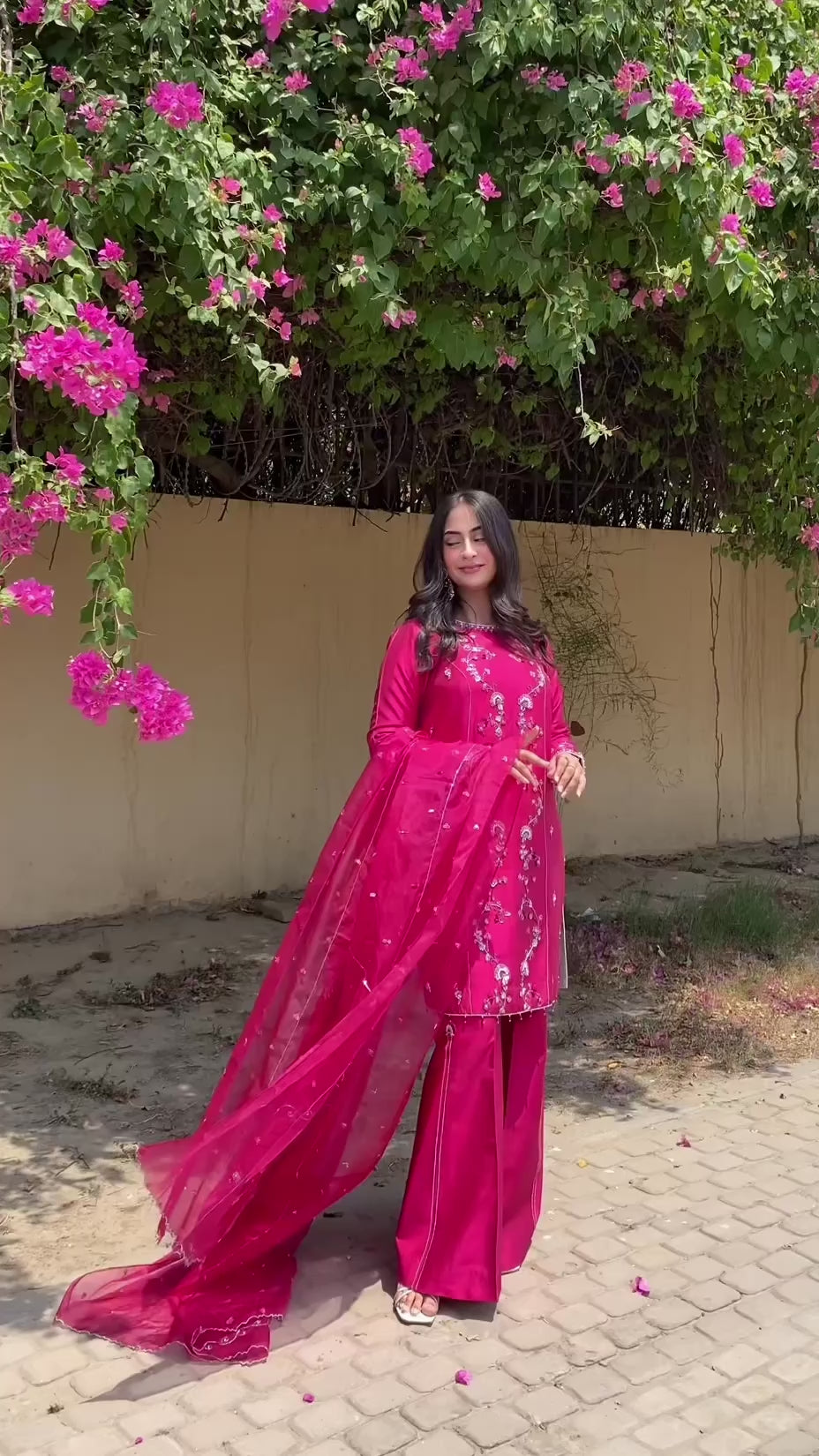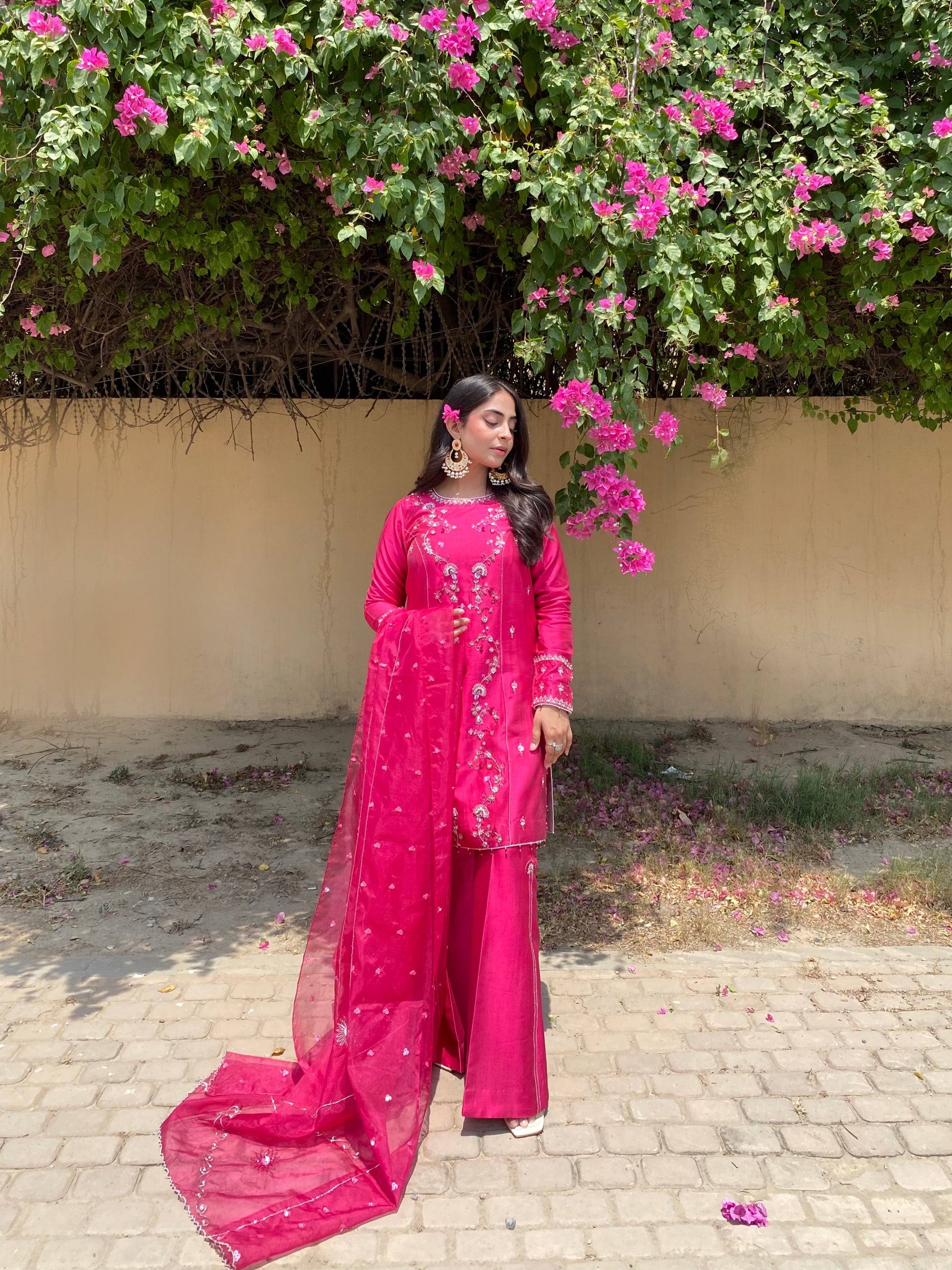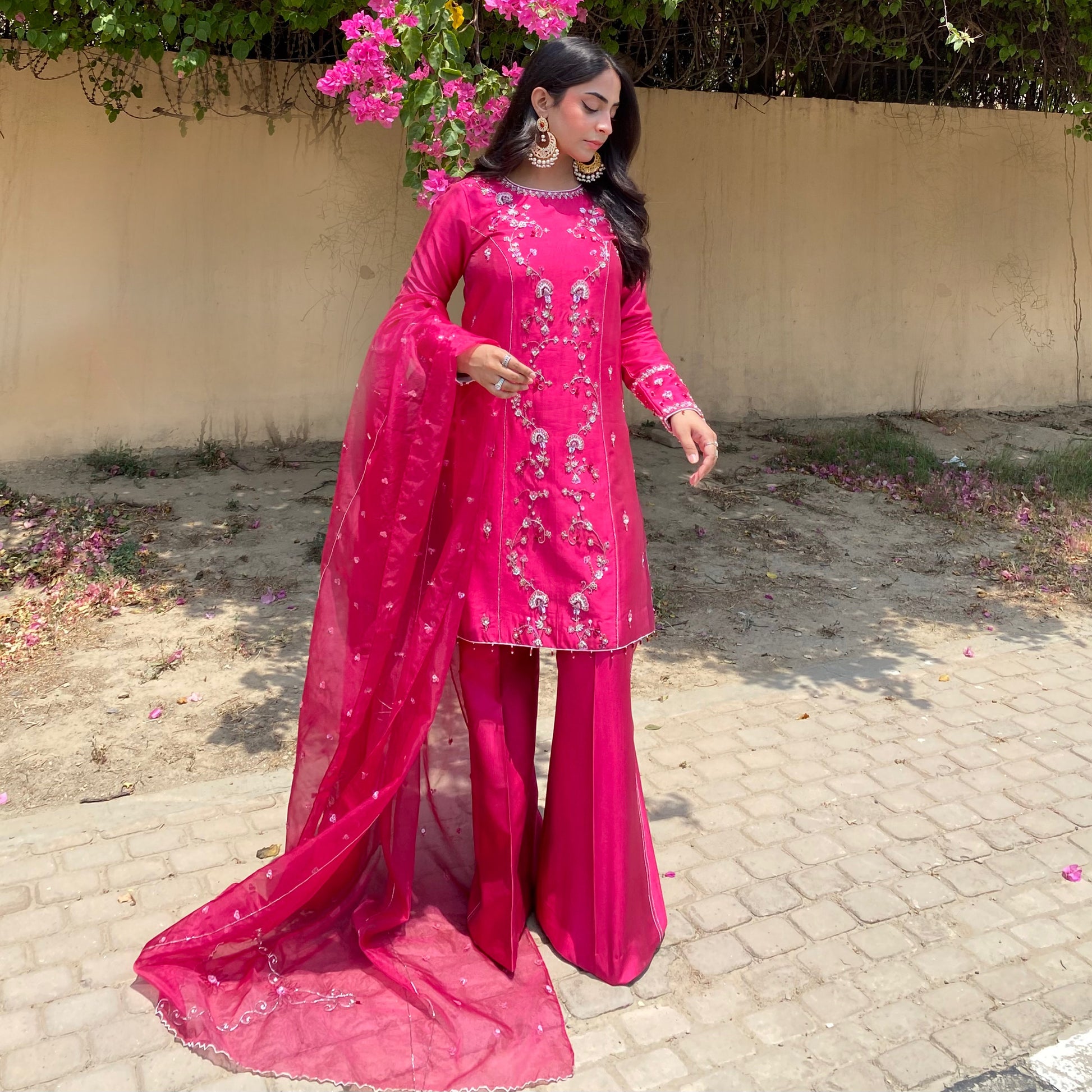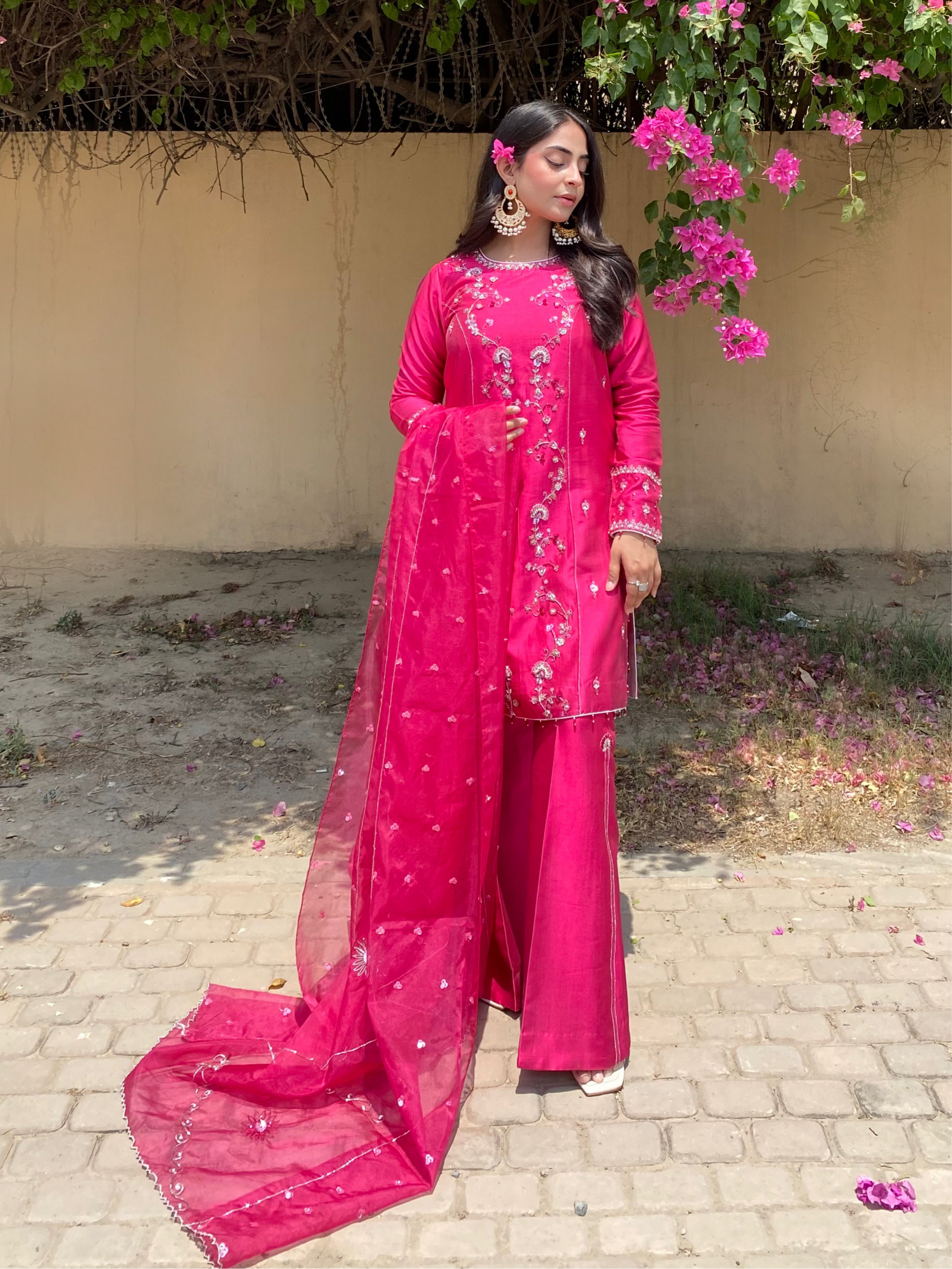 A Modern pink ensemble in pure tussle silk, featuring silver handwork, tailored pants, and an organza dupatta with delicate wind motifs.